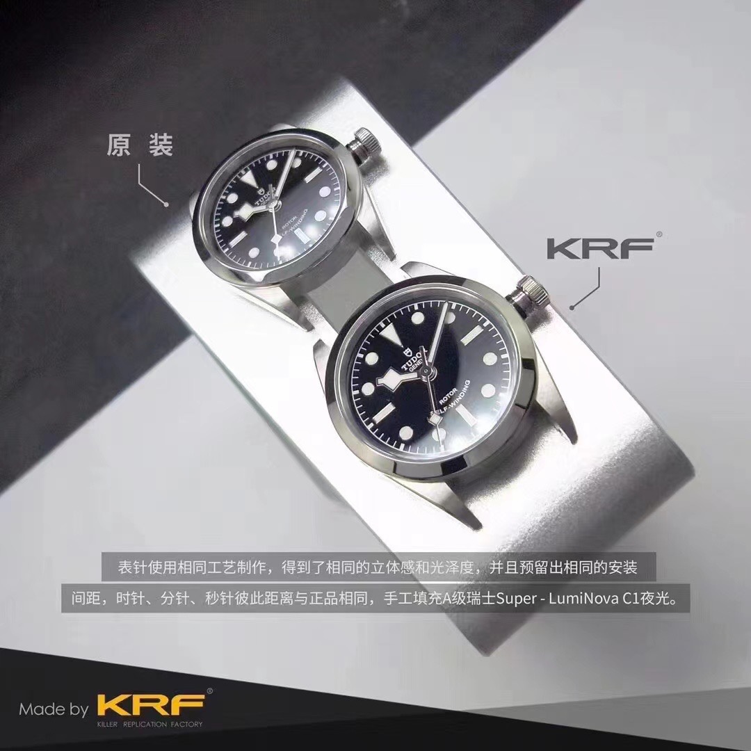 1.錶盤陞級(僅30%成品率):盤面全新立體印刷,使用BERLAC集團耗材(百年靈,Omega,IWC,Cartier,PP御用)顏色質感新增50%。 精修三角釘與長條釘大小和立體度,邊角圓潤自然,依然堅持瑞士Super-Luminova C1夜光粉。 2.陞級無色差藍色錶盤:你能在不同光線下看到湛藍--青藍--寶石藍--深藍--黑藍的整個過程,與原裝無色差。 3.秒針中心孔陞級:使用全新定制的錐形鉚釘孔得到了相同的小而密的結構。 4.錶殼陞級:改進錶圈孤度和精磨拋光,任何角度反射,倒影完全與原裝相同。 內影圈使用精沙新增亮度和深度。 殼側身增大倒角角度,縮短把管,全新加長把芯。 錶耳倒角占比新增,底蓋全新腐蝕工藝深度,顏色與原裝相同。 5.全新進口尼龍光絲迷彩編織布帶即將推出。 KRF帝舵碧灣79500是精緻的,有著與原版相同的質感,同時擁有超級性價比的中小手腕通勤腕表。