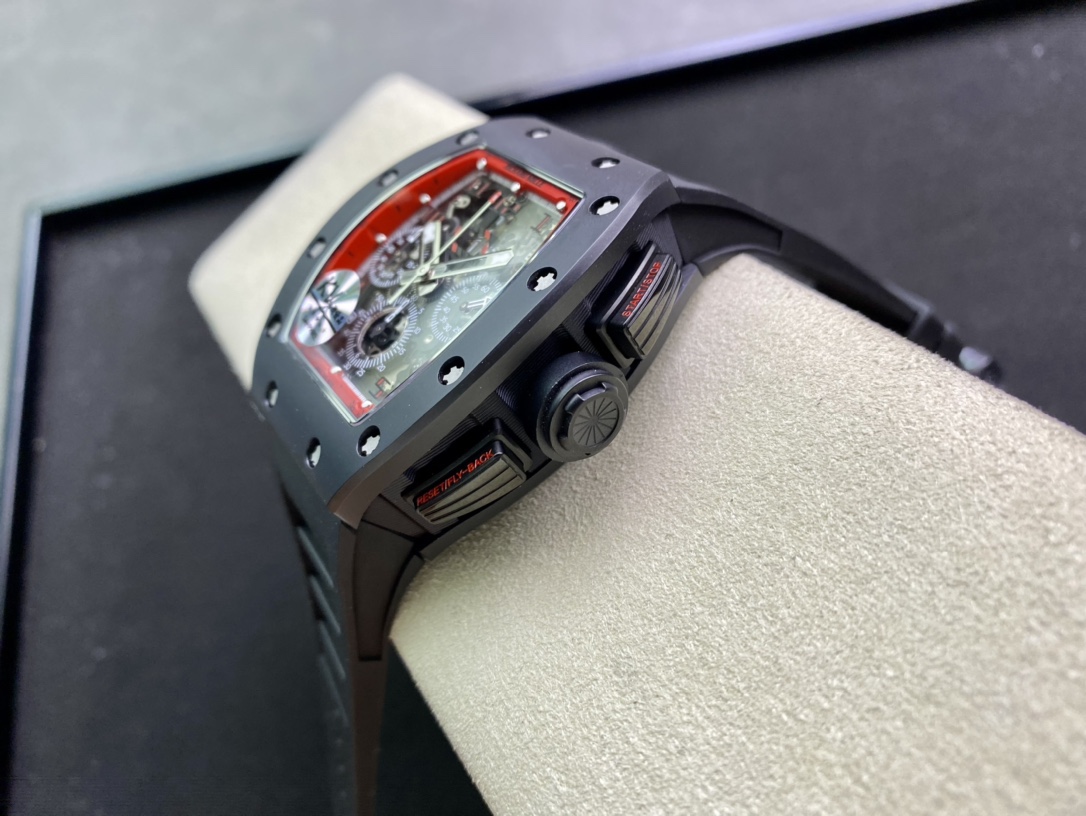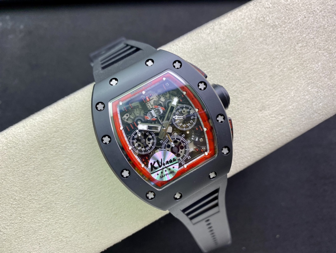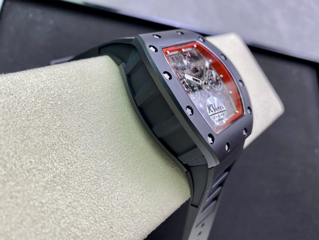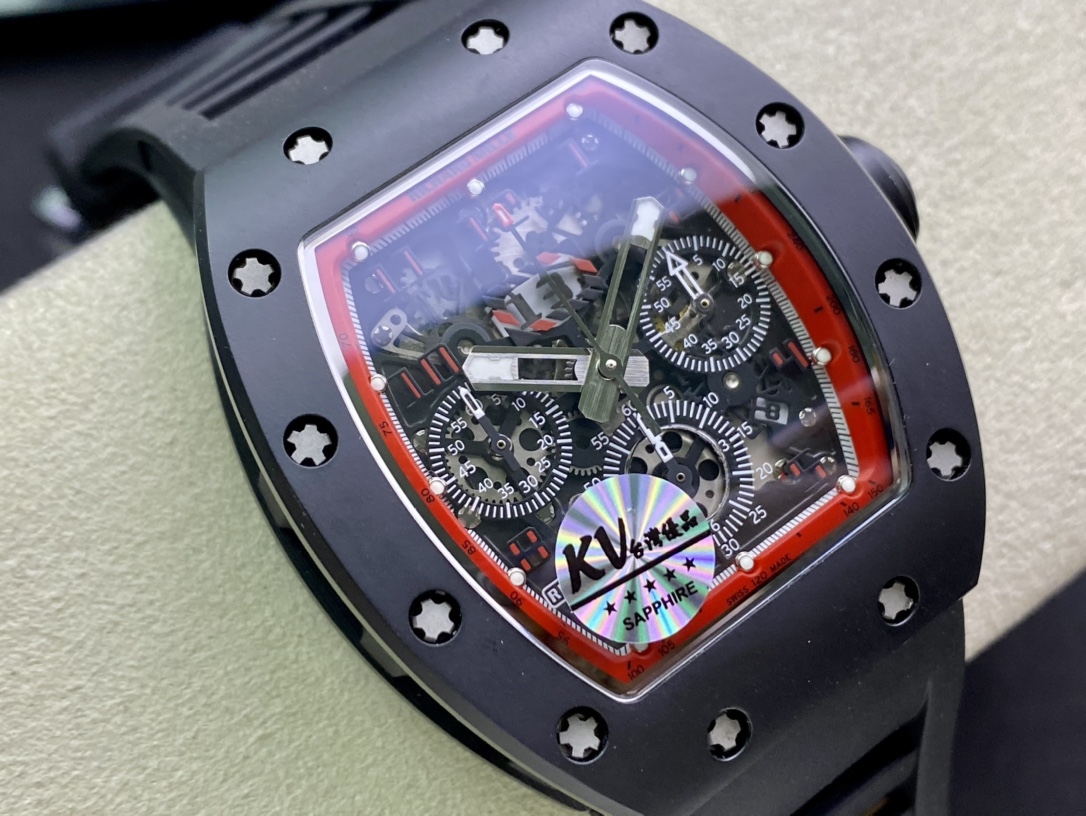 KV理查德米勒RM011系列計時款,絕對是讓人耳目一新的一款傑作! 1:錶殼運用與正品一致的NTPT碳纖維特別材科與進口陶瓷! 2:字面由最頂尖的玻璃廠依原版原理製成30C厚厚的玻璃,然後打好吼和印刷。 這樣製作使整片字面更通度以及幹潔無絲毫瑕疵3行事曆由機芯廠私人定制下複刻出與原版一致的功能與原理,重點在於與正品一致的雙曆單獨跳曆的功能,行事曆結構與數位結構與正品一致4:底蓋由前緣超聲波雕刻而成,達到與正品一致的立體效果。 5:玻璃使用高通透度鍍藍光水晶玻璃6:膠帶用馬來西亞頂級橡膠資料製作而成,㬵帶做到了與正品RM-011通用的成果