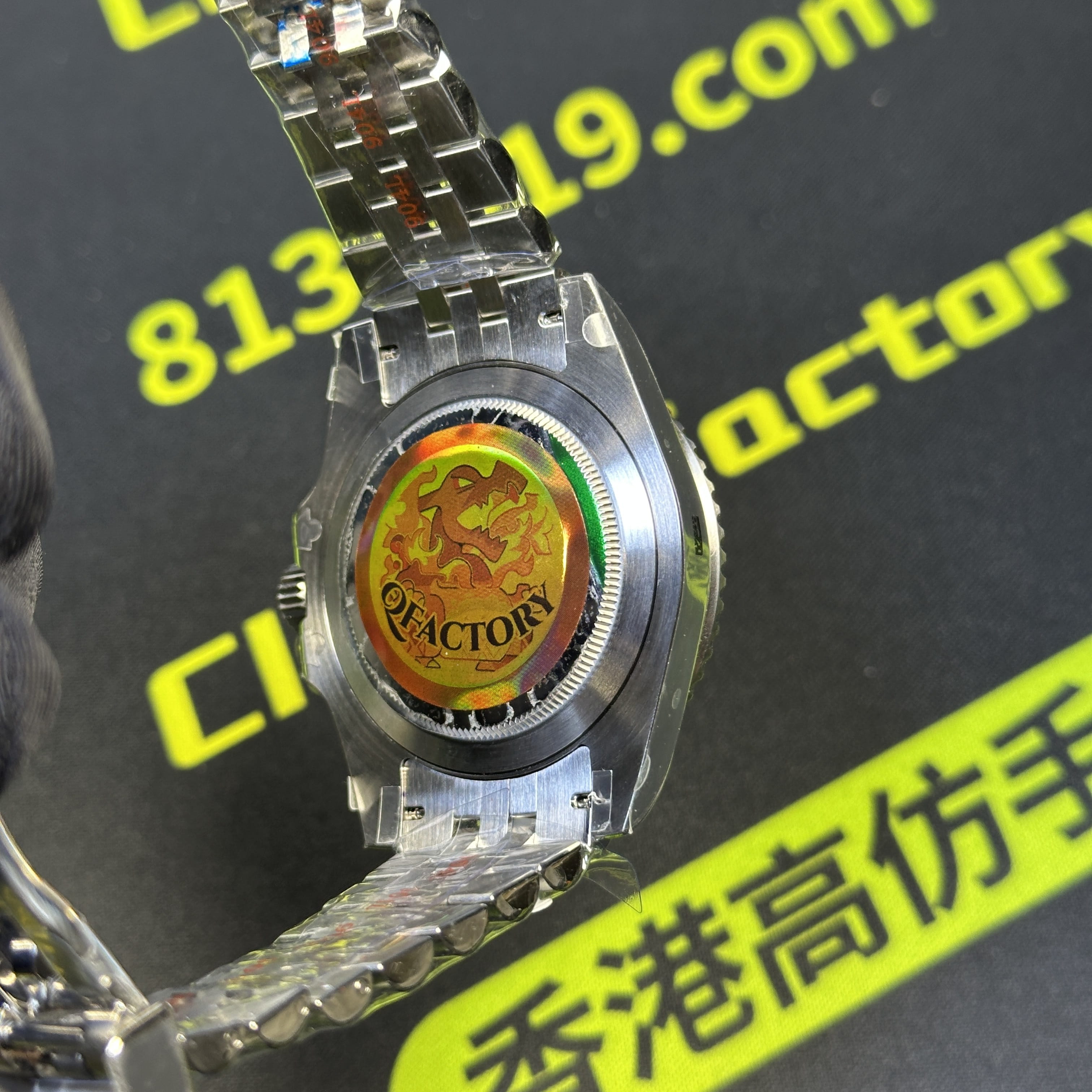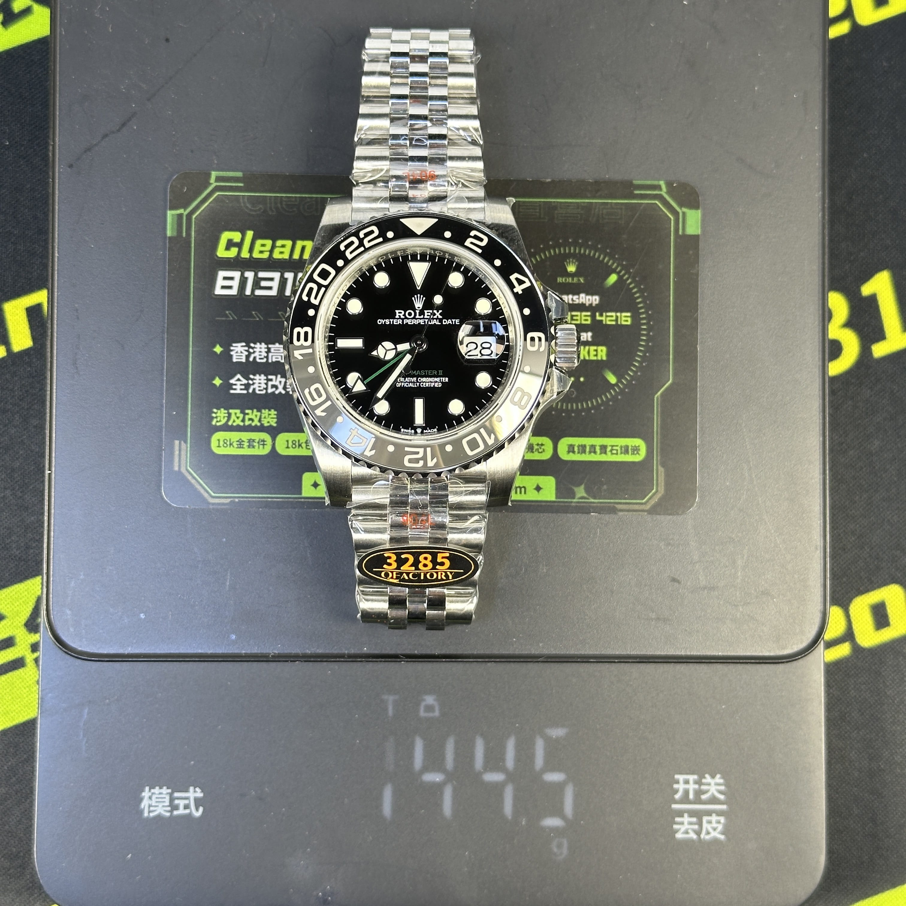 無色差的錶盤在對比原裝正品情況下就是針對印刷字面,QF廠126710黑灰圈字面立體感十足,白色以及綠色字面達到一定的清晰度.其次是指針構造部分,綠色指針顏色分明,時分秒針沒有毛邊毛刺.QF廠格里尼治日曆窗口字面單數和雙數都是居中效果.最後就是機芯配置,使用了C廠丹東3285機芯,續航動力72小時,GMT兩地時間100%還原,QF廠勞力士GMT可以理解為是C廠格外版本.