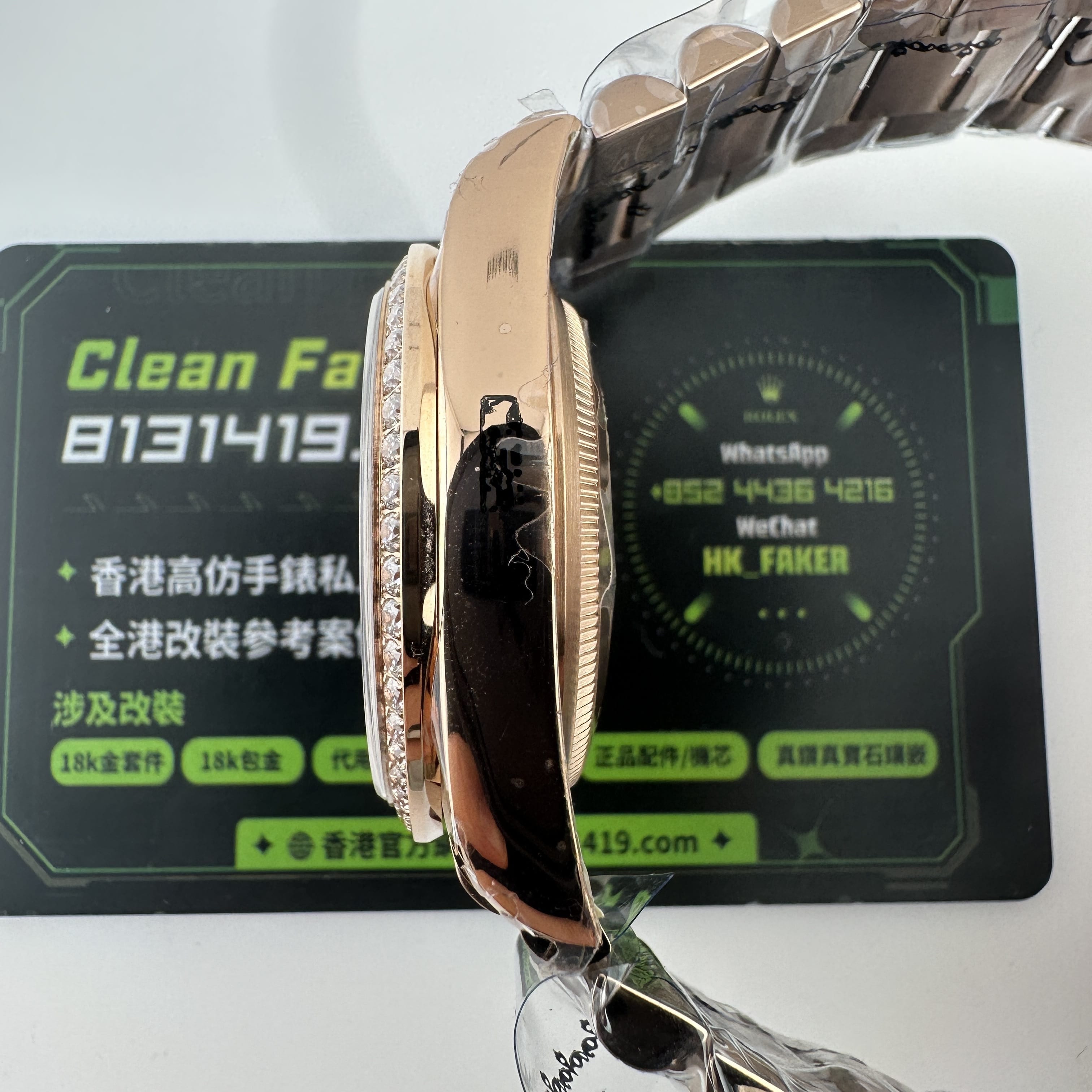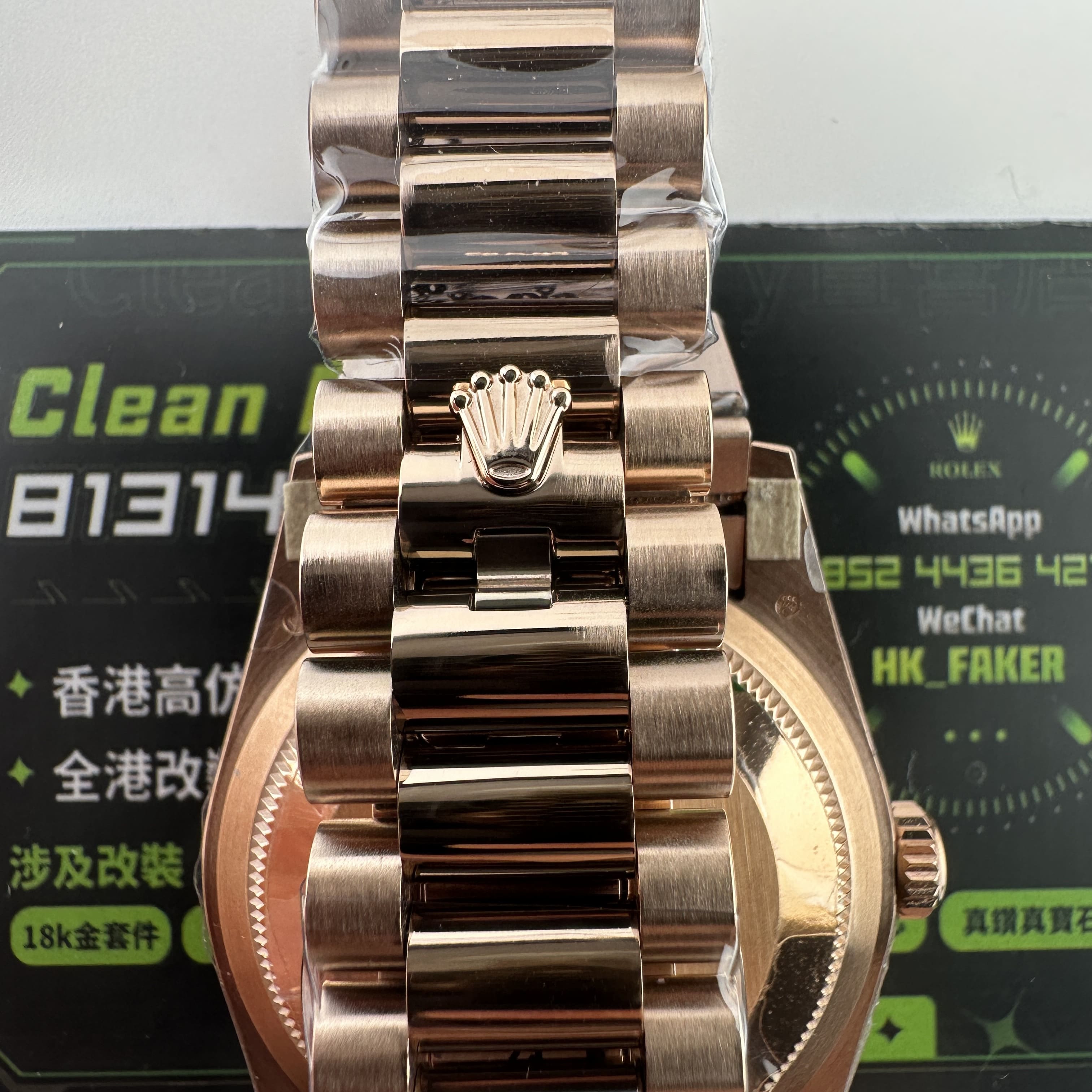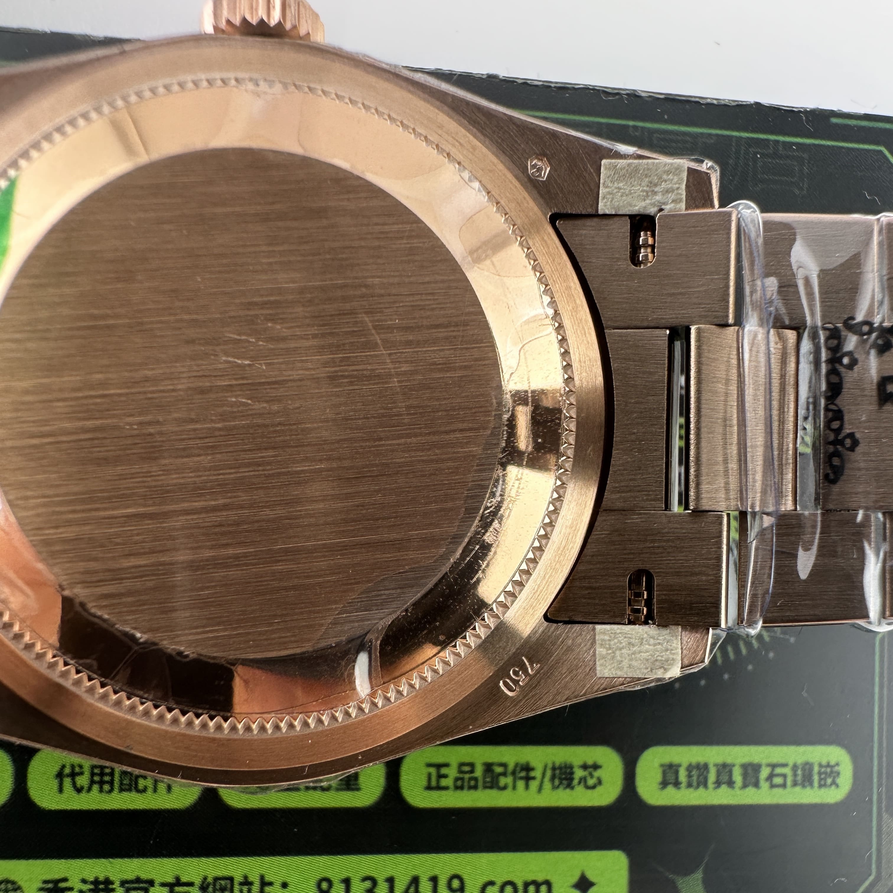 高仿勞力士Day-Date配重款式全新推出m128345rbr-0028雲貝母盤面,整錶克重146克,對於一款36mm錶款而言,在重量比例上是達到了重量提升,對比以往沒有配重需求前提下是僅有110克左右,高仿勞力士DD配重在克重上得到了36克提升.也間接性表達了現階段頂級製作工藝得到了進步.外觀玫瑰金色澤,是通過電鍍金做到了接近原版匹配色澤.材質部分則是採用了重金屬材質,與無配重版本採用的904L精鋼材質,形成鮮明對比.