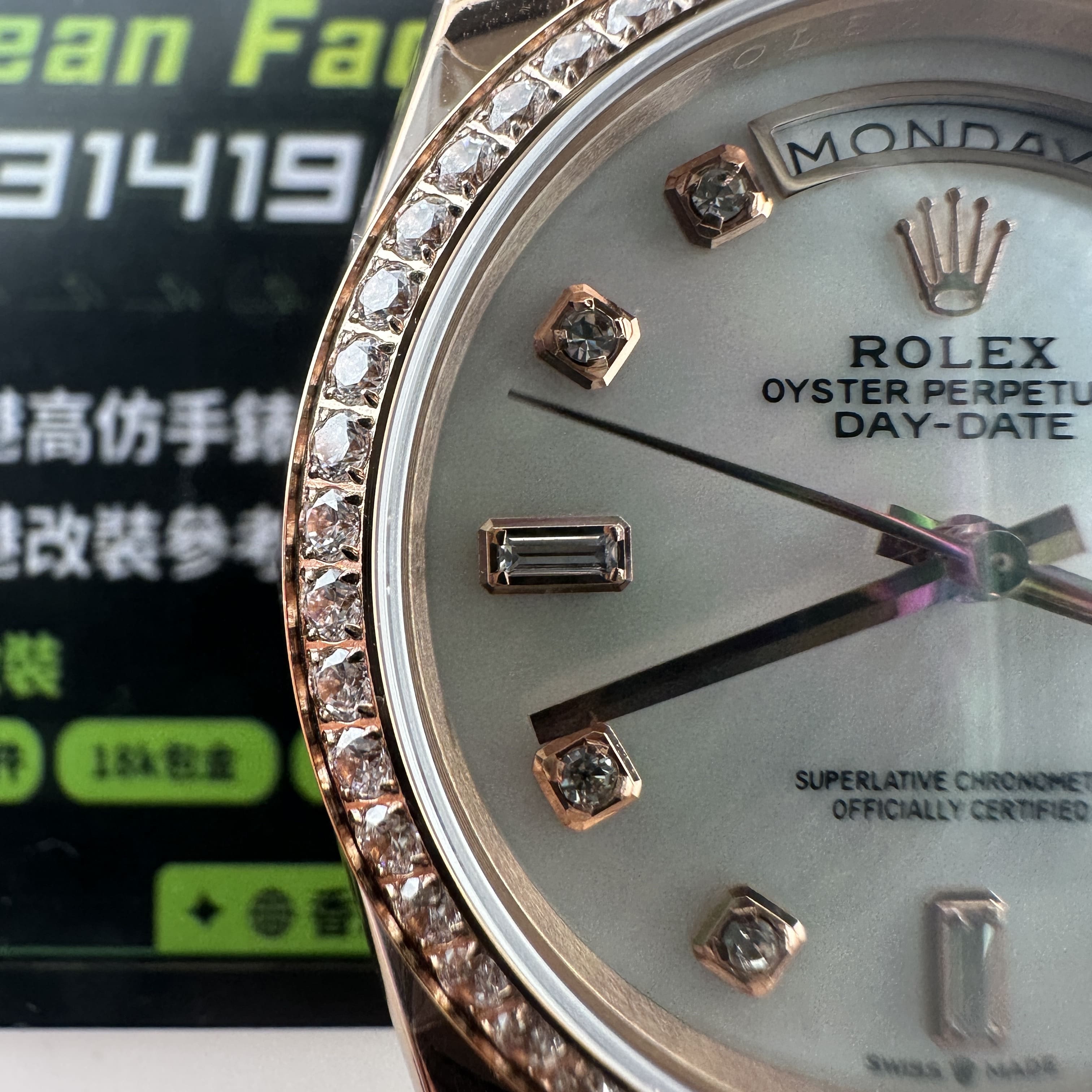 通過產品實物了解到高仿Rolex DD配重款式128345貝母款圈口部分鑲嵌了鑽石材質,是使用了莫桑鑽材質打造,如果針對品質有需求的情況下,後期是可以升級人工培育鑽,只不過費用比較高,大家可自行選擇.盤面部分高仿勞力士DD配重採用的是純天然雲貝母材質構造而成,每一張盤面的紋理紋路都是自然視覺感,通透同時也展示出獨秀的高級美感.勞力士Day-Date系列設定了雙日曆顯示,星期顯示以及日曆顯示,都是百分百還原.