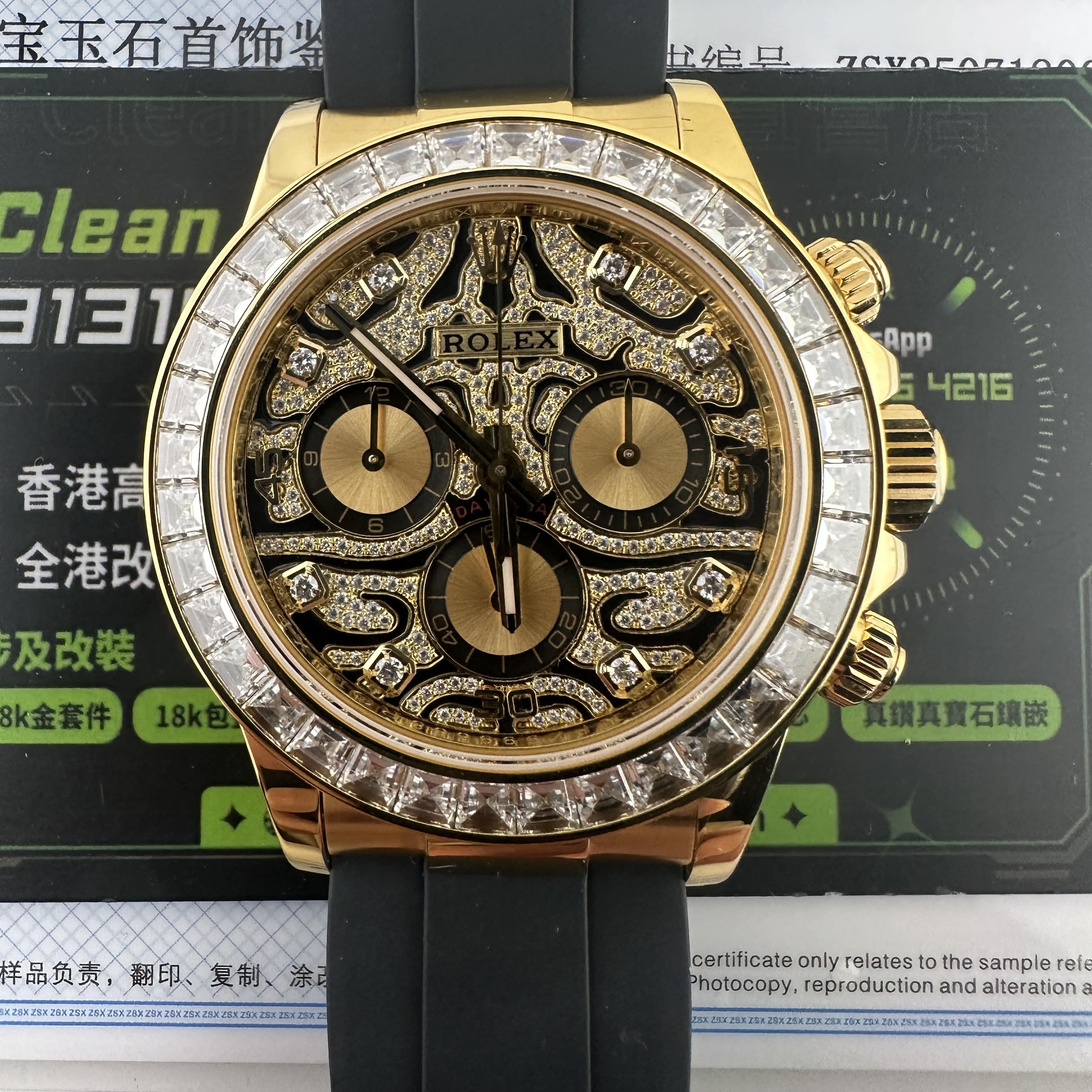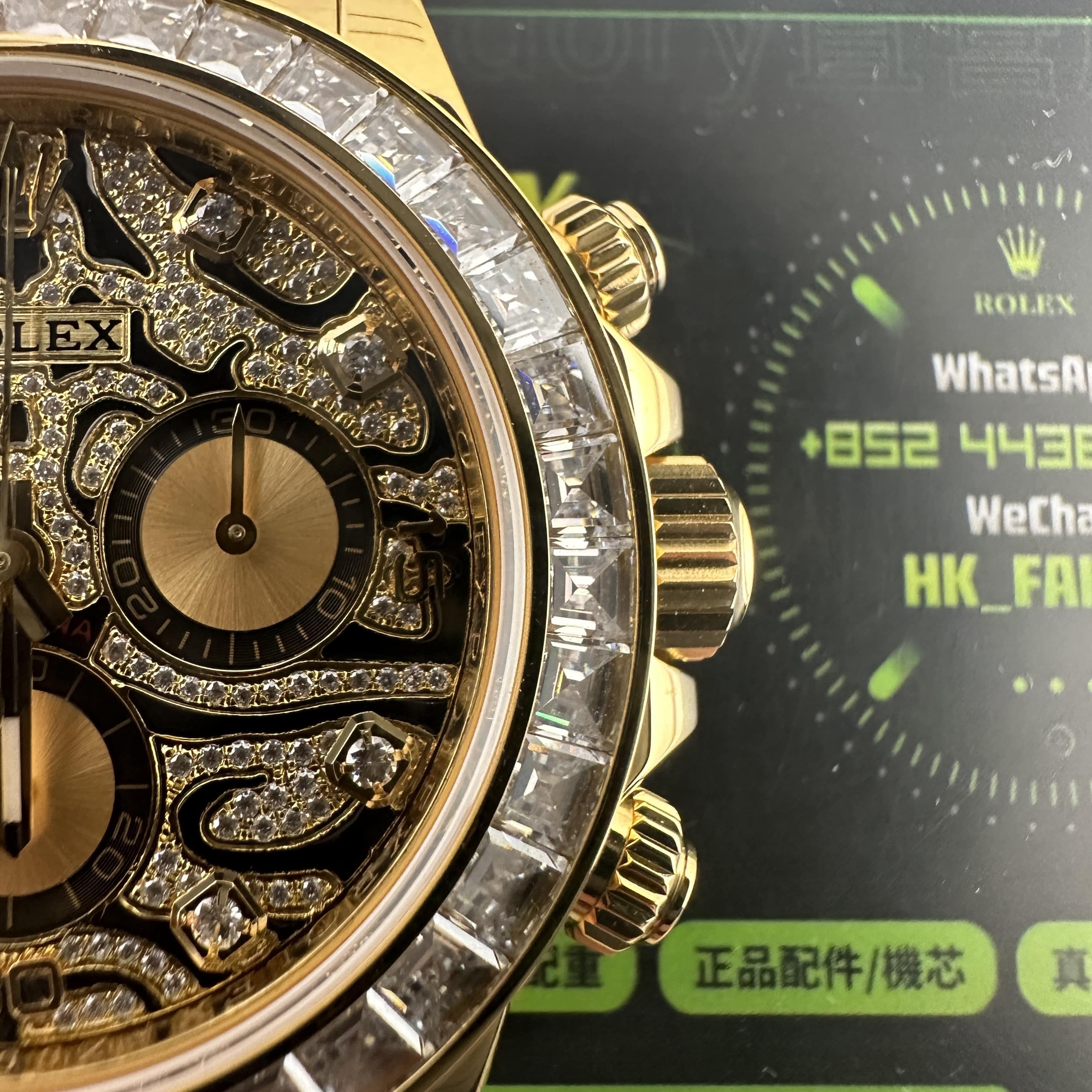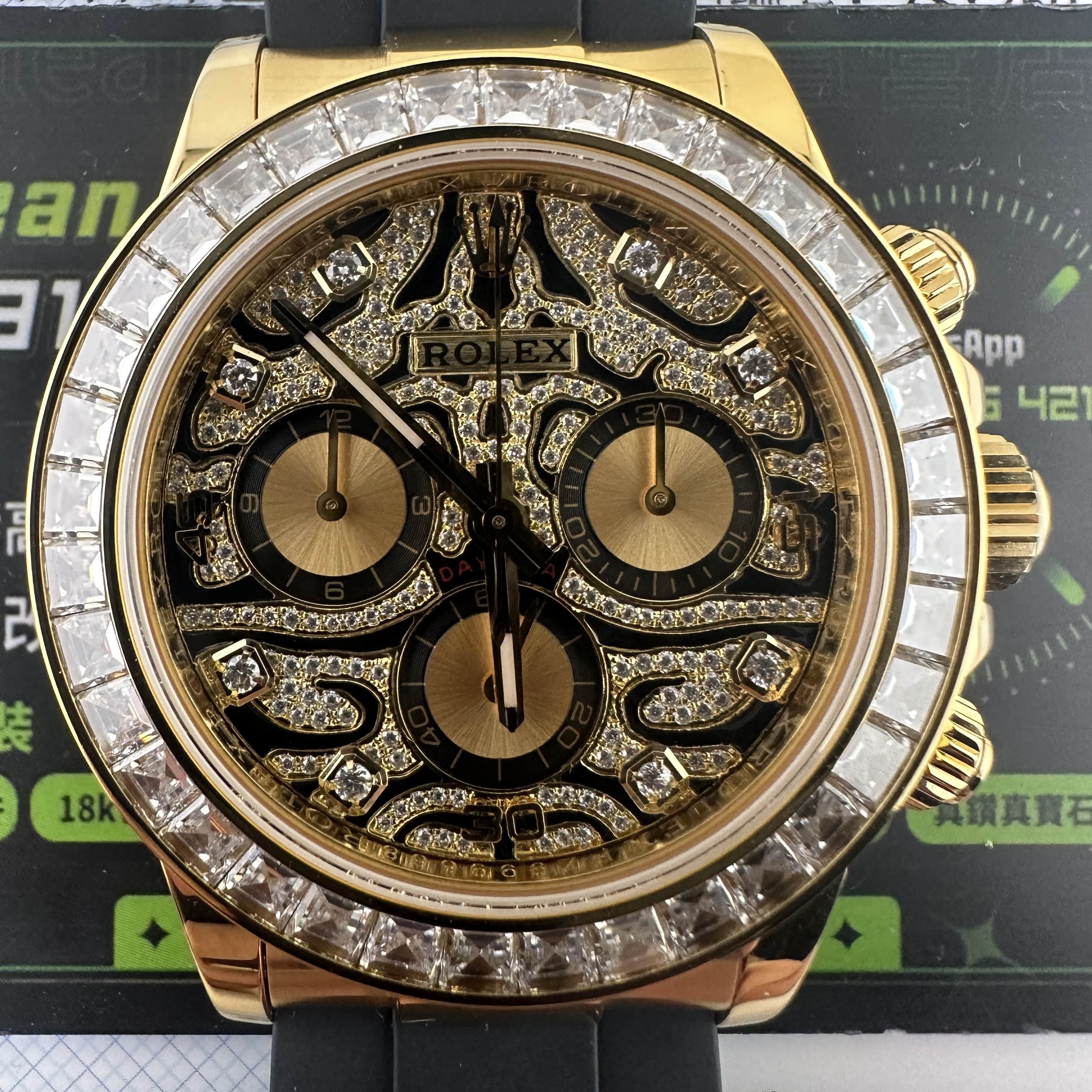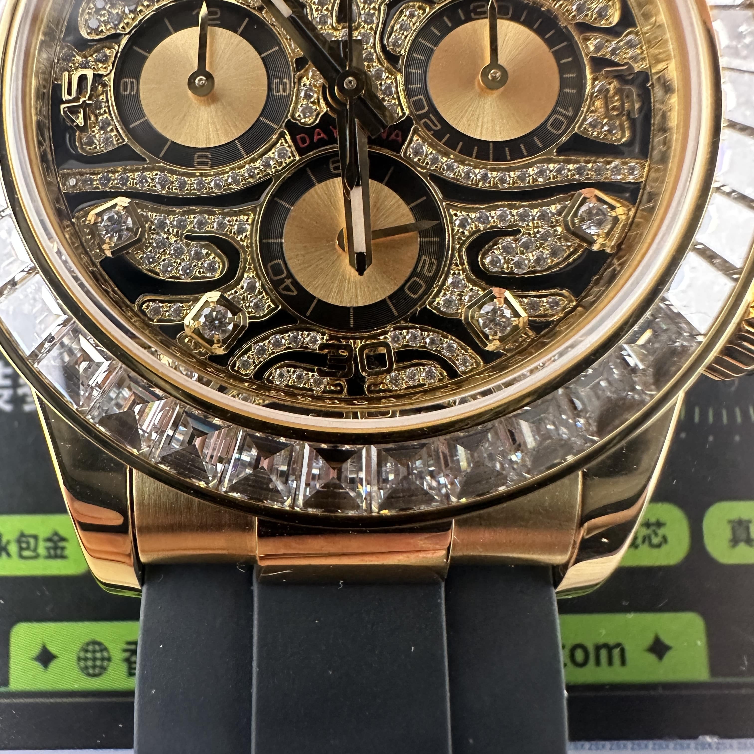 高端私人訂製高仿勞力士地通拿116588TBR老虎地改裝升級足重版本,腕錶直徑40mm,與常規的Daytona是同一個尺寸規格.整錶克重做到了154克,同步正品一樣的克重比例!外觀部分是迎面而來的"滿鑽"視覺感,圈口到錶盤部分均是通過鑽石構造而成,而地通拿三個眼睛依舊是保留呈現,這是地通拿精髓所在!原裝正品使用的是真鑽石材質打造.