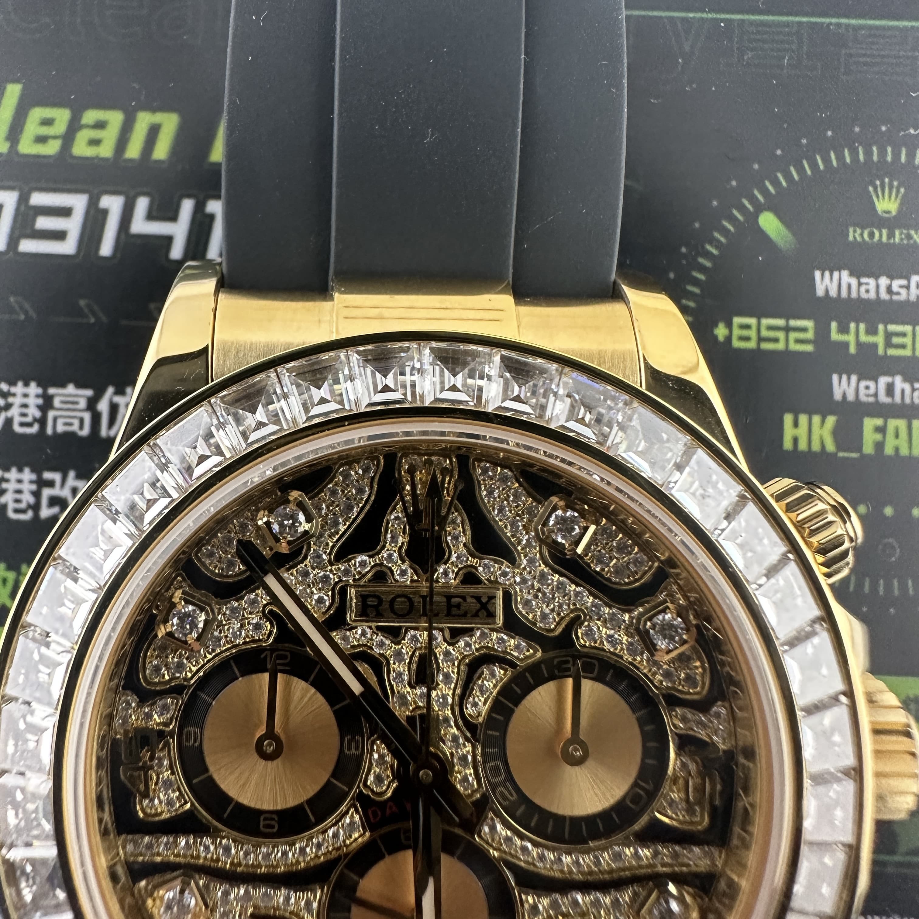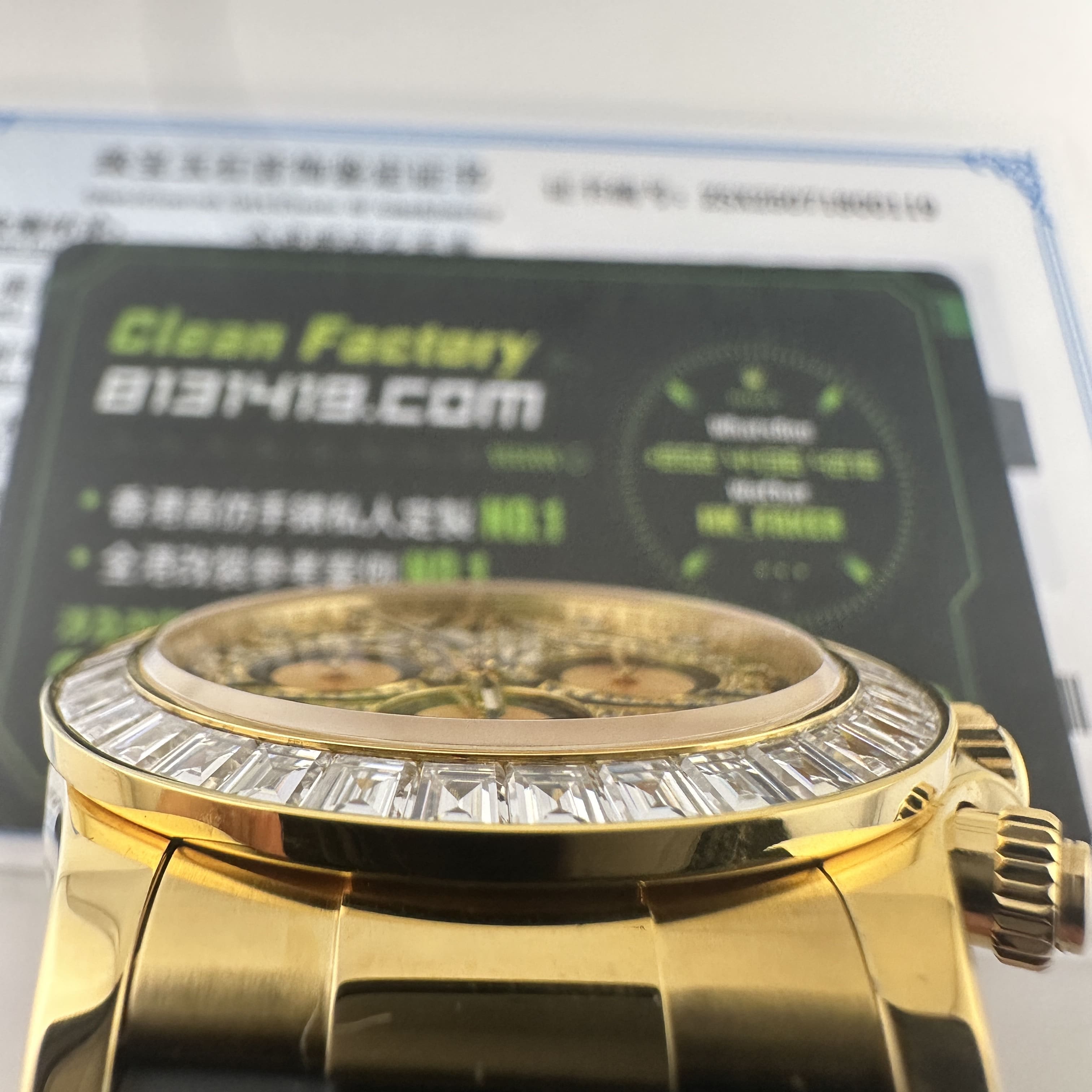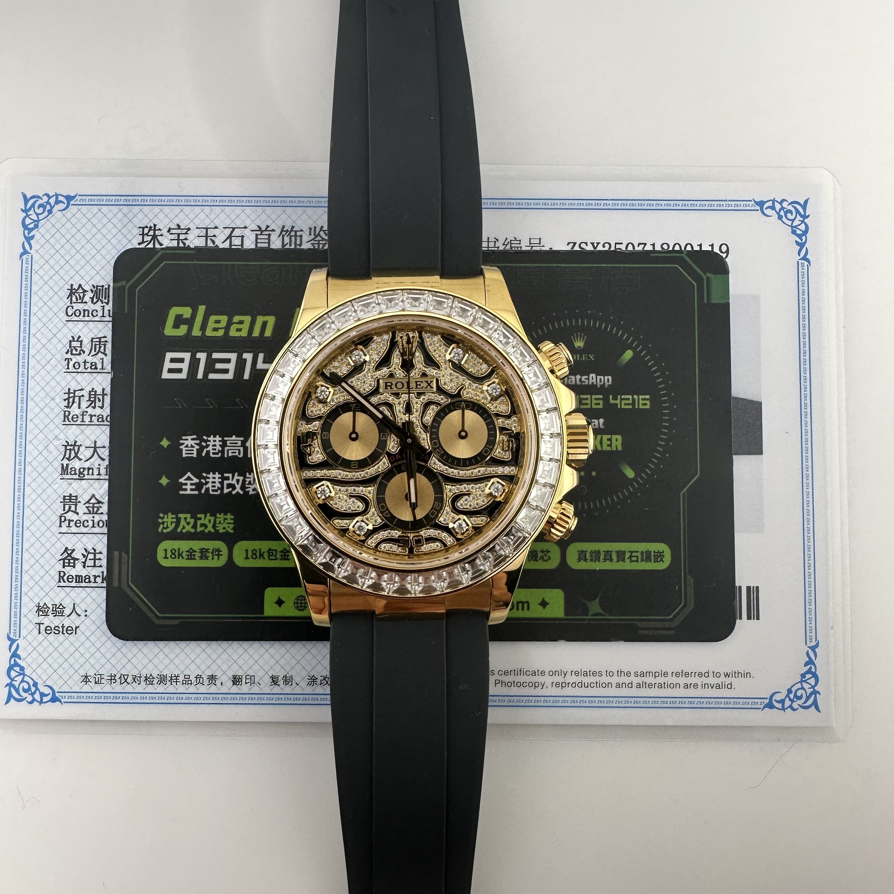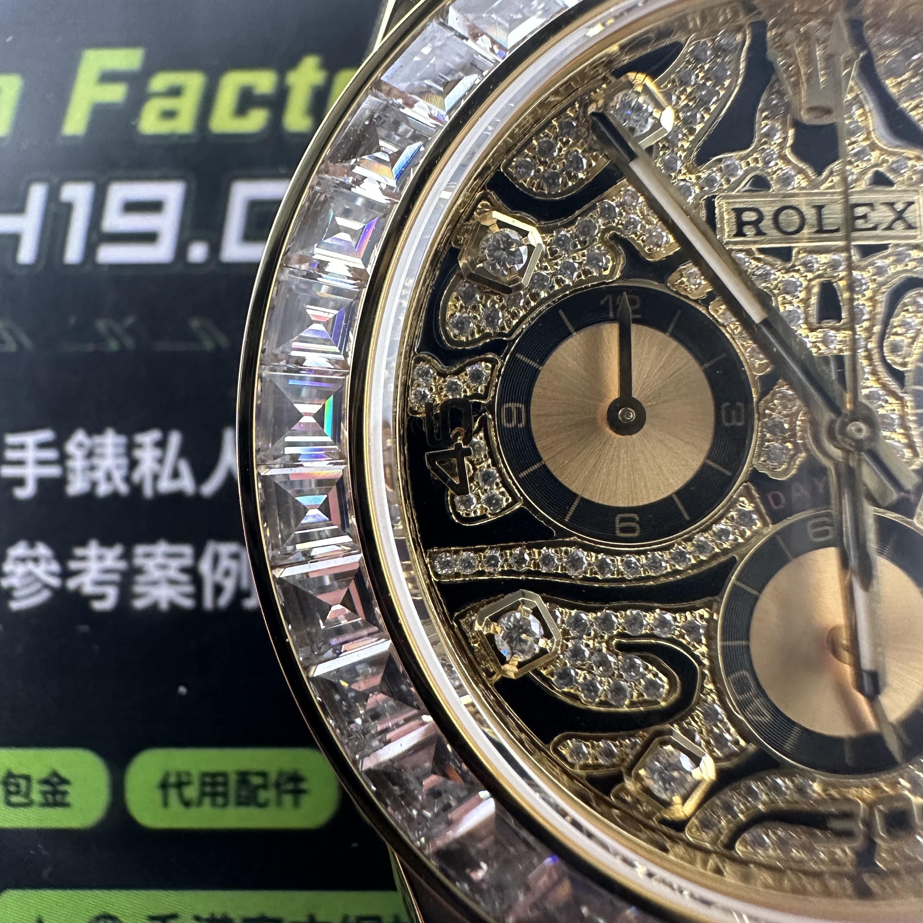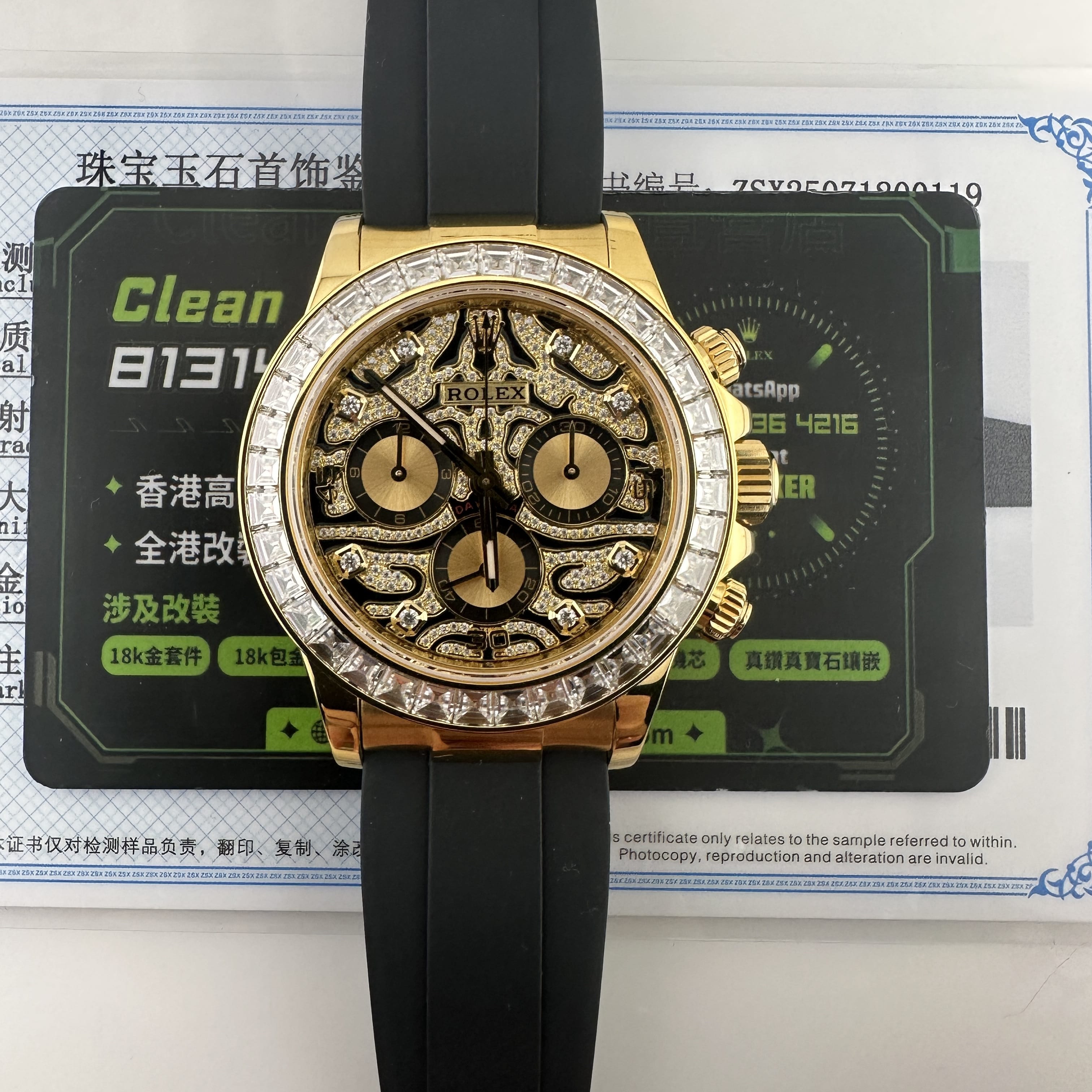 高端私人訂製高仿勞力士地通拿116588TBR老虎地改裝升級足重版本,腕錶直徑40mm,與常規的Daytona是同一個尺寸規格.整錶克重做到了154克,同步正品一樣的克重比例!外觀部分是迎面而來的"滿鑽"視覺感,圈口到錶盤部分均是通過鑽石構造而成,而地通拿三個眼睛依舊是保留呈現,這是地通拿精髓所在!原裝正品使用的是真鑽石材質打造.