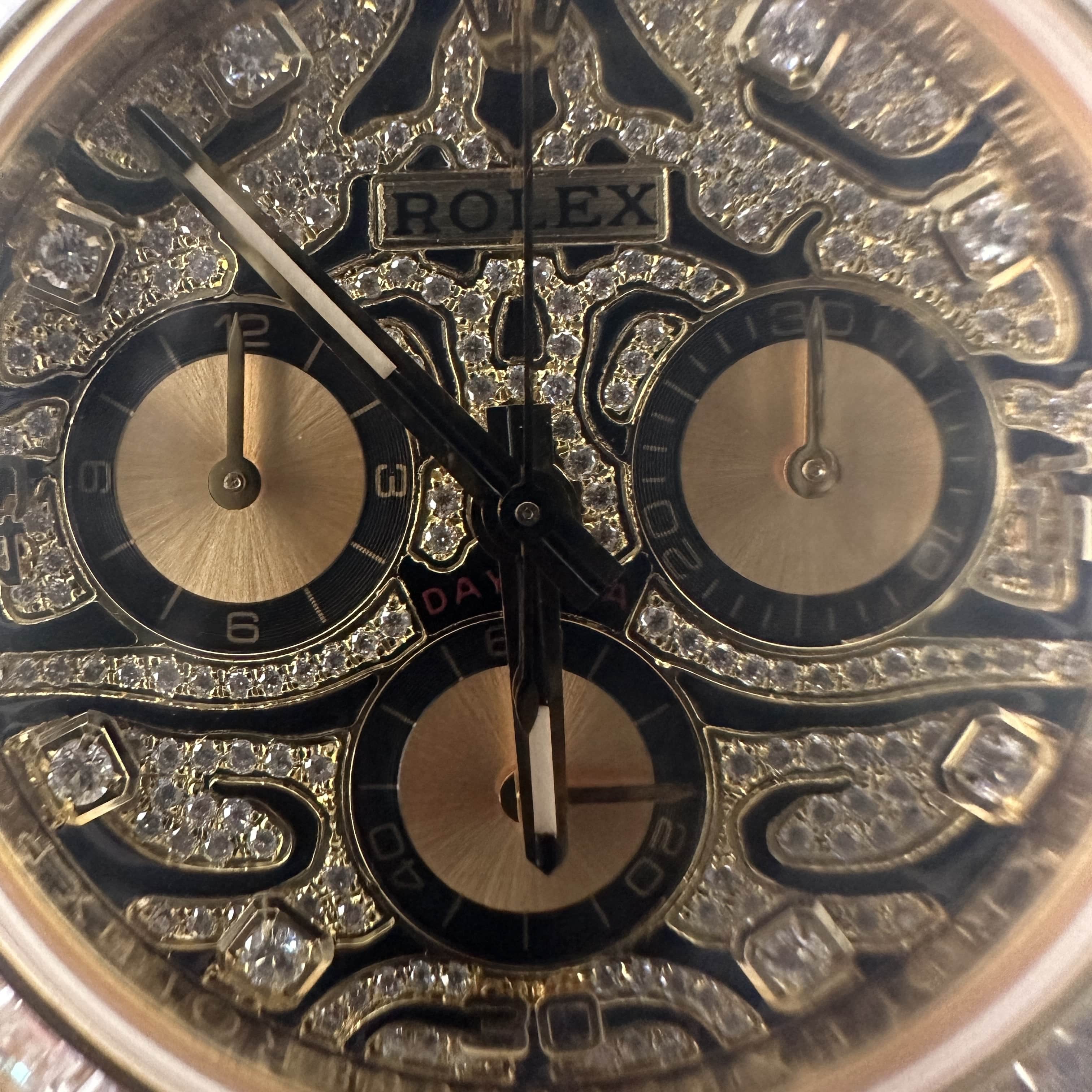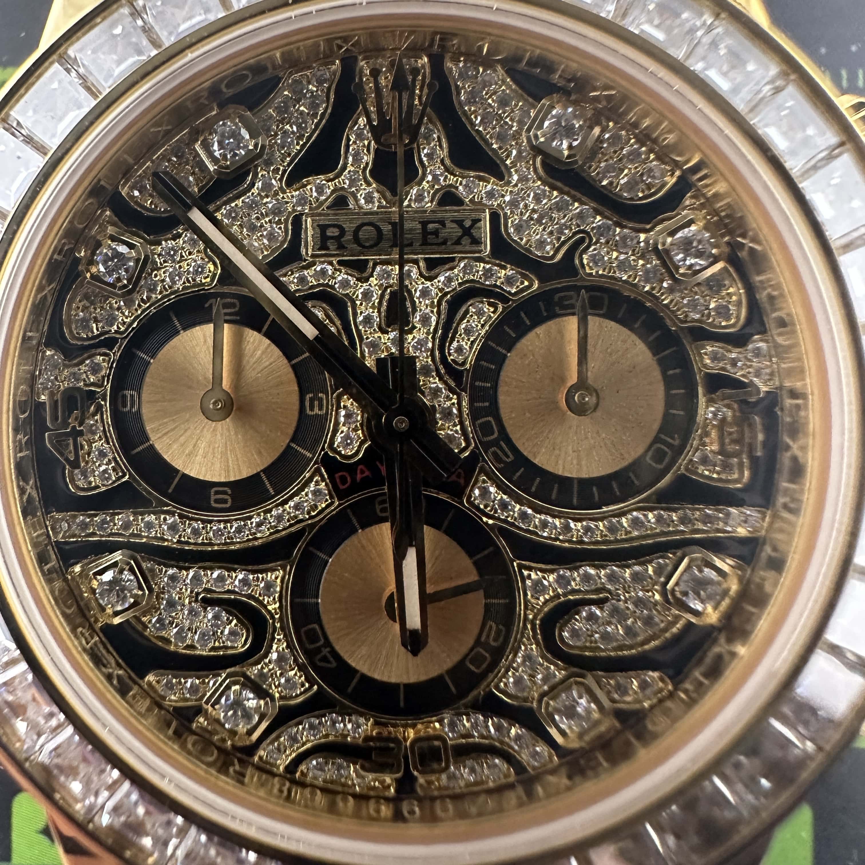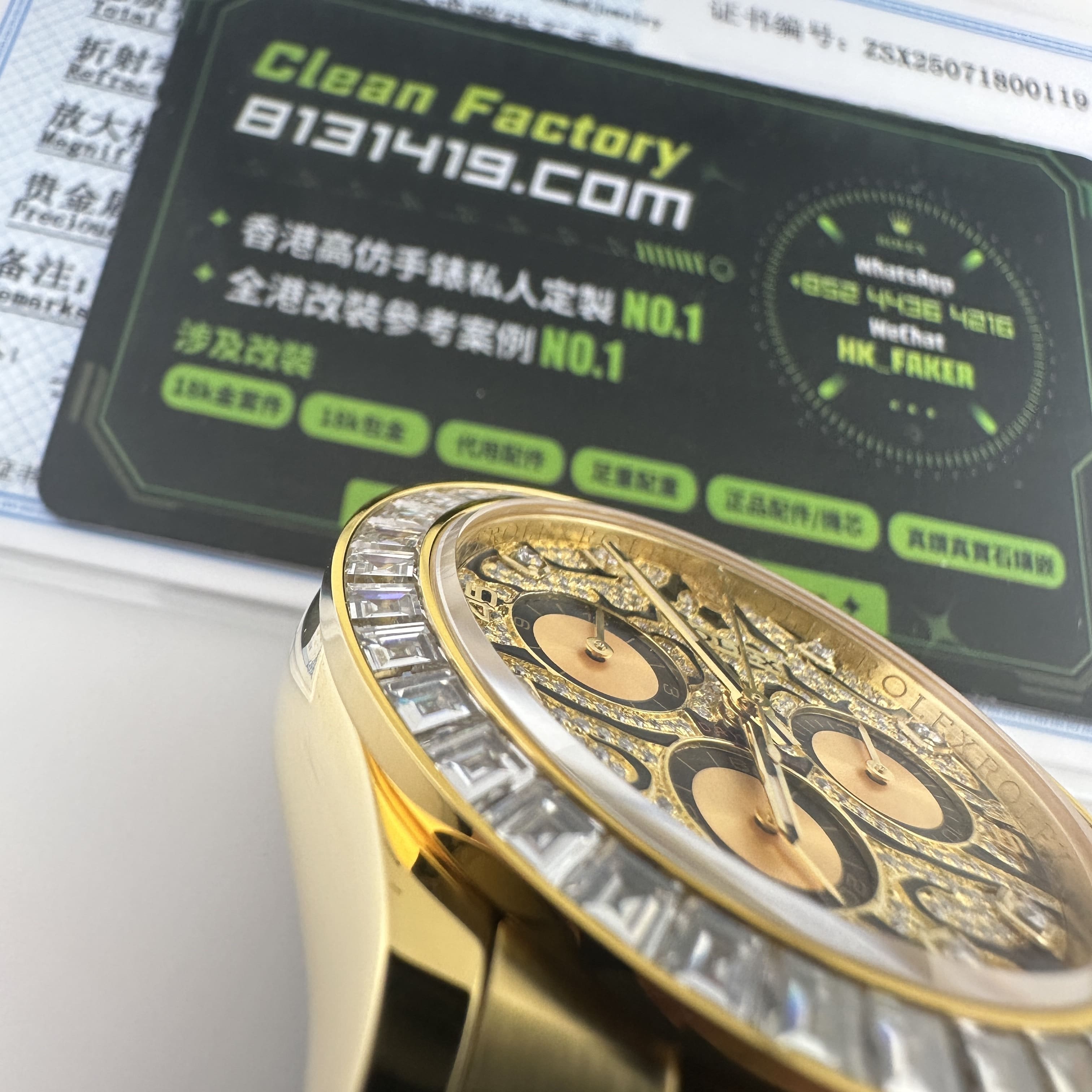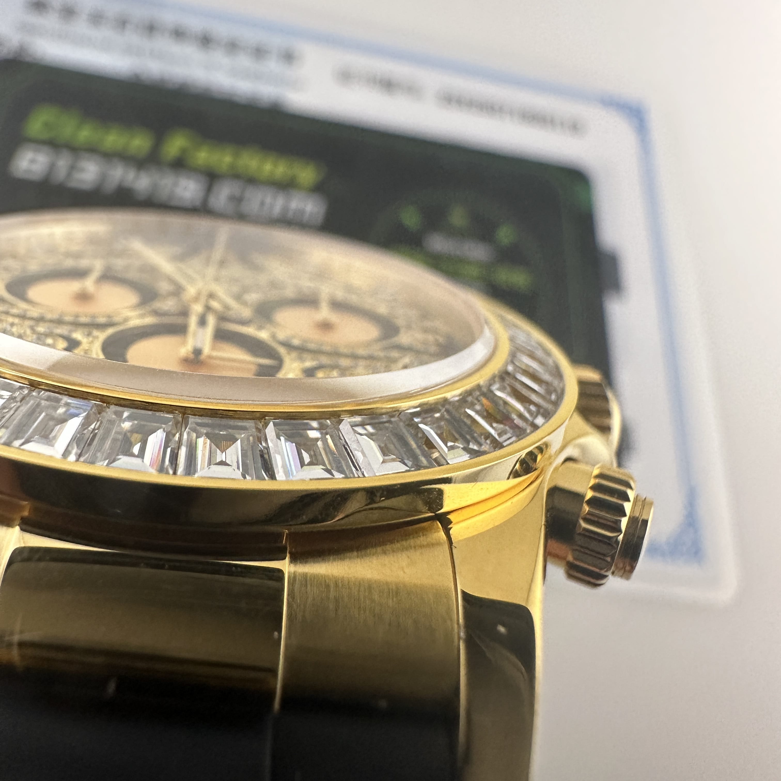 高端私人訂製高仿勞力士地通拿116588TBR老虎地改裝升級足重版本,腕錶直徑40mm,與常規的Daytona是同一個尺寸規格.整錶克重做到了154克,同步正品一樣的克重比例!外觀部分是迎面而來的"滿鑽"視覺感,圈口到錶盤部分均是通過鑽石構造而成,而地通拿三個眼睛依舊是保留呈現,這是地通拿精髓所在!原裝正品使用的是真鑽石材質打造.