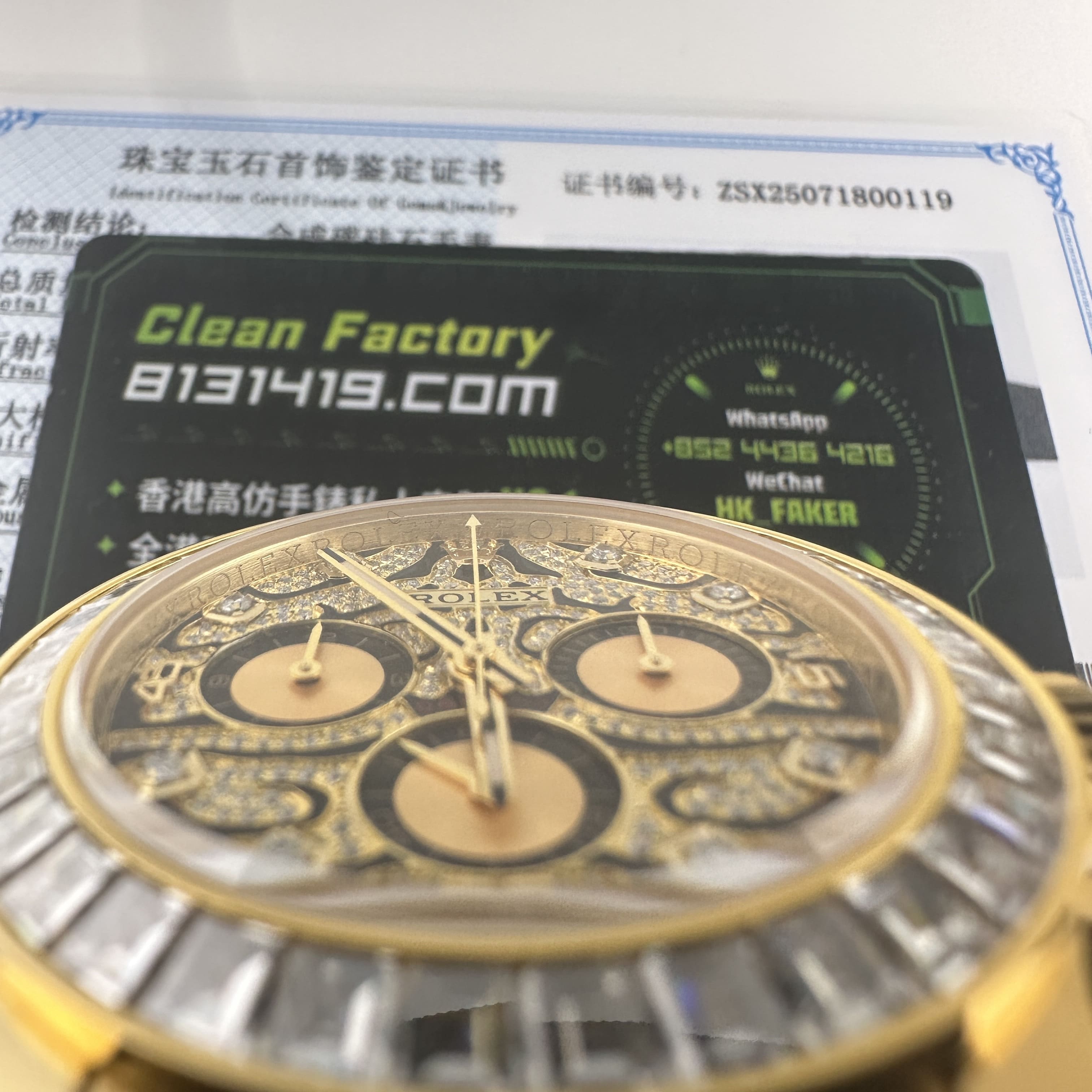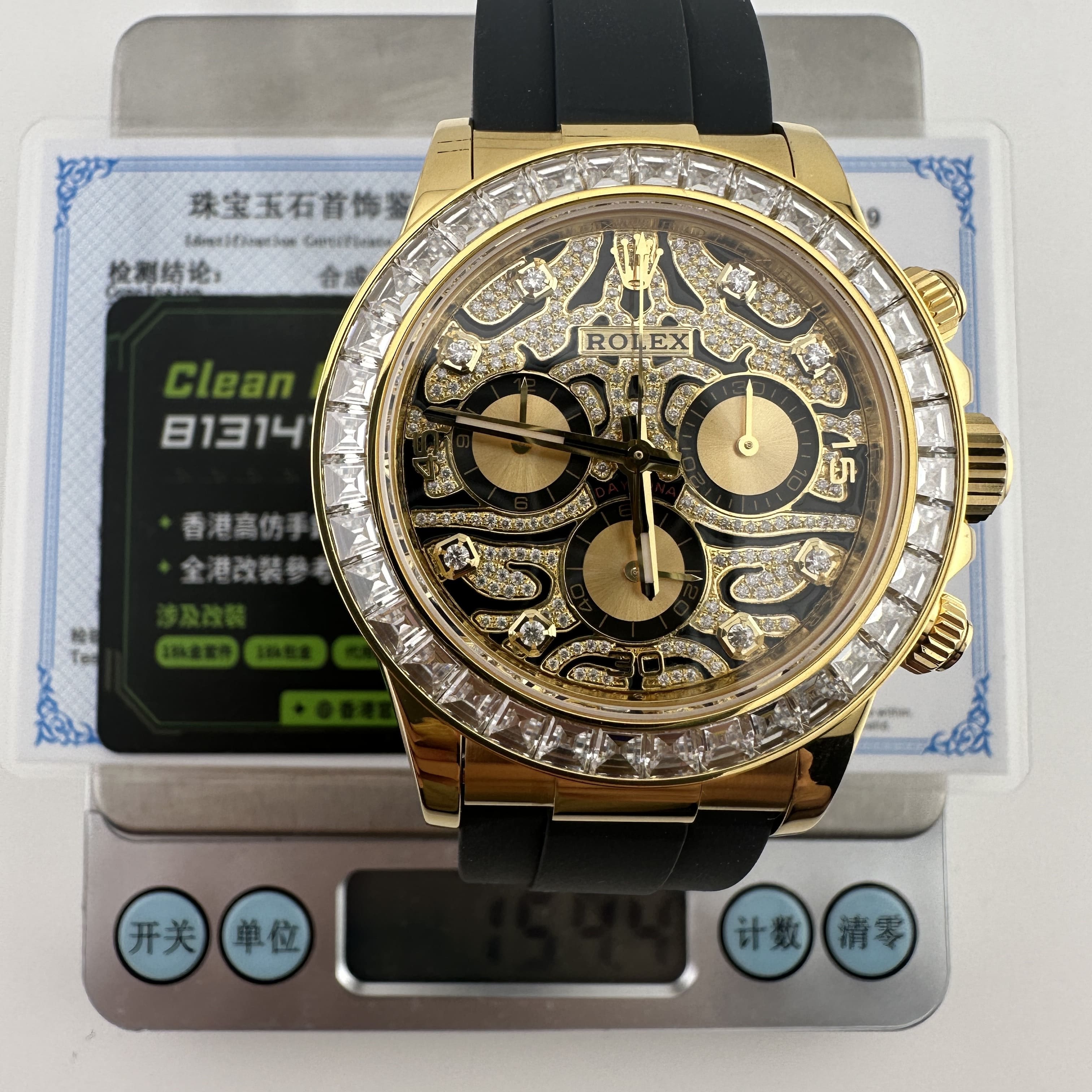高仿地通拿116588TBR老虎地重量是做到了154克,原裝正品的重量是在153克到158克左右.主要涉及到橡膠錶帶是不同尺寸會造成幾克左右的重量誤差.配重足重訂製版本使用了混合重金屬材質打造錶扣,其密度大小非常接近18K金材質,因此兩者之間的誤差既可以做到接近或者是還原.鑽石材質選擇莫桑鑽訂製圈口,閃度與切割面接近原版,加上人工成本而言,使用莫桑鑽最合適.