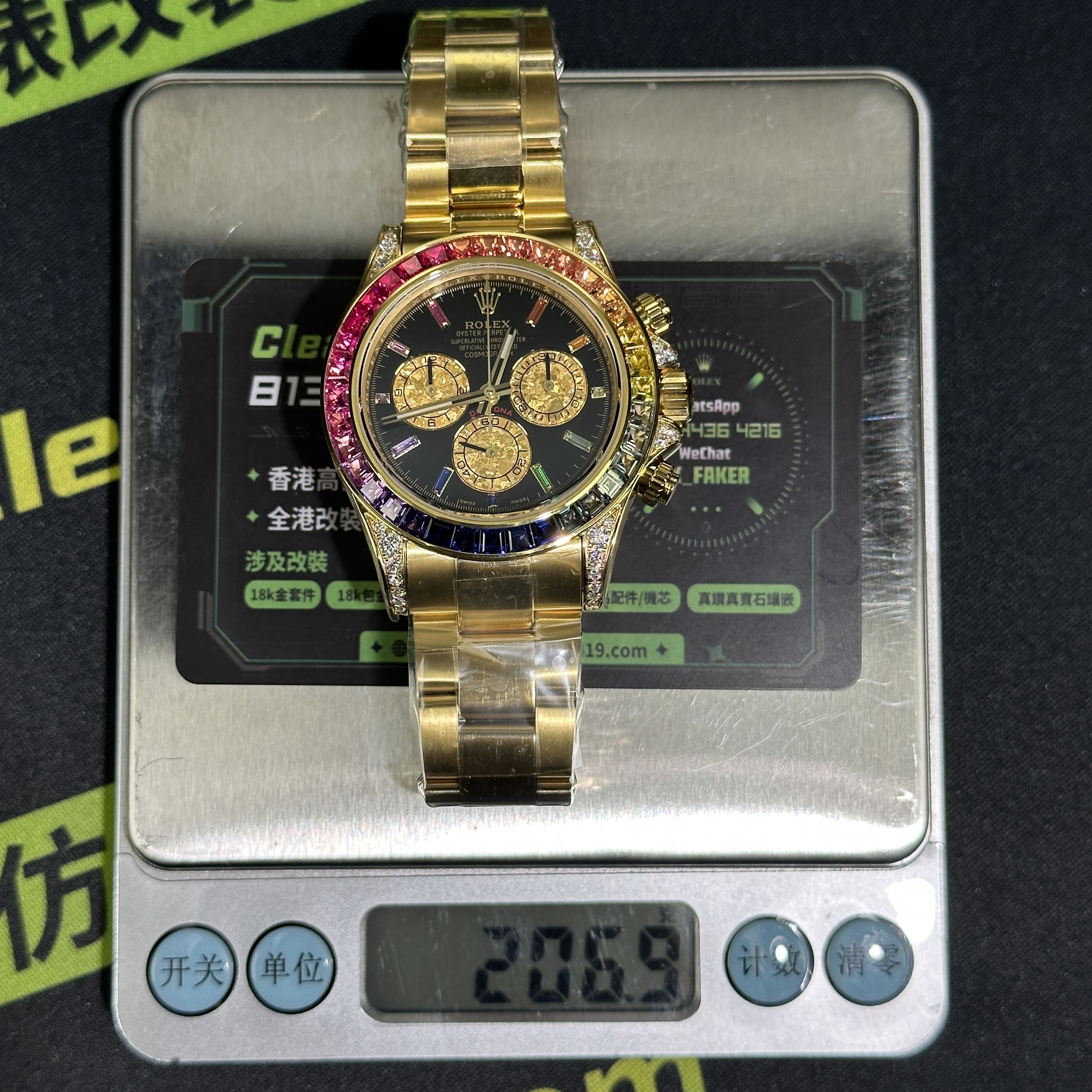 私人訂製款足重版本高仿勞力士地通拿116598RBOW-0004黃金彩虹地錶款全面打造206克,重量方面對比專櫃版本絕對達到了1:1復原.高仿勞力士官方隱藏款中彩虹地通拿涉及款式有玫瑰金,黃金,以及白金款式.而黃金版本的高仿地通拿彩虹地訂製版本在高仿市面上卻比較少!而足重版本加上訂製款的用料對比普通廠貨版本更具有性價比.其中這一隻是基礎款式,並未經過18K包金升級,材質使用了可包金的混合重金屬材質,不掉色,杜絕氧化.