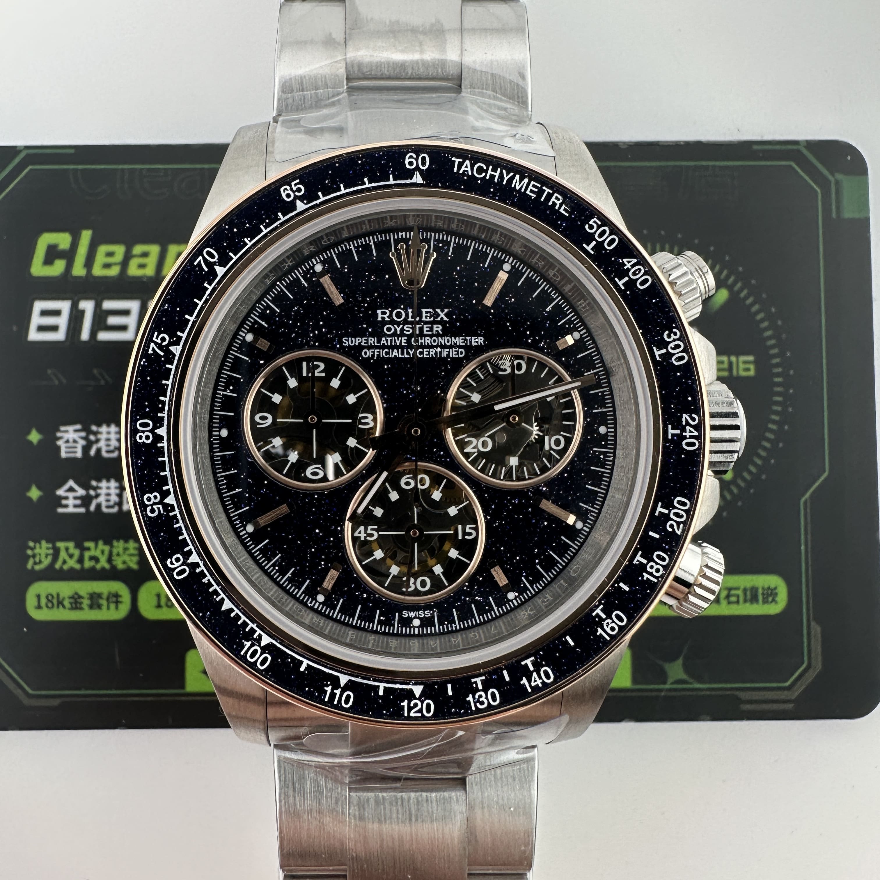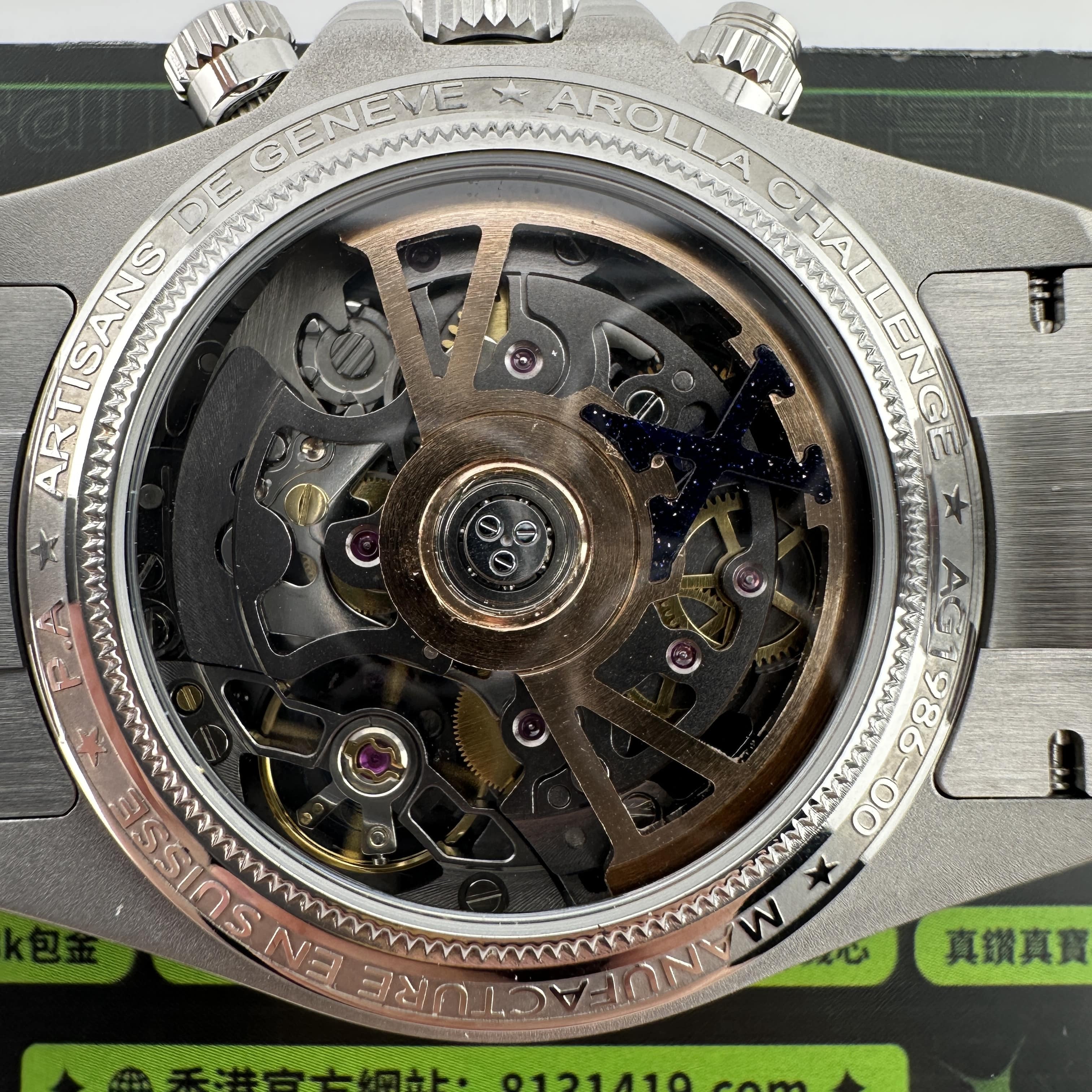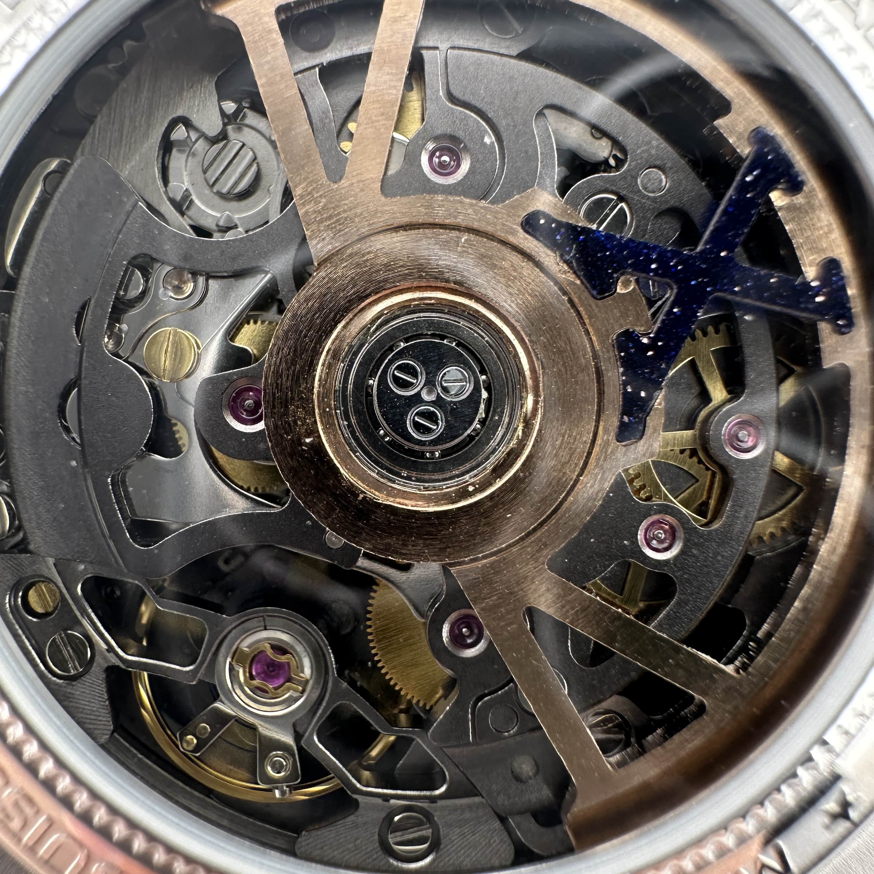 表盤采用鏡面拋光砂金石,半透明藍寶石和金屬鍍層,形成鮮明對比,提升易讀性.轉印圖案采用手工完成,時標則以純玫瑰金打造.而砂金石石英一種由銅和玻璃融合而成的"偶然"材料,使用強調了手表的核心主題:不可預測性.這種具有歷史意義的18世紀材料賦予了這款手表獨特的深藍色光澤,與玫瑰金(高仿版本電鍍金)和藍寶石水晶相結合,形成了令人印象深刻的對比.此外,它還激發了人們對命運和機遇的思考.錶圈上鑲嵌有砂金石,呈現出一種既對比又和諧的材質和形狀的巧妙搭配.