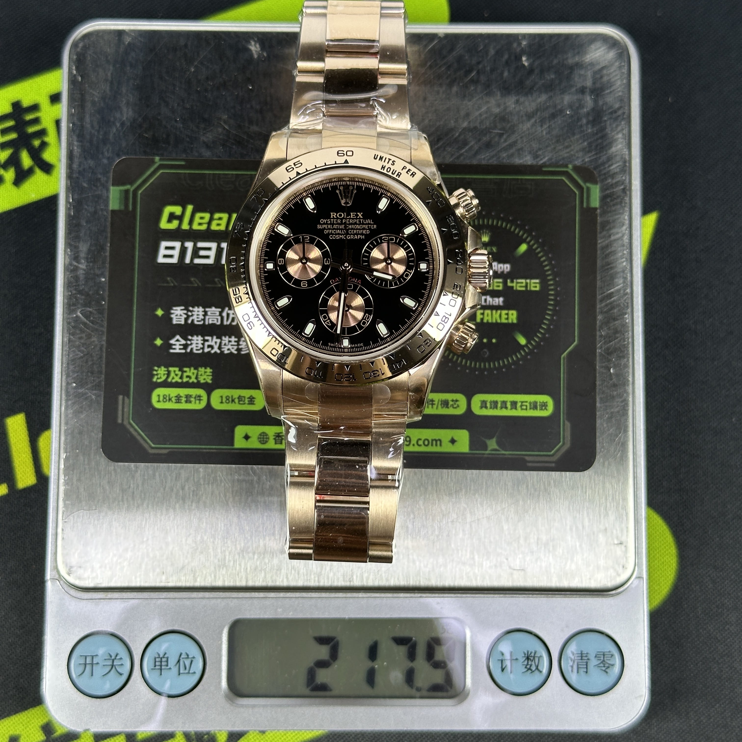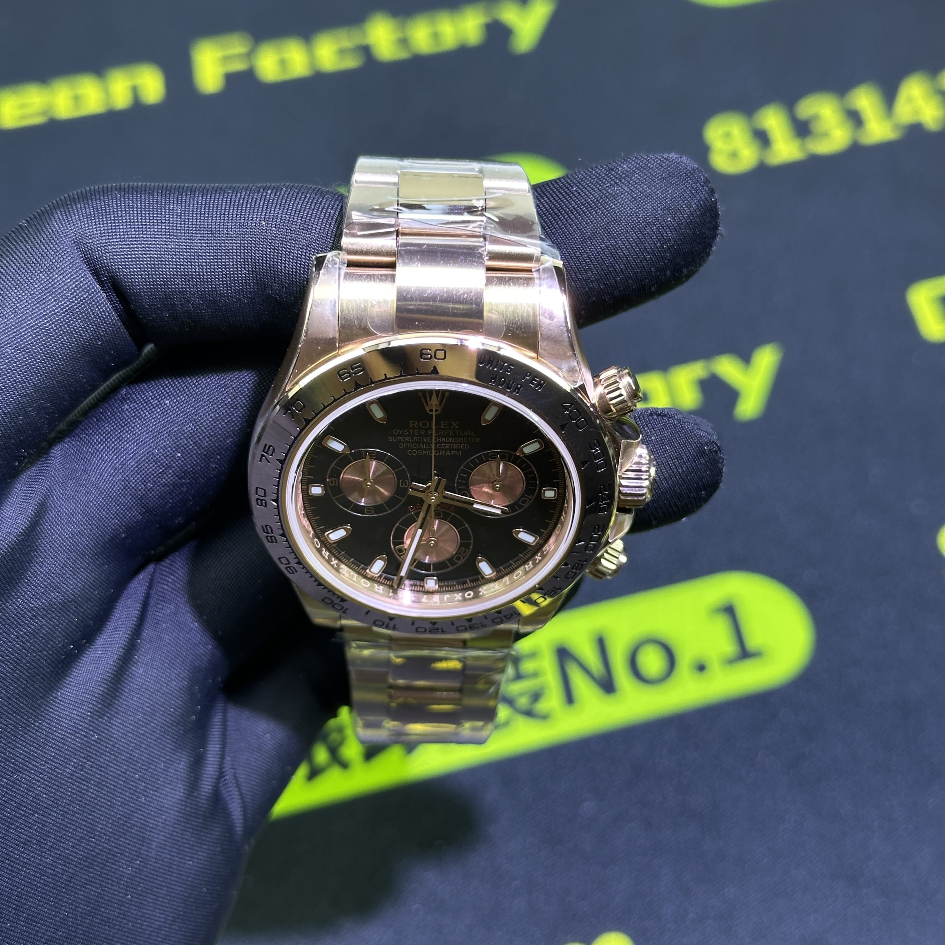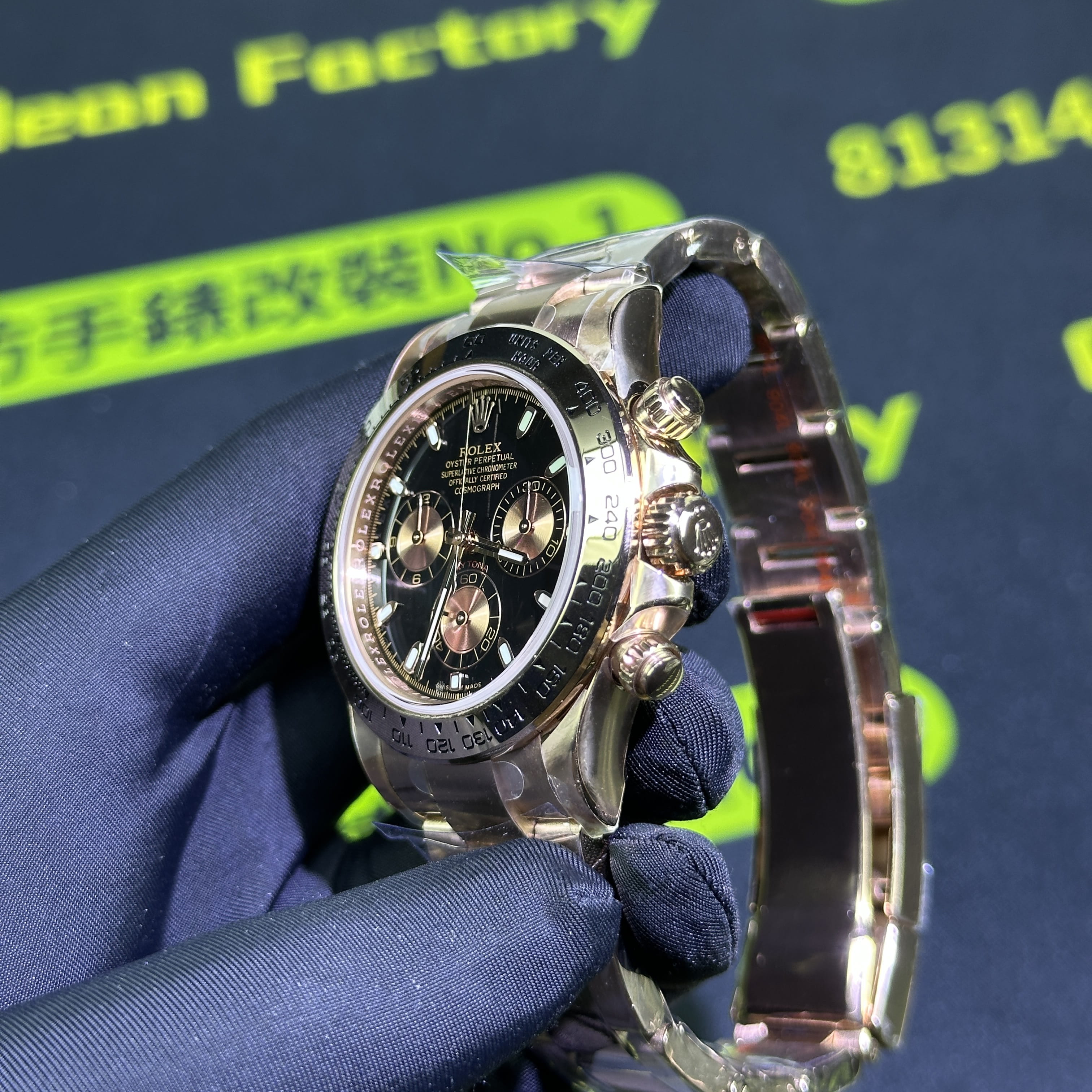 私人訂製高仿勞力士地通拿m116505-0008足重版本,整錶克重達到了217克,對比原裝正品是達到了99%重量還原.作為高仿地通拿玫瑰金足重也是必須擁有的基礎條件.大家針對錶盤部分的三個"金眼睛"對比原裝正品還原度有多高?高仿市面上有很多廠家推出的高仿玫瑰金地通拿其錶盤都存在不對版的情況,主要原因是很少廠家去投入資金使用原版開模做到原裝正品金眼睛盤面進行1:1調色.而這一隻高仿地通拿改裝升級足重版本使用的盤面其色差以及放射紋角度非常飽滿.
