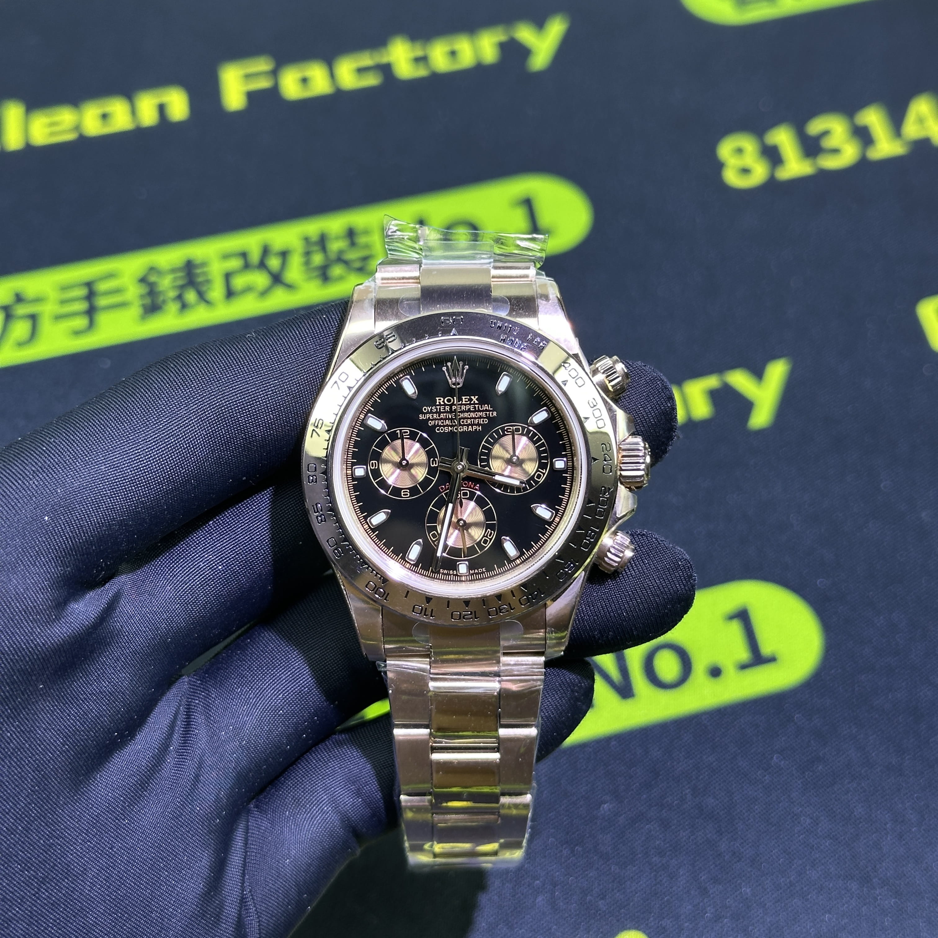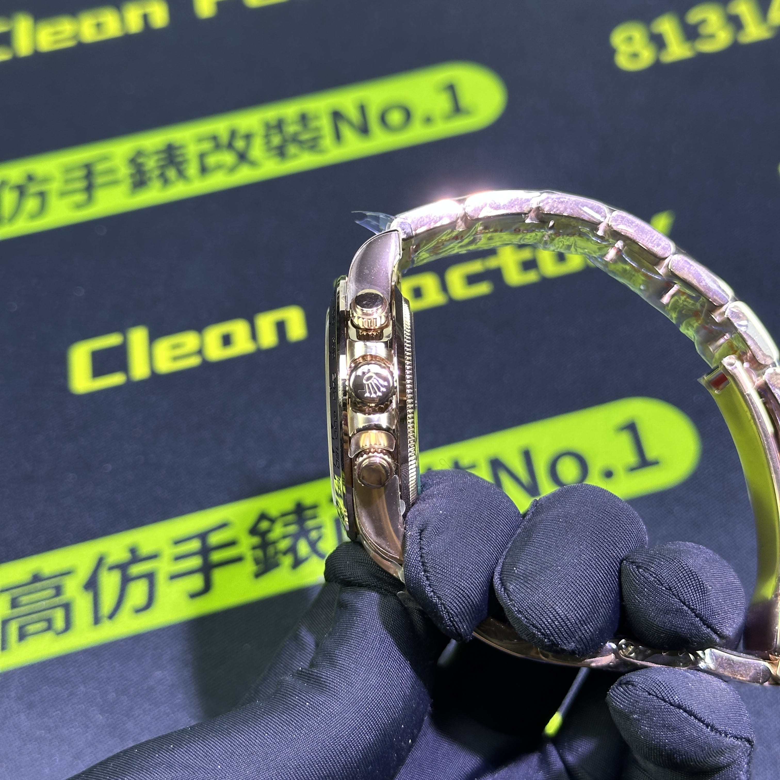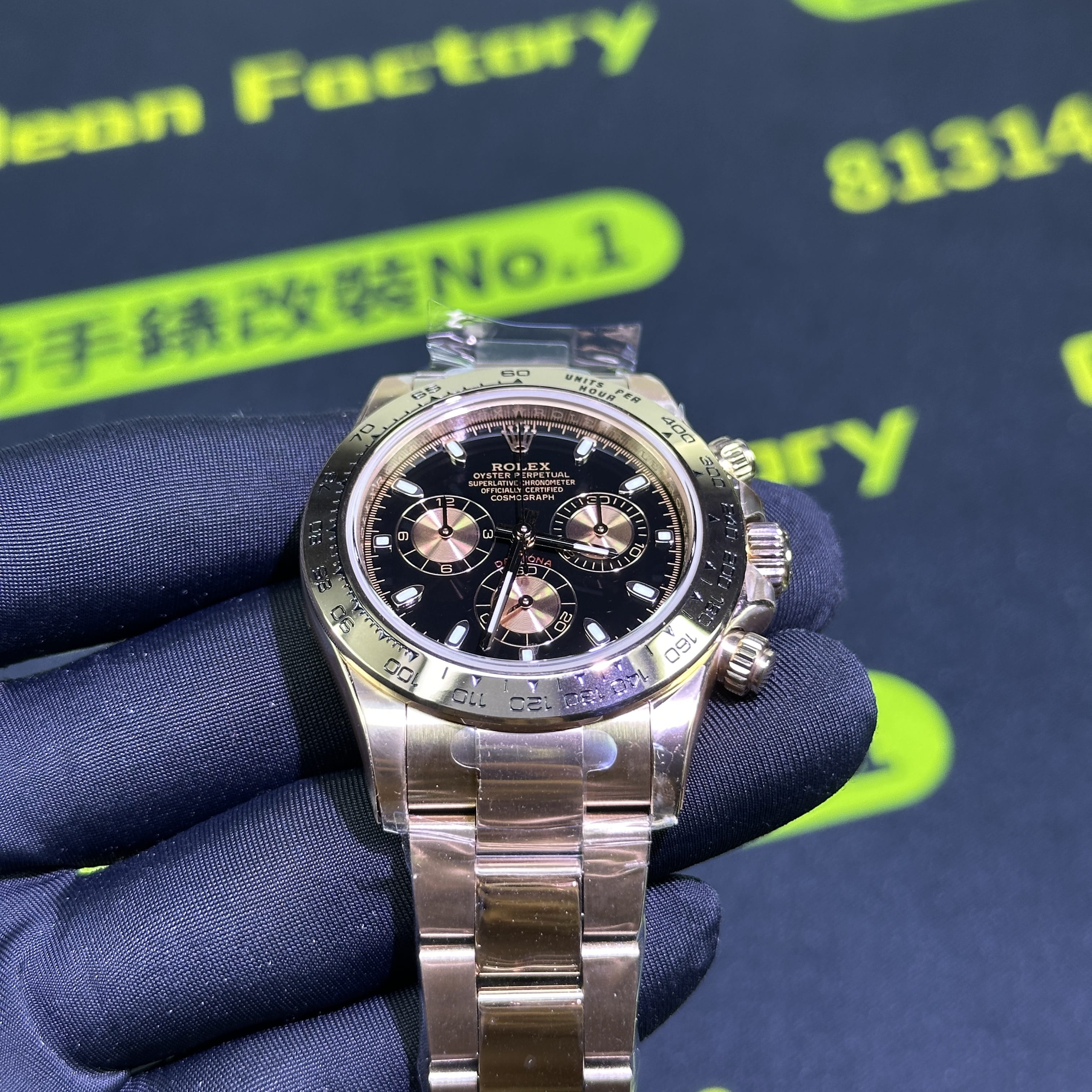 高仿地通拿116505金眼睛訂製版本BUFF指針中軸套件我們也是標配升級,其次是升級DEEP高透玻璃,對於防指紋效果,以及霧氣的效果,DEEP高透玻璃都可以做到同步原版有效防止錶盤玻璃出現模糊的缺陷.其次是機芯方面的升級,我們是可以選擇丹東4130機芯,也就是置換,目前高仿勞力士粉冰糖搭載的是一體4130機芯,而丹東4130機芯的穩定性也是高仿市面上最頂級的機芯,最後我們會升級降噪處理.後續外觀色澤可以升級18K包金效果,對版原裝正品色澤.