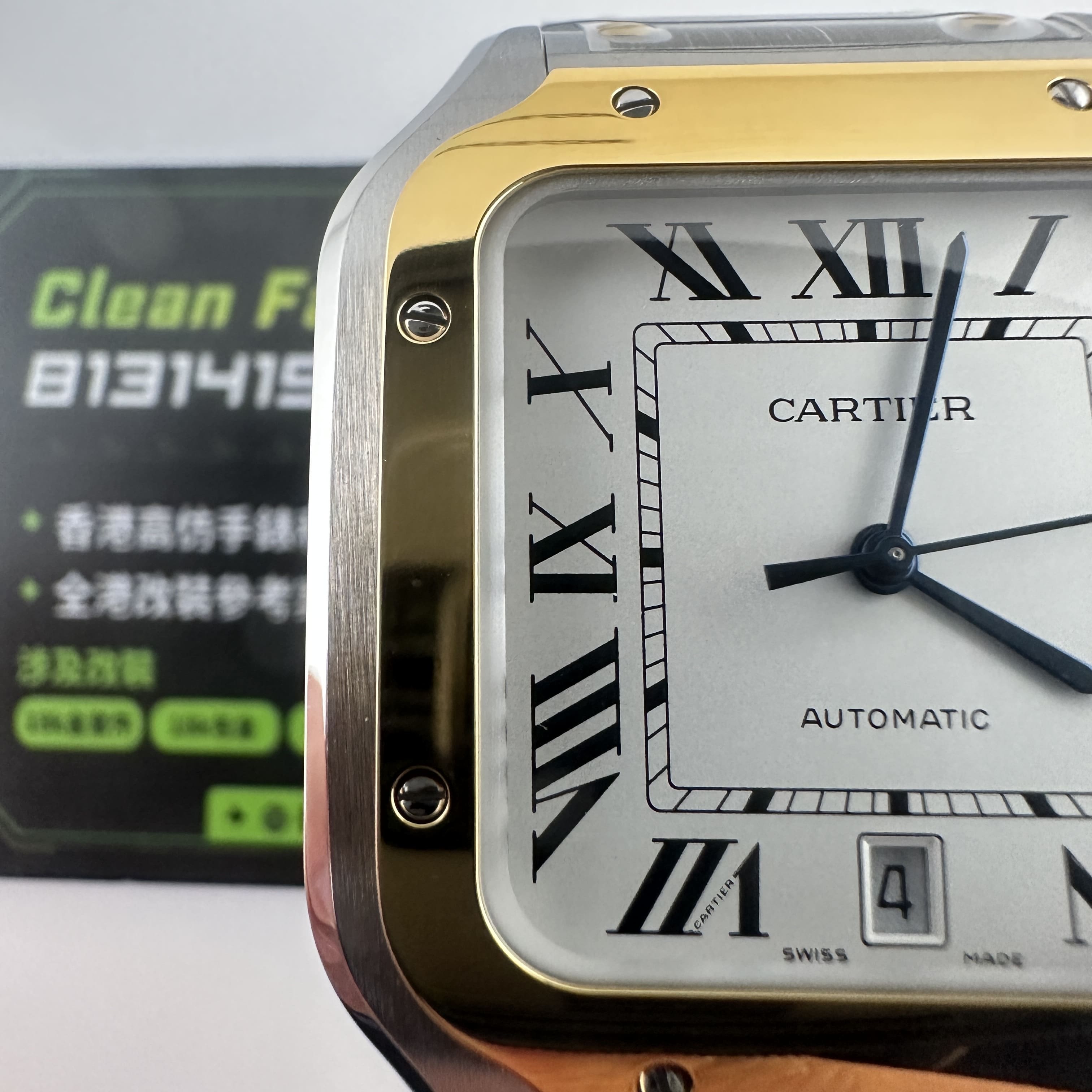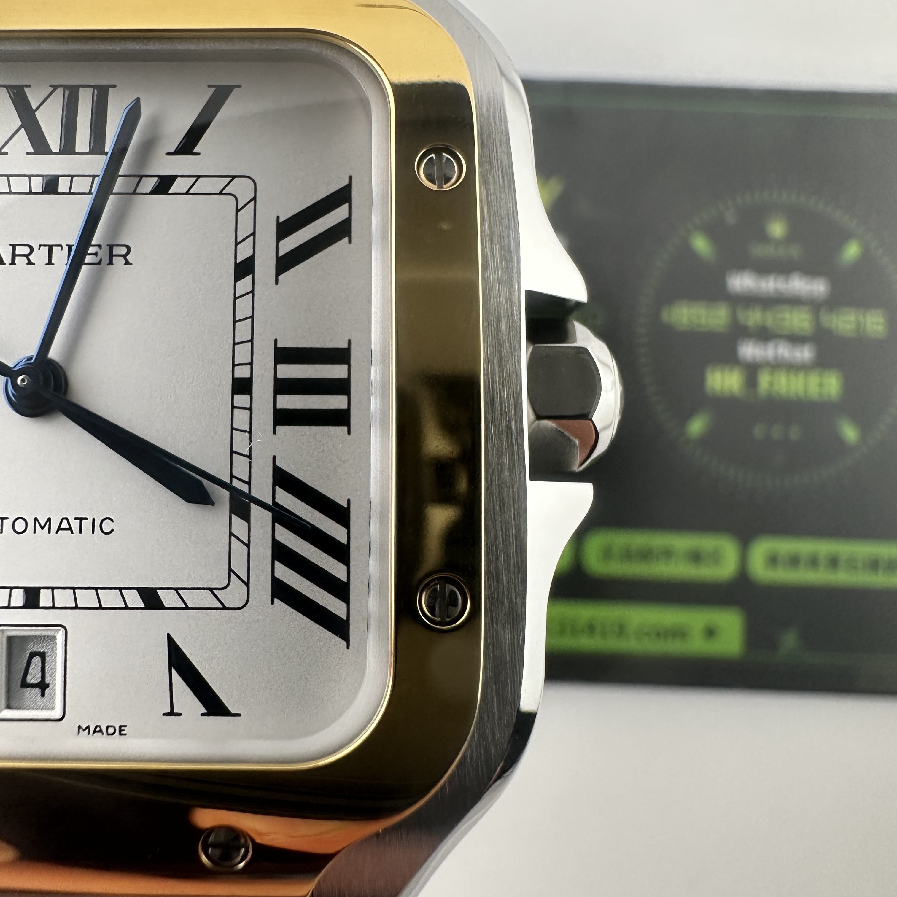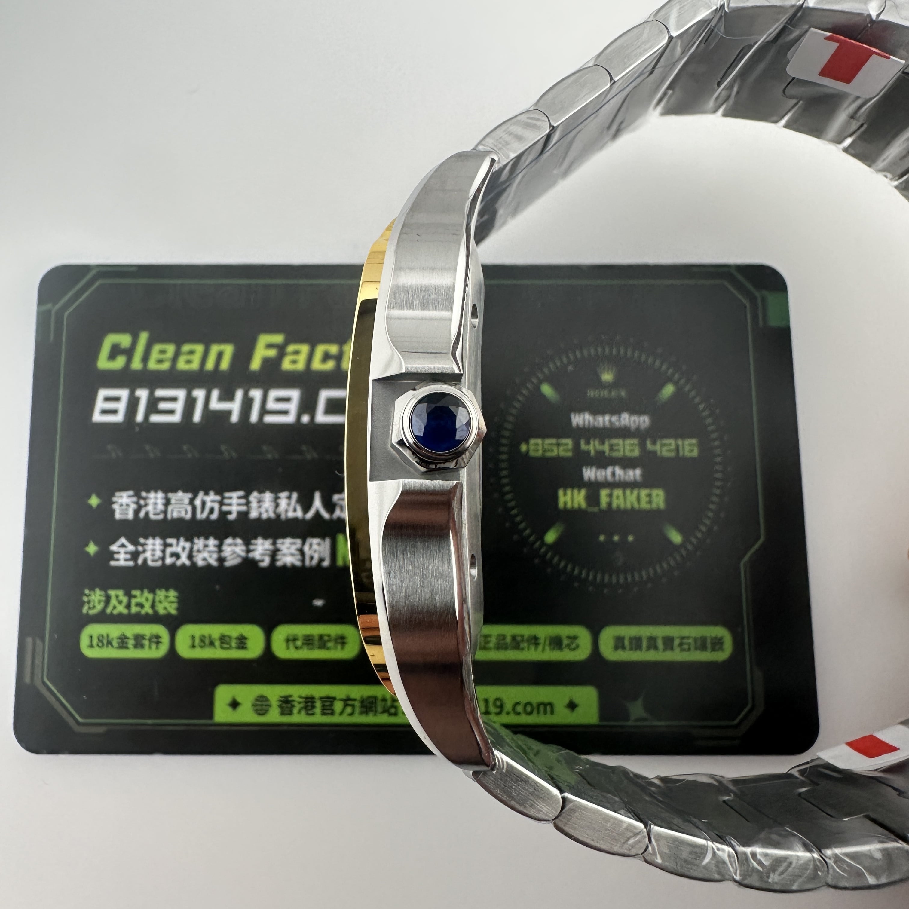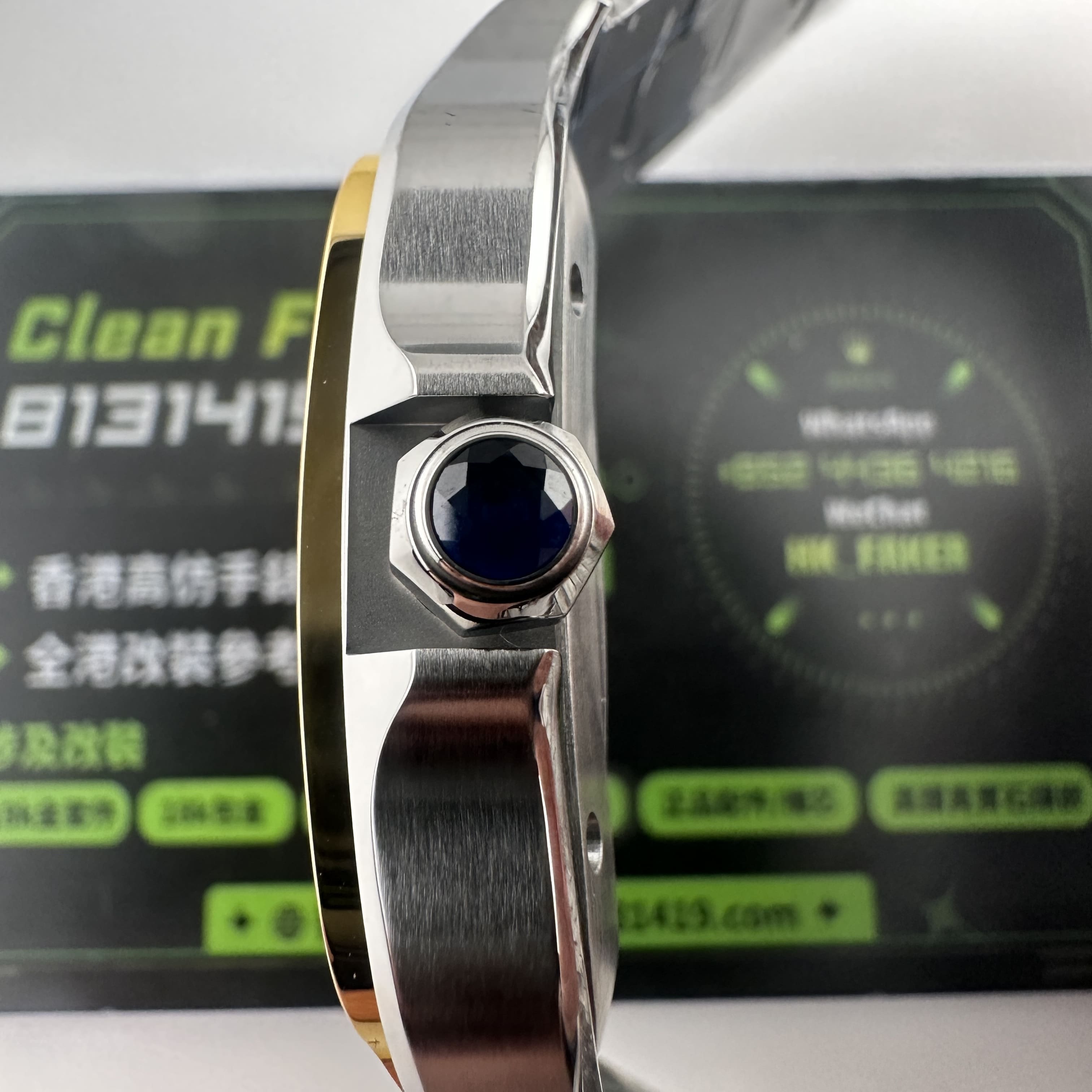 THB廠官網全新推出卡地亞/Cartier Santos系列男士腕錶間金款,整錶尺寸39.8mm X 47.5mm,THB廠根據原裝正品1:1開模復刻,整錶外觀結構是非常經典的長方形架構,外觀肉眼可見就是卡地亞腕錶專屬特征,此次分享的高仿卡地亞Santos是間金款式,因此圈口以及錶帶鉚釘部分原裝正品是採用18K金材質打造,而THB廠則是使用316L精鋼通過PVD電鍍工藝完成K金色澤演變.錶盤內部是無夜光顯示羅馬刻度盤面,搭配烤瓷藍指針,以及6點鐘日曆顯示.錶帶與錶殼部分是可拆卸錶帶構造.