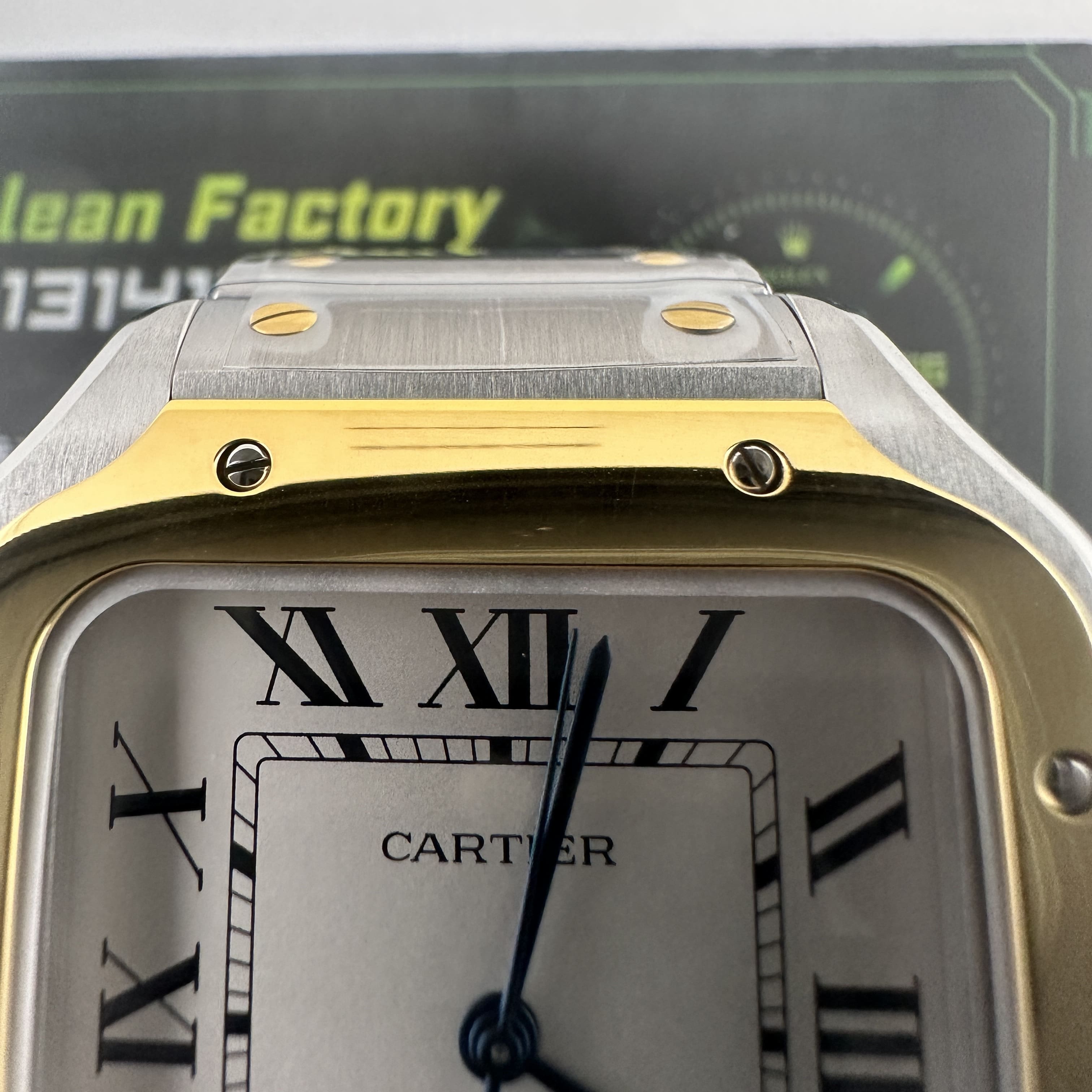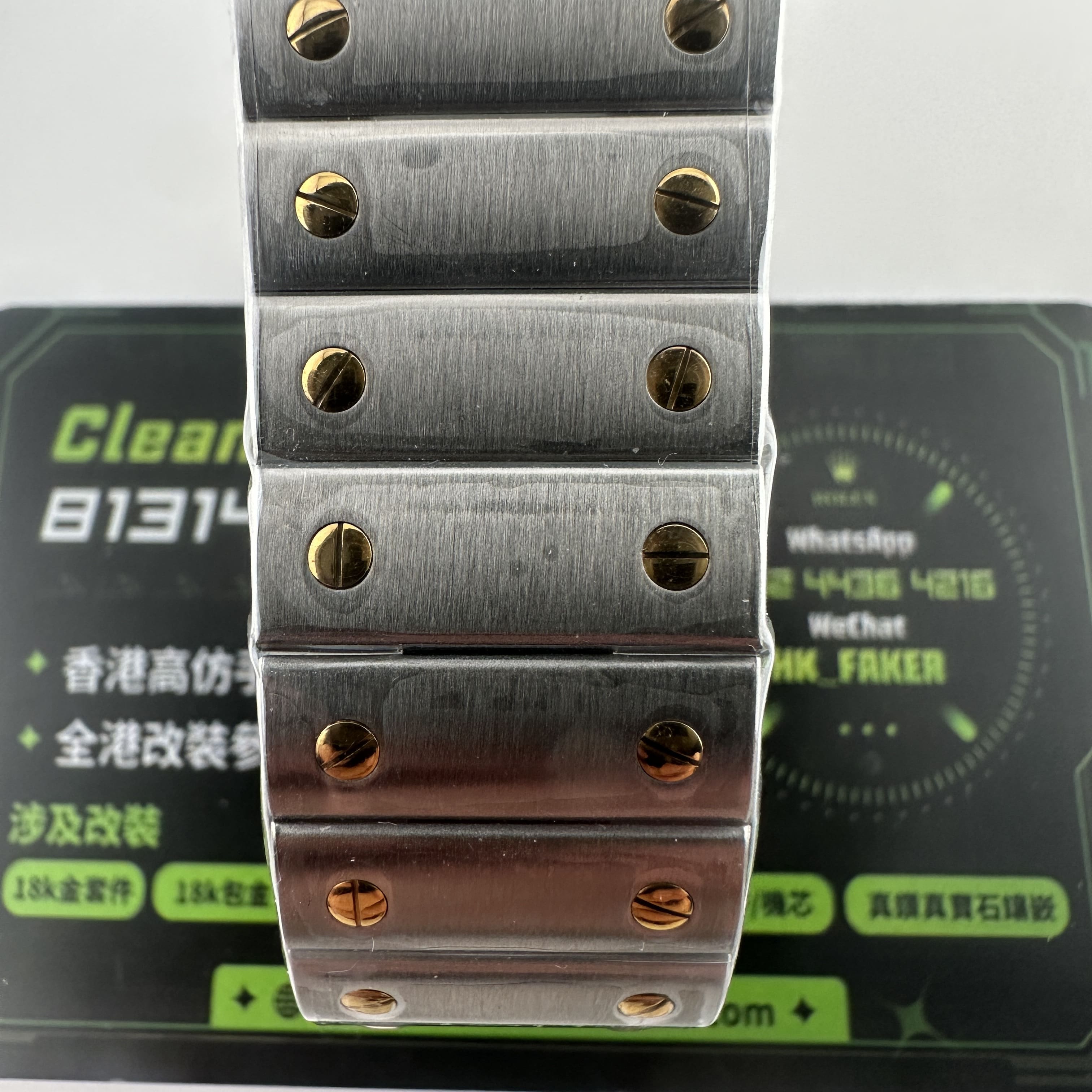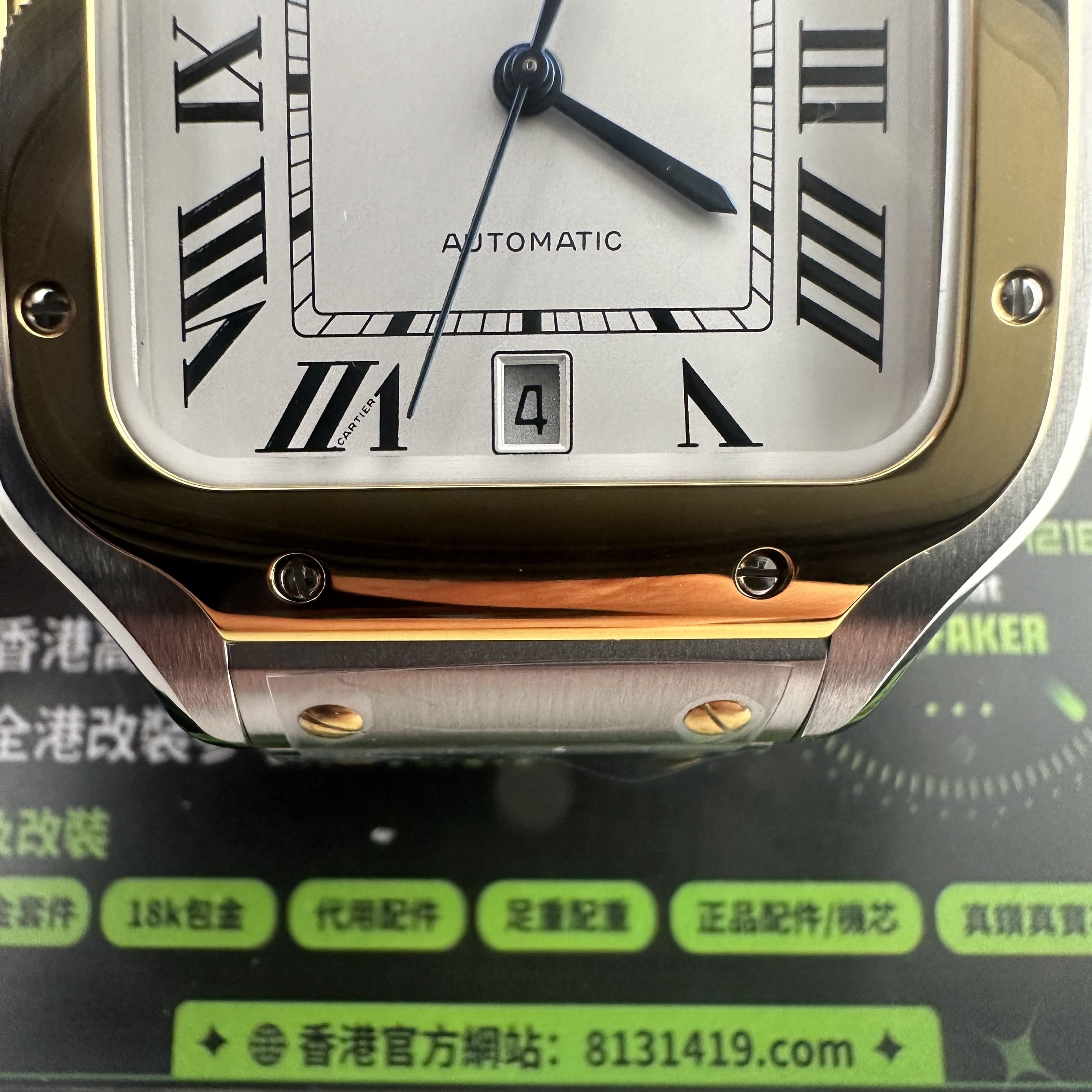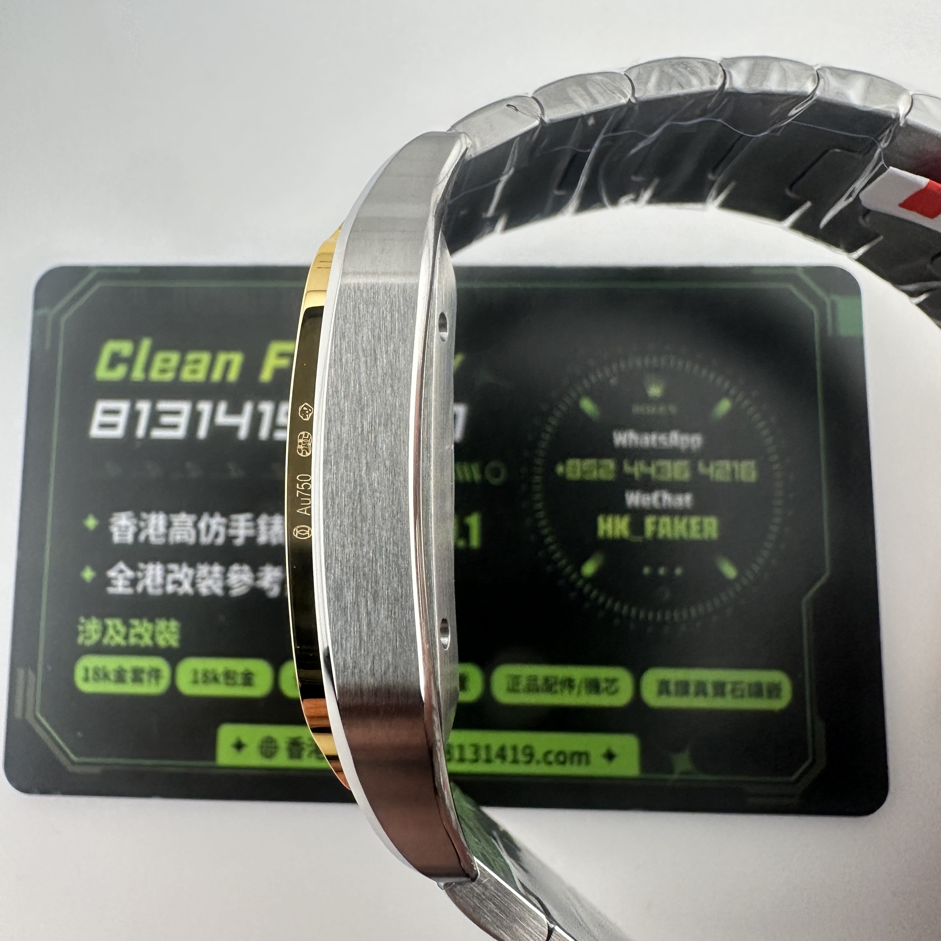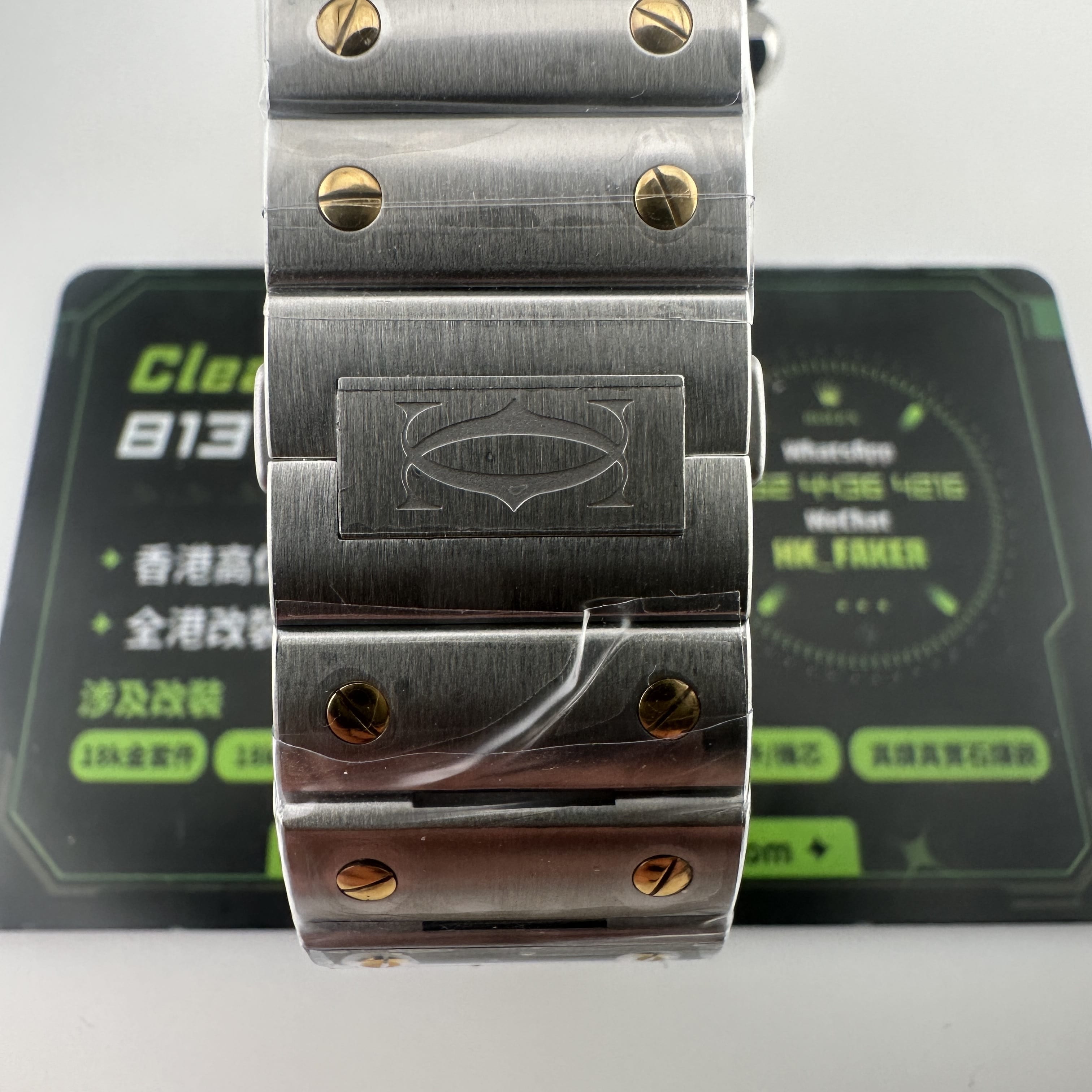 THB廠官網全新推出卡地亞/Cartier Santos系列男士腕錶間金款,整錶尺寸39.8mm X 47.5mm,THB廠根據原裝正品1:1開模復刻,整錶外觀結構是非常經典的長方形架構,外觀肉眼可見就是卡地亞腕錶專屬特征,此次分享的高仿卡地亞Santos是間金款式,因此圈口以及錶帶鉚釘部分原裝正品是採用18K金材質打造,而THB廠則是使用316L精鋼通過PVD電鍍工藝完成K金色澤演變.錶盤內部是無夜光顯示羅馬刻度盤面,搭配烤瓷藍指針,以及6點鐘日曆顯示.錶帶與錶殼部分是可拆卸錶帶構造.