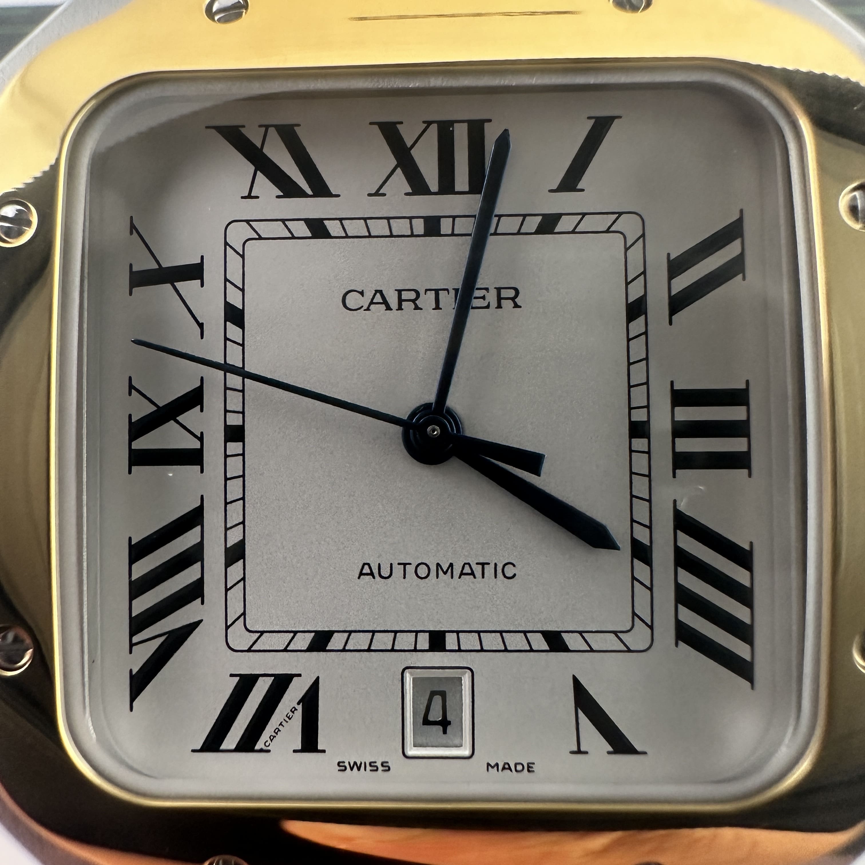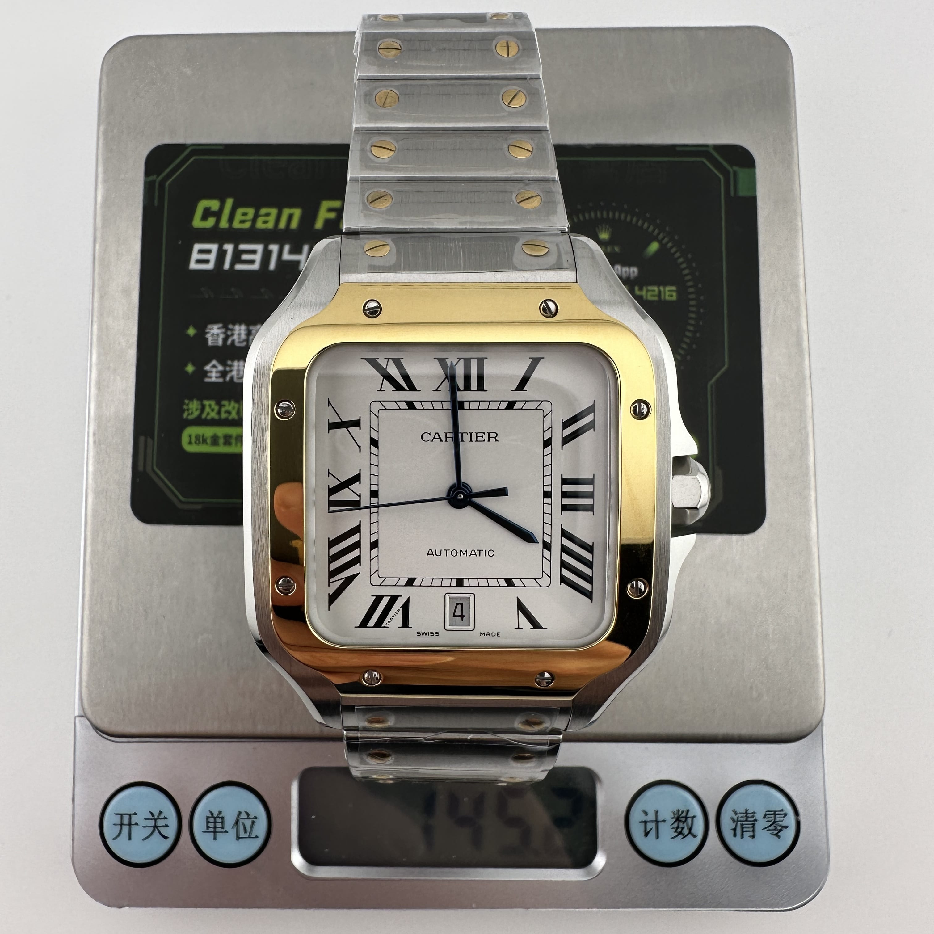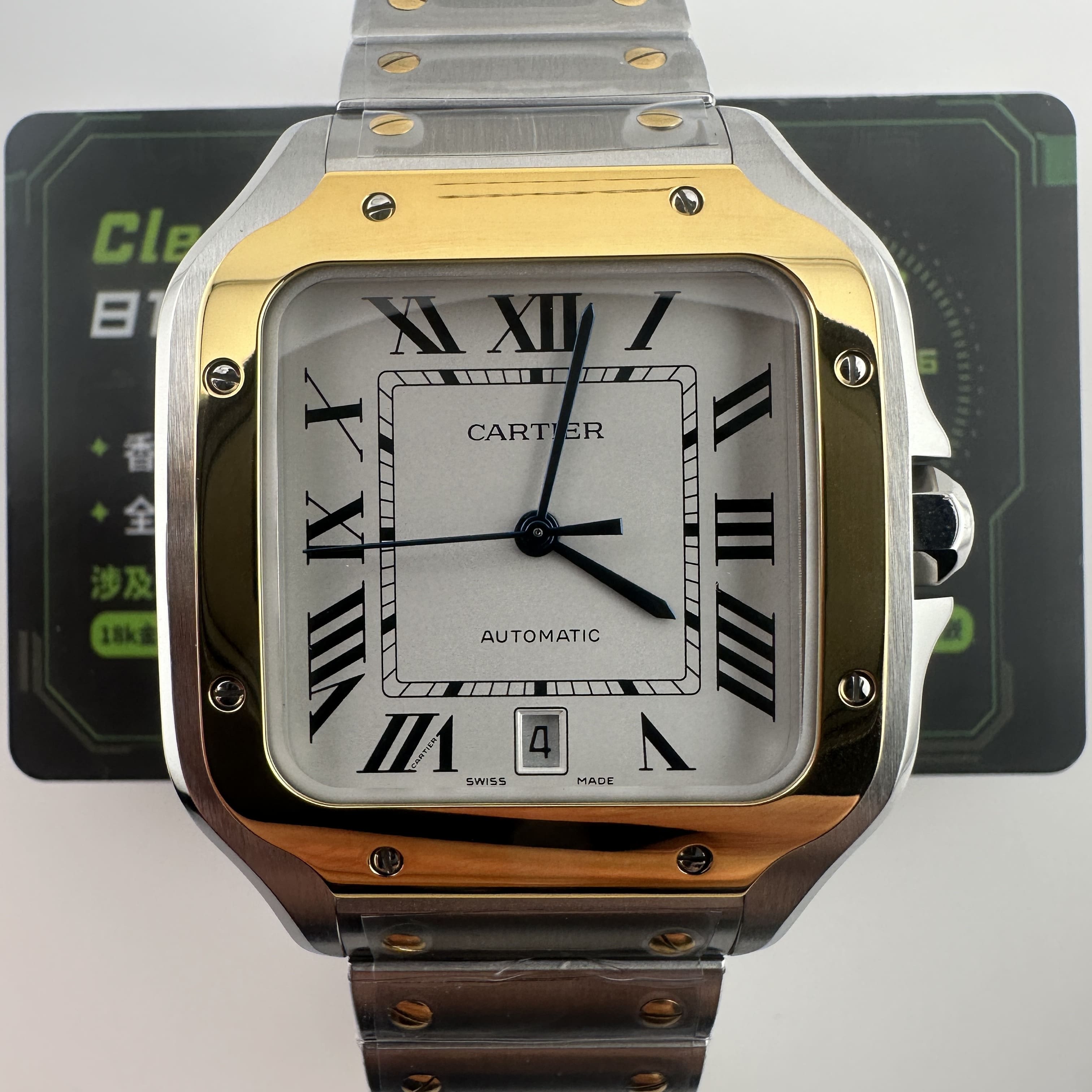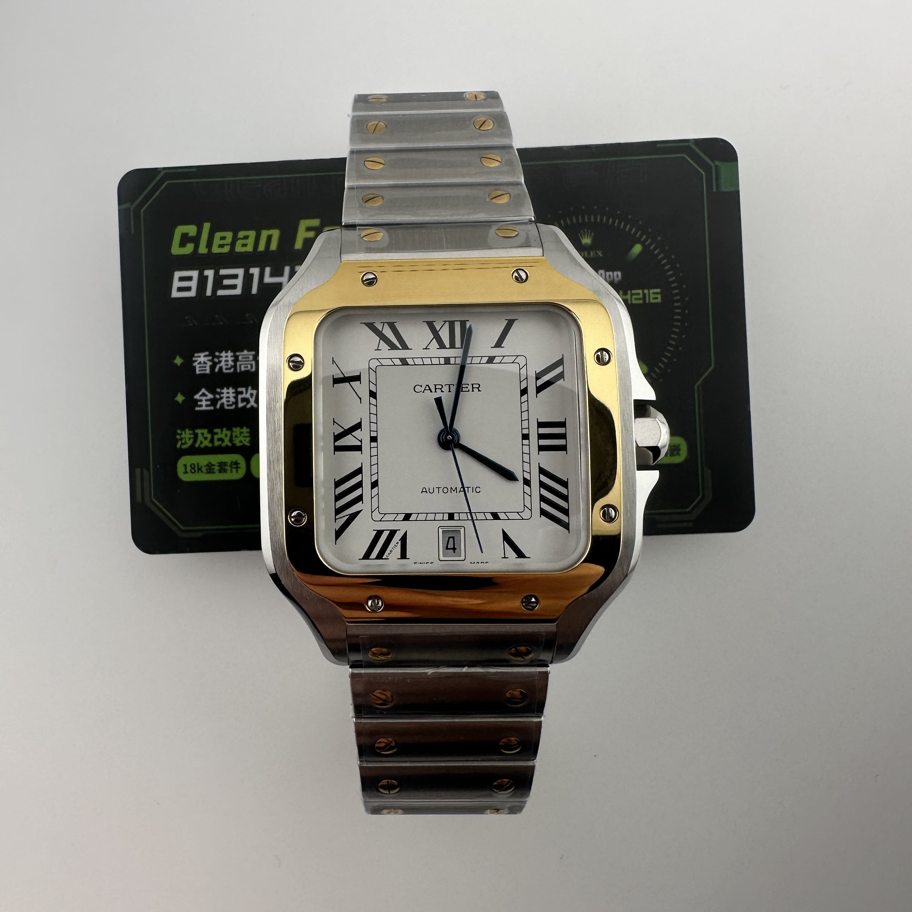 THB廠官網全新推出卡地亞/Cartier Santos系列男士腕錶間金款,整錶尺寸39.8mm X 47.5mm,THB廠根據原裝正品1:1開模復刻,整錶外觀結構是非常經典的長方形架構,外觀肉眼可見就是卡地亞腕錶專屬特征,此次分享的高仿卡地亞Santos是間金款式,因此圈口以及錶帶鉚釘部分原裝正品是採用18K金材質打造,而THB廠則是使用316L精鋼通過PVD電鍍工藝完成K金色澤演變.錶盤內部是無夜光顯示羅馬刻度盤面,搭配烤瓷藍指針,以及6點鐘日曆顯示.錶帶與錶殼部分是可拆卸錶帶構造.