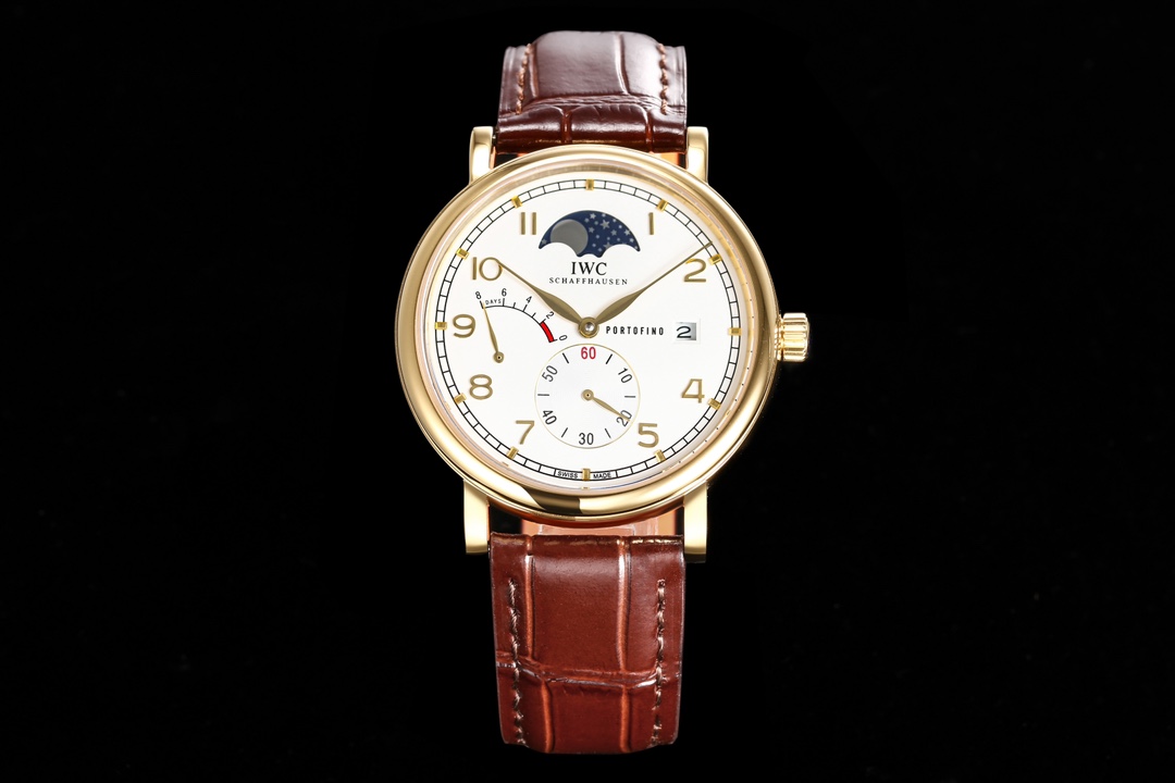 【表殼】316L精鋼表殼,打磨拋光好圓滑。小秒針喺6點鐘位置附撥針停秒功能,有實心條釘刻度同埋羅馬數字,9點位增添動能裝飾,3點位寫有 PORTOFINO(柏濤菲諾英文)同埋準確距離日曆窗,同埋呢個弧形嘅動能裝飾對稱。12位配搭月相位置同原版一樣。我哋可以留意到,呢隻手錶嘅日曆窗喺表盤最邊緣,而且日曆字體同原版一樣。柳葉形指針分別指示鐘同分,兩面都有防反光拱形藍寶石鍍膜鏡面。【表帶】意大利小牛皮。【機芯】自主研製自動上鏈機械機芯,機芯穩定,走時準。