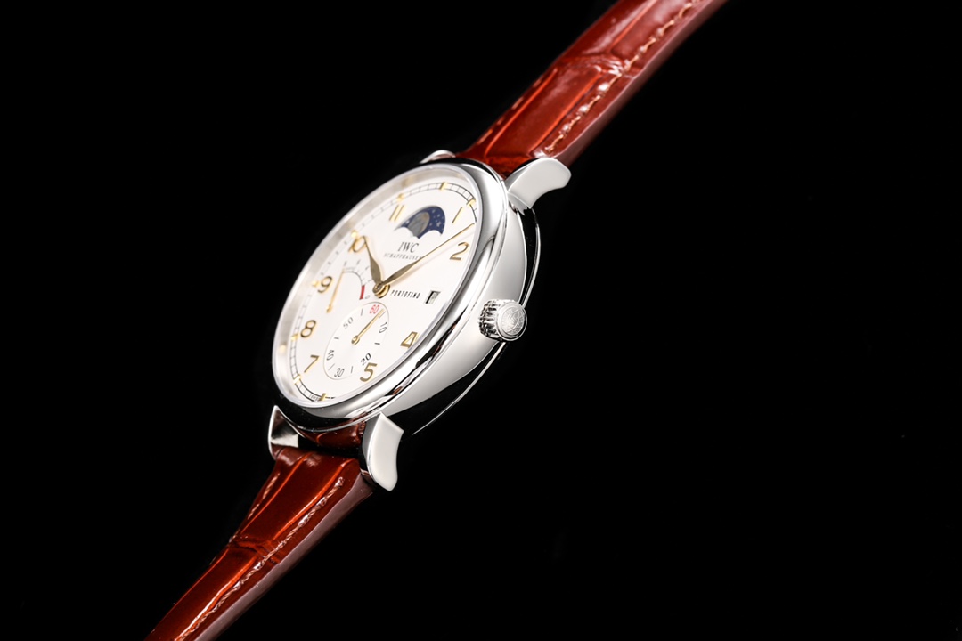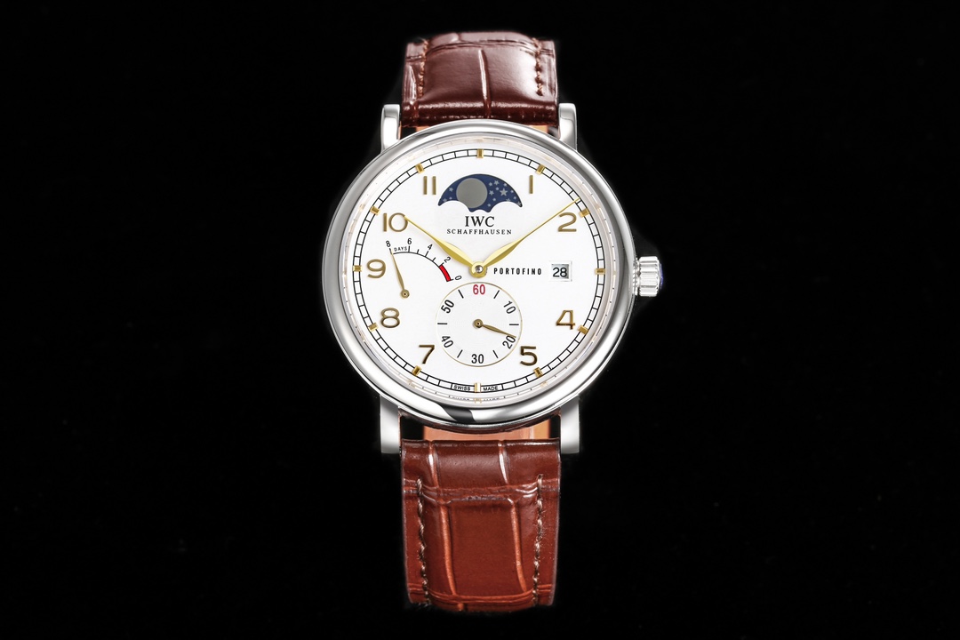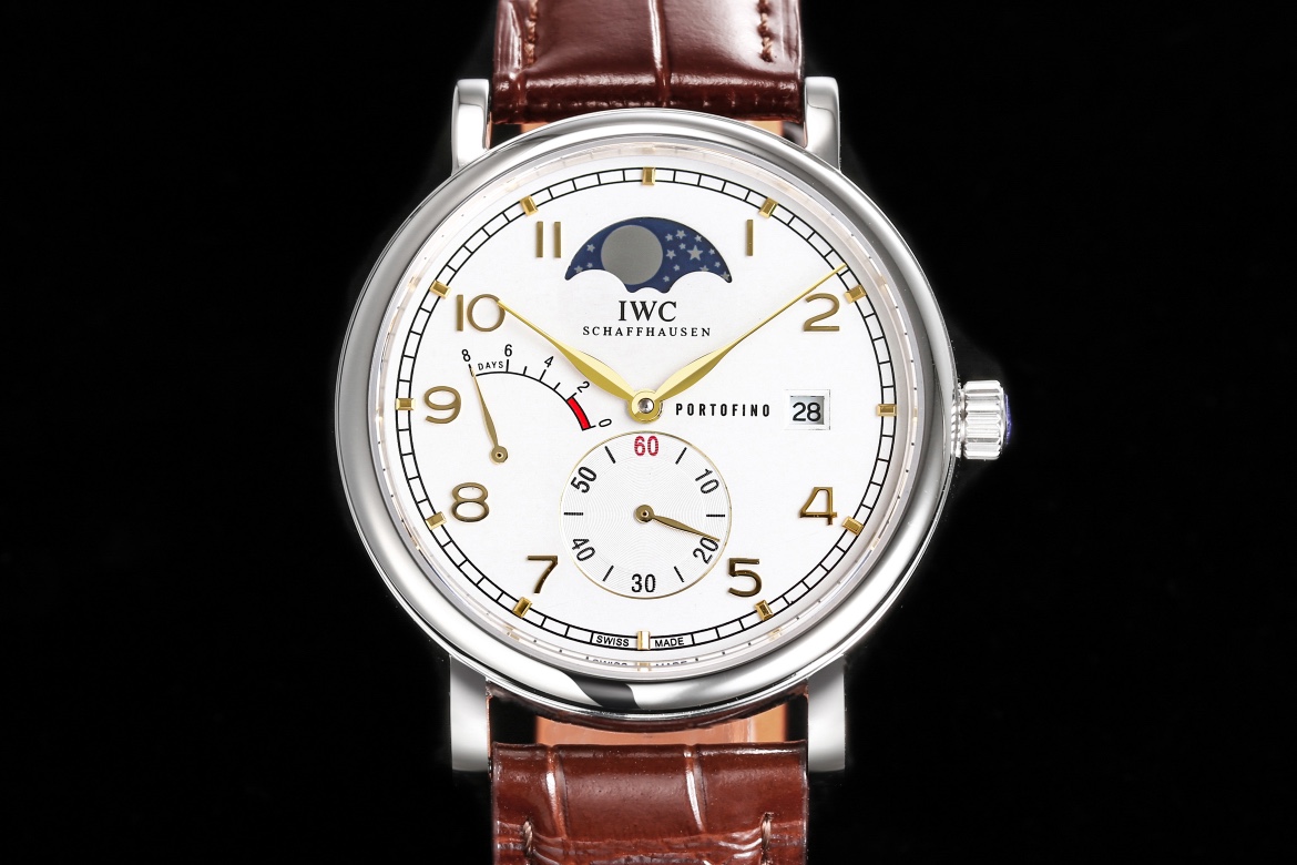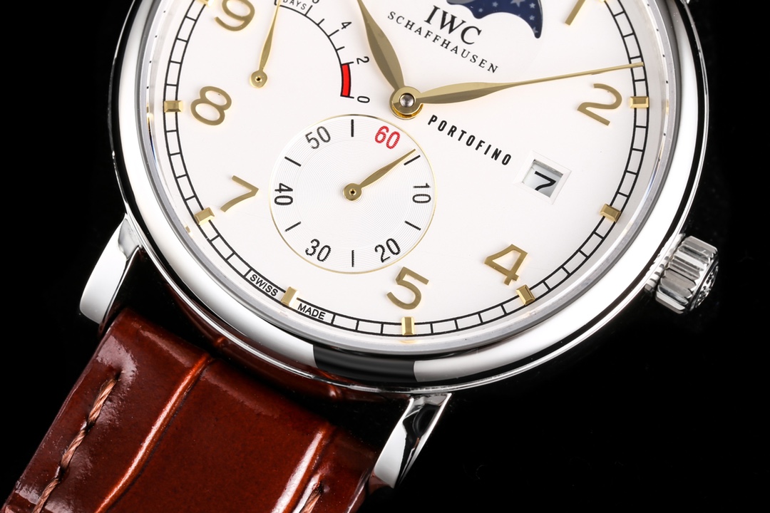 【表殼】316L精鋼表殼,打磨拋光好圓滑。小秒針喺6點鐘位置附撥針停秒功能,有實心條釘刻度同埋羅馬數字,9點位增添動能裝飾,3點位寫有 PORTOFINO(柏濤菲諾英文)同埋準確距離日曆窗,同埋呢個弧形嘅動能裝飾對稱。12位配搭月相位置同原版一樣。我哋可以留意到,呢隻手錶嘅日曆窗喺表盤最邊緣,而且日曆字體同原版一樣。柳葉形指針分別指示鐘同分,兩面都有防反光拱形藍寶石鍍膜鏡面。【表帶】意大利小牛皮。【機芯】自主研製自動上鏈機械機芯,機芯穩定,走時準。