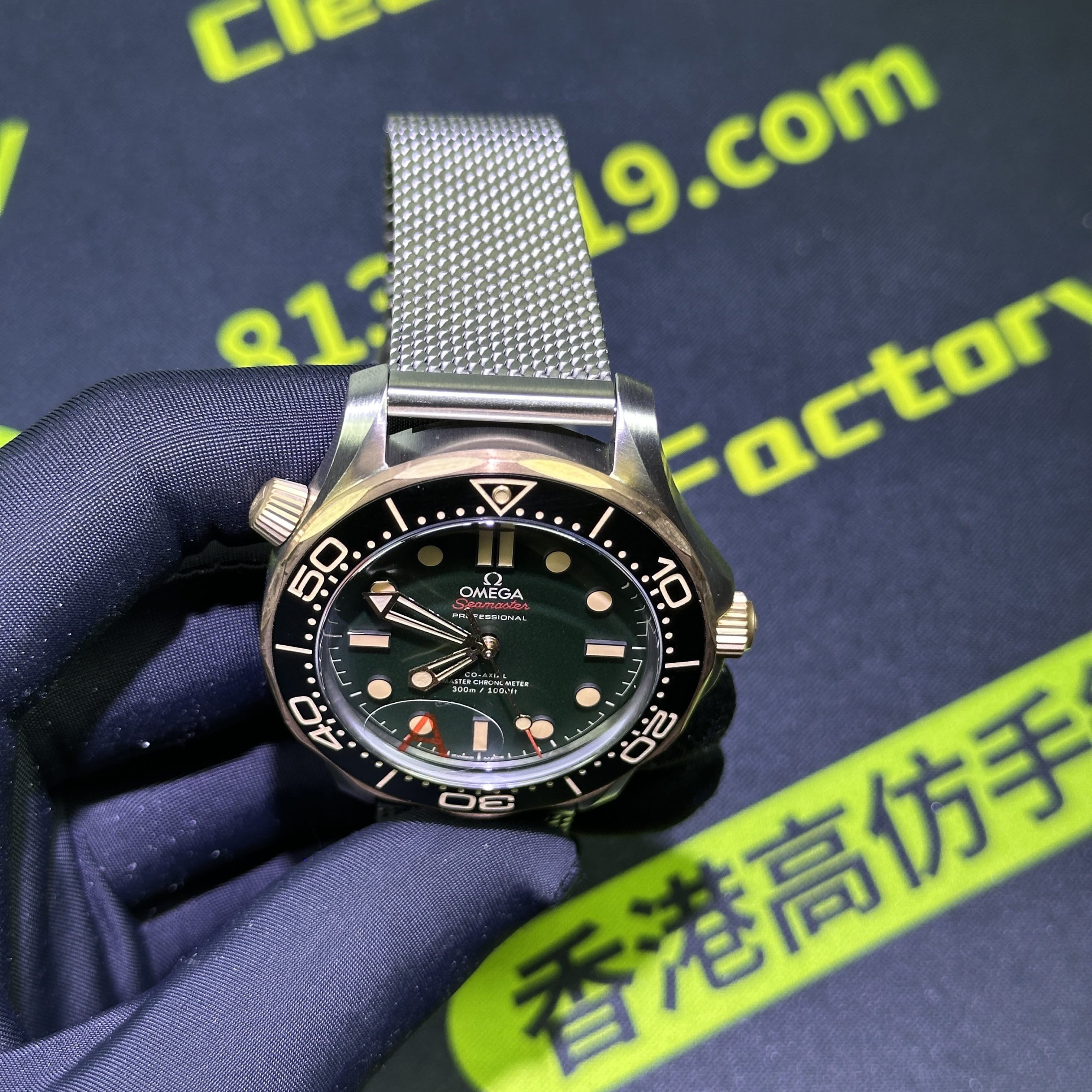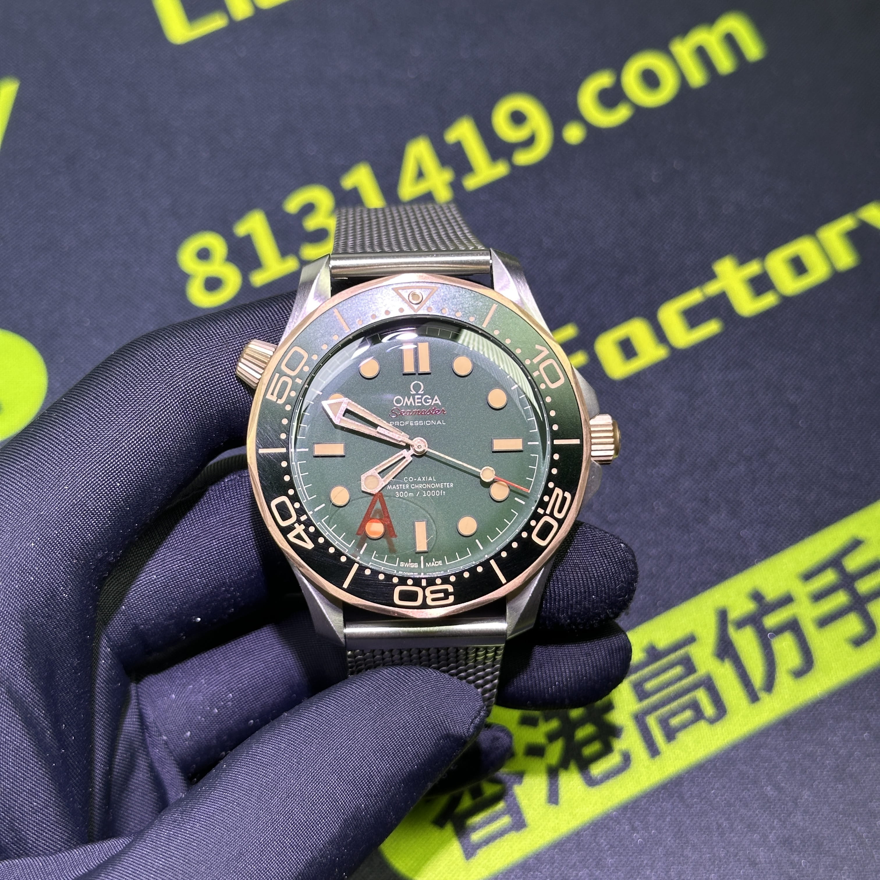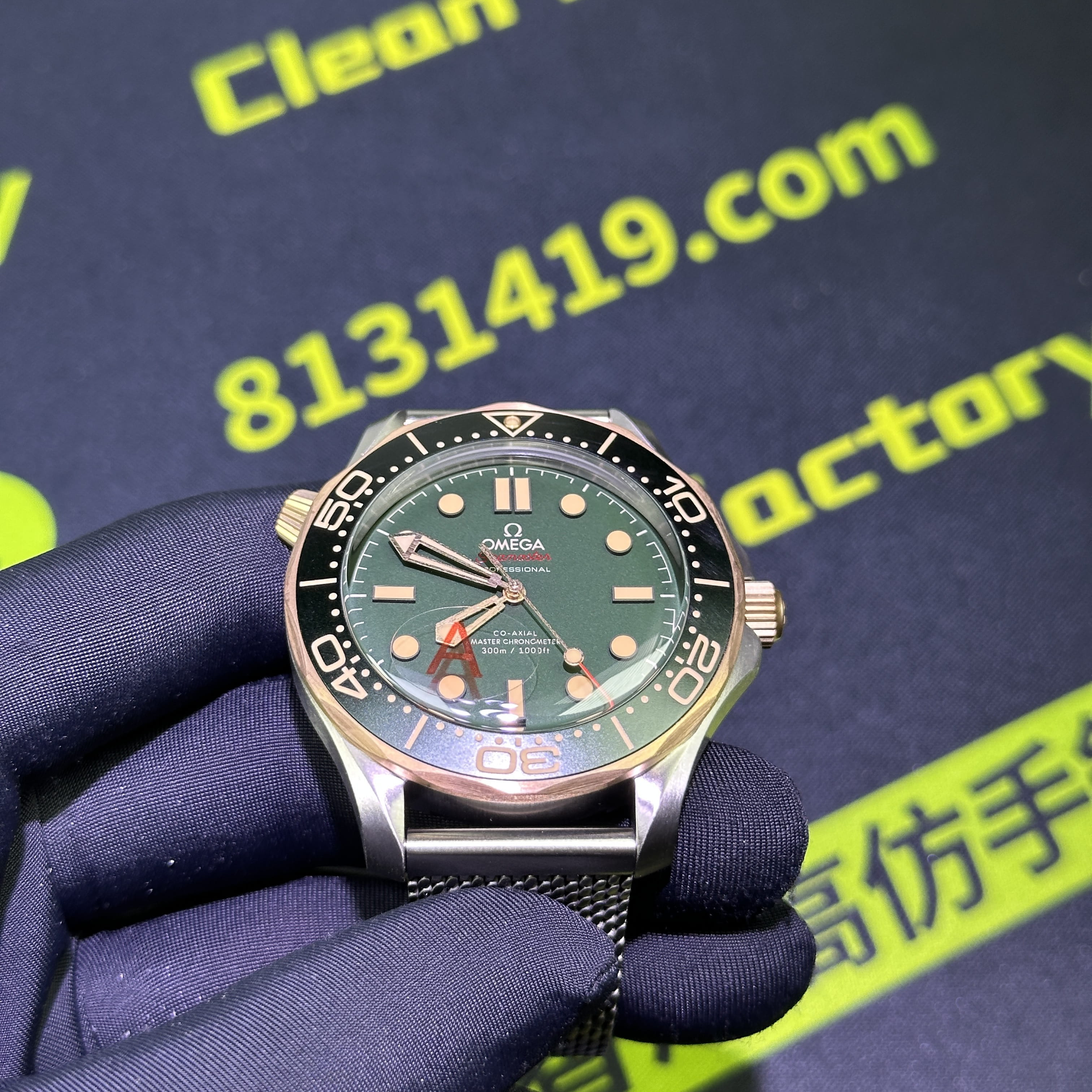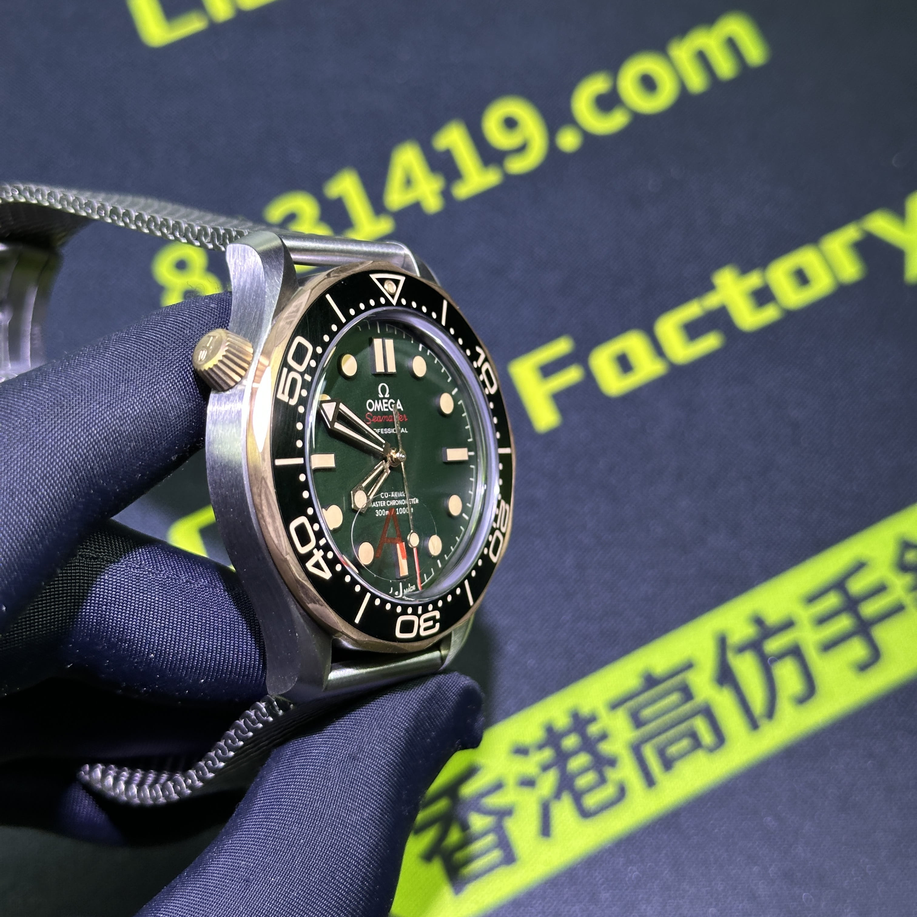 VS廠海馬300系列007錶款圈口是使用了PVD電鍍金做了青銅色澤,對比專櫃版本基本上是無色差的狀態.陶瓷圈口的塑造非常標準,刻度字體的位置以及克雙向選擇的圈口也是VS廠Omega007最基本的做工.錶盤內部是一張以綠色為主的色調,色澤還原97&左右,時間刻度條丁圓點部分是古銅色的夜光填充,印刷字面立體感十足,基本沒有嚴重的缺陷以及瑕疵.