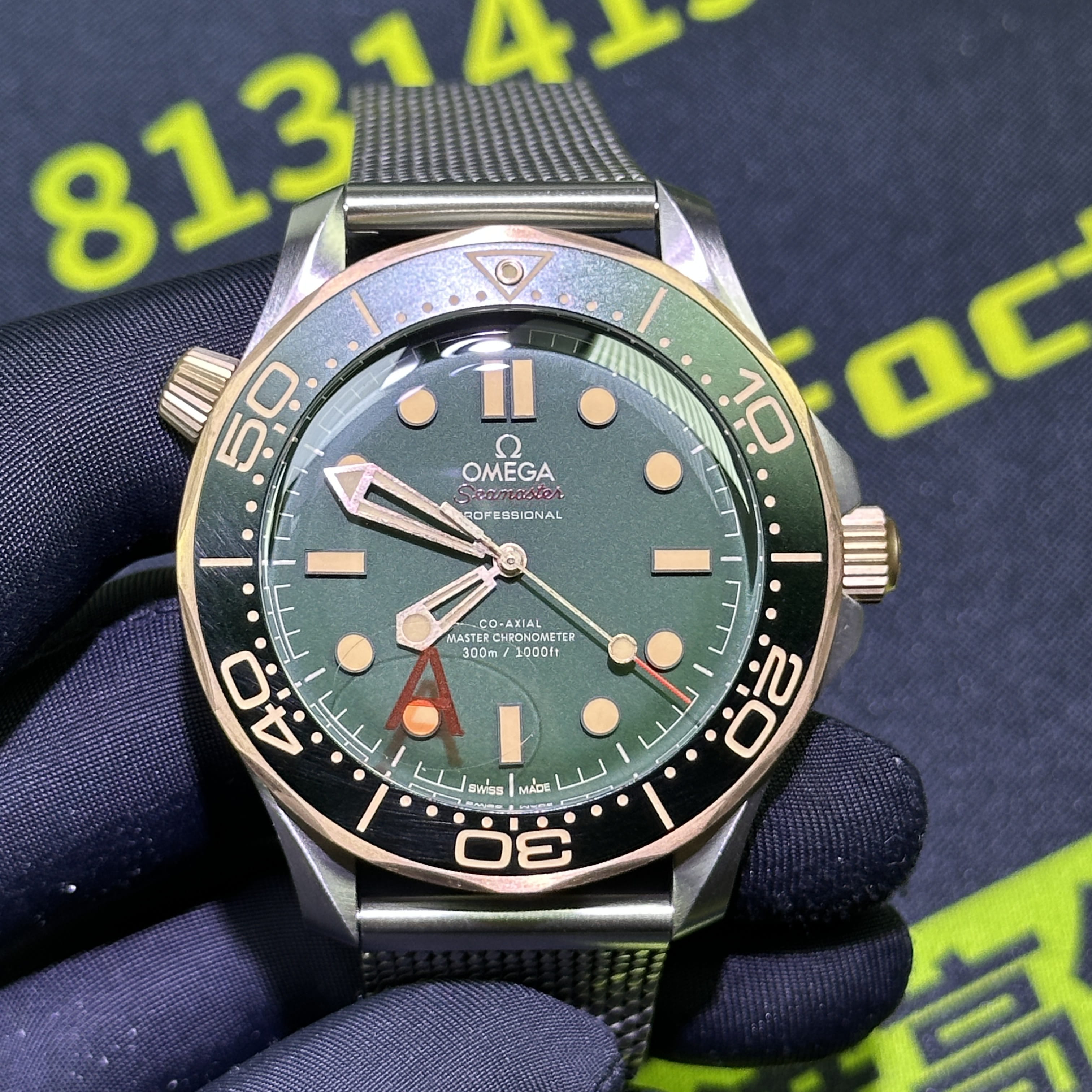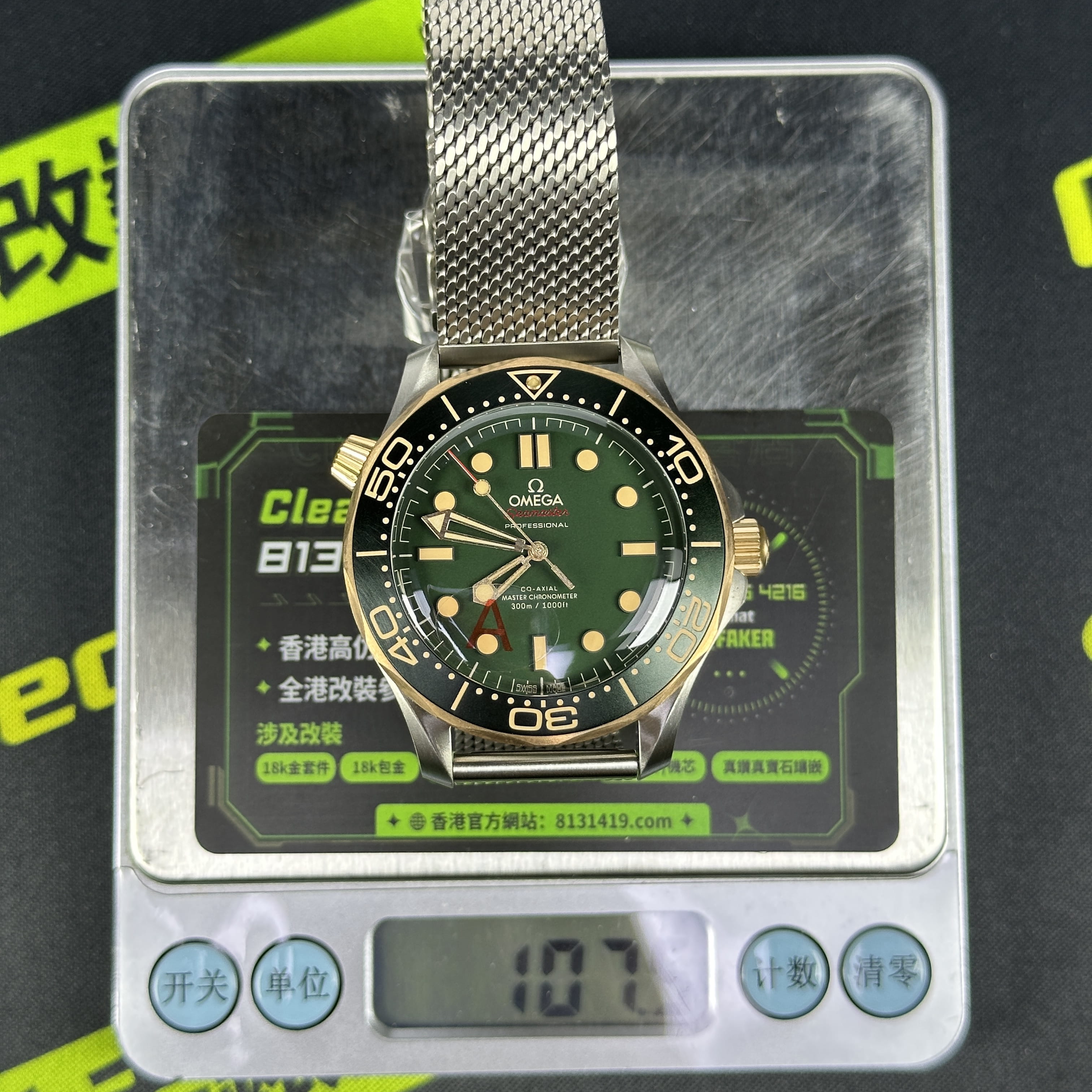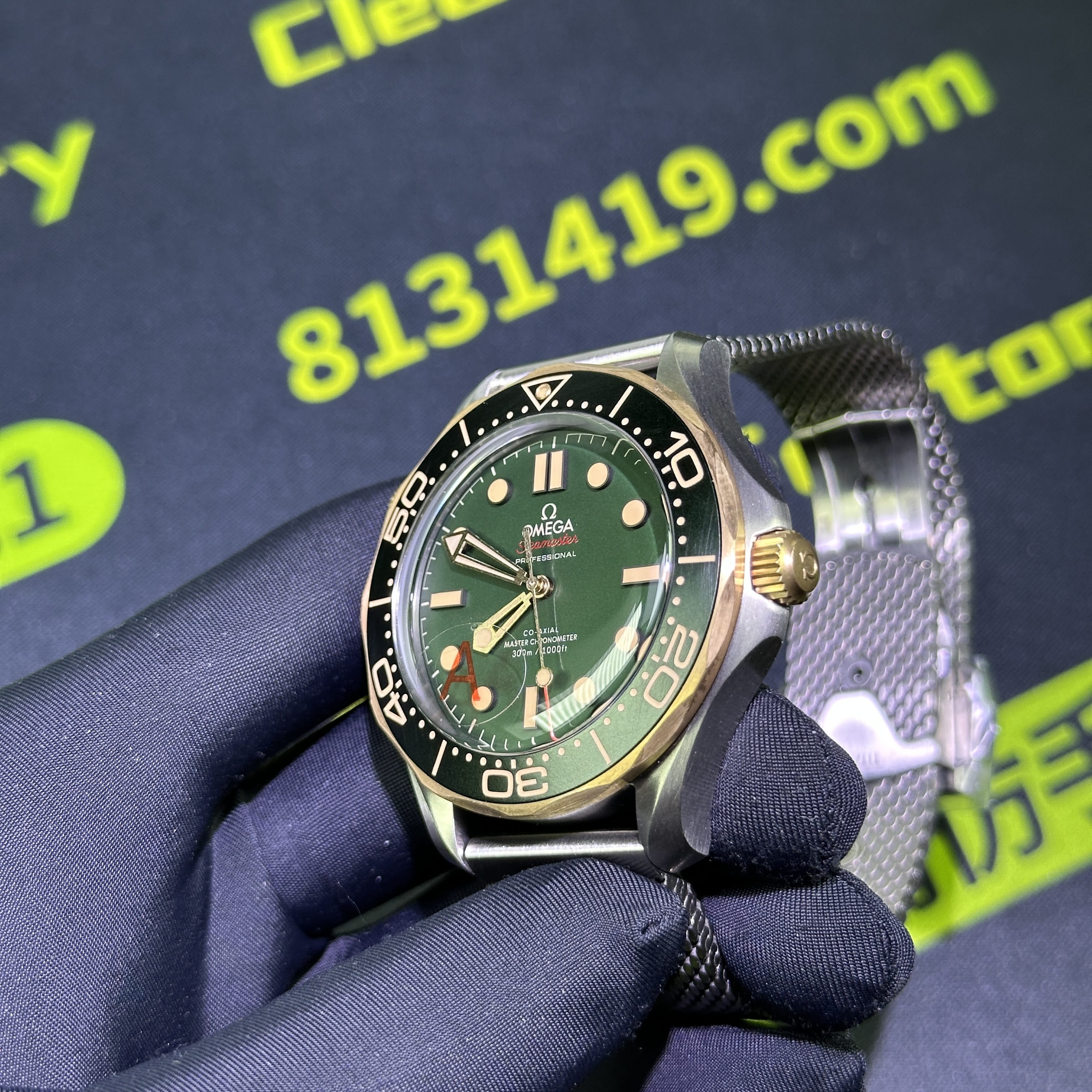 VS廠海馬300系列007錶款圈口是使用了PVD電鍍金做了青銅色澤,對比專櫃版本基本上是無色差的狀態.陶瓷圈口的塑造非常標準,刻度字體的位置以及克雙向選擇的圈口也是VS廠Omega007最基本的做工.錶盤內部是一張以綠色為主的色調,色澤還原97&左右,時間刻度條丁圓點部分是古銅色的夜光填充,印刷字面立體感十足,基本沒有嚴重的缺陷以及瑕疵.