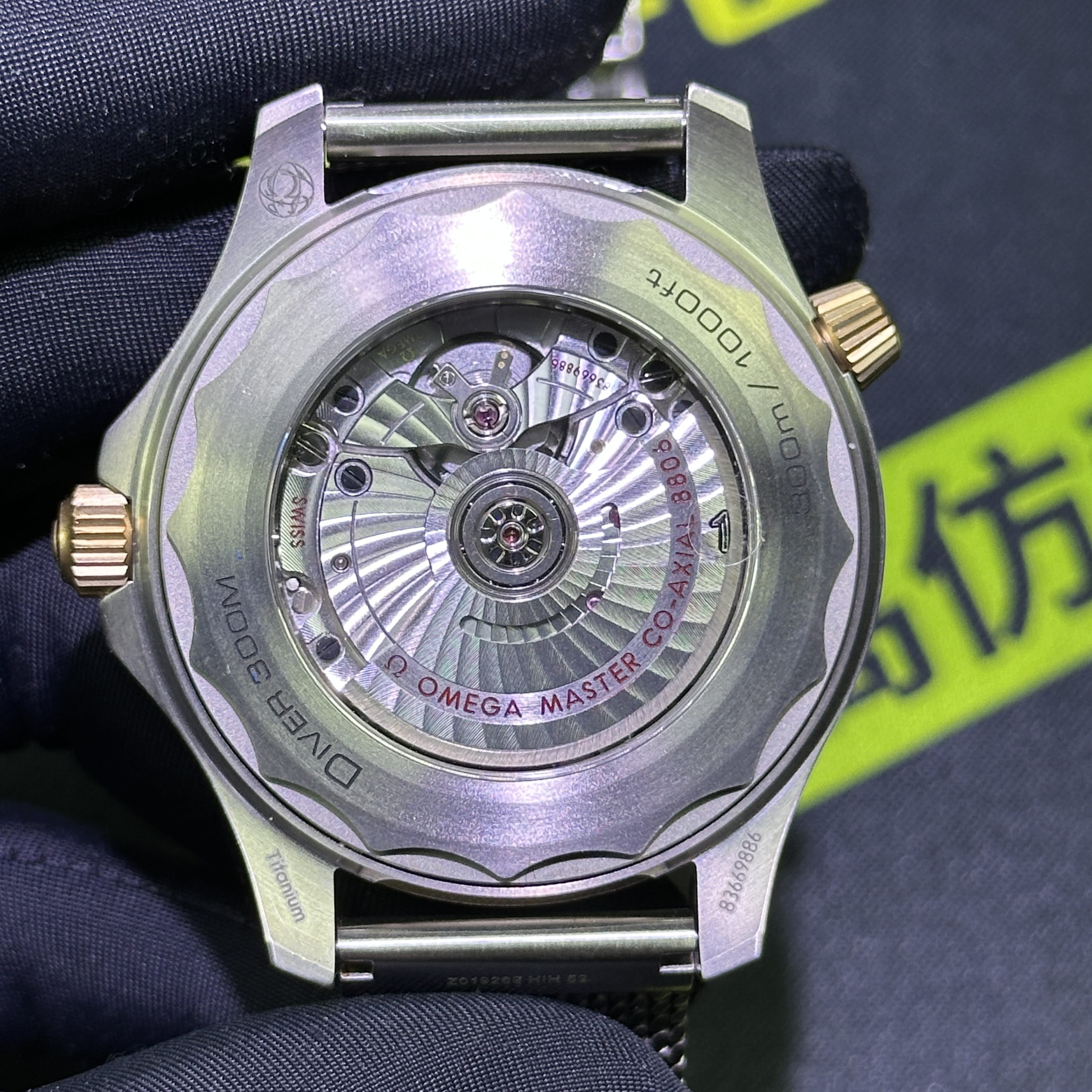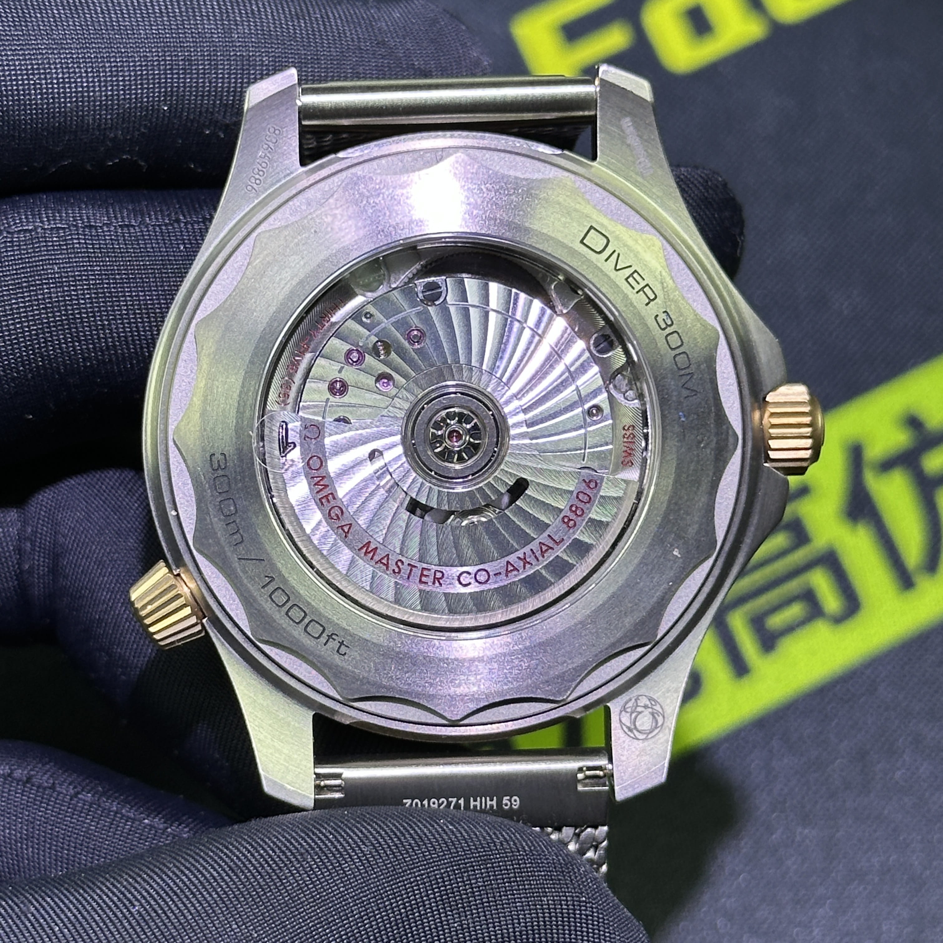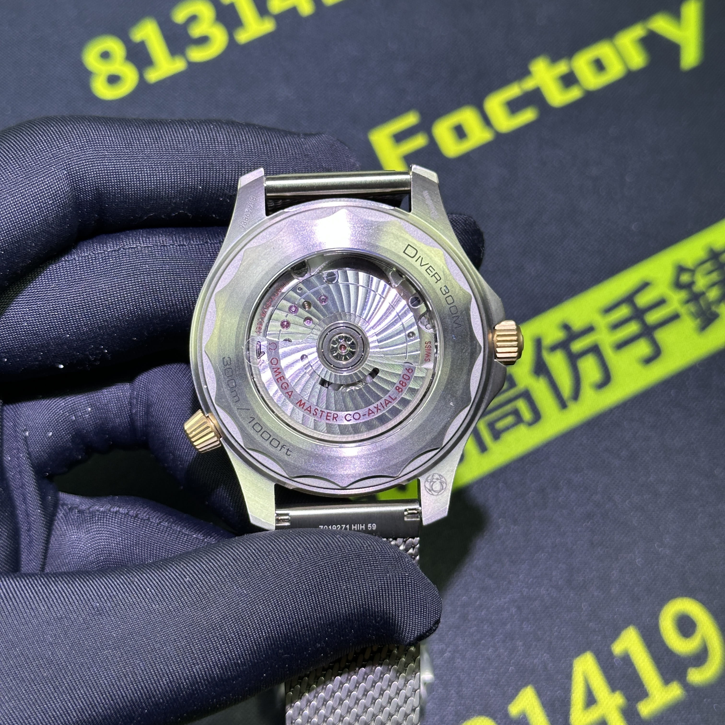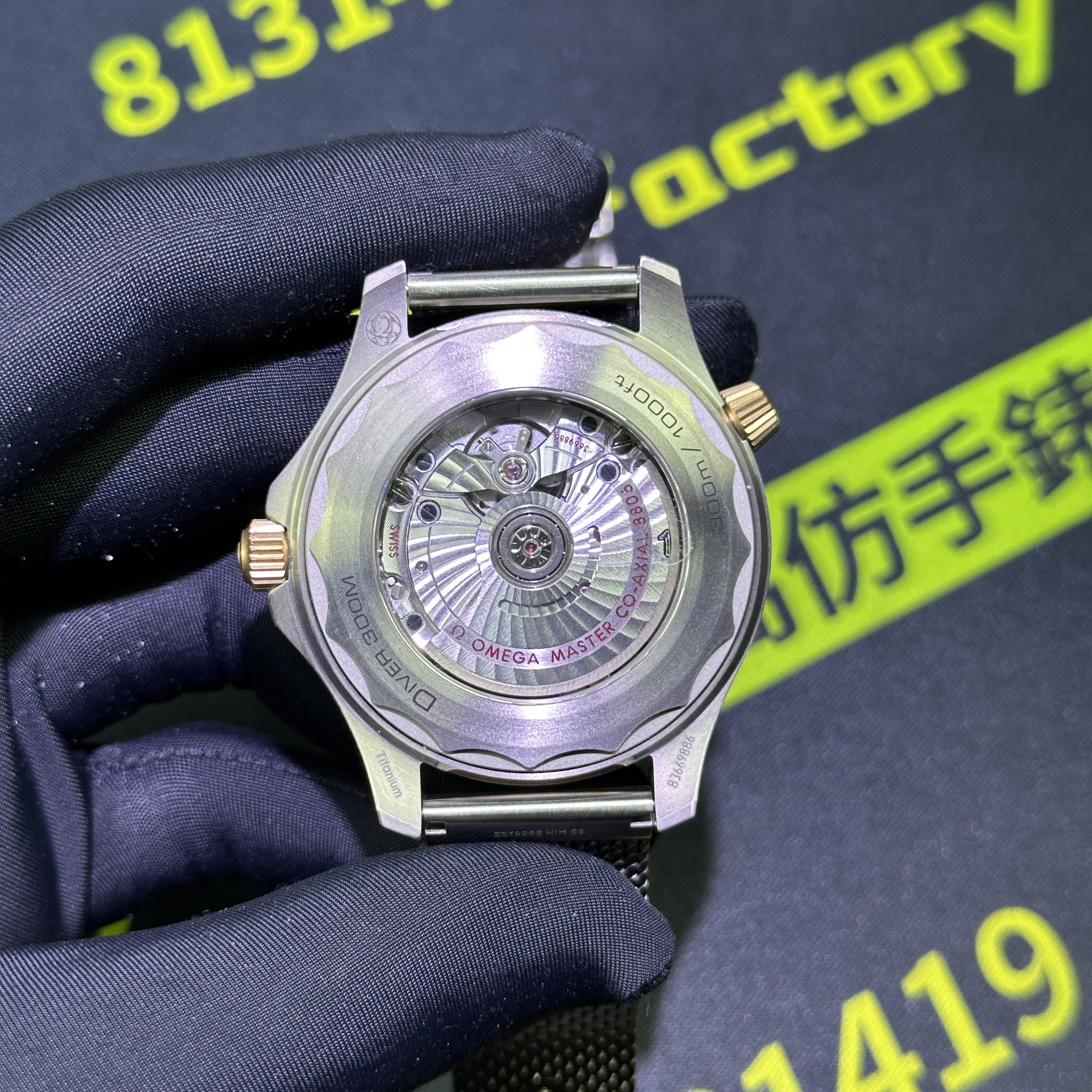 VS廠海馬300系列007錶款圈口是使用了PVD電鍍金做了青銅色澤,對比專櫃版本基本上是無色差的狀態.陶瓷圈口的塑造非常標準,刻度字體的位置以及克雙向選擇的圈口也是VS廠Omega007最基本的做工.錶盤內部是一張以綠色為主的色調,色澤還原97&左右,時間刻度條丁圓點部分是古銅色的夜光填充,印刷字面立體感十足,基本沒有嚴重的缺陷以及瑕疵.