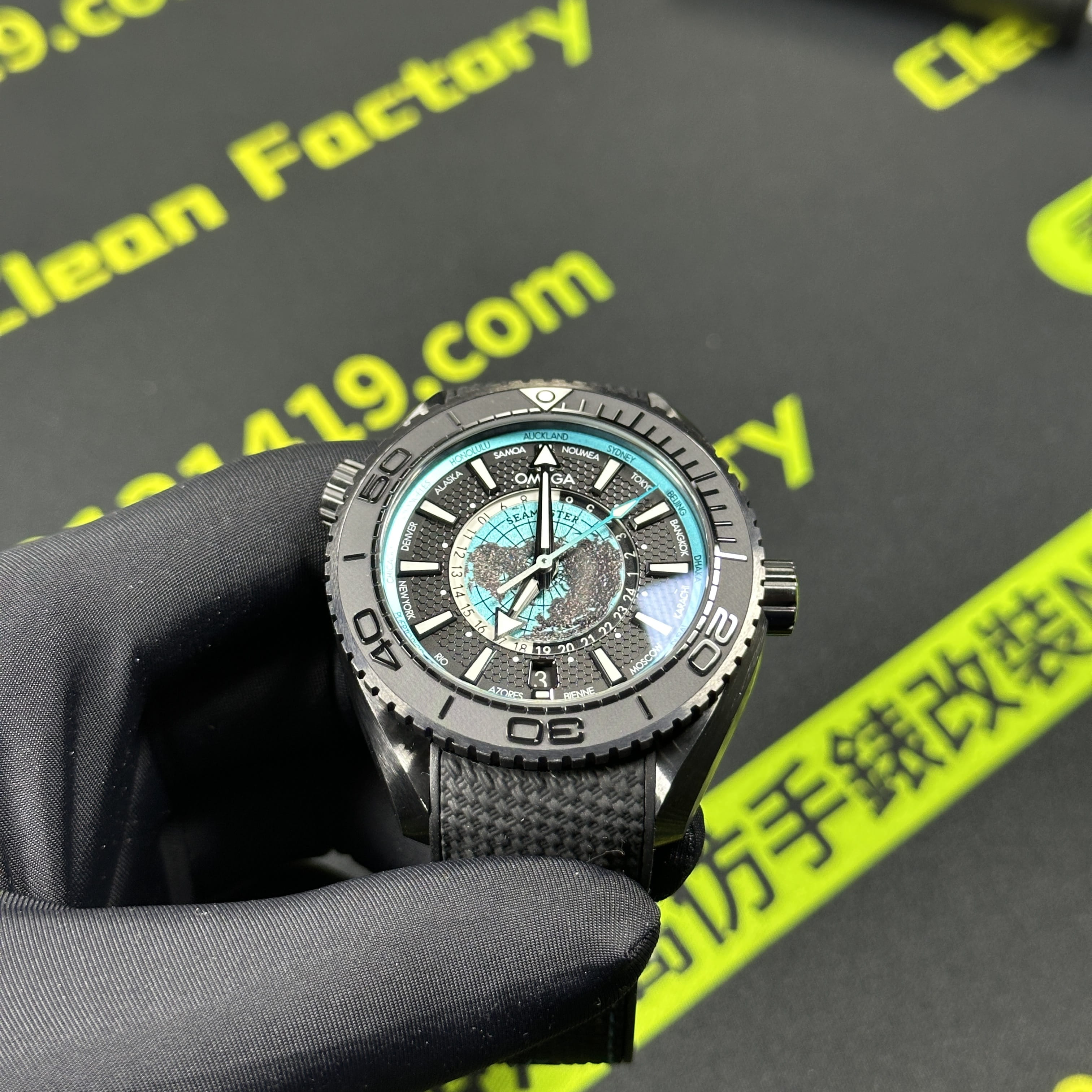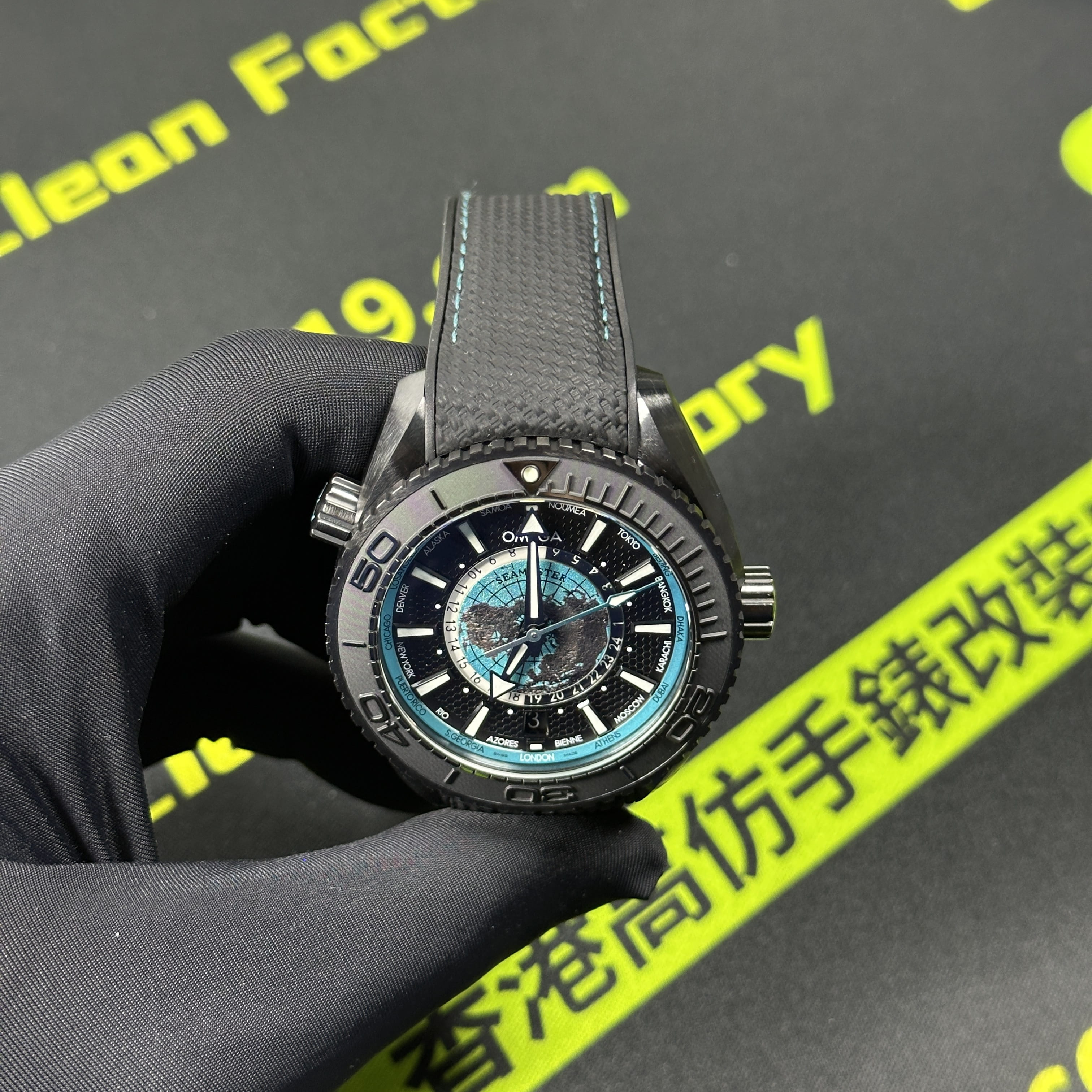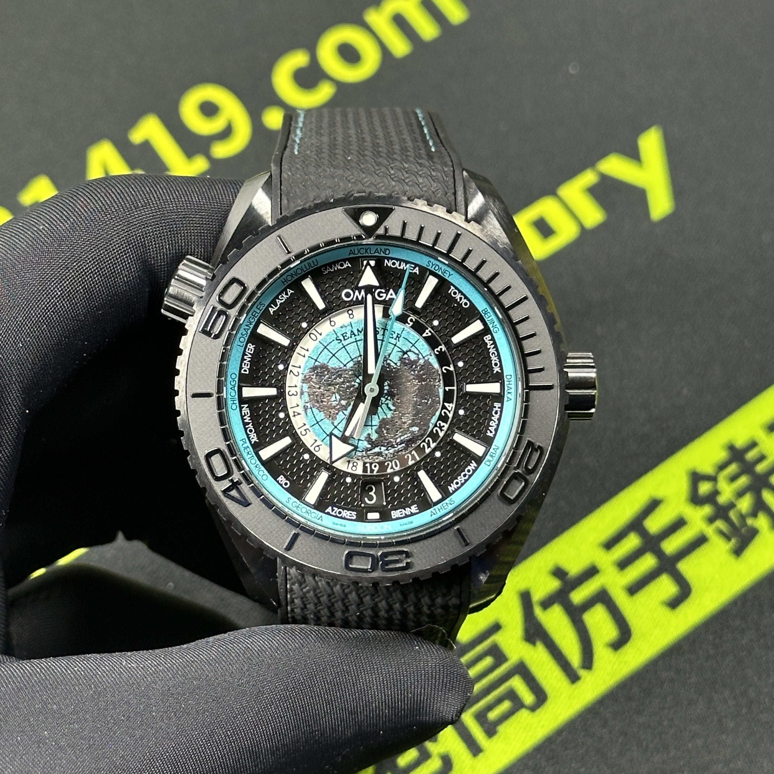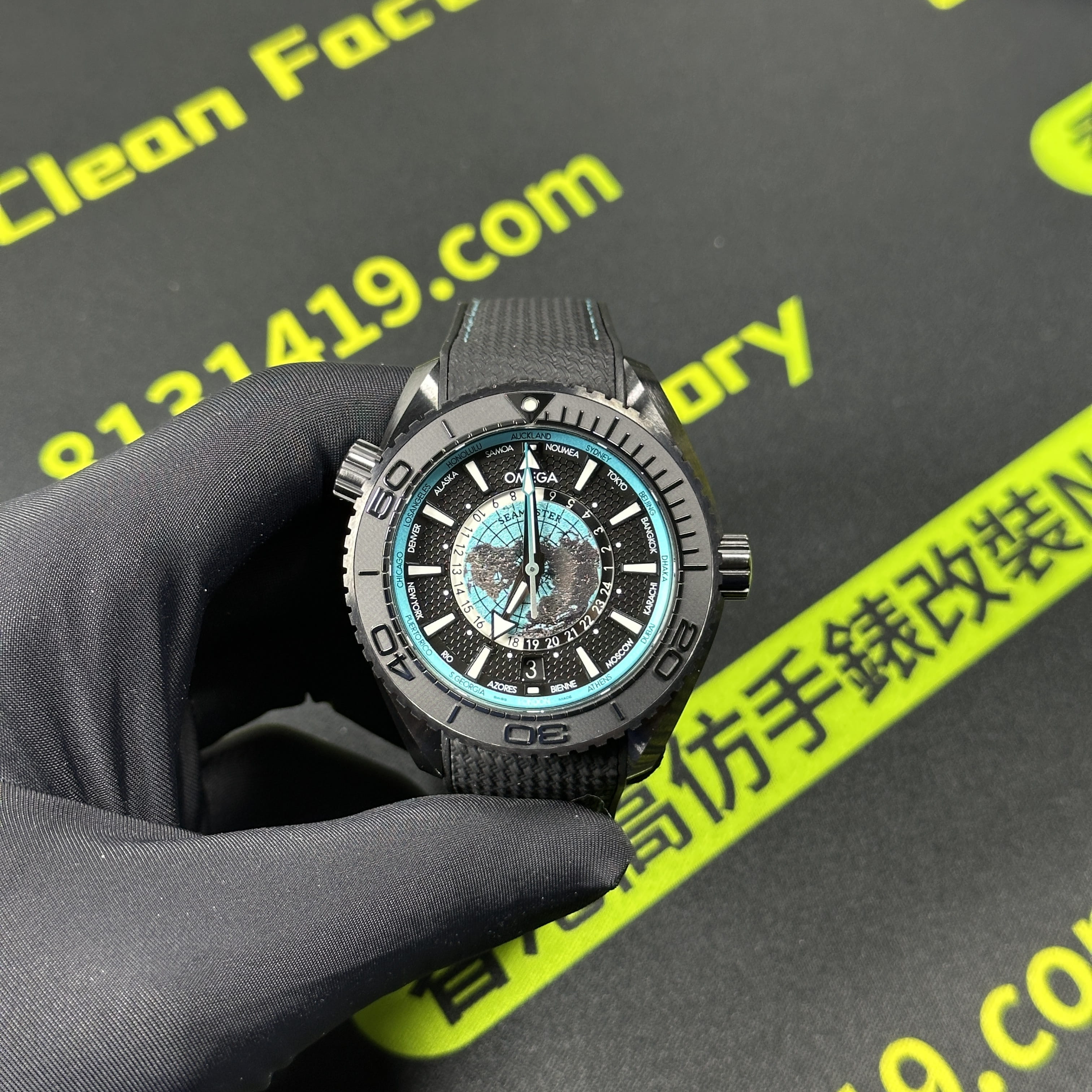 VS廠官網推出的最新款Omega海馬世界時腕錶215.92.46.22.01.006根據原版數據打造45.5mm腕錶直徑,對比鋼帶版本的世界時腕錶43mm,大小之間僅僅只是相差了2mm.黑色陶瓷材質打造的錶殼,圈口.錶盤內部是一個以地球形成的表面構造,並且通過漆面處理呈現出白天與夜晚的視覺感,VS廠塑造的地球表面足以達到專櫃版本的世界時腕錶基礎構造.匹配了橡膠錶帶,搭配黑藍色的陶瓷錶殼一股黑武士的風格呈現而行,非常具有男性佩戴的魅力.