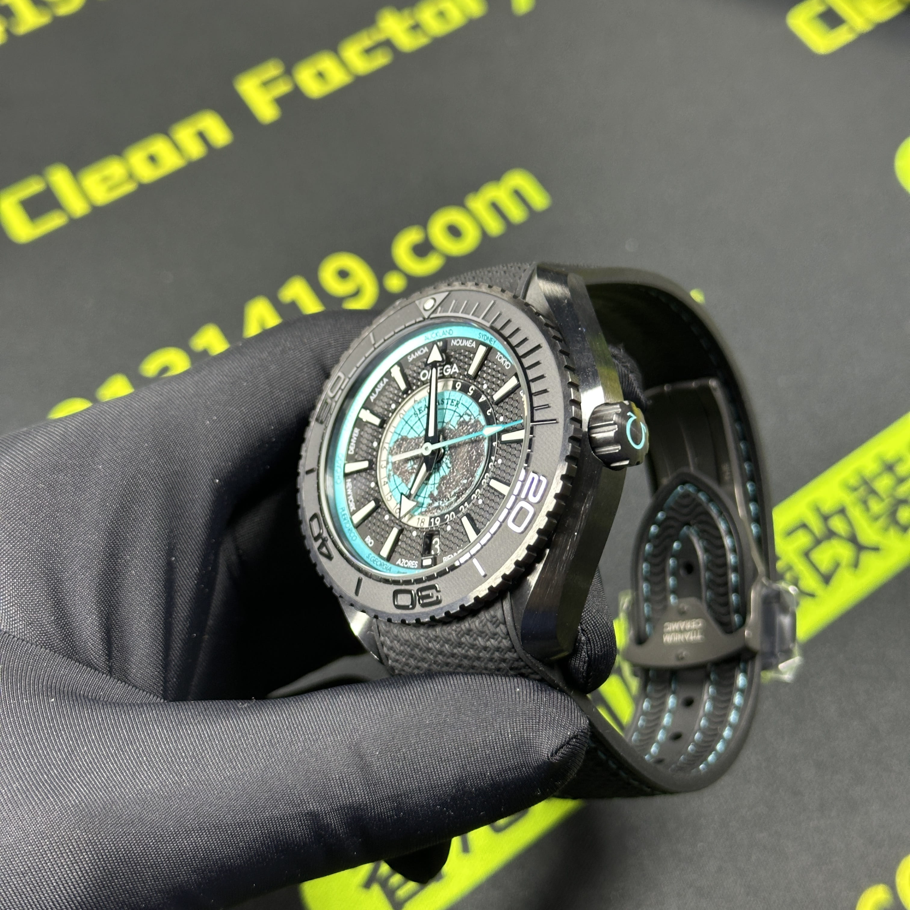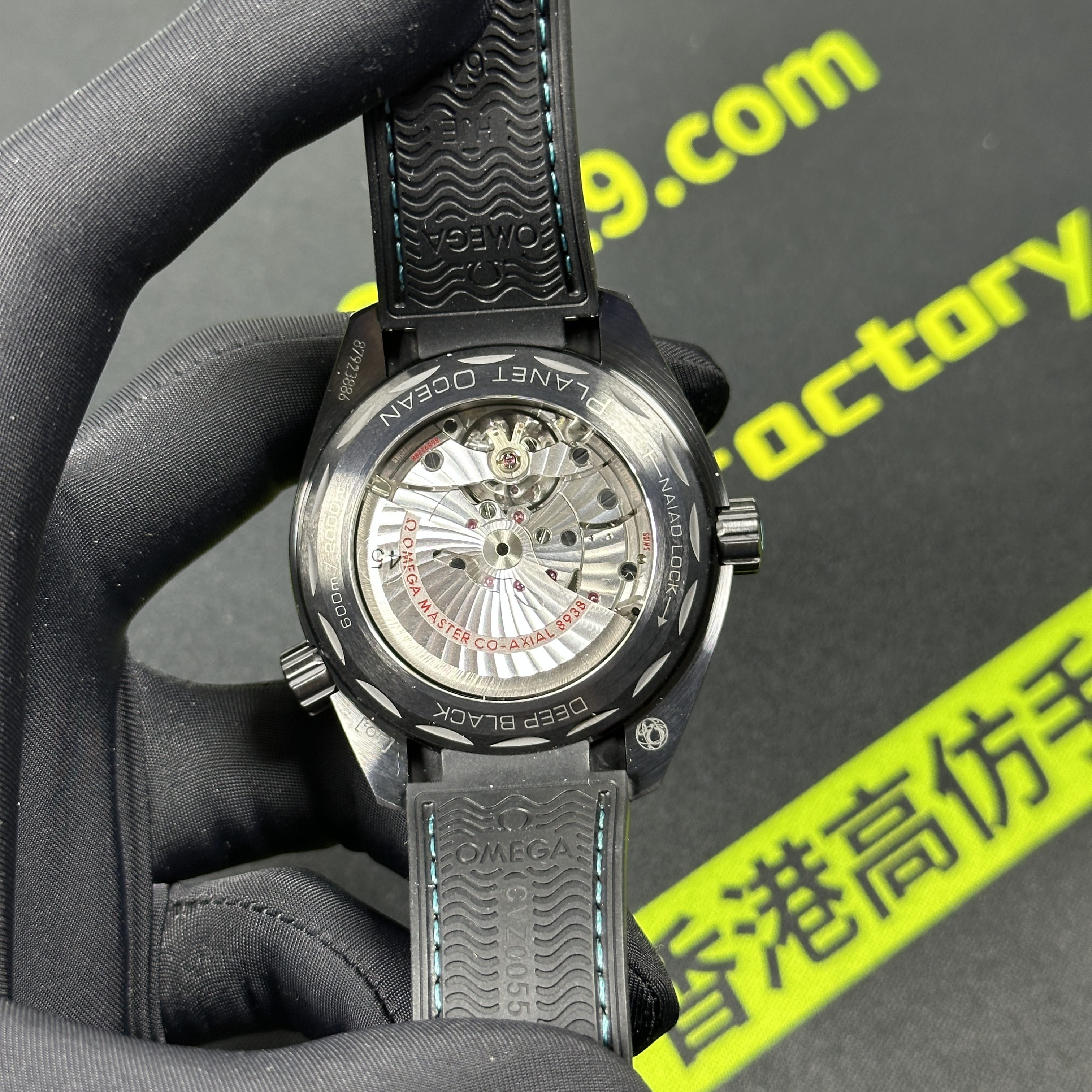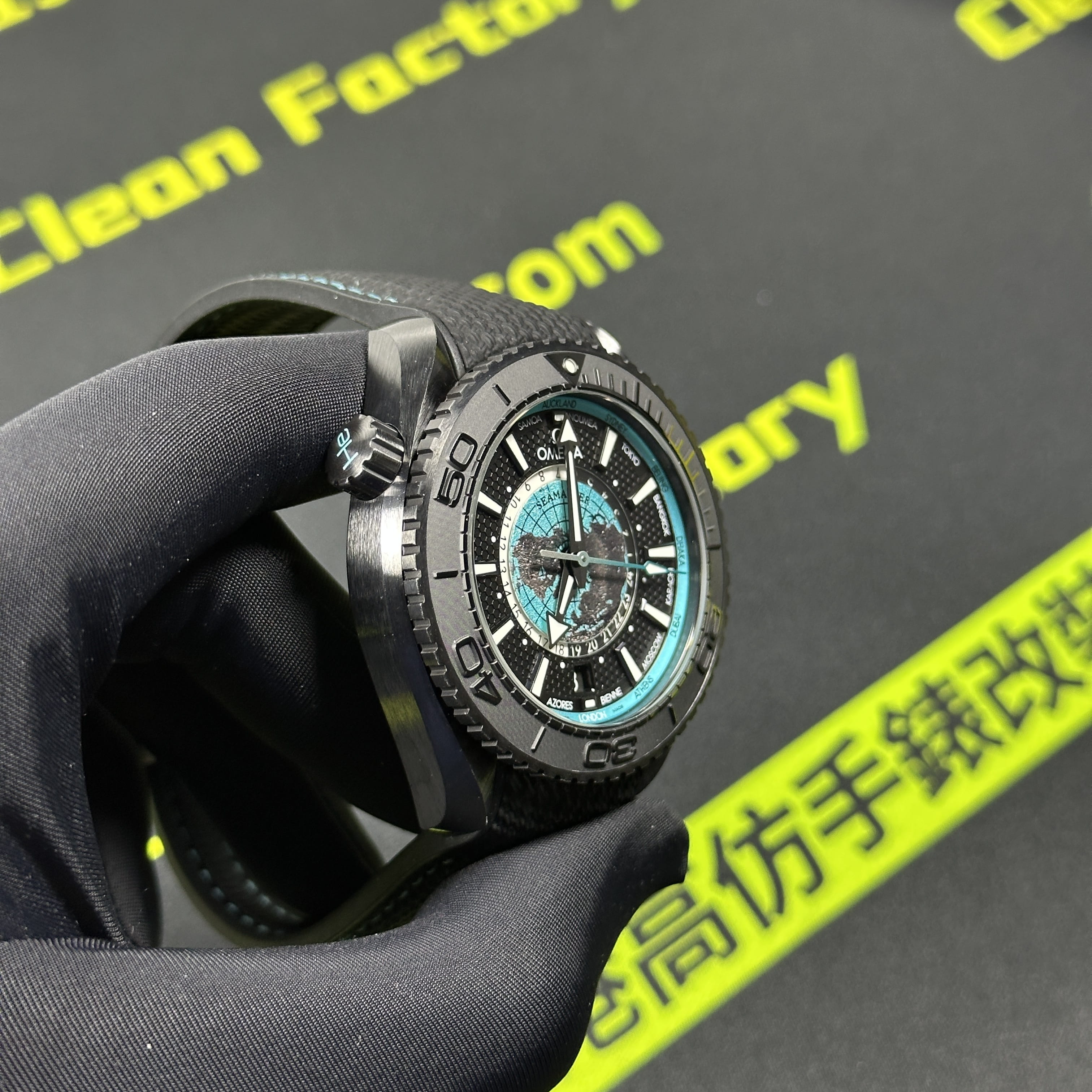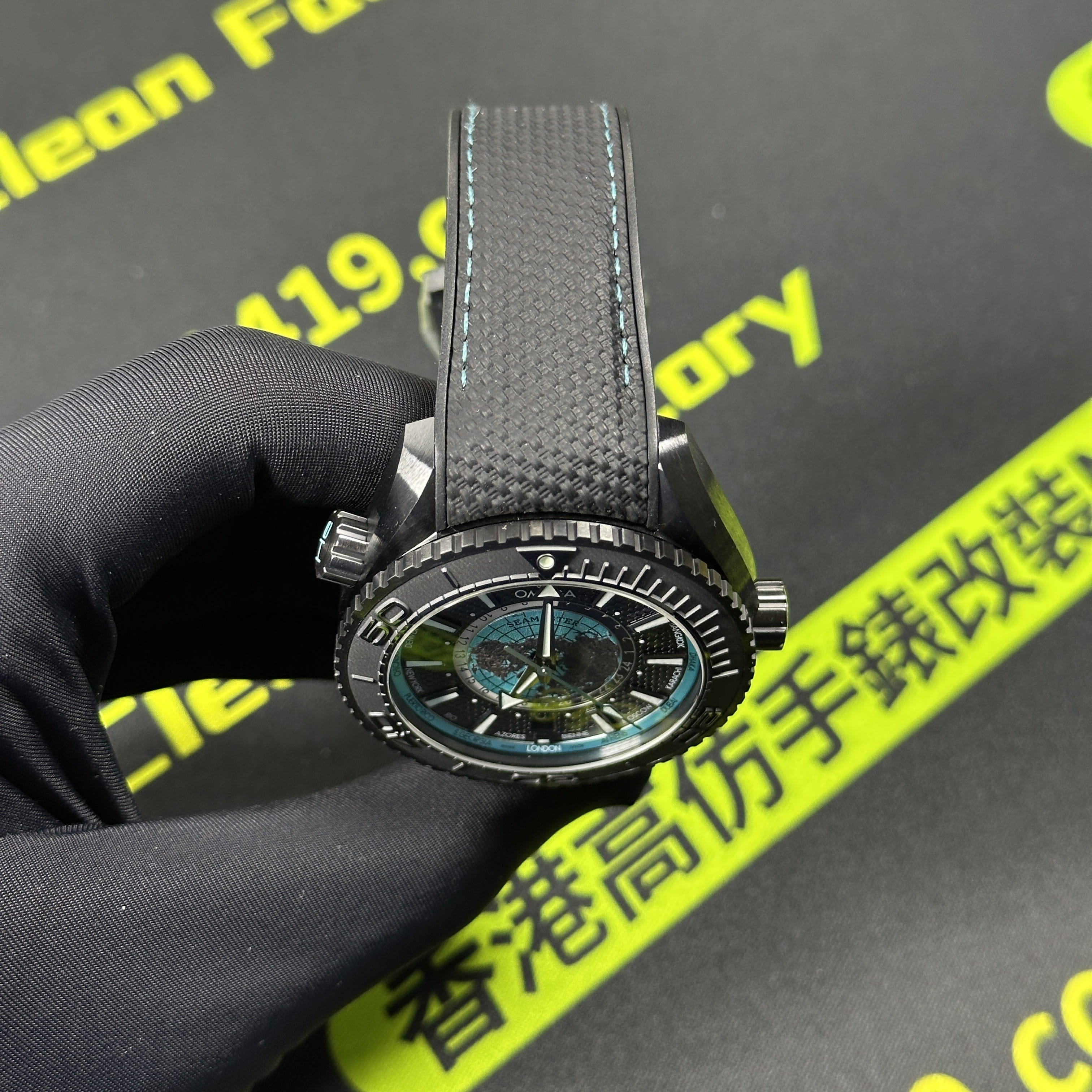 VS廠官網推出的最新款Omega海馬世界時腕錶215.92.46.22.01.006根據原版數據打造45.5mm腕錶直徑,對比鋼帶版本的世界時腕錶43mm,大小之間僅僅只是相差了2mm.黑色陶瓷材質打造的錶殼,圈口.錶盤內部是一個以地球形成的表面構造,並且通過漆面處理呈現出白天與夜晚的視覺感,VS廠塑造的地球表面足以達到專櫃版本的世界時腕錶基礎構造.匹配了橡膠錶帶,搭配黑藍色的陶瓷錶殼一股黑武士的風格呈現而行,非常具有男性佩戴的魅力.