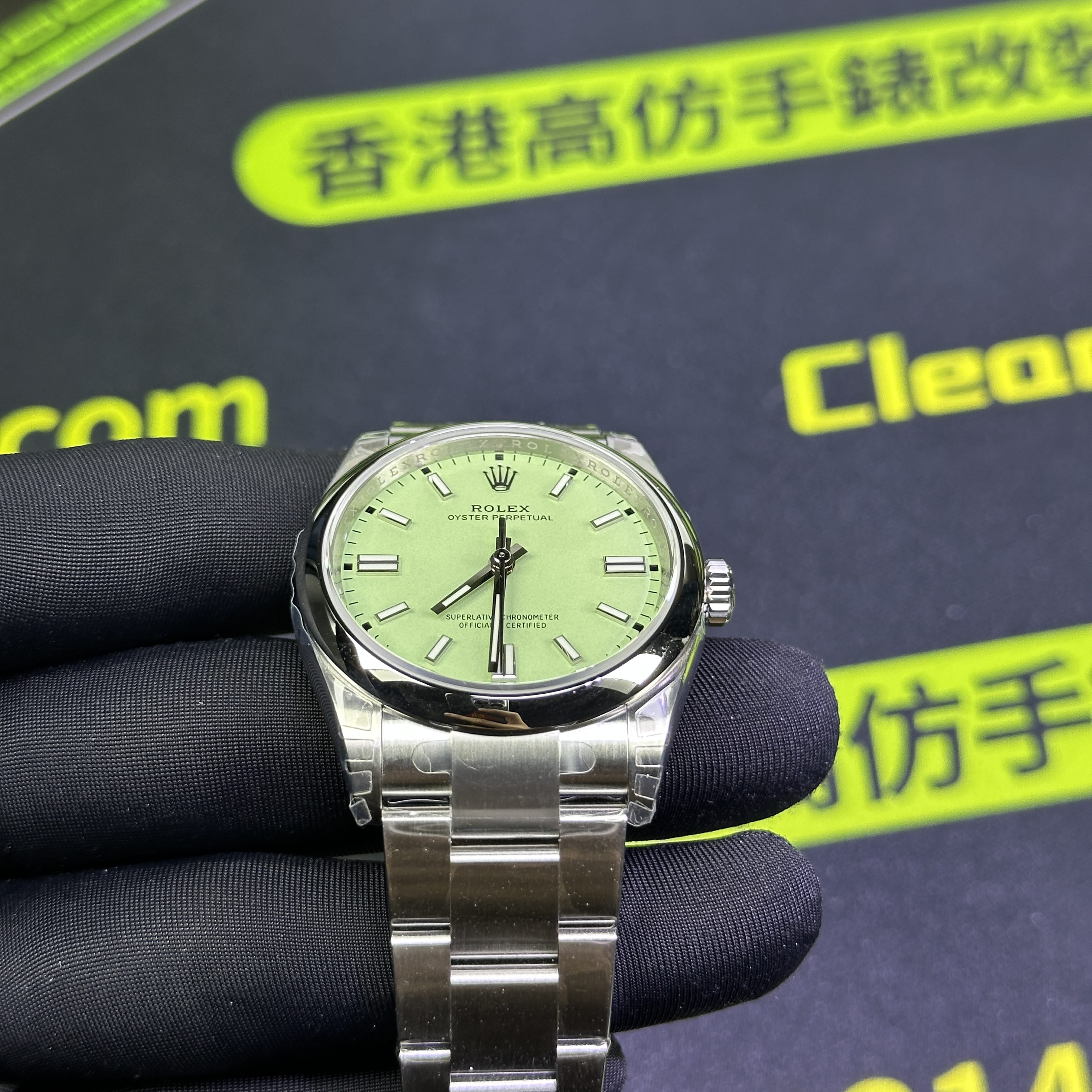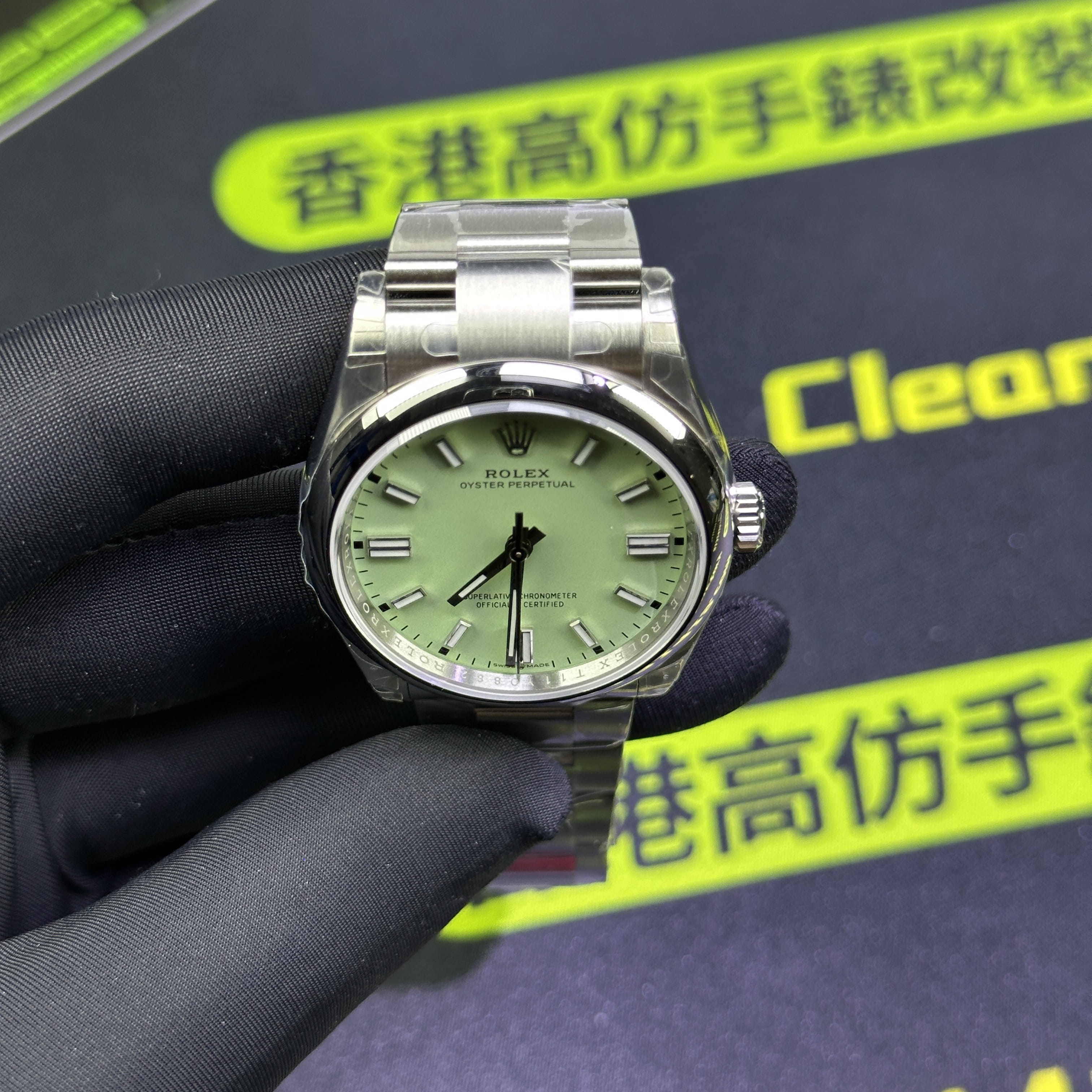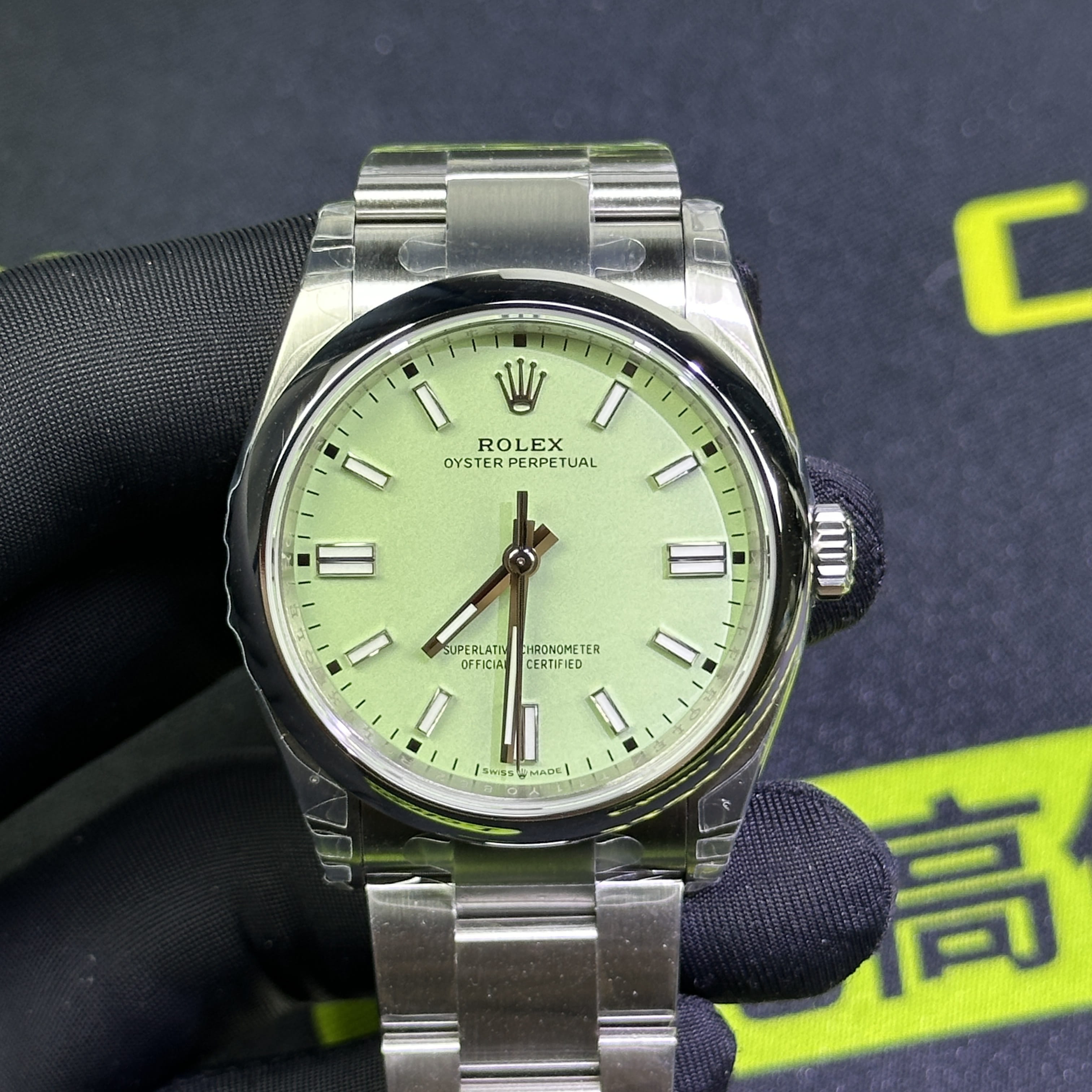 VS廠官網全新推出的高仿勞力士蠔式恆動系列126000-0011,此次發佈了最新配色,簡稱"開心果綠".VS廠依據原裝正品數據1:1復刻2025最新款蠔式恆動開心果綠,整錶尺寸36mm,採用904L精鋼材質,打造錶殼,錶帶,錶扣.圈口部分使用了拋光工藝製作,整個圈口呈現出非常光滑的視覺感.而錶殼部分則是涉及到拉絲銜接到錶帶部分.此外目前勞力士官方並未推出41mm版本的開心果綠錶盤,因此該盤面僅有36mm規格有.蠔式恆動是一款沒有日曆顯示功能的腕錶,整個盤面主要涉及到字面,指針,刻度為例.