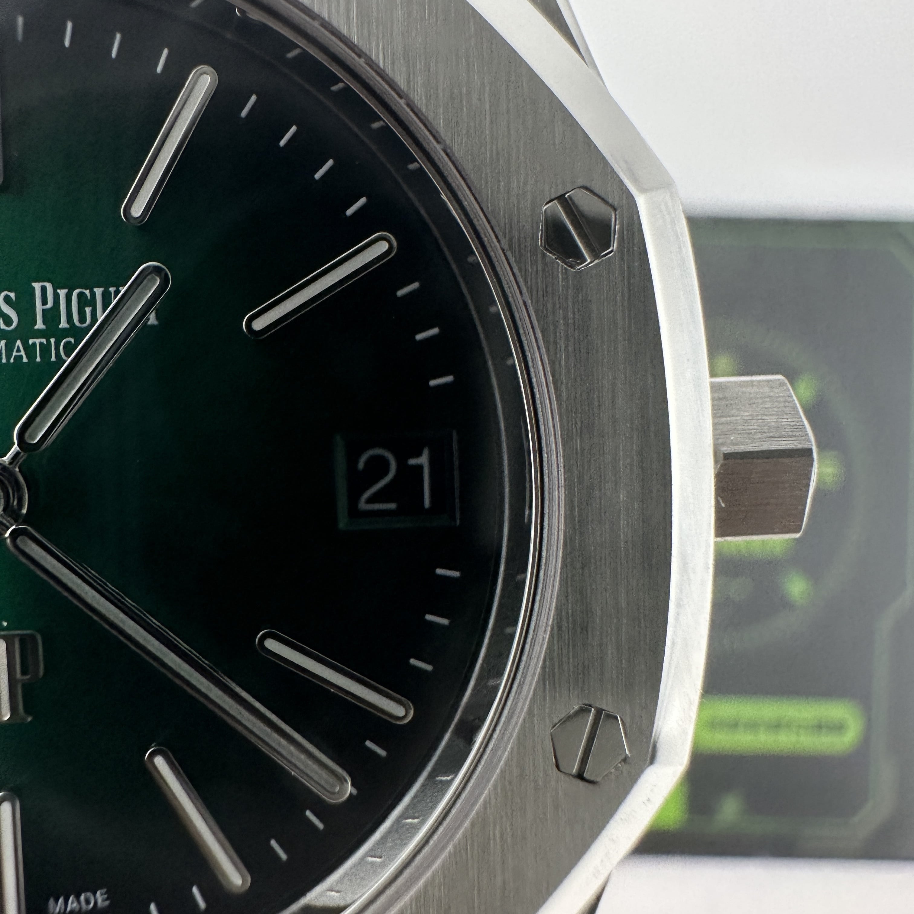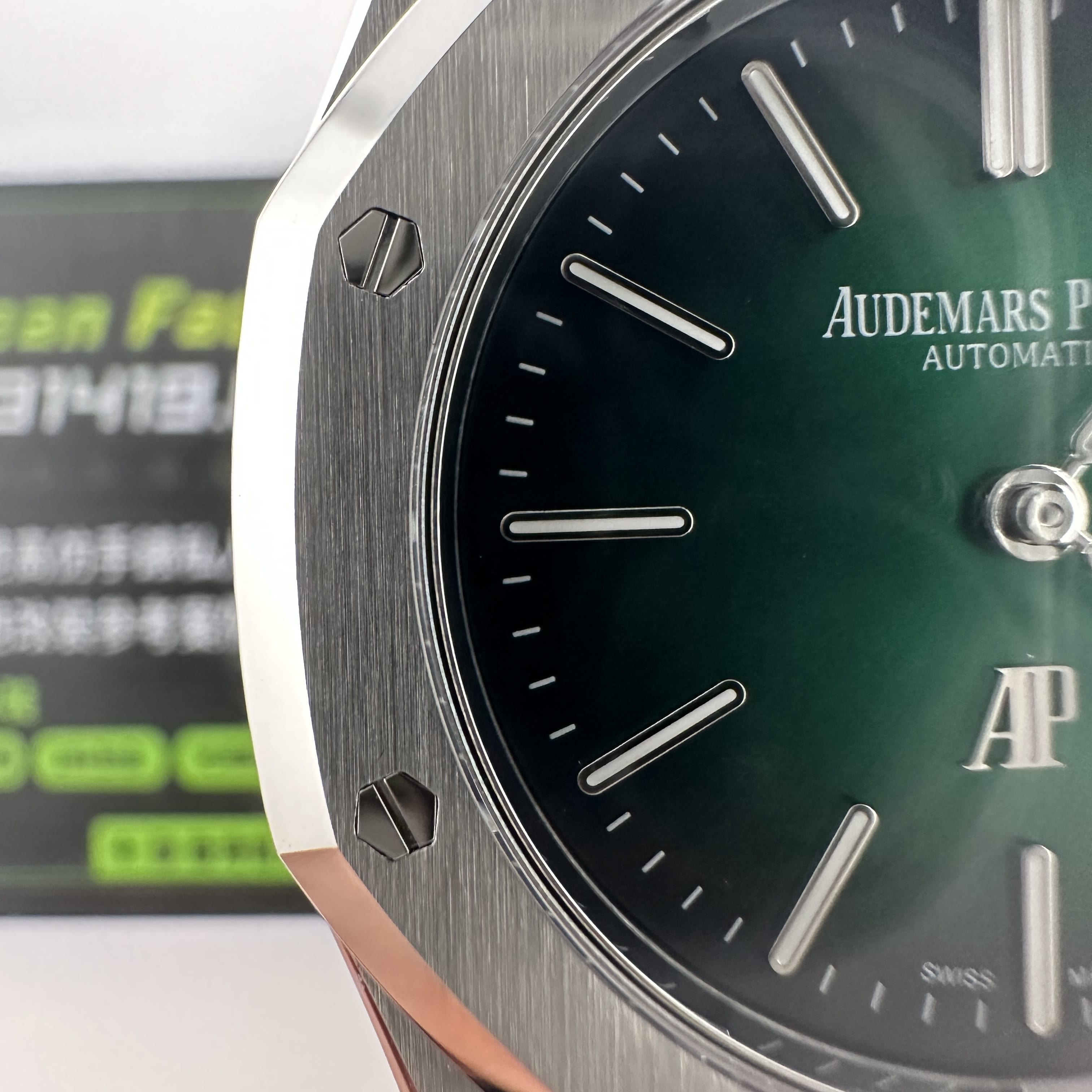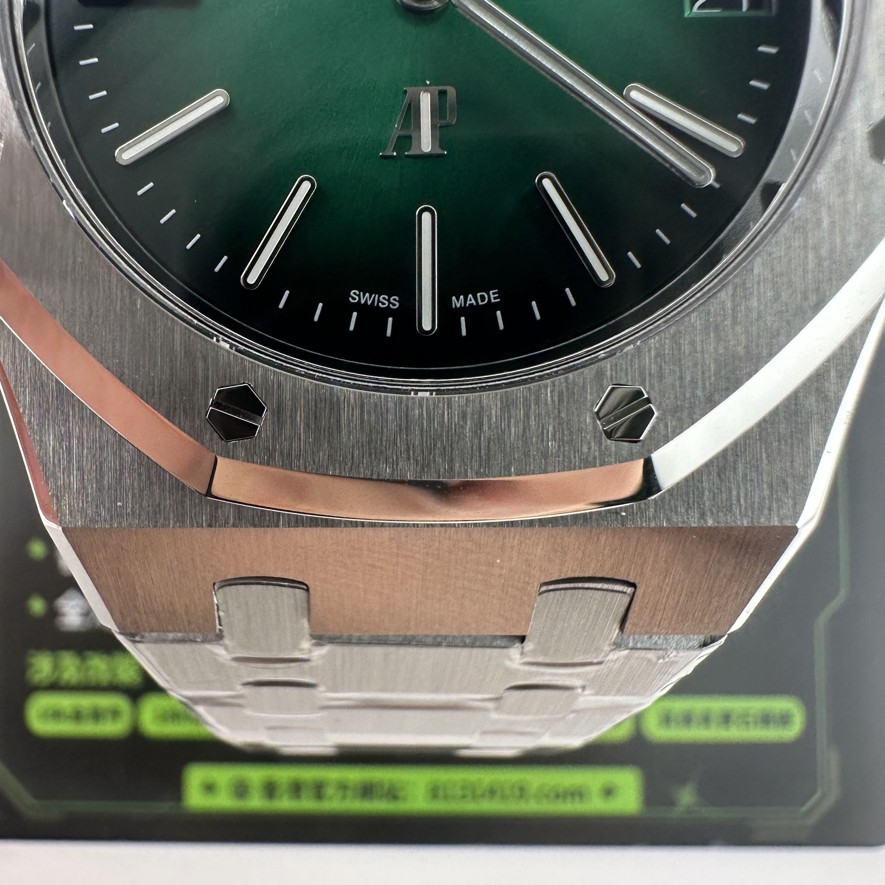 大家可以通過實物實拍過程中了解到ZF廠出品的16202極光綠錶盤其實整體的色差不大,但對比正版肯定存在細微的色差,就以綠色錶盤為例,ZF廠愛彼16202沒有正版的閃度以及放射紋稍微沒有做到那麼足.不過ZF廠又是高仿市面上目前能夠做到最接近原版盤面的廠家.再者是細節處理中,ZF廠已經做到極致還原狀態,錶盤的印刷字面,以及時間刻度條丁部分都是做到接近原版品質.由於這款高仿手錶AP並未涉及到太多太複雜的功能和設計,因此也算是合格的復刻錶之一