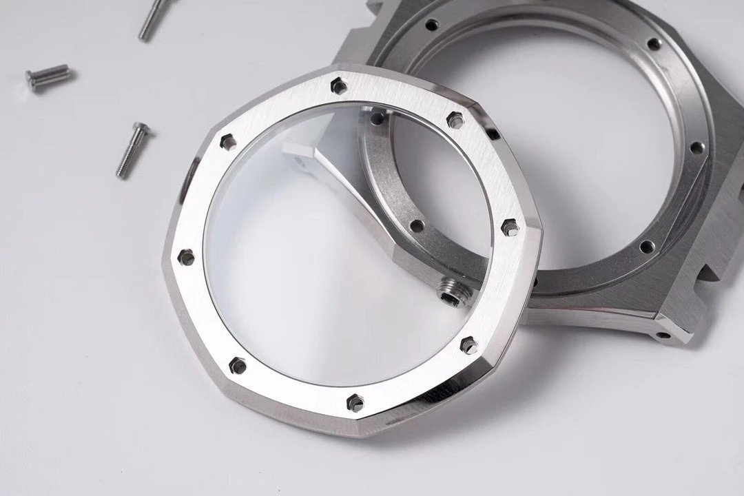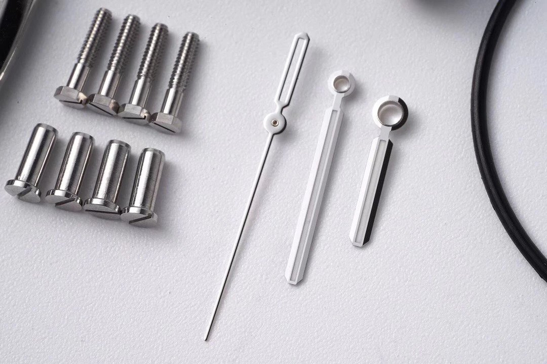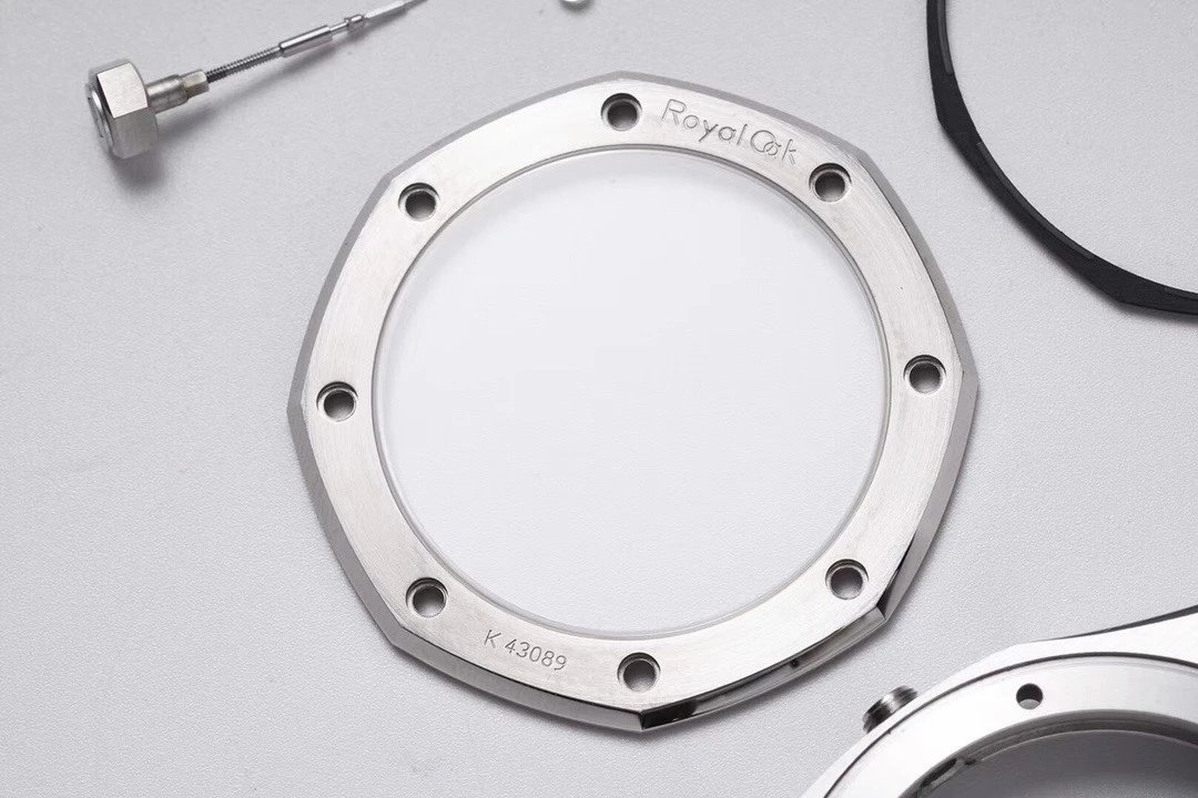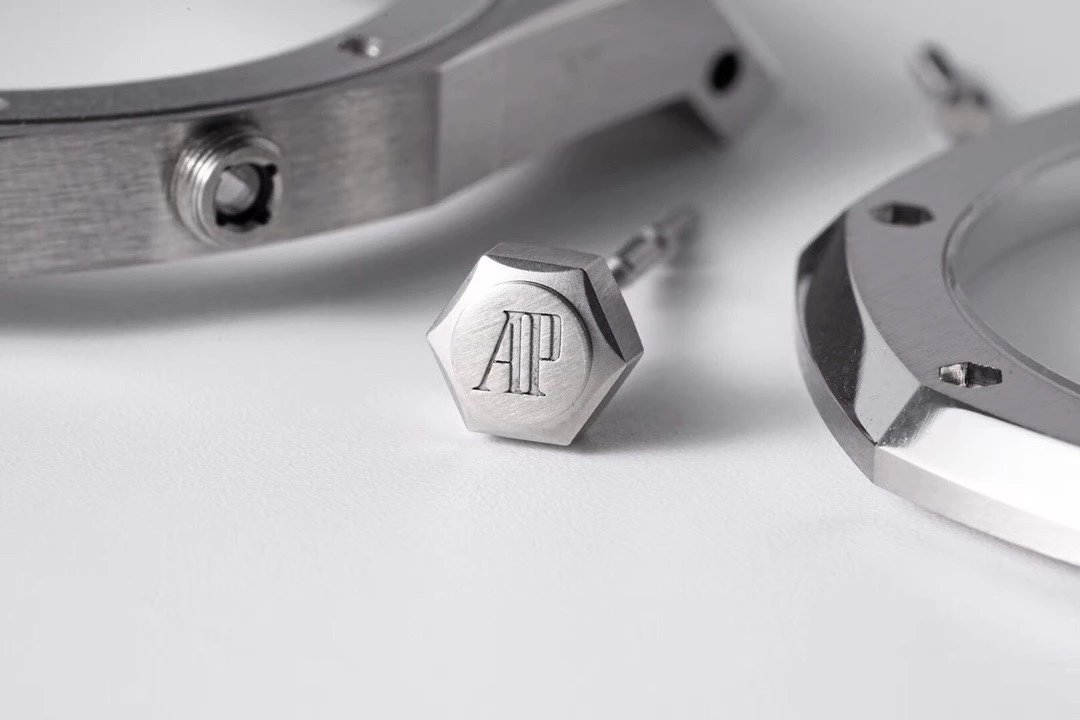 皇橡經典的外八角形表殼,正面拉絲,倒角拋光打磨,ZF廠在加工工藝上也是做的得心應手,和正品結構一致的四件套殼套,頂蓋、防水圈、中殼、底蓋,三個精鋼零件該拉絲的拉絲、改拋光的拋光,需要有倒角的地方ZF也是不惜餘力,每一個細節都可以說是精雕細琢。連接固定四件套的八顆六角形螺絲也經過細緻的二次加工處理,螺絲開槽基本可以達到同心圓的效果