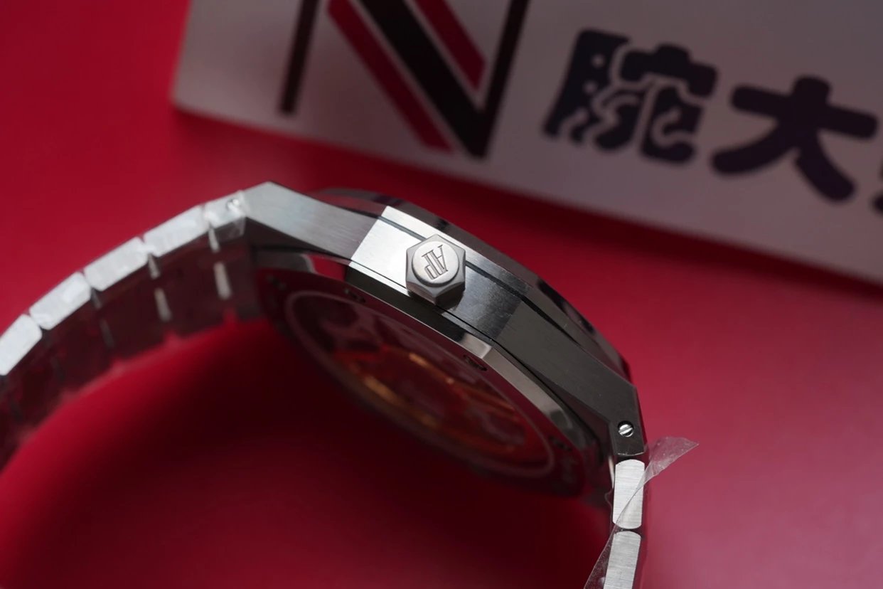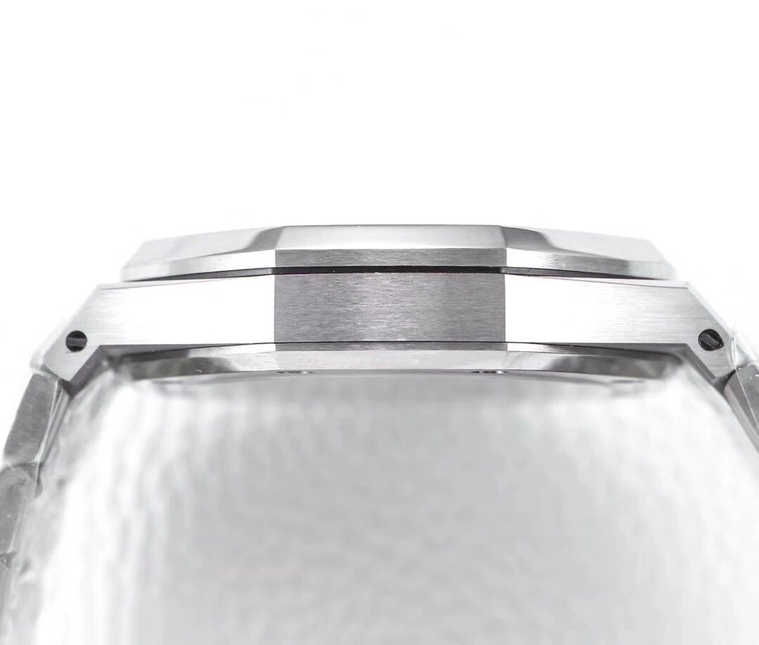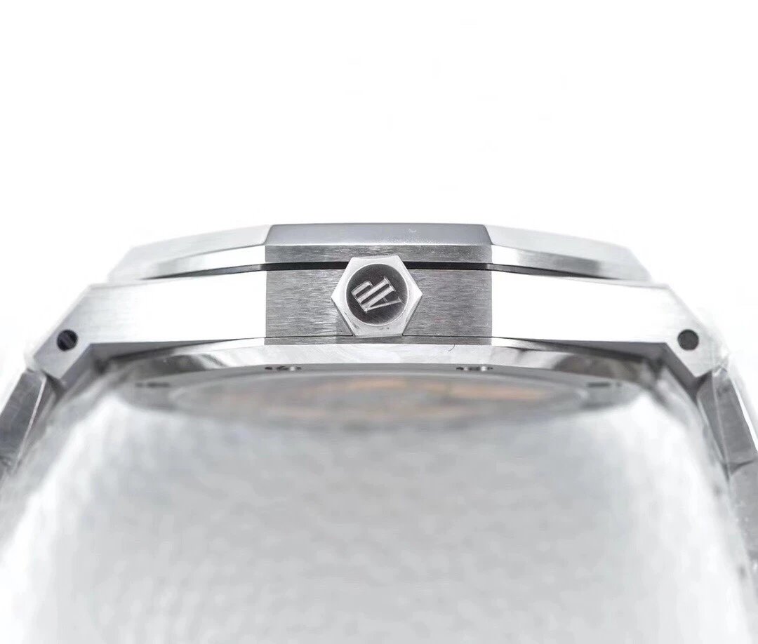 ZF廠15500對於表殼而言,整體由316L精鋼打造,同時對於腕表整體也是採用了,拋光以及側面拉絲的設計,讓整體腕表非常具有陽剛魅力,這也是鋼帶款之王的由來。整體腕表採用了經典的八角型圈口,腕表獨有的設計,辨識度也是非常高,同時整體腕表線條硬朗棱角分明,佩戴起來也不會出現刮手的尷尬局面,經典的造型。表面也是採用8顆螺絲固定,腕表右側同樣採用六角形的把頭,設計為旋入式把頭,讓腕表在防水力度上也是加強了很多,也有效提升腕表的密封性,在腕表把頭上頂部刻有AP字樣,非常具有立體感,讓整體腕表在外觀上也是非常具有魅力!