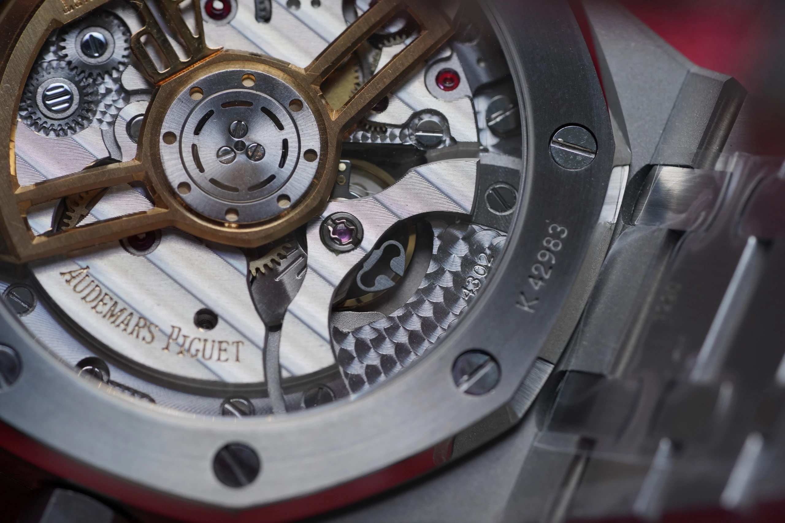 背透的底蓋內部就是這支腕表的心臟,在西鐵城9015的基礎上直接改裝的4302機芯,這支機芯並不是以前那些在9015上增加一個裝飾夾板的方案,其是直接在9015的基礎上直接改進的,所以每一顆寶石、每一個螺絲、軸承齒輪都是有作用的,轉動自動陀可以發現相關的齒輪都是再轉動的,而那些加裝飾夾板的機芯(例如JF的15400)自動陀轉對應的上鏈齒輪是不轉的。
