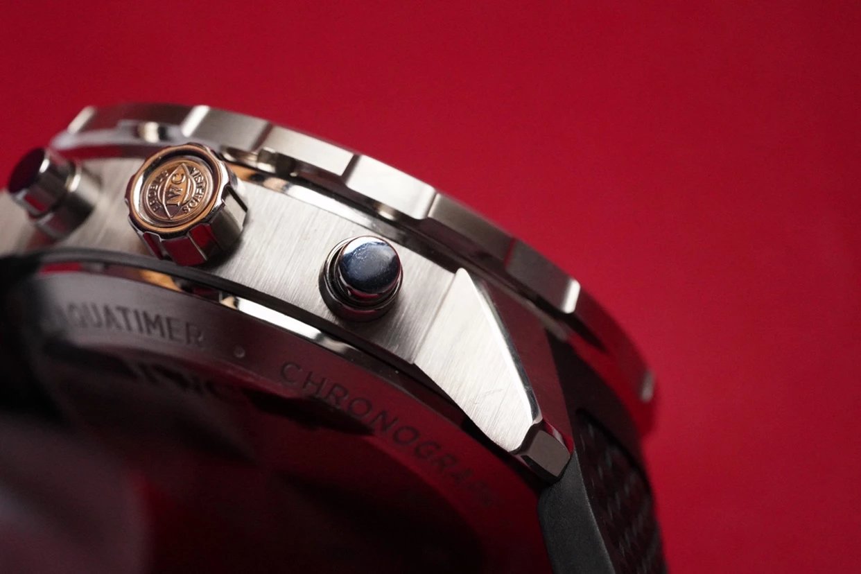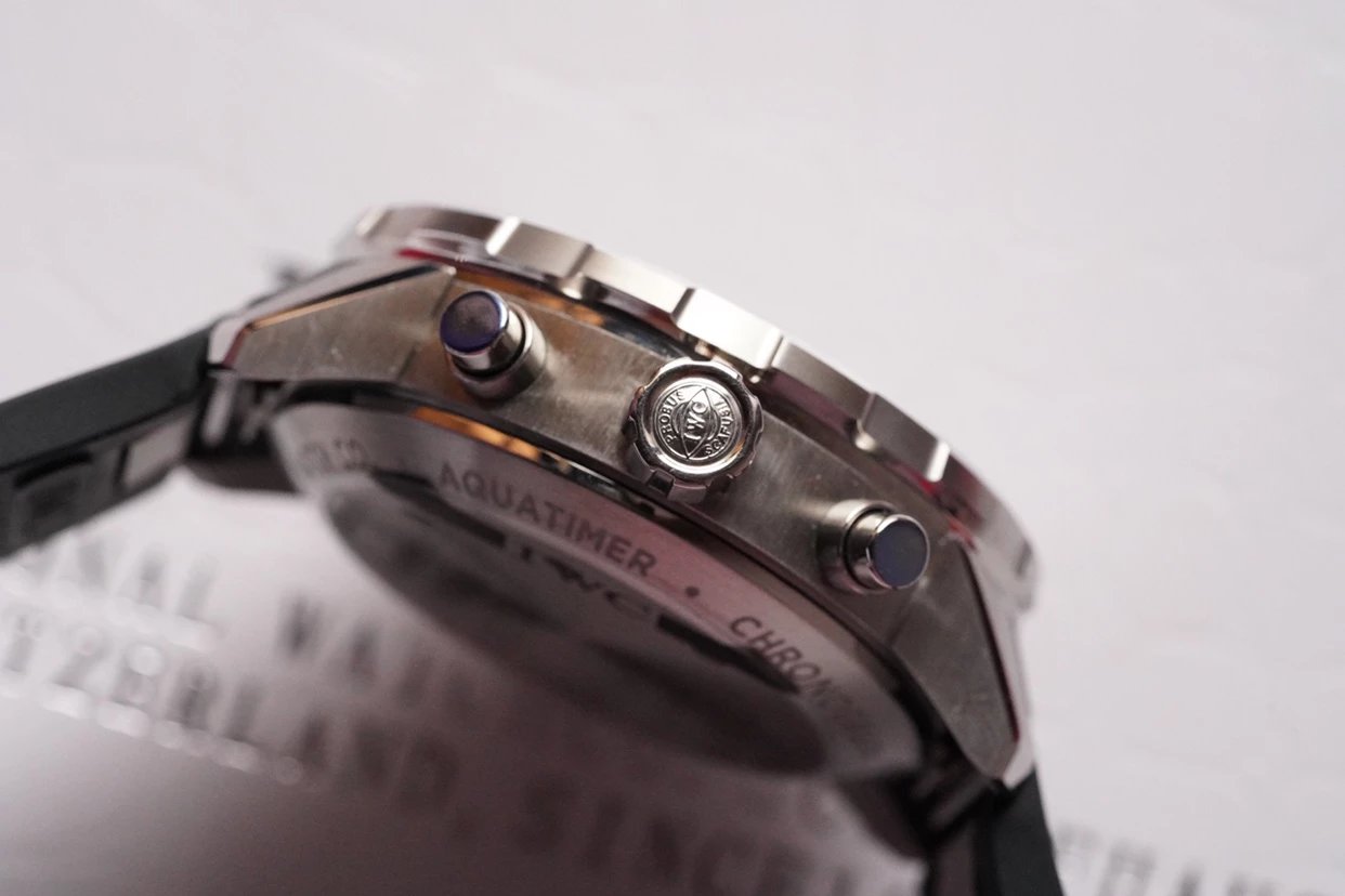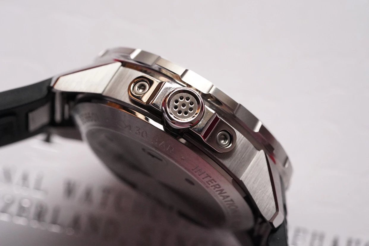 表冠以精鋼打造,側面採用拉絲設計,雕有齒輪狀凹槽,呈現出硬朗的機械氣質。表冠的整體設計較為寬大使得上鏈手感非常舒適,表冠的頂端雕有萬國的IWC標記,象徵著其品牌身份。