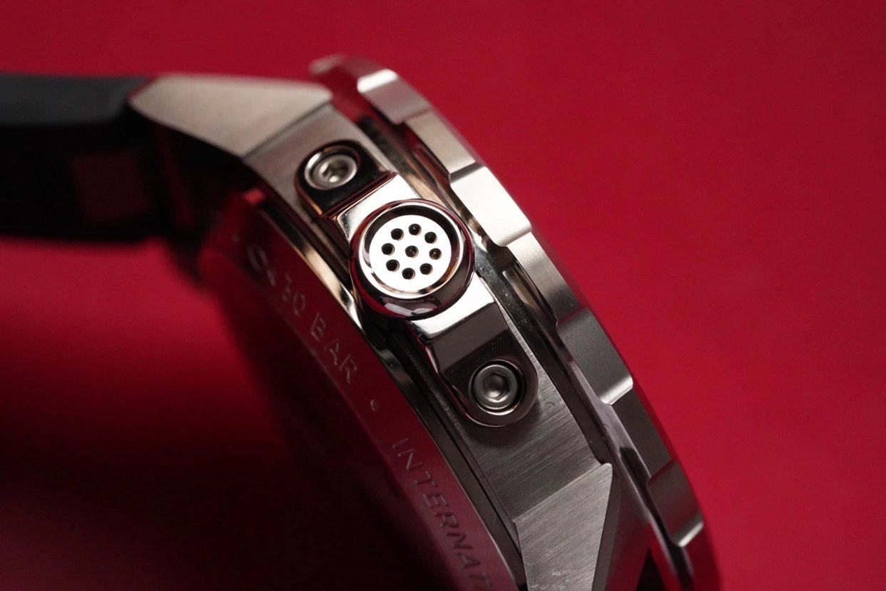 V6萬國海洋時計腕表,採用精鋼材質打造表殼,表徑為44毫米,配備搭載安全潛水系統(Safe-Dive system)的創新型內外旋轉表圈,黑色錶盤搭配白色的時標,簡潔明瞭,便於清晰讀時,