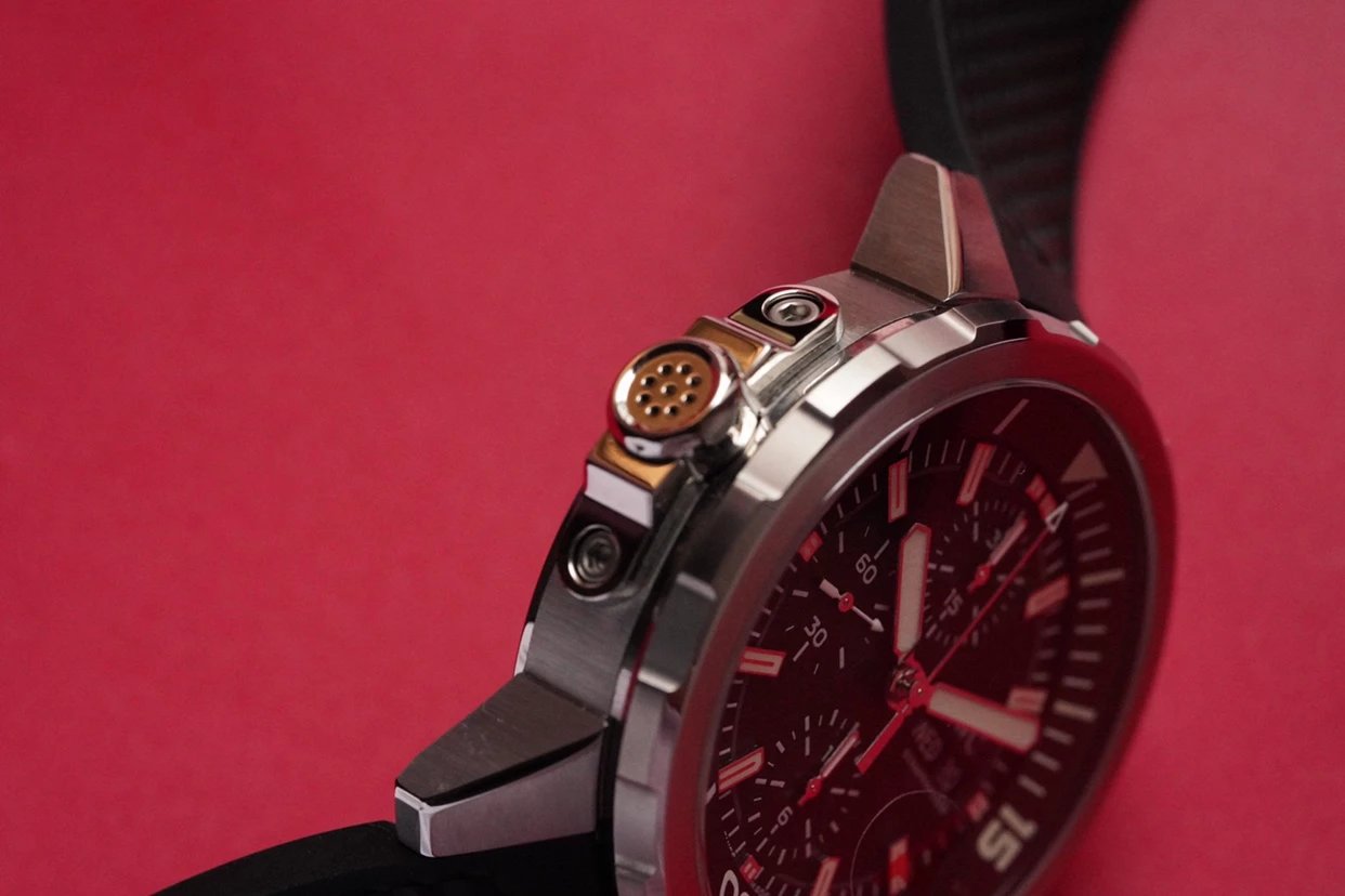 該腕表配備黑色天然橡膠錶帶,配置的針式表扣,佩戴方便,舒適
