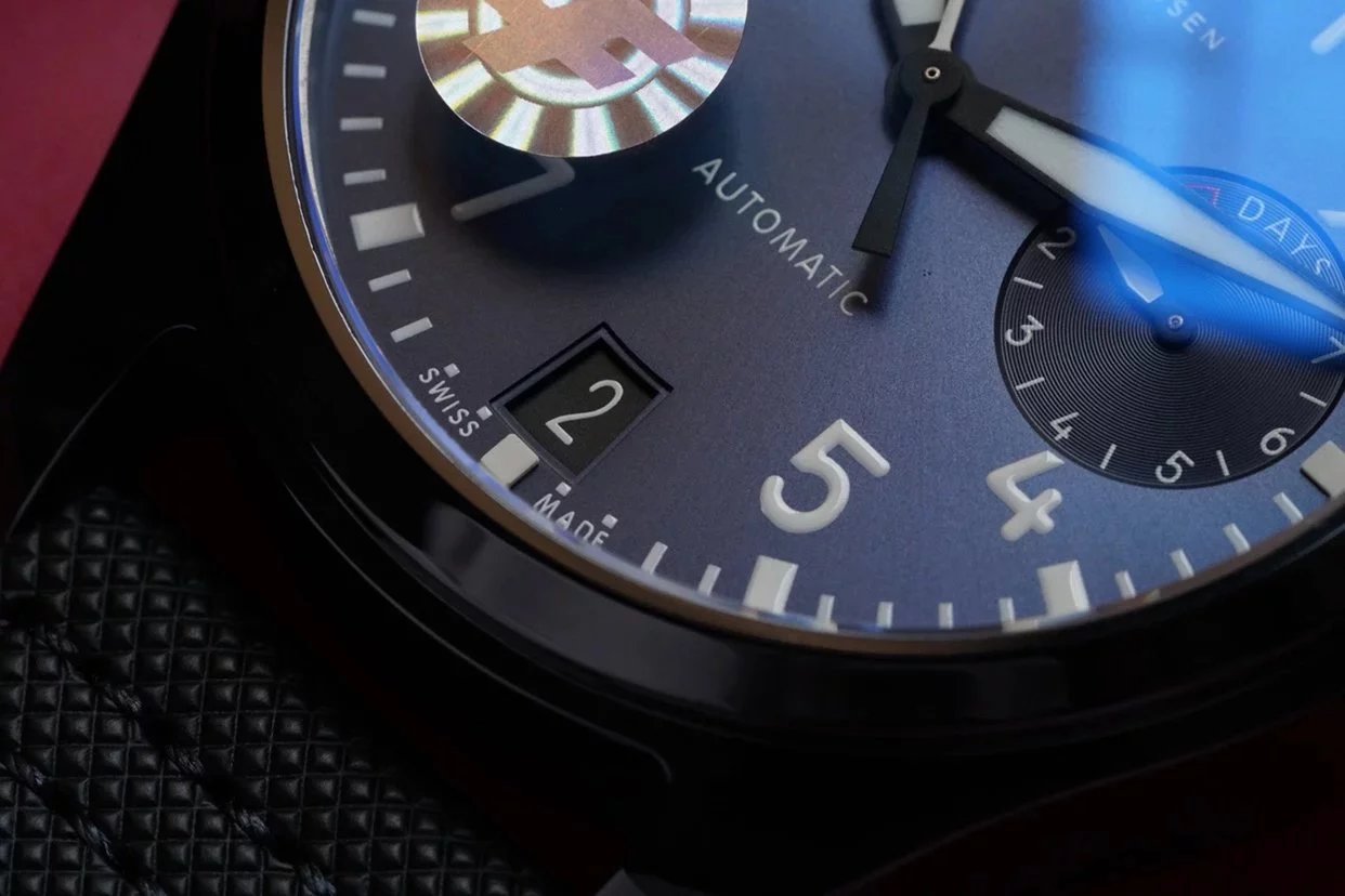 ZF萬國大飛的表殼尺寸以及其弧度的把控的很準確,錶盤刻度字體和巨細無異,很難分辨出不同。實心316L精鋼表殼,錶盤刻度,數字,字母標誌等原。選用的是藍寶石水晶玻璃鏡面,並鍍有藍膜,鏡面都對錯通透亮堂!對於細節的把控ZF還是非常不錯的!