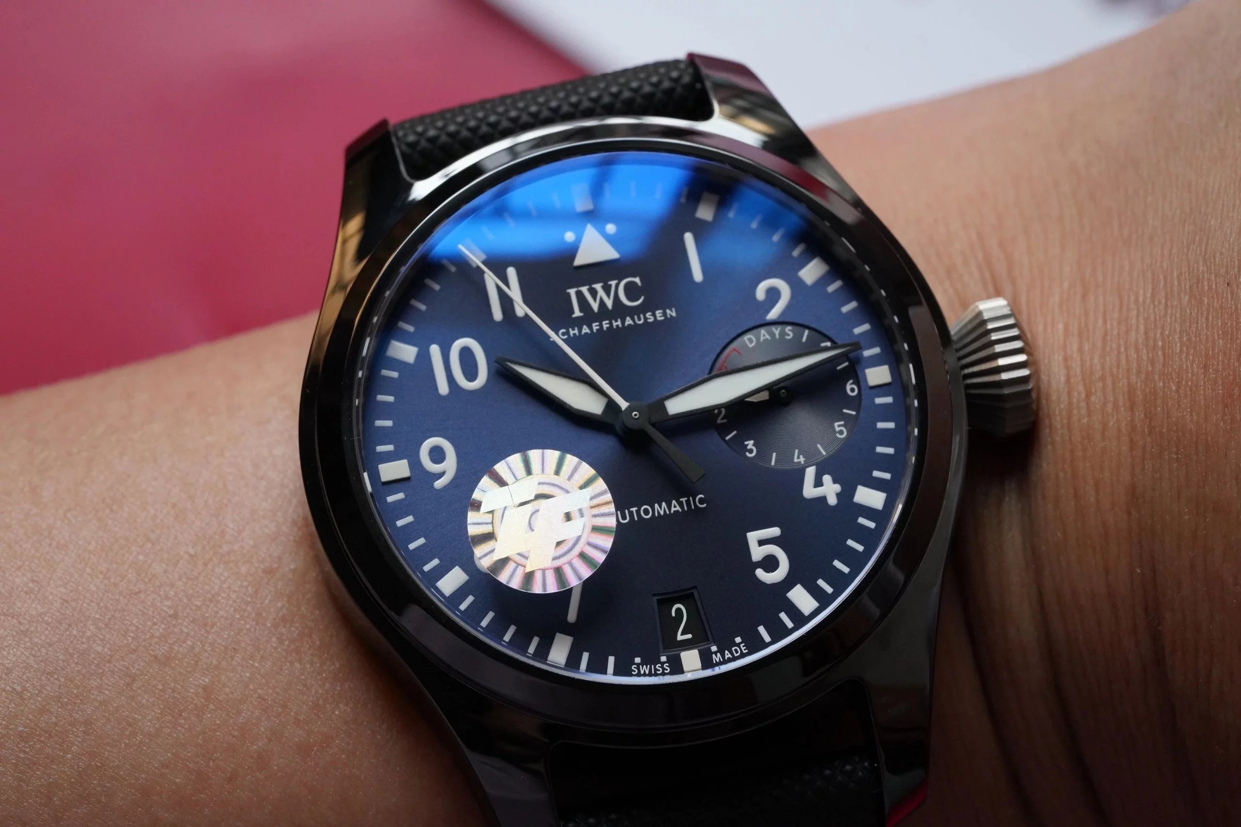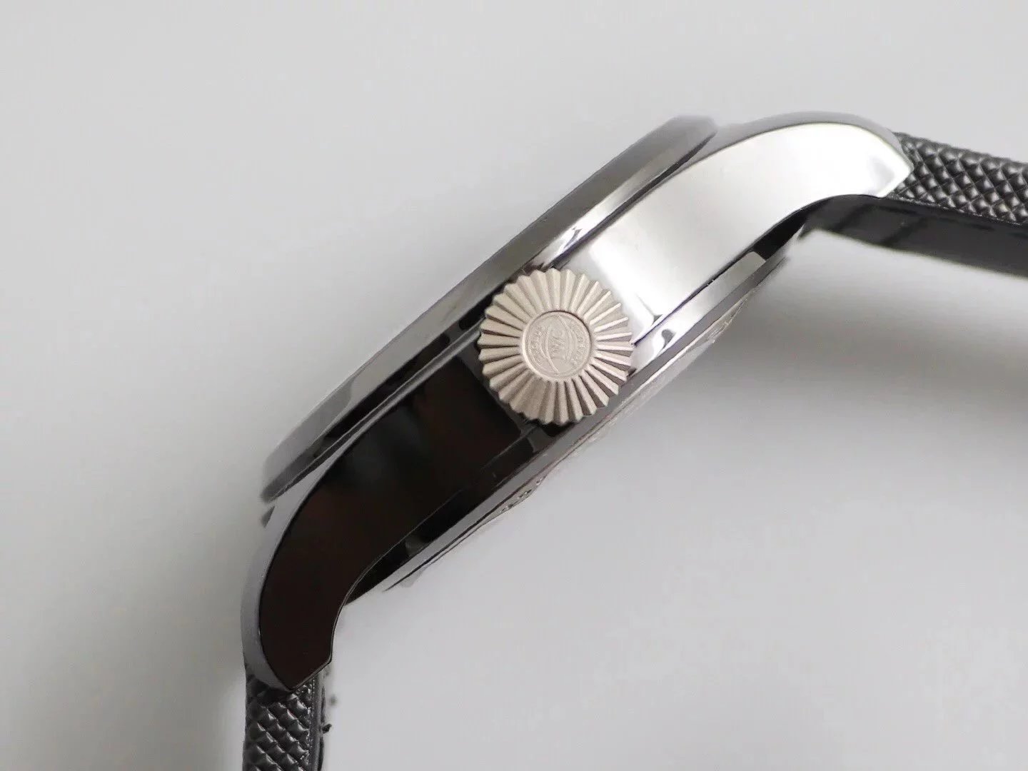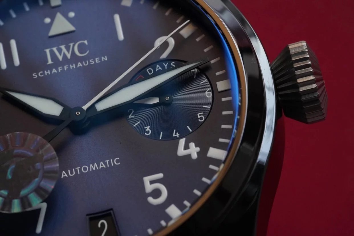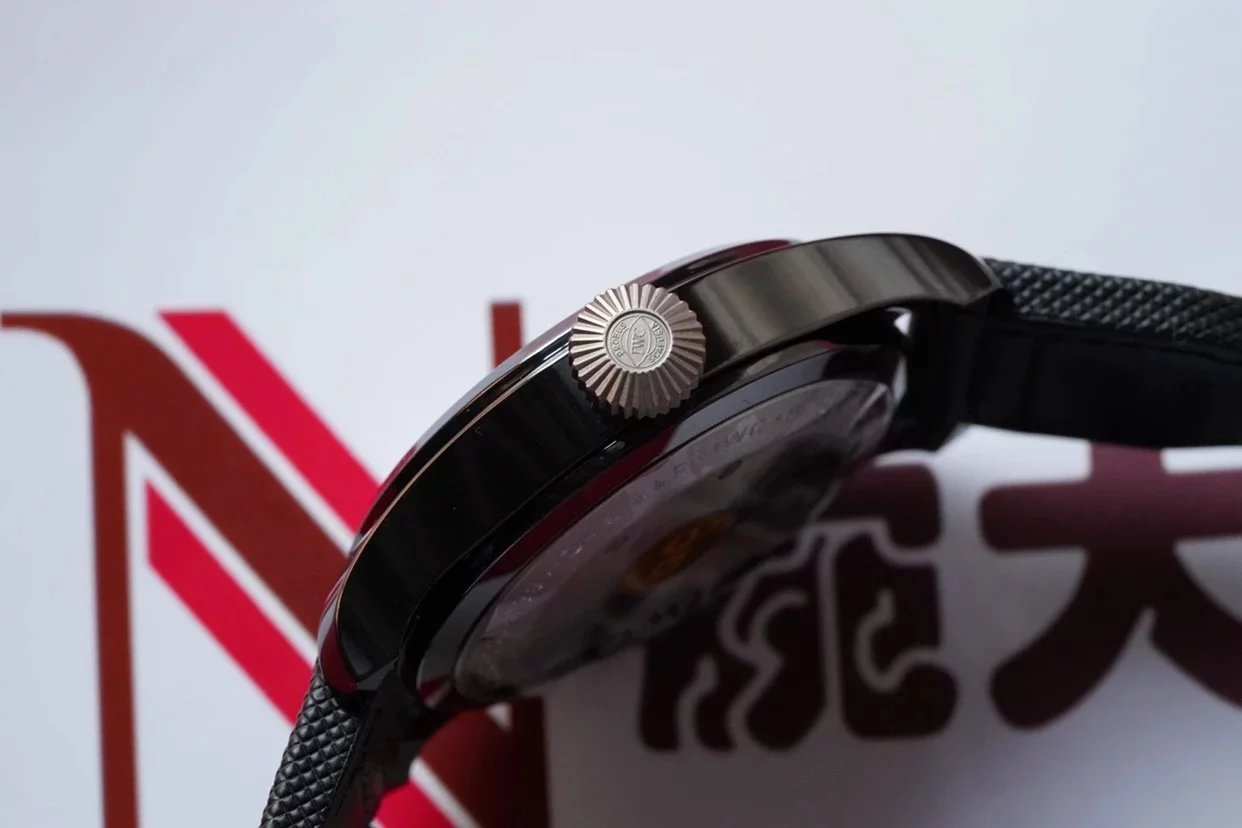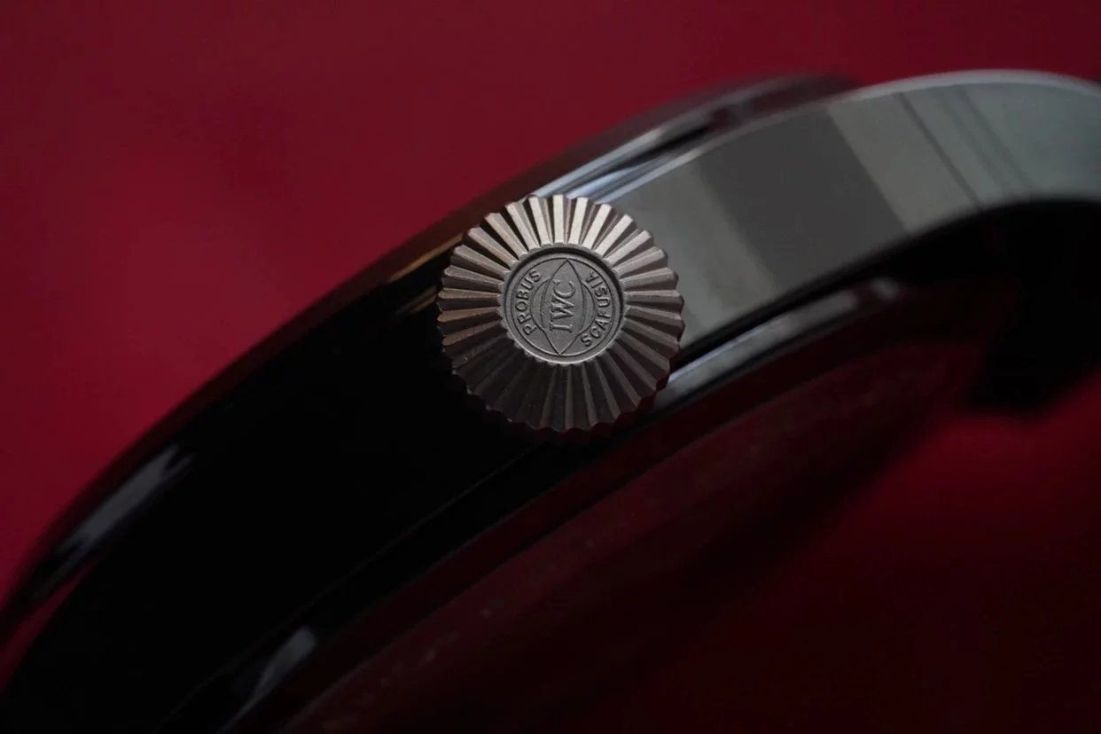 表冠採用了獨特的褶紋設計,以鈦金屬打造,寬大的表冠設計,為表款帶來了非常舒適上鏈手感,即時佩戴手套亦可輕鬆旋動,表冠頂端雕有萬國的品牌Logo,彰顯品牌身份。打磨拉絲非常細膩,精細,展現出低調的金屬光澤,簡潔流暢的線條設計為表款賦予了粗獷硬朗的雄性氣質。