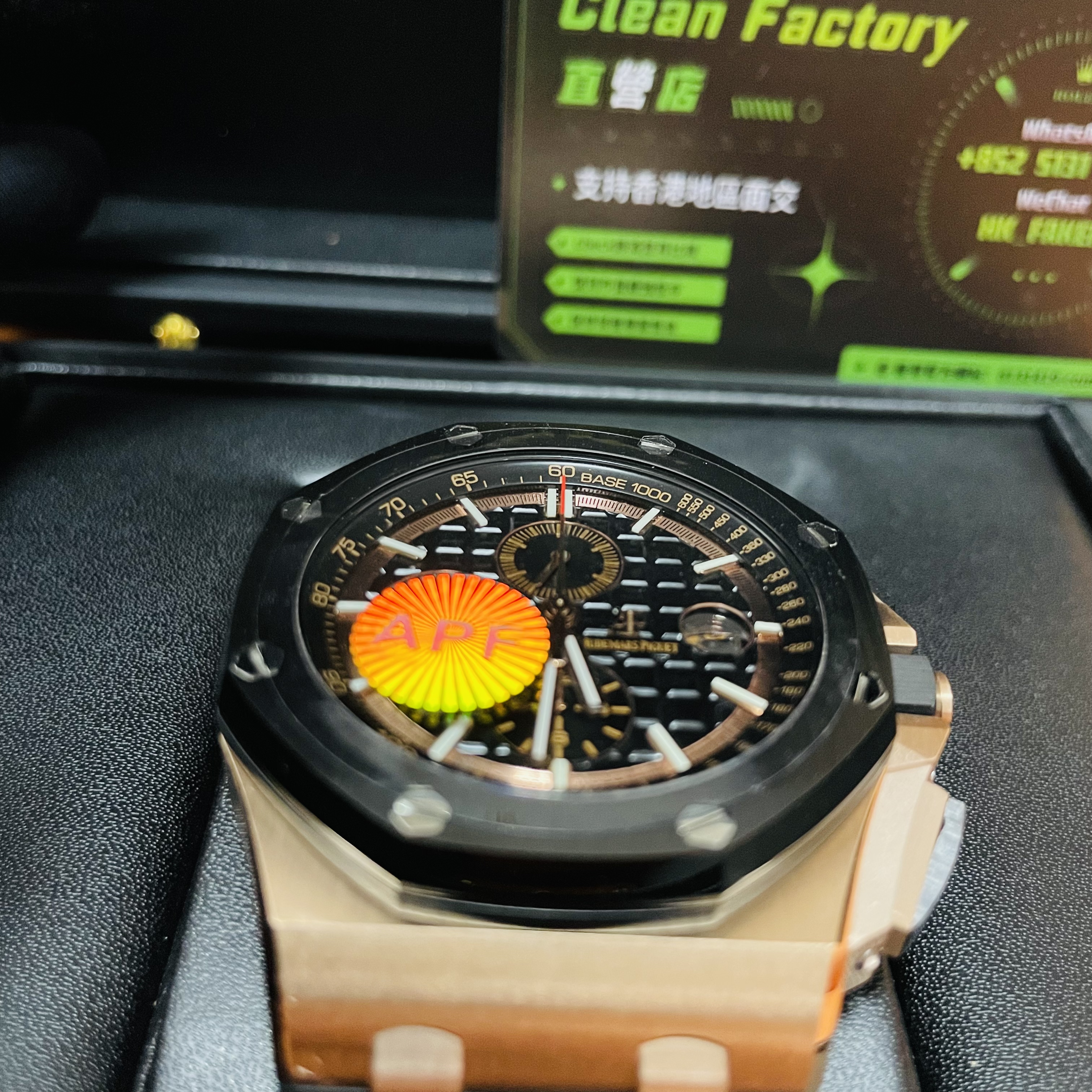 APF廠全新推出的愛彼皇家橡樹離岸AP復刻錶26400系列,腕錶直徑尺寸44MM,APF廠是一家專門復刻頂級AP腕錶的大型廠家之一,這一隻AP26400算得上是頂級佳作,主要優點體現在錶圈與錶殼之間的工藝.錶圈可以看到是採用了黑色陶瓷表圈,陶瓷表圈上的工藝是拉絲工藝,表圈側面則是拋光效果,完全是不一樣的展示效果.而錶殼則是904L精鋼材質,玫瑰金電鍍工藝,打磨後的錶殼棱角不會刮手,非常圓潤! 特別是右邊調節把頭的打磨對比其他廠家的AP26400,會有對比性,通常一些小廠家做的把頭部分,在我們使用把頭調節時間的時候會有刮手的現象,而APF廠ap26400要做的比他們好很多.
