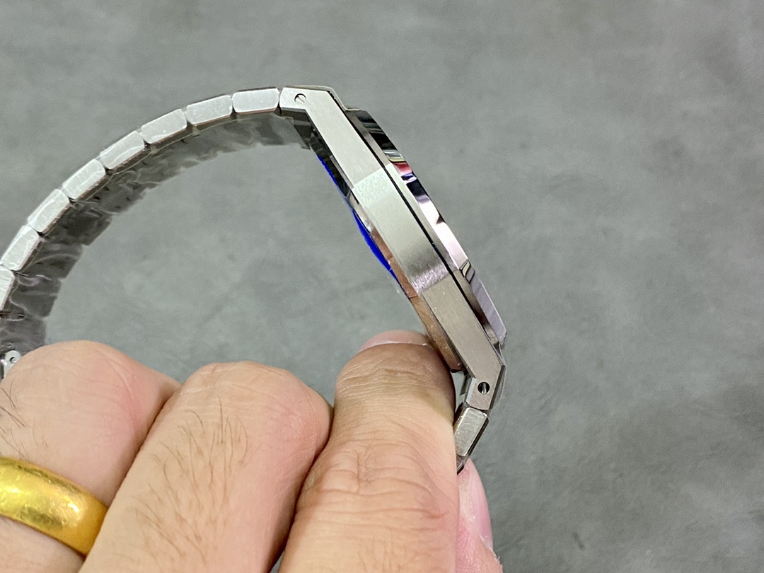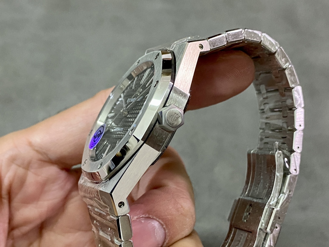 APS一体3120 最强"钢王"壳套特点 1、与原版一致:直径41毫米和厚度 9.8毫米 2、APS版的15400是市面上唯一能与原版各部件互换通用的版本,表壳所有结构位置和装配方式与原版一致 3、表壳表带细腻的拉丝且不会锋利的工艺更突显出APS一直对细节的一丝不苟 4、表带头粒连接表头处与正品一致的活动头粒设计 5、表扣的开关质感与各部位的雕刻工艺均与正品一致 6、APS版的15400兰色字面做工与颜色和正品放在一起几乎毫无色差 7、机芯方面完美复制原装3120机芯,真正的无卡度一体机芯,不再是9015加甲板