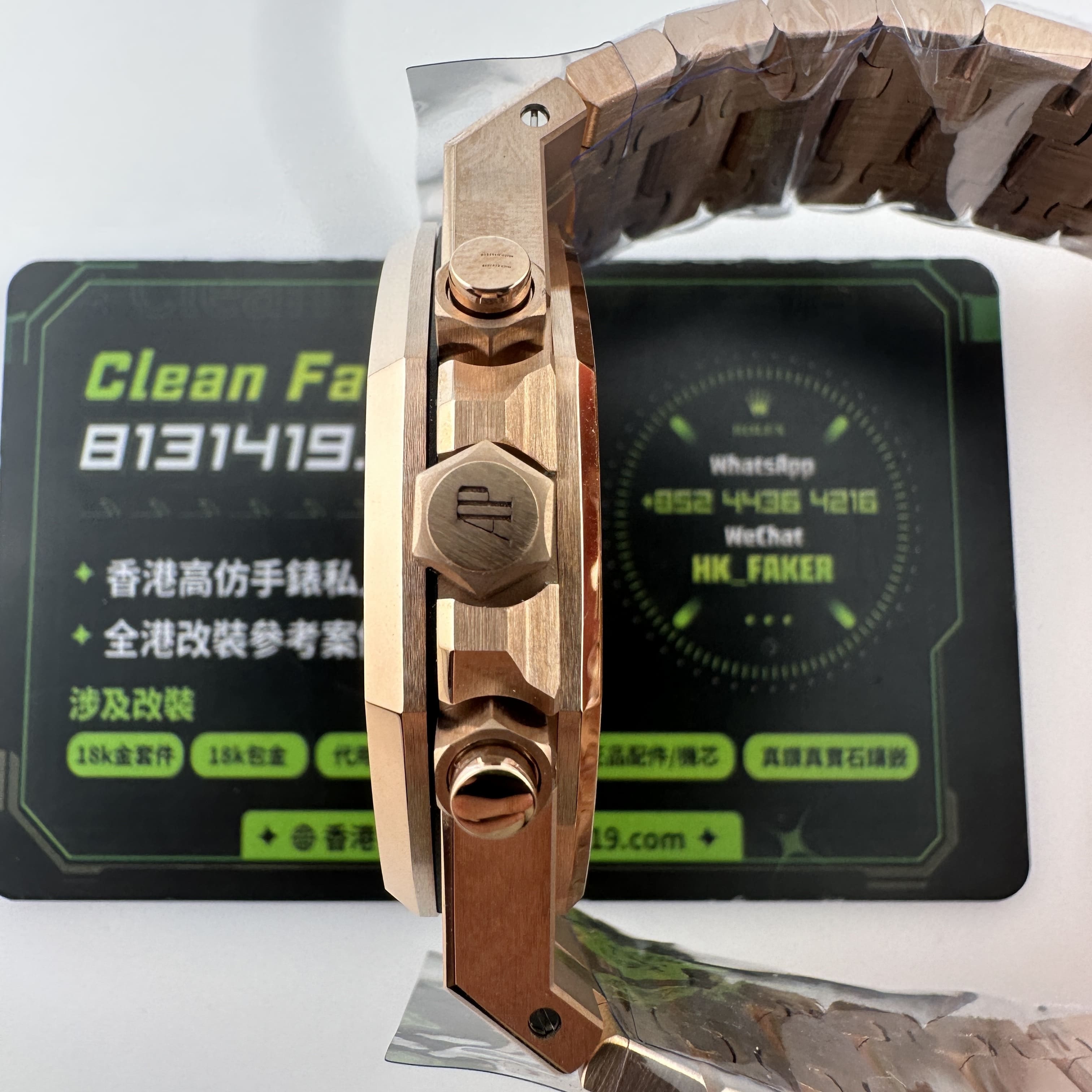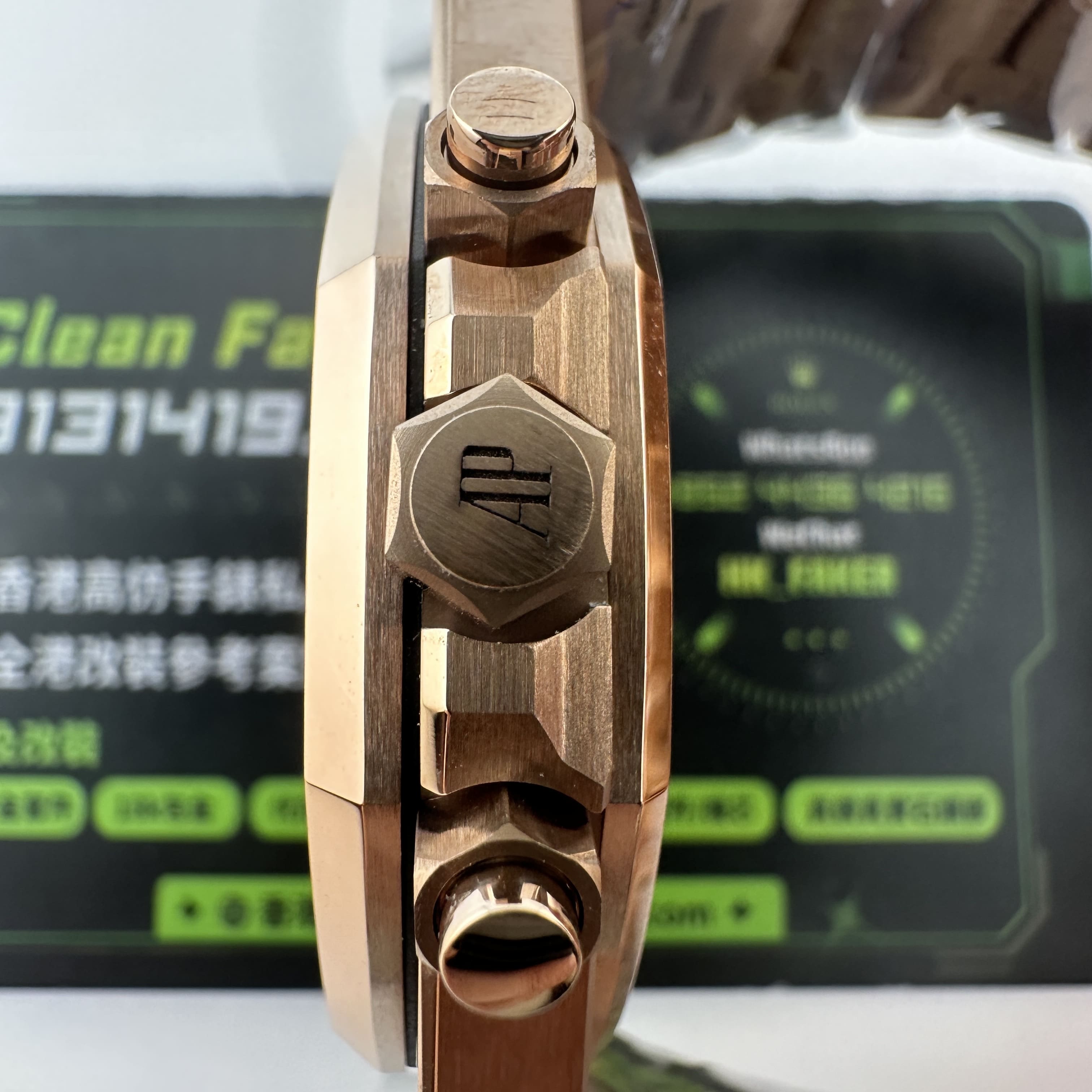 APW廠出品的高仿AP26331玫瑰金棕色盤面腕錶是高仿市面上獨家搭載一體機芯配置的版本,對比市面上眾多劣質版本種種不足情況下,APW廠愛彼手錶打造出頂級復刻版本.其中就以錶盤結構對比為例,三個"眼睛"小圈的辨識度可以通過做工辨別高品質以及低端版本.其中APW廠26331高品質象征就是三個小圈貼合角度比較近,而低端版本的三個小圈則是間隔距離是分開,因此一隻頂級AP腕錶的細節處理以及大廠製作工藝像真度單是外觀也很難做到1:1還原.