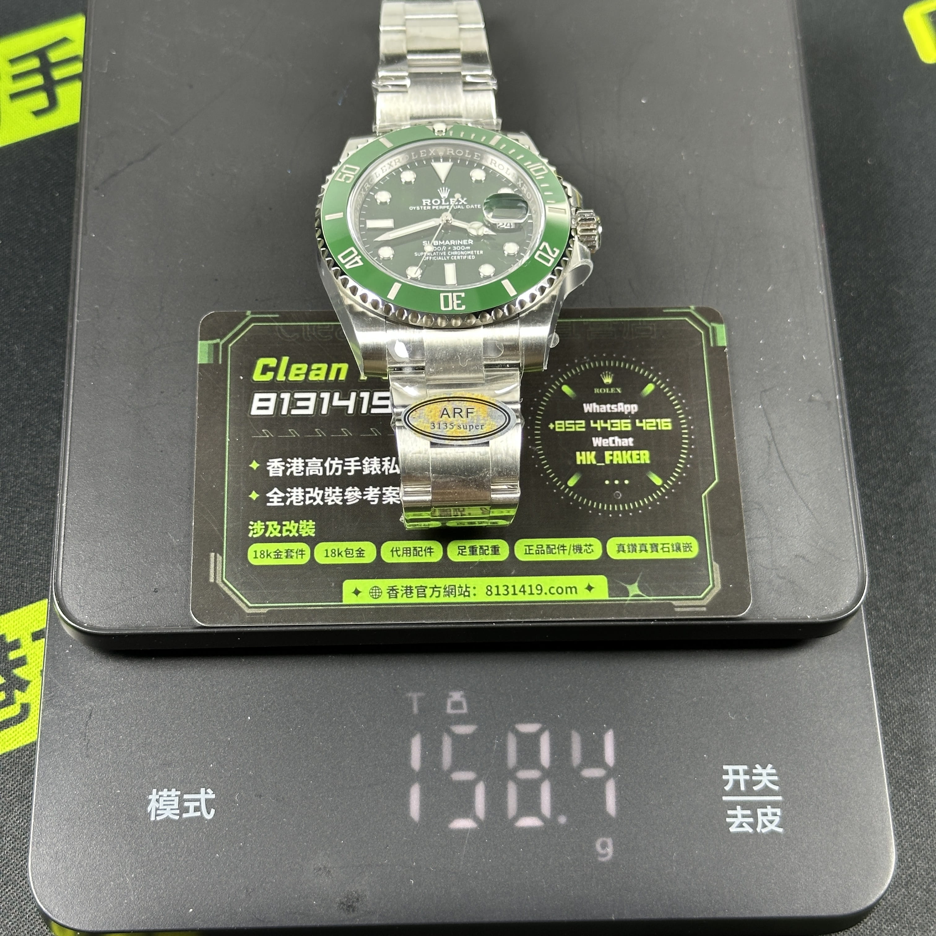 ARF廠綠水鬼對比不同角度拍攝的綠色均呈現不一樣的色澤,其次是圈口部分的綠色由於有鍍膜保護反光角度更加強烈,對比原版是符合正品圈口的構造工藝,色差部分降至最低.再者是錶盤的色澤,ARF廠116610lv完全就是以翠綠色的色板進行調色而成,並且擁有放射紋處理狀態,不同燈光以及不同角度都是不一樣的綠色.色差方面接近原版98%左右.ARF廠高仿勞力士綠水鬼則是使用了一體3135機芯.
