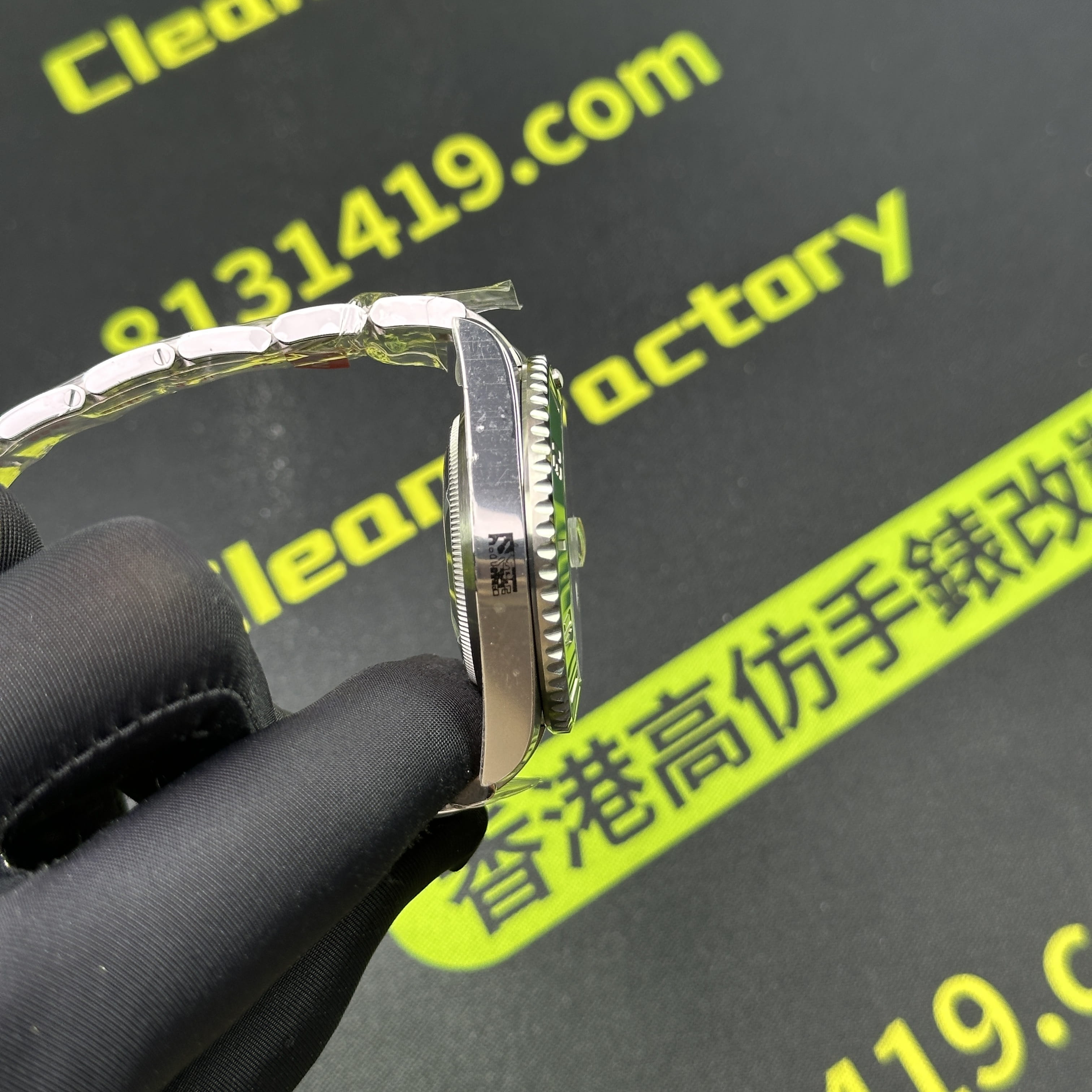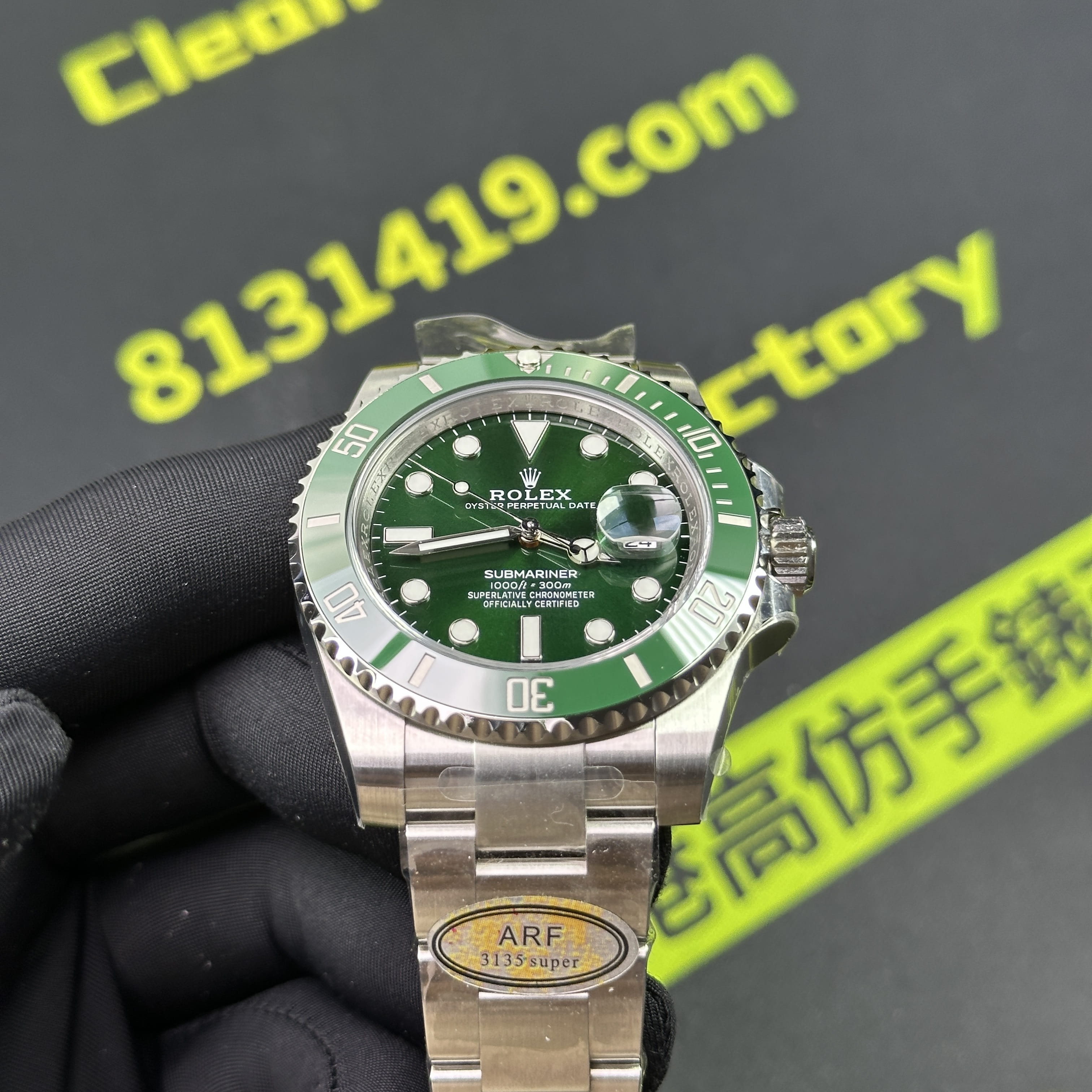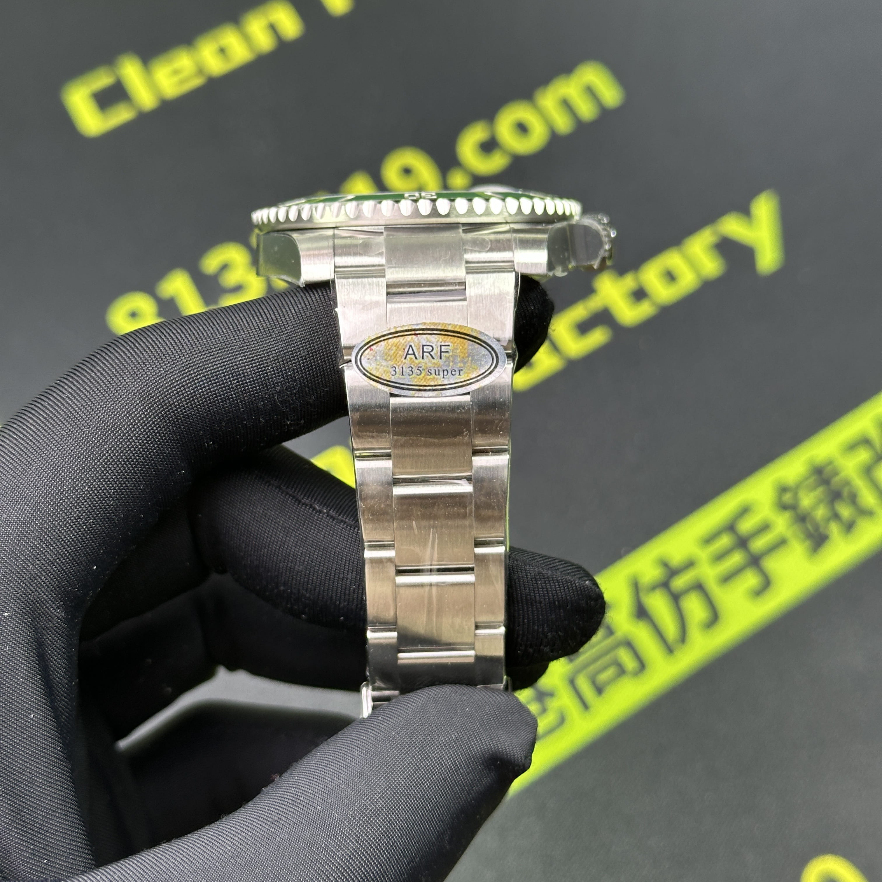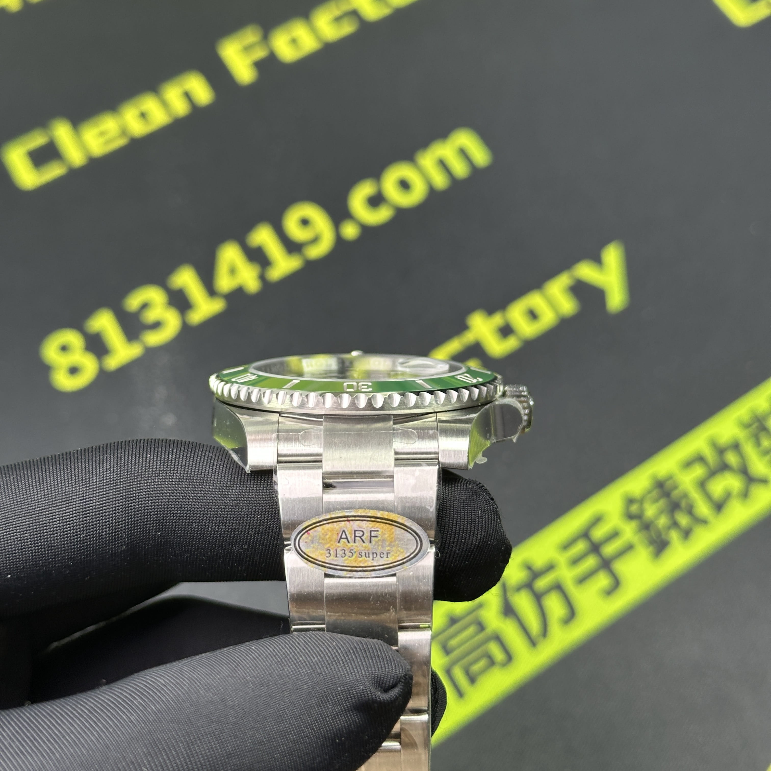 ARF廠官網推出的高仿勞力士綠水鬼116610lv-0002二代版本,整錶尺寸40mm,綠水鬼非常經典的是錶盤與圈口呈現的翠綠色,通過產品實拍可以了解到ARF廠綠水鬼二代版本的翠綠色非常鮮艷,並非暗綠色,圈口的反光色澤也是相對完善.可單向旋轉的圈口,聲音清脆,沒有卡頓的缺陷,夜明珠12點標準位置構造.錶盤內部依舊是三大指針結構,搭配放大日曆窗口,印刷白色立體字面,整體的視覺感以及做工完整度非常高.