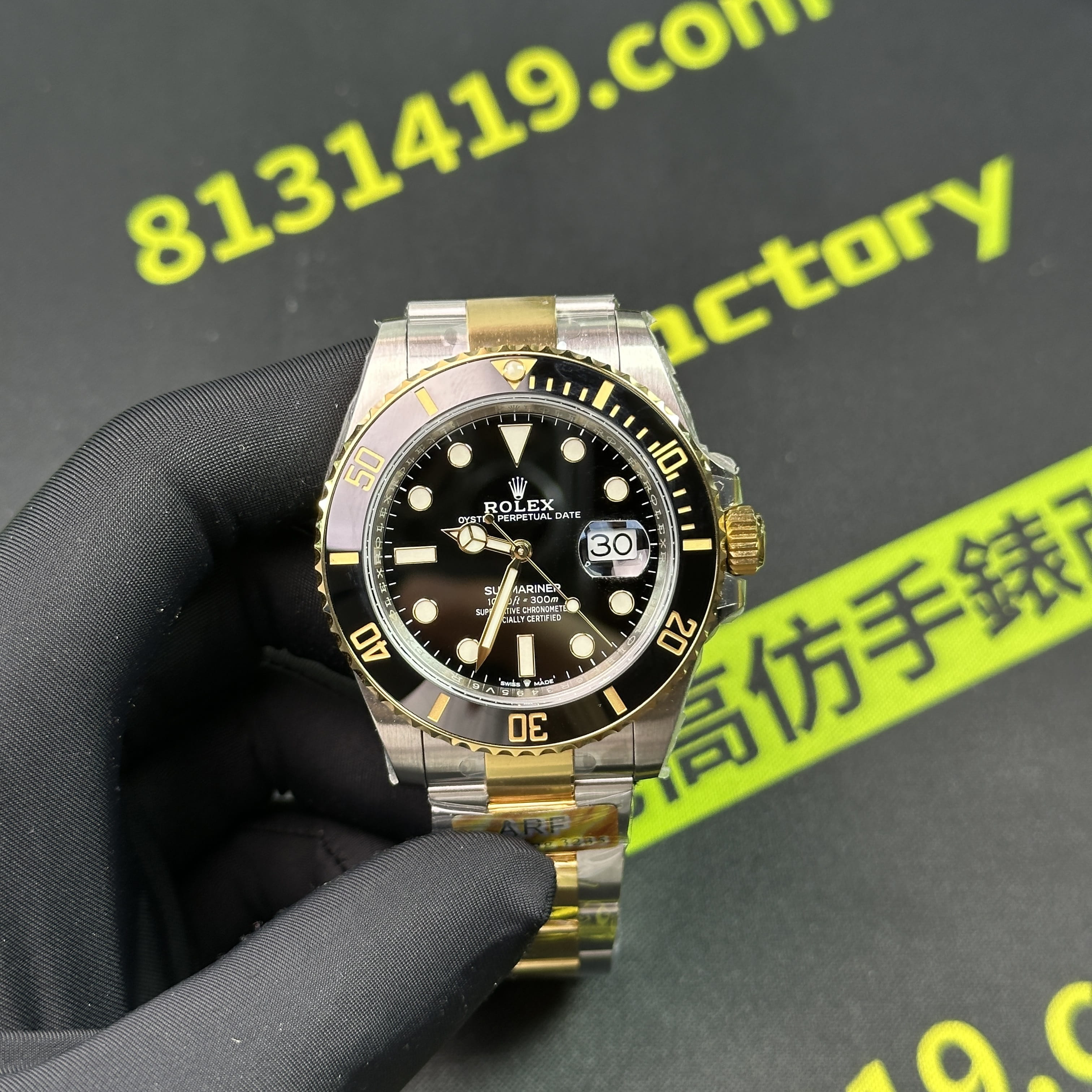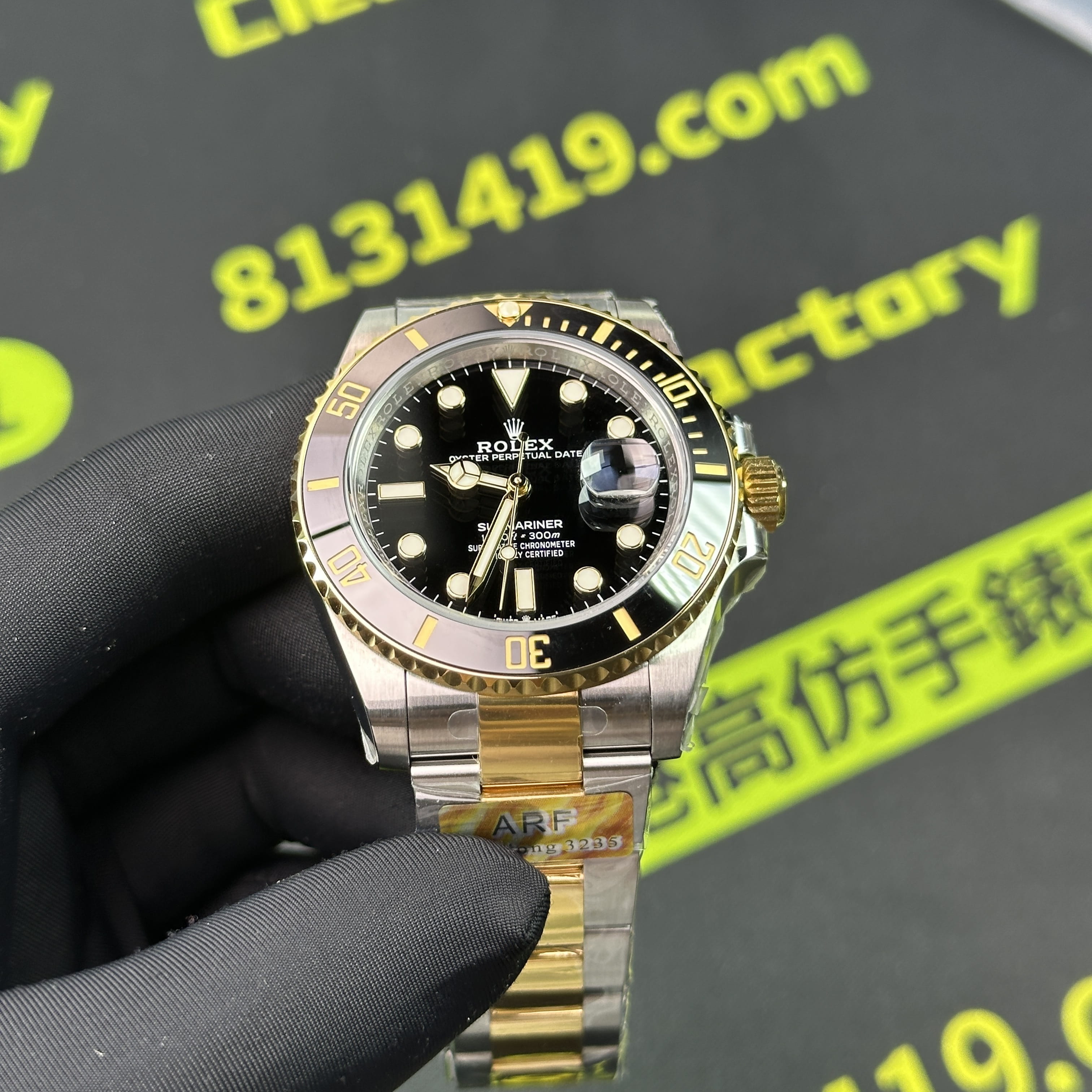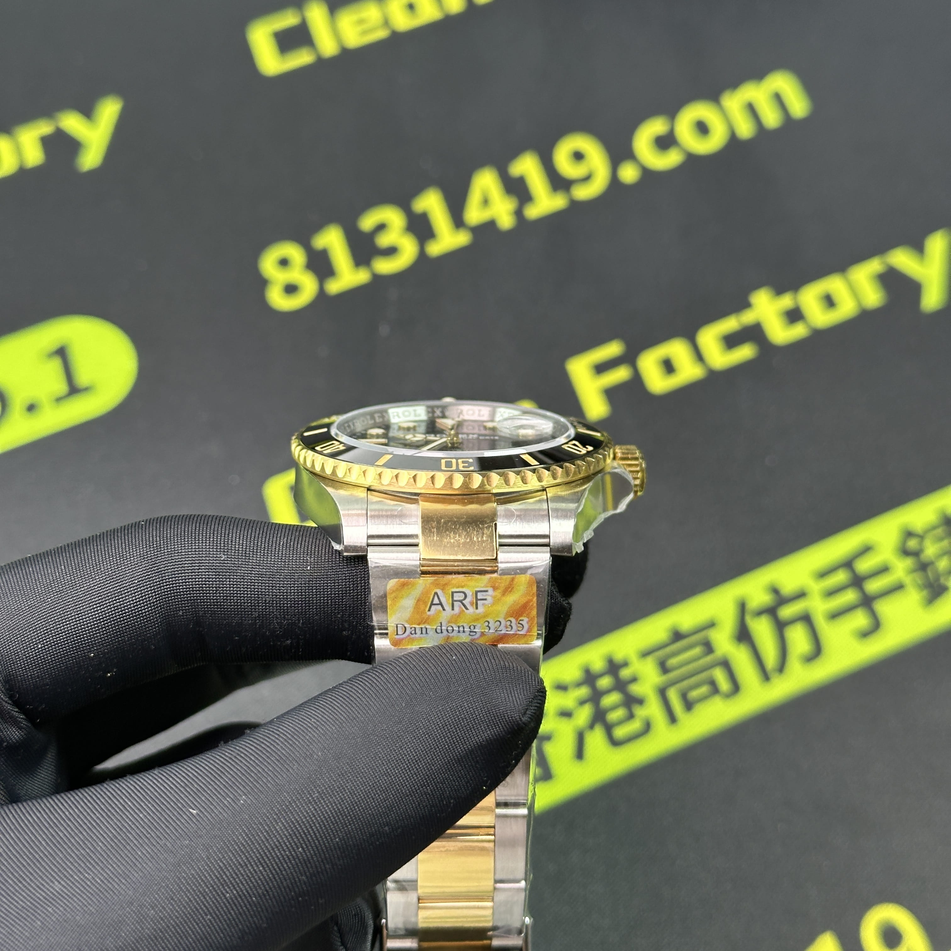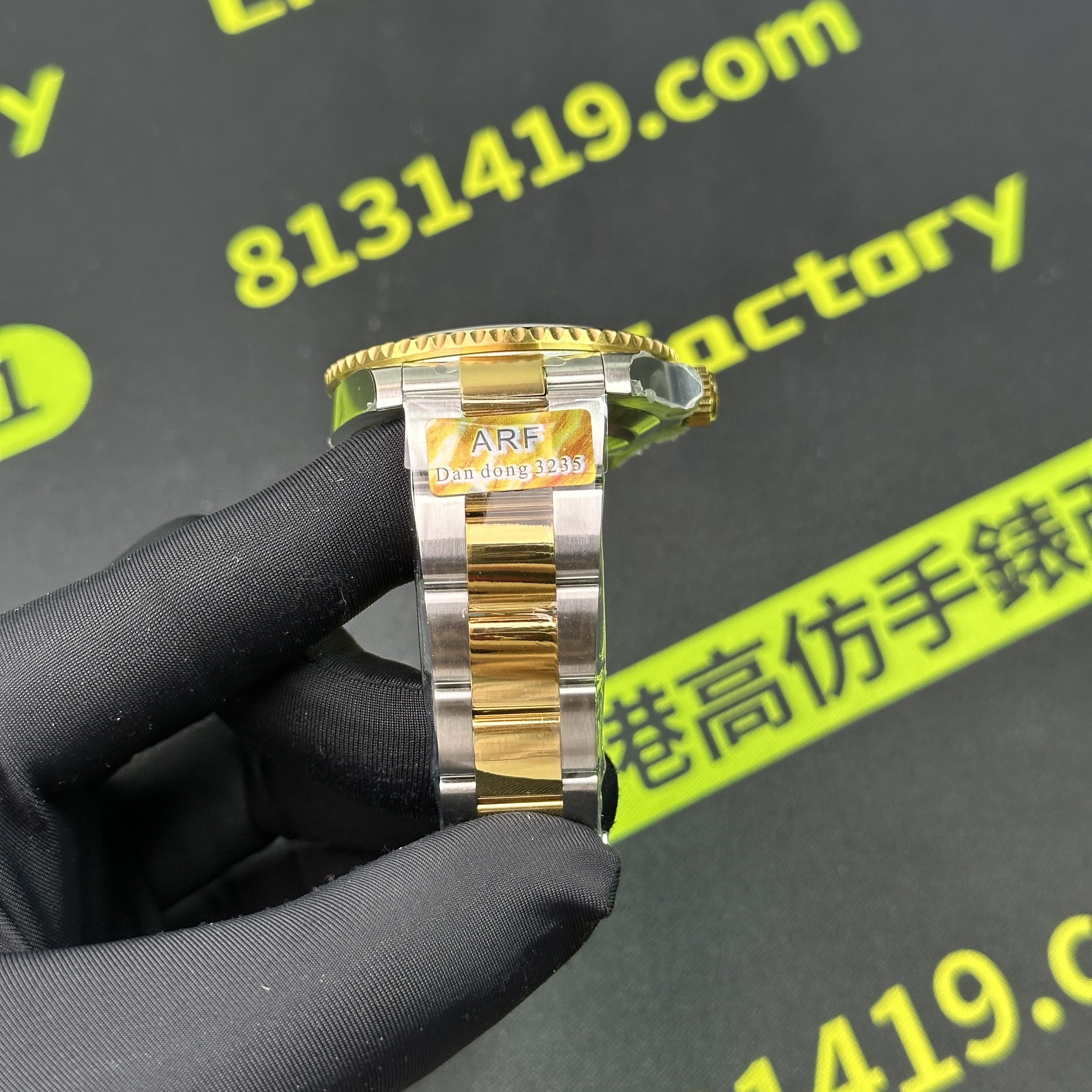這一隻ARF廠間金黑水鬼為例,在工藝製作層面上,ARF廠將未組裝成型的圈口,錶帶,錶兒,錶殼都是使用CNC精密數據打造而成,純手工打磨拉絲製作,錶殼線條標準,倒角的弧度正確.錶帶在佩戴過程中沒有異響,銜接角度完美,包括PVD電鍍工藝也不會出現氧化,掉色的缺陷,ARF廠水鬼間金41mm絕對高品質標準.此次ARF廠出品的常規重量款式和配重款式都是搭載了丹東3235機芯,是目前3235機芯最標準且穩定性最高的機芯.續航動力高達72小時.