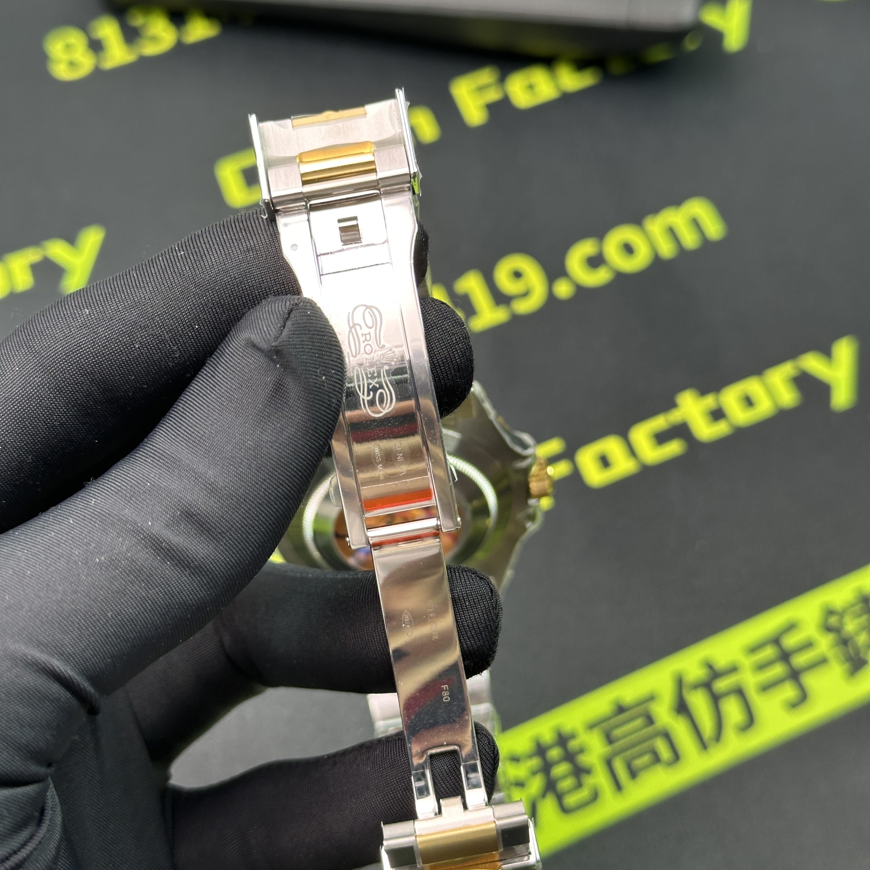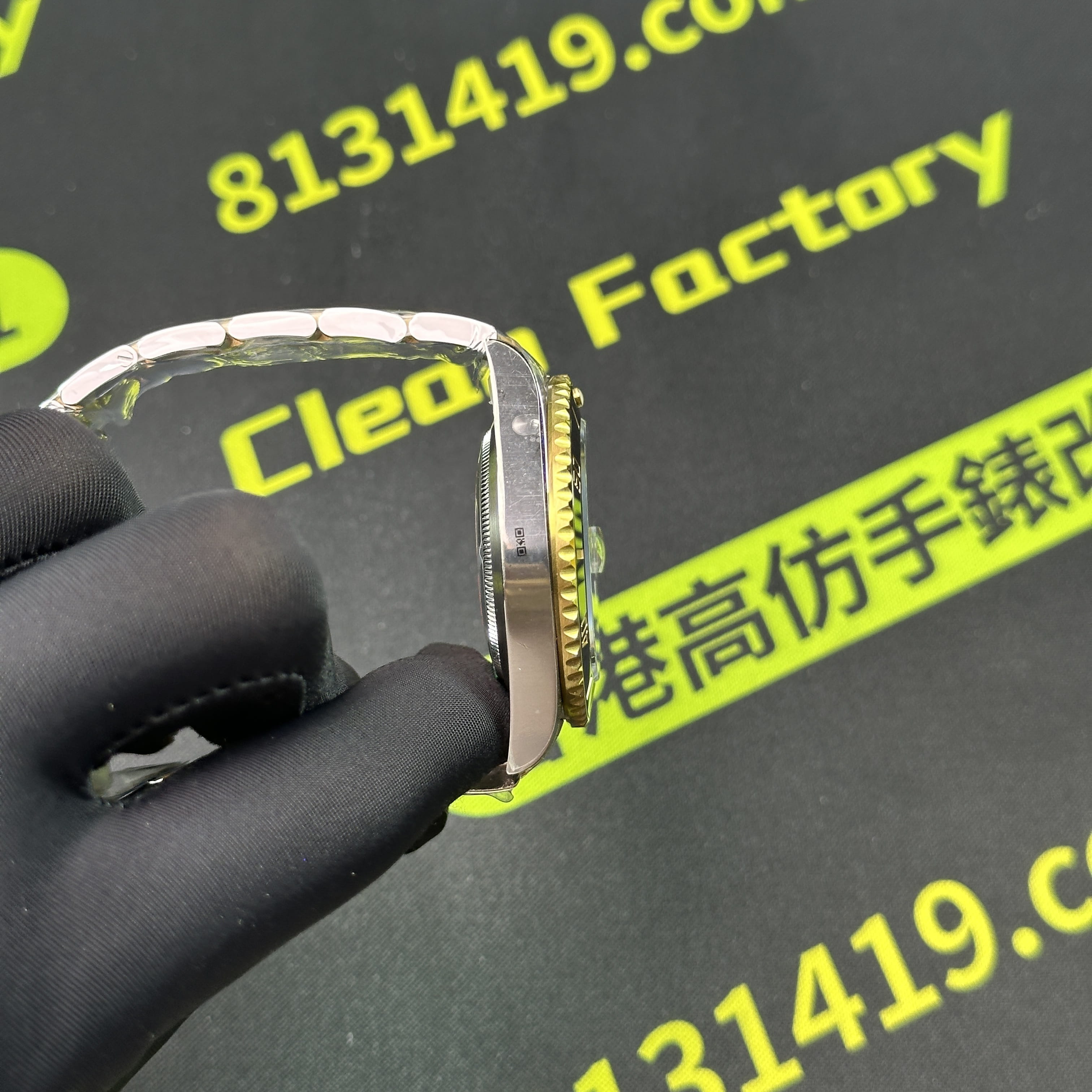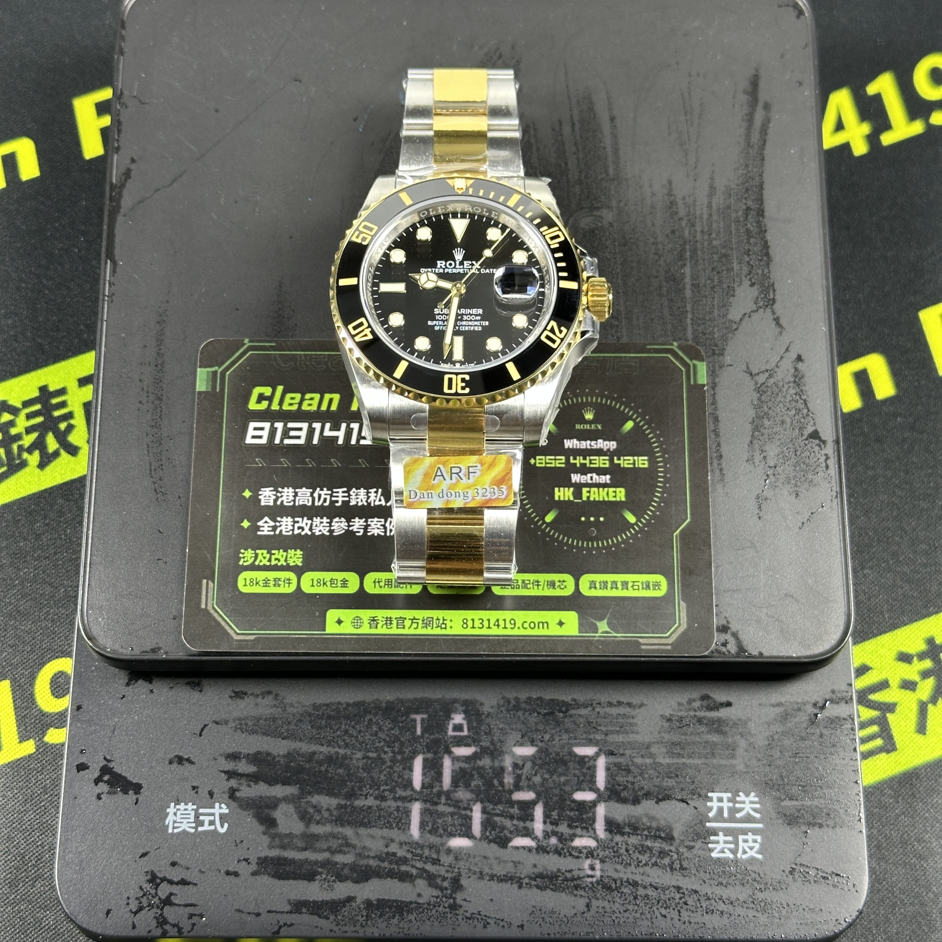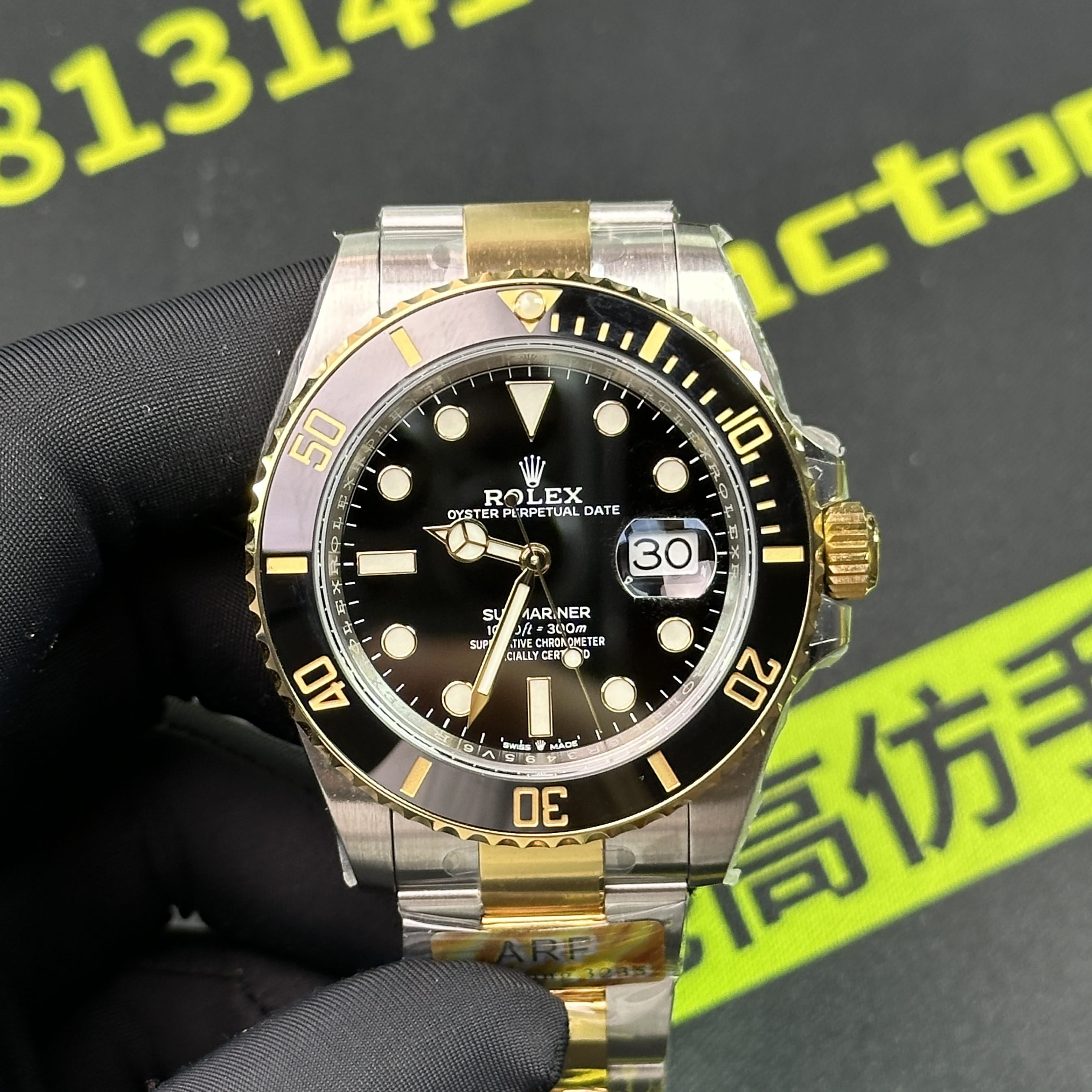 這一隻ARF廠間金黑水鬼為例,在工藝製作層面上,ARF廠將未組裝成型的圈口,錶帶,錶兒,錶殼都是使用CNC精密數據打造而成,純手工打磨拉絲製作,錶殼線條標準,倒角的弧度正確.錶帶在佩戴過程中沒有異響,銜接角度完美,包括PVD電鍍工藝也不會出現氧化,掉色的缺陷,ARF廠水鬼間金41mm絕對高品質標準.此次ARF廠出品的常規重量款式和配重款式都是搭載了丹東3235機芯,是目前3235機芯最標準且穩定性最高的機芯.續航動力高達72小時.