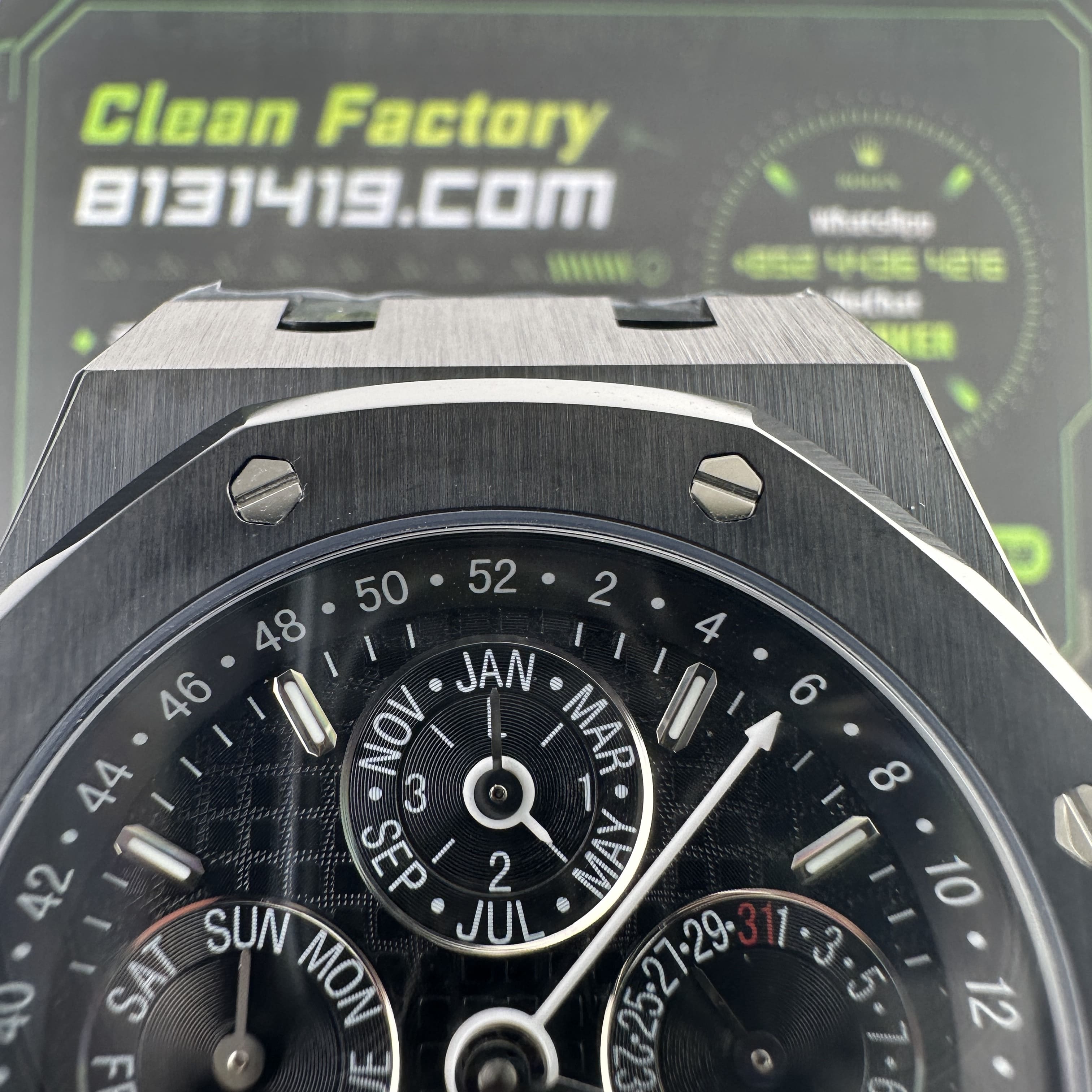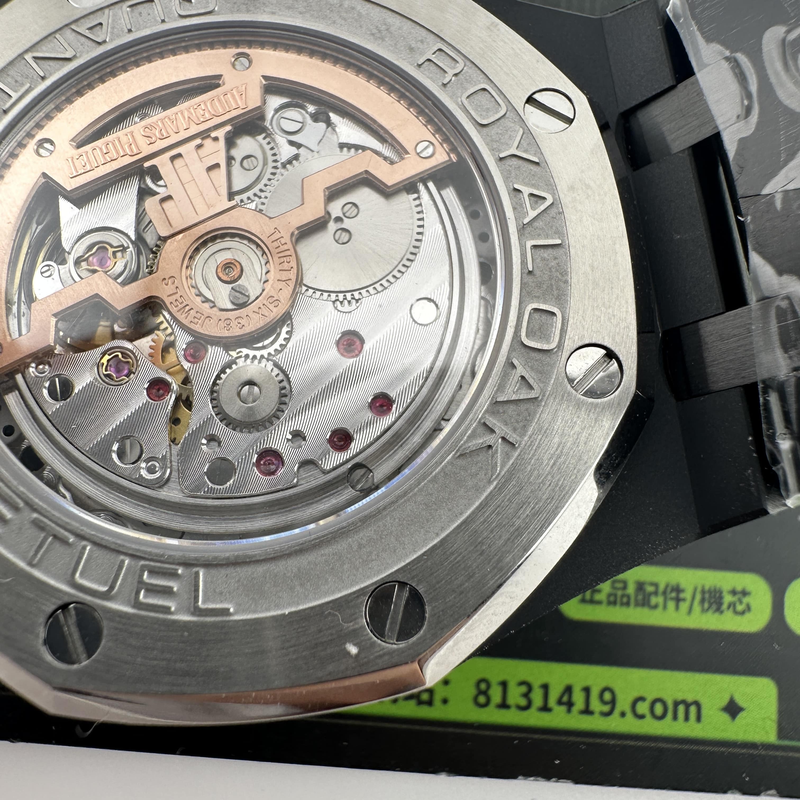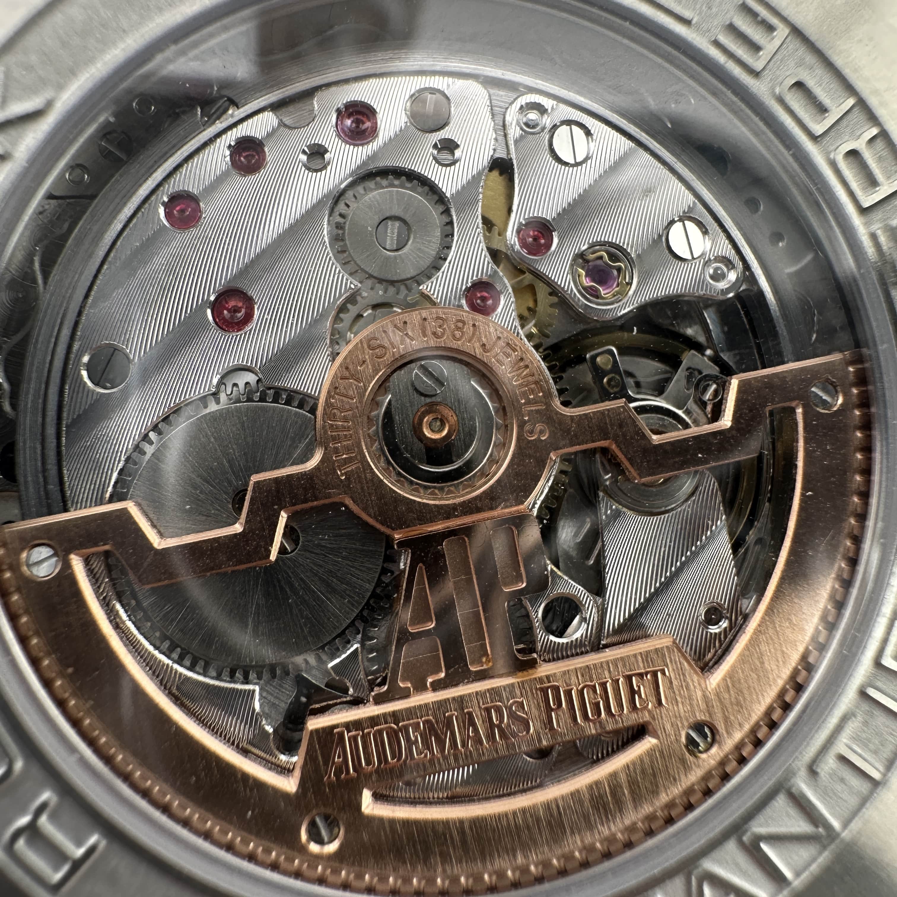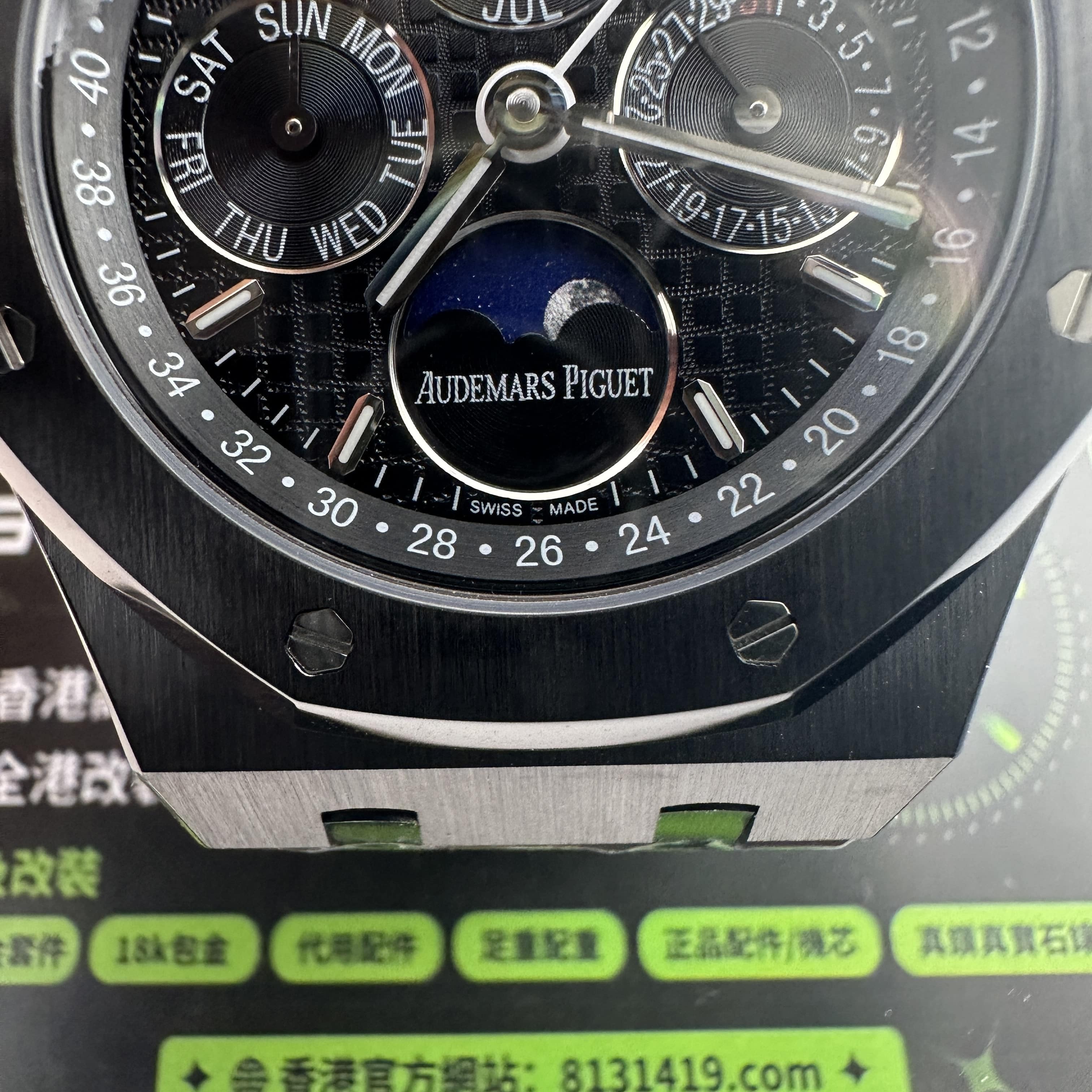 值得關注的是整個錶盤帶來的"舒適感",清晰易讀的局部設計,盤面4個小圈設定的位置與原版相同,部分廠家出品的劣質版本4個小圈功能分佈比較擴,並不是貼合角度,因此肉眼角度上即可分別一眼假.其次是印刷塗層的阿拉伯數字以及英文字面比較多,工藝層面上已經達到及格,每一組數字和分鐘軌道不亂且清晰.月相部分對比原版還原度百分之90左右,月球的影子部分做的還是比較細節.BBS廠26579以及26574都是搭載了9015改原裝正品5134機芯,並不是一體機芯,但可以顯示功能百分百還原的主要原因是對機芯進行調校以及改裝