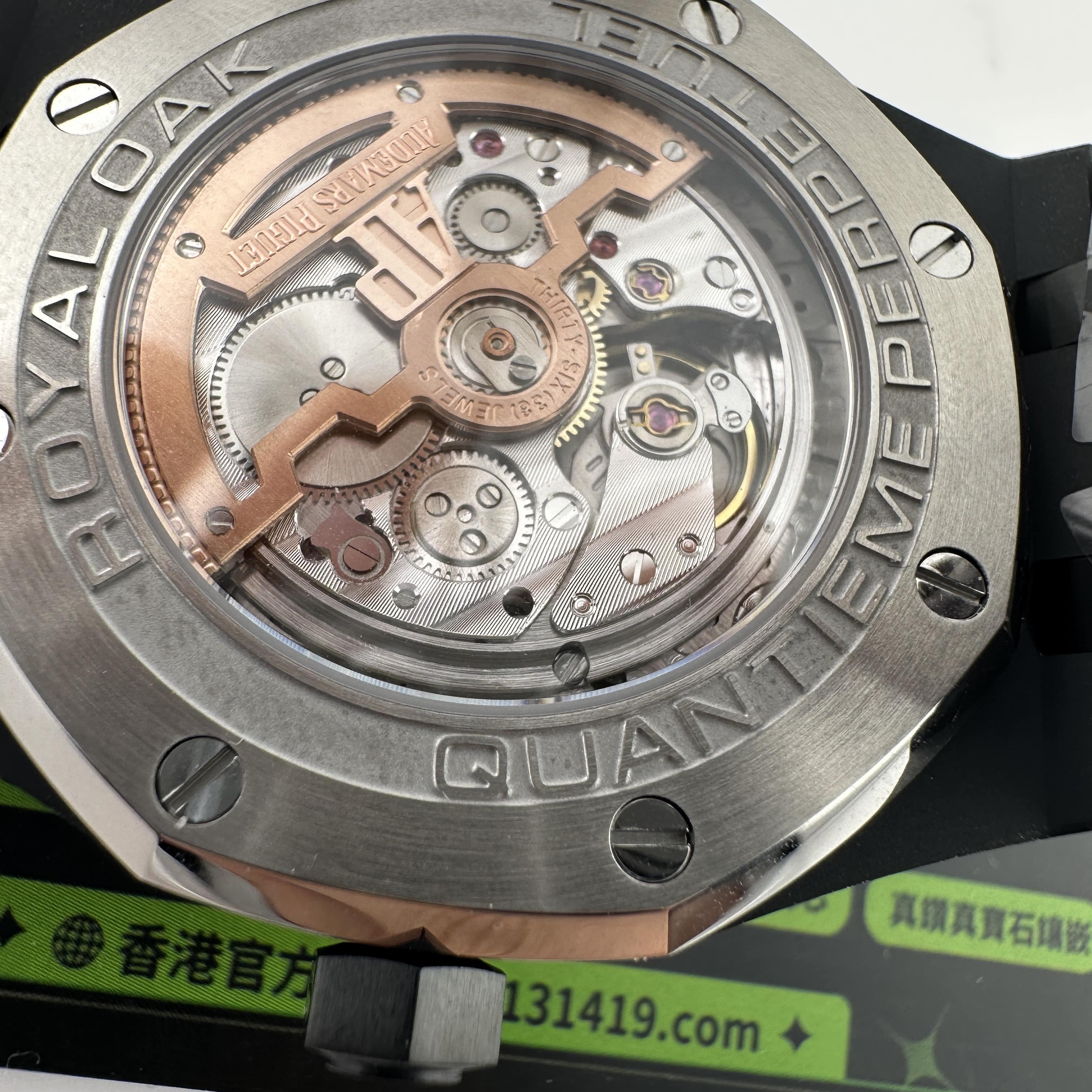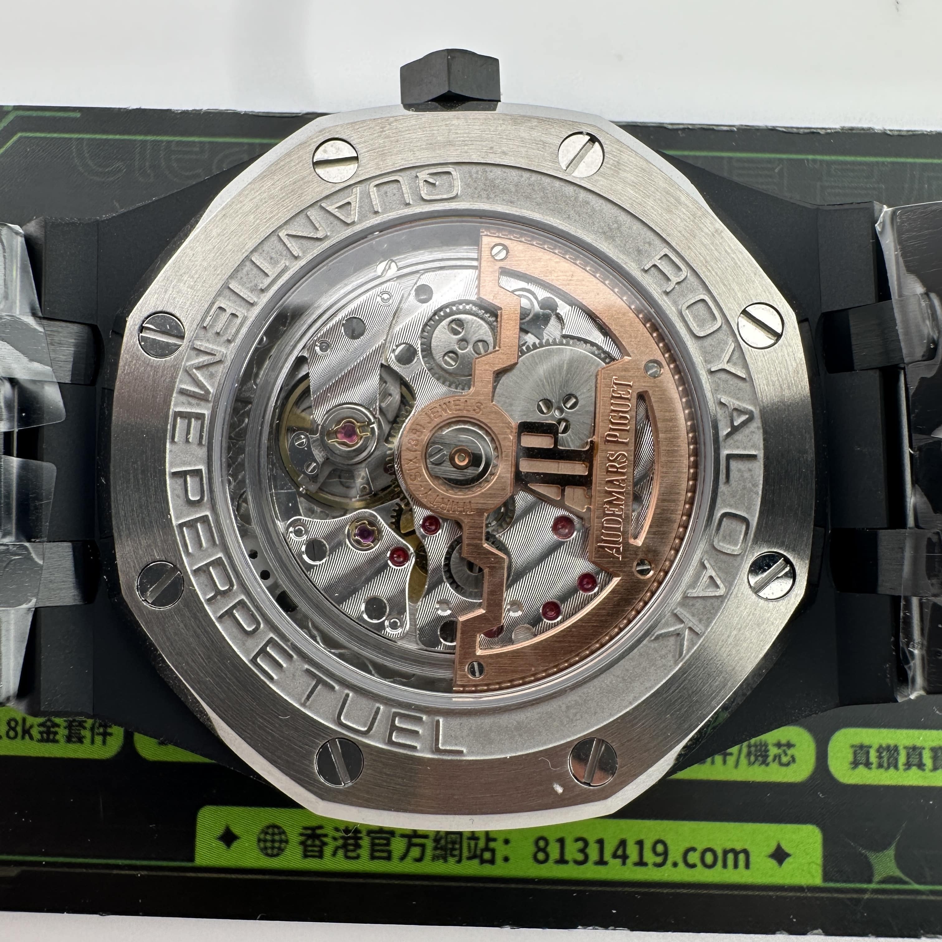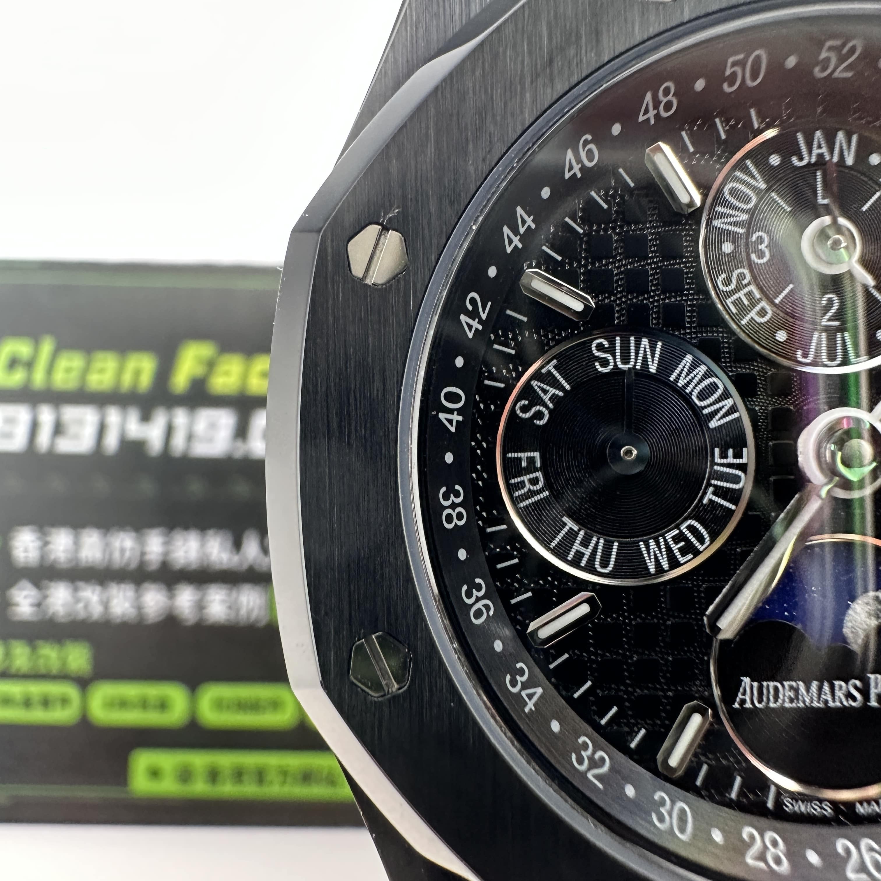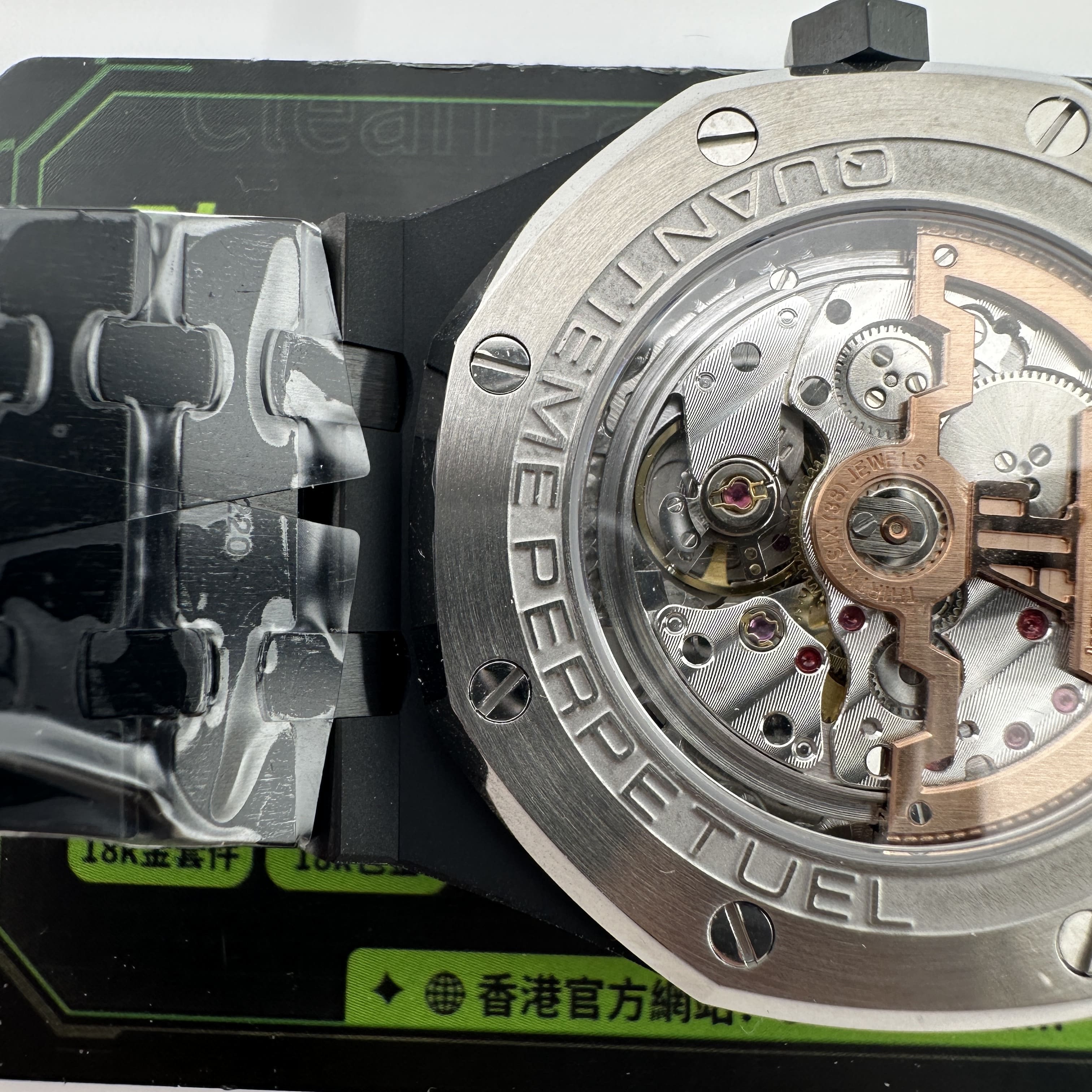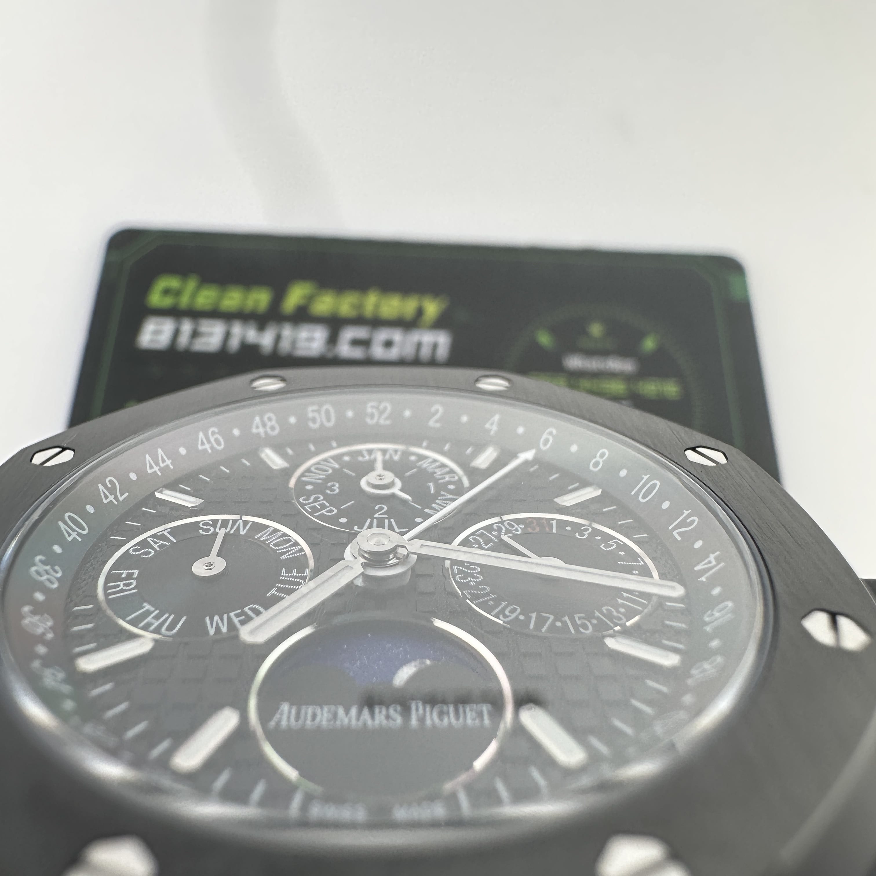 值得關注的是整個錶盤帶來的"舒適感",清晰易讀的局部設計,盤面4個小圈設定的位置與原版相同,部分廠家出品的劣質版本4個小圈功能分佈比較擴,並不是貼合角度,因此肉眼角度上即可分別一眼假.其次是印刷塗層的阿拉伯數字以及英文字面比較多,工藝層面上已經達到及格,每一組數字和分鐘軌道不亂且清晰.月相部分對比原版還原度百分之90左右,月球的影子部分做的還是比較細節.BBS廠26579以及26574都是搭載了9015改原裝正品5134機芯,並不是一體機芯,但可以顯示功能百分百還原的主要原因是對機芯進行調校以及改裝