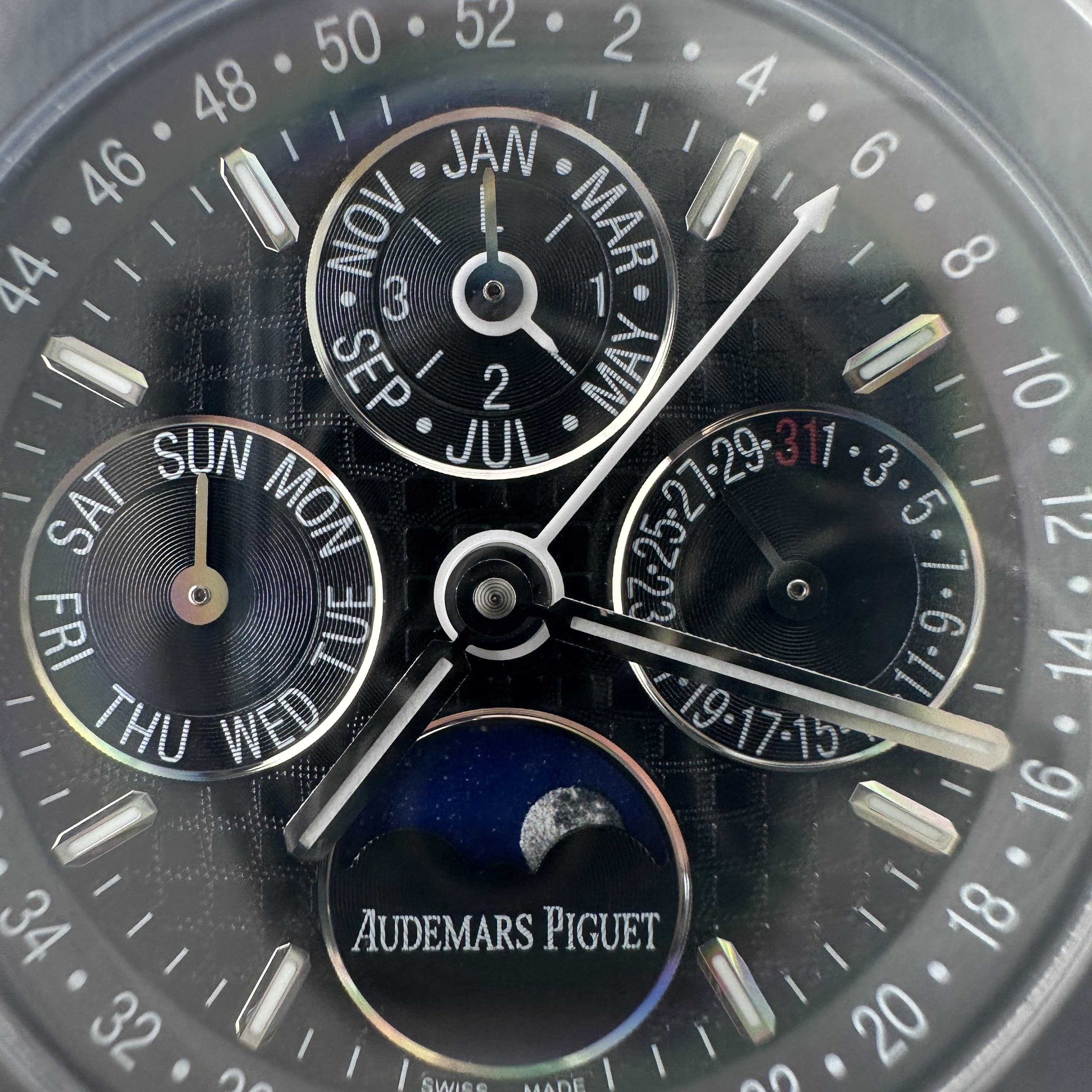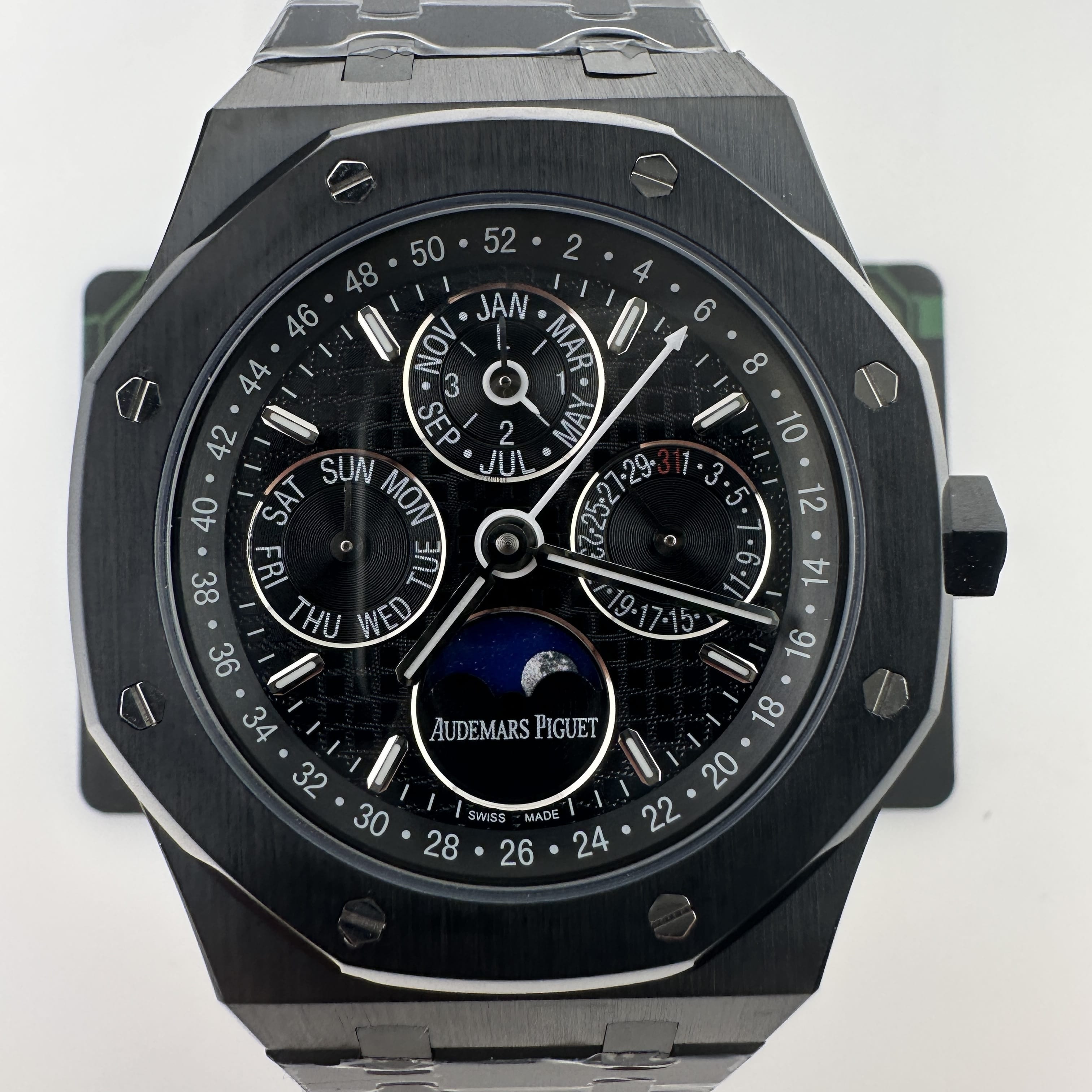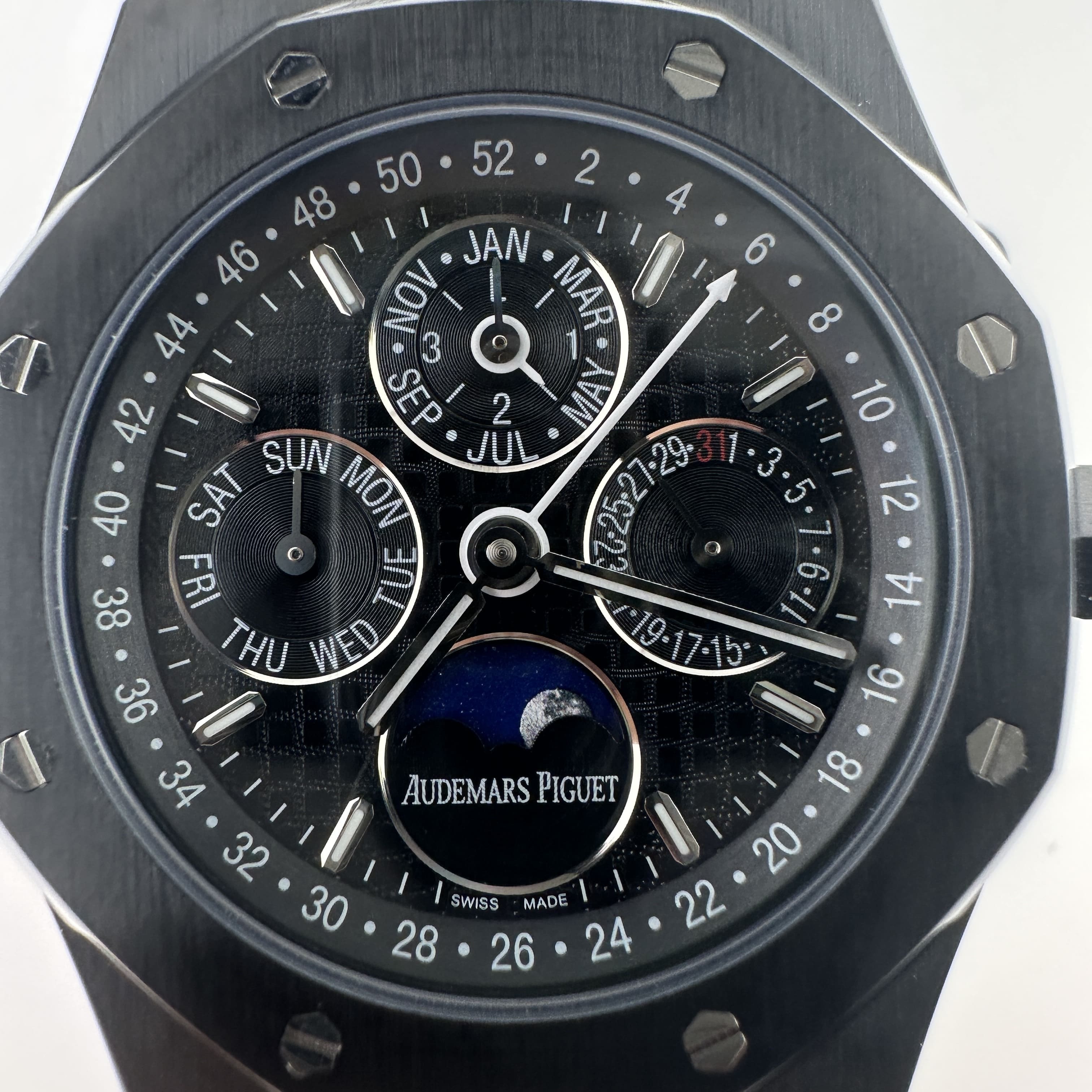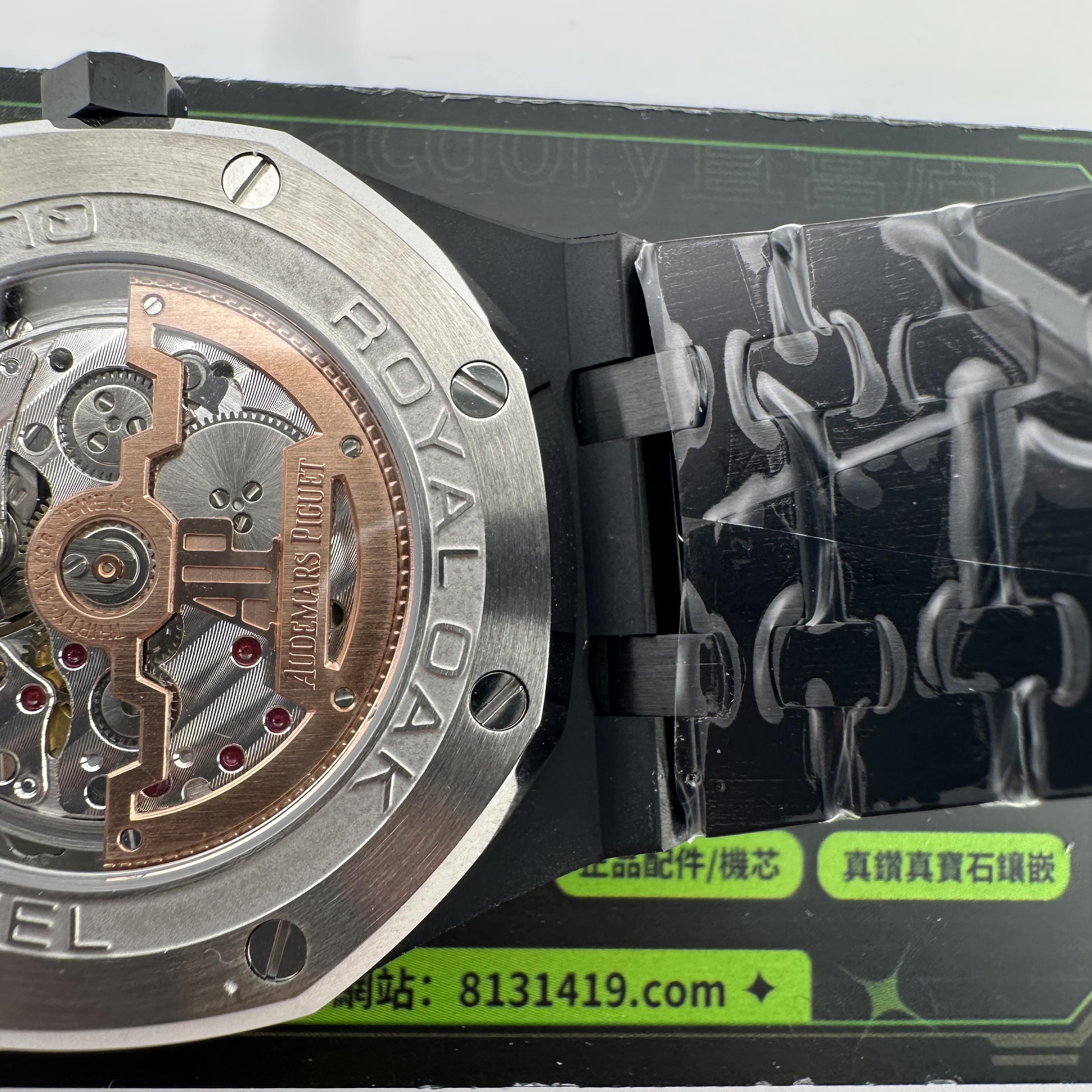值得關注的是整個錶盤帶來的"舒適感",清晰易讀的局部設計,盤面4個小圈設定的位置與原版相同,部分廠家出品的劣質版本4個小圈功能分佈比較擴,並不是貼合角度,因此肉眼角度上即可分別一眼假.其次是印刷塗層的阿拉伯數字以及英文字面比較多,工藝層面上已經達到及格,每一組數字和分鐘軌道不亂且清晰.月相部分對比原版還原度百分之90左右,月球的影子部分做的還是比較細節.BBS廠26579以及26574都是搭載了9015改原裝正品5134機芯,並不是一體機芯,但可以顯示功能百分百還原的主要原因是對機芯進行調校以及改裝