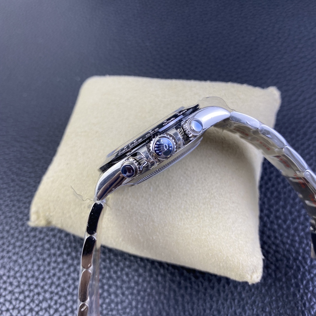 然後是三個計時小圈,銀色的金屬包邊,之前舊版本的話這三個計時小圈放射紋不會像現在那麼足,展現的效果也沒有現在好.錶盤內部的升級精鋼BT廠計時修正,整體的質感無論是肉眼觀看還是上手的感覺完全不一樣,得到了升華! 玻璃鏡片是藍水晶高透,都是屬於標配的了.採用AR廠代工廠鋼帶,錶帶的話大部分都是選用AR廠的,畢竟可以節省研發經費,AR廠的錶帶也是最好的.錶扣部分的皇冠LOGO打磨拋光,不會劃手,內部的刻度字樣清晰,做的也比較深,和其他廠都是不一樣的.最後能夠完全出市面上售賣的標準就是必須搭載4130機芯,在計時功能方面完全對應原版狀態.