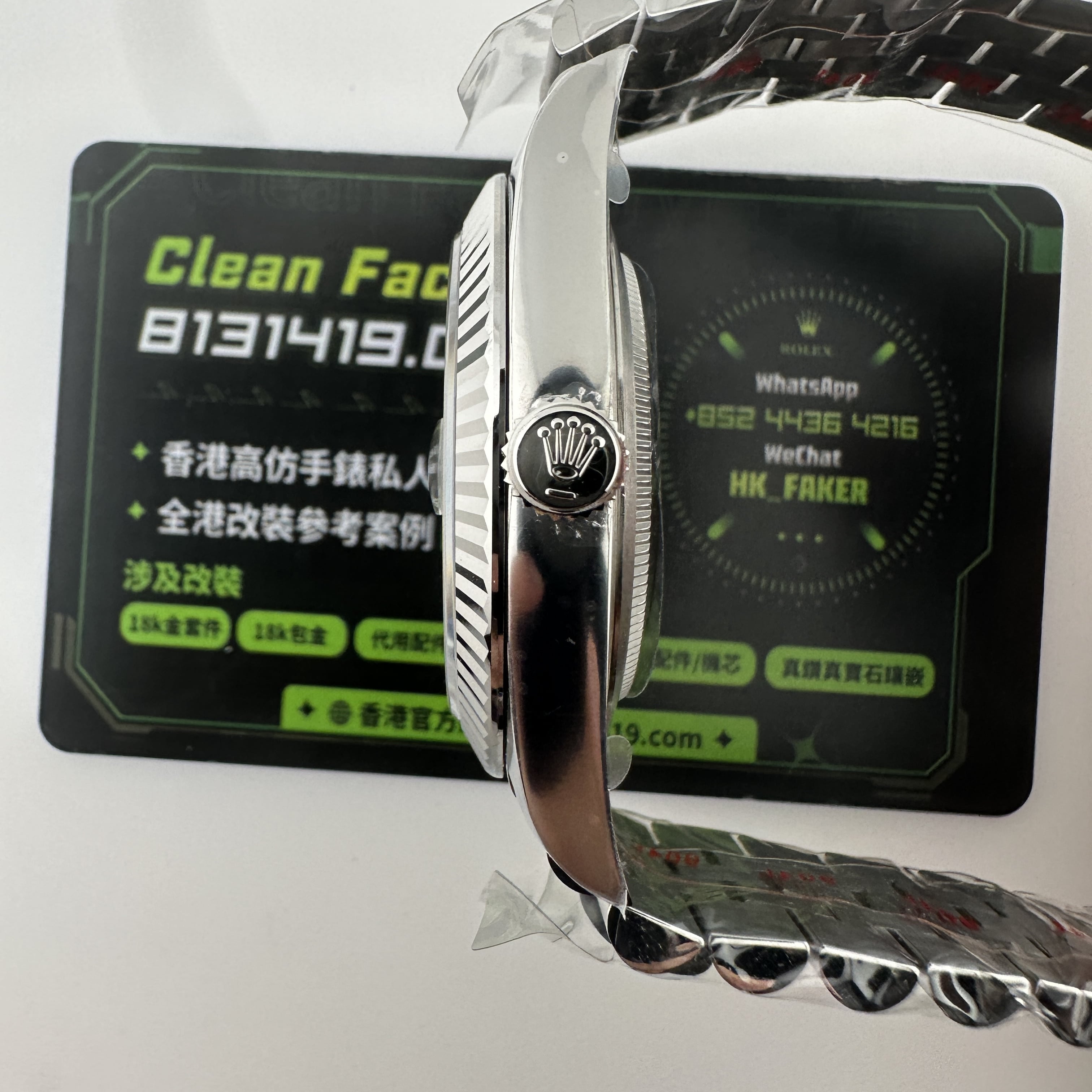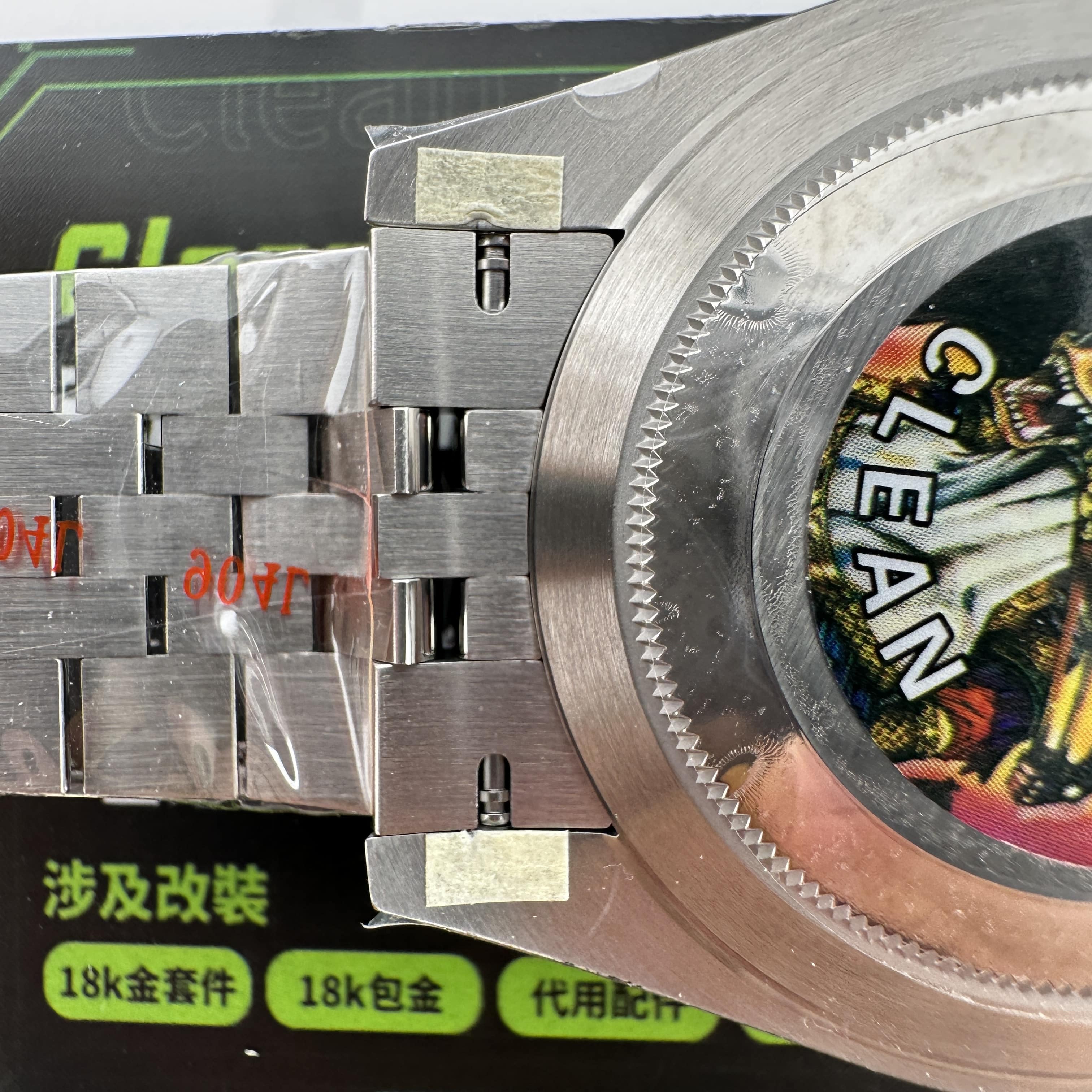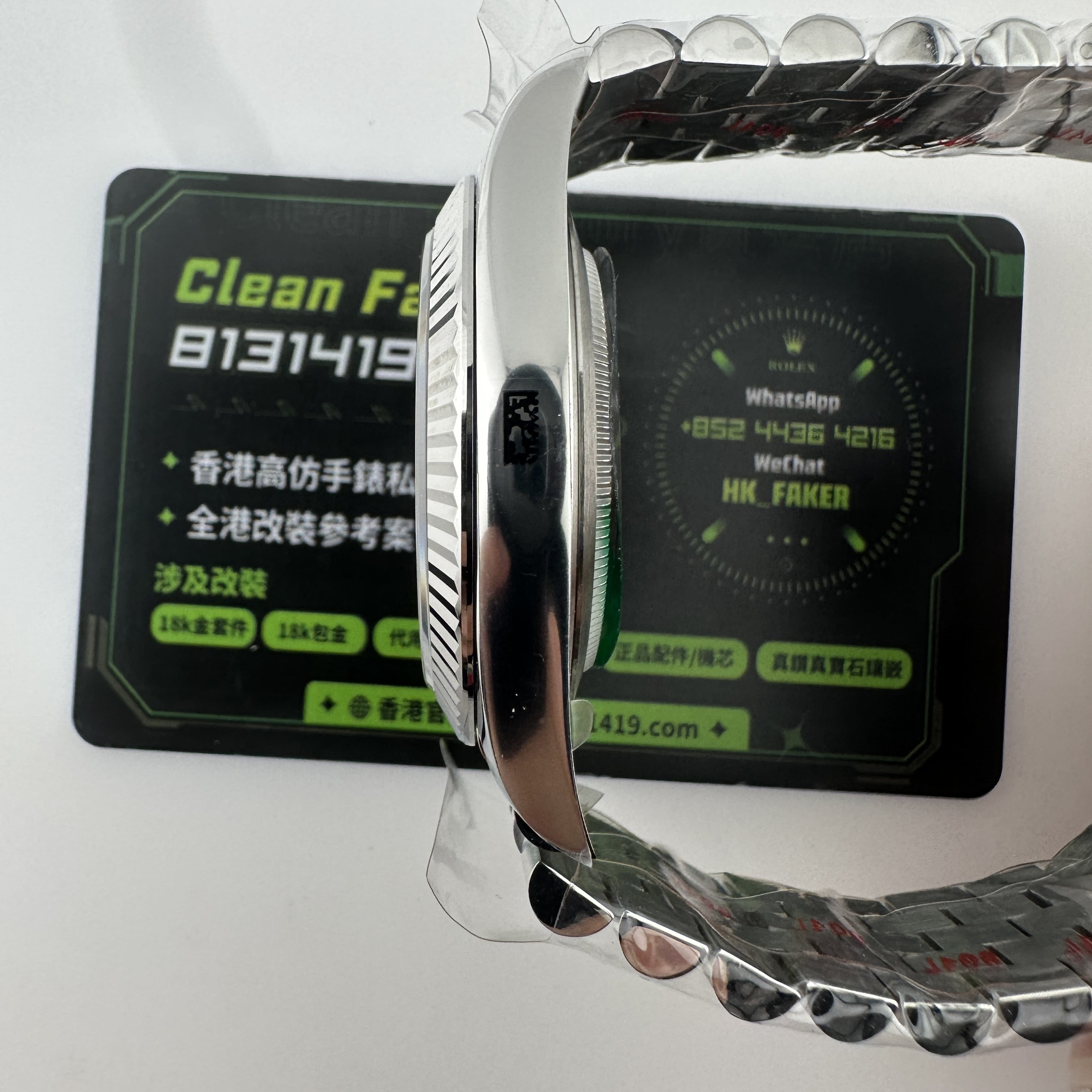 Clean廠全新一代勞力士日誌系列m126334-0028,被諸多錶友俗稱的薄荷綠日誌,整錶使用904L精鋼材質打造,與原裝正品一致的材質.狗牙尺圈口正品所使用到的是白金材質,而Clean廠日誌則是通過PVD電鍍工藝達到與原版一致的白金色值.再經過打磨拋光後,整體的質感完全可以對版正品白金圈口.綠面的錶盤調色經過比對正品達到無限接近正品的色值盤面,包括放射紋路所體現的暗光與亮光之間存在鮮明對比.內影圈部分的細節,每一個字體工整,特別是勞力士皇冠LOGO的刻度完全是對準了6點鐘方位.