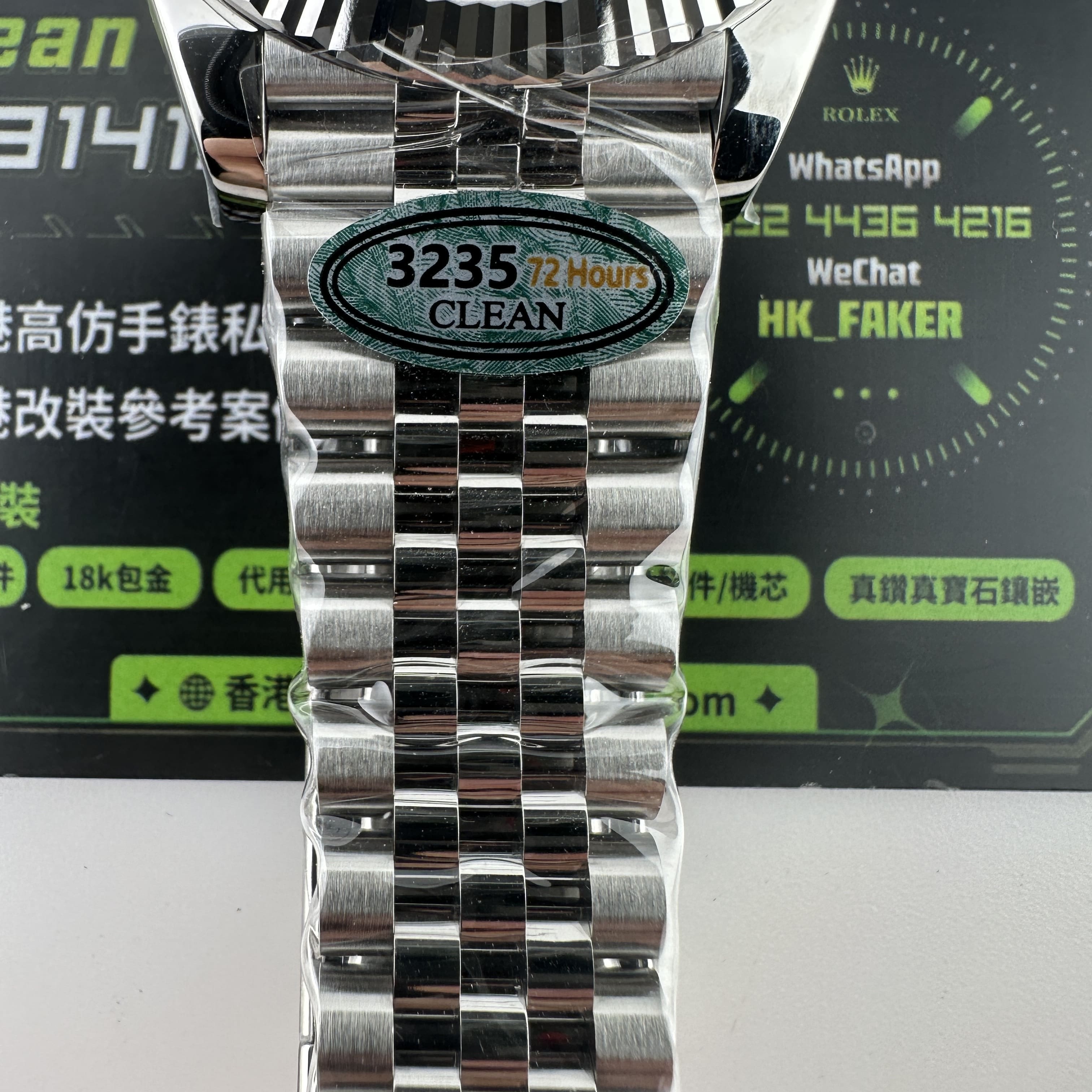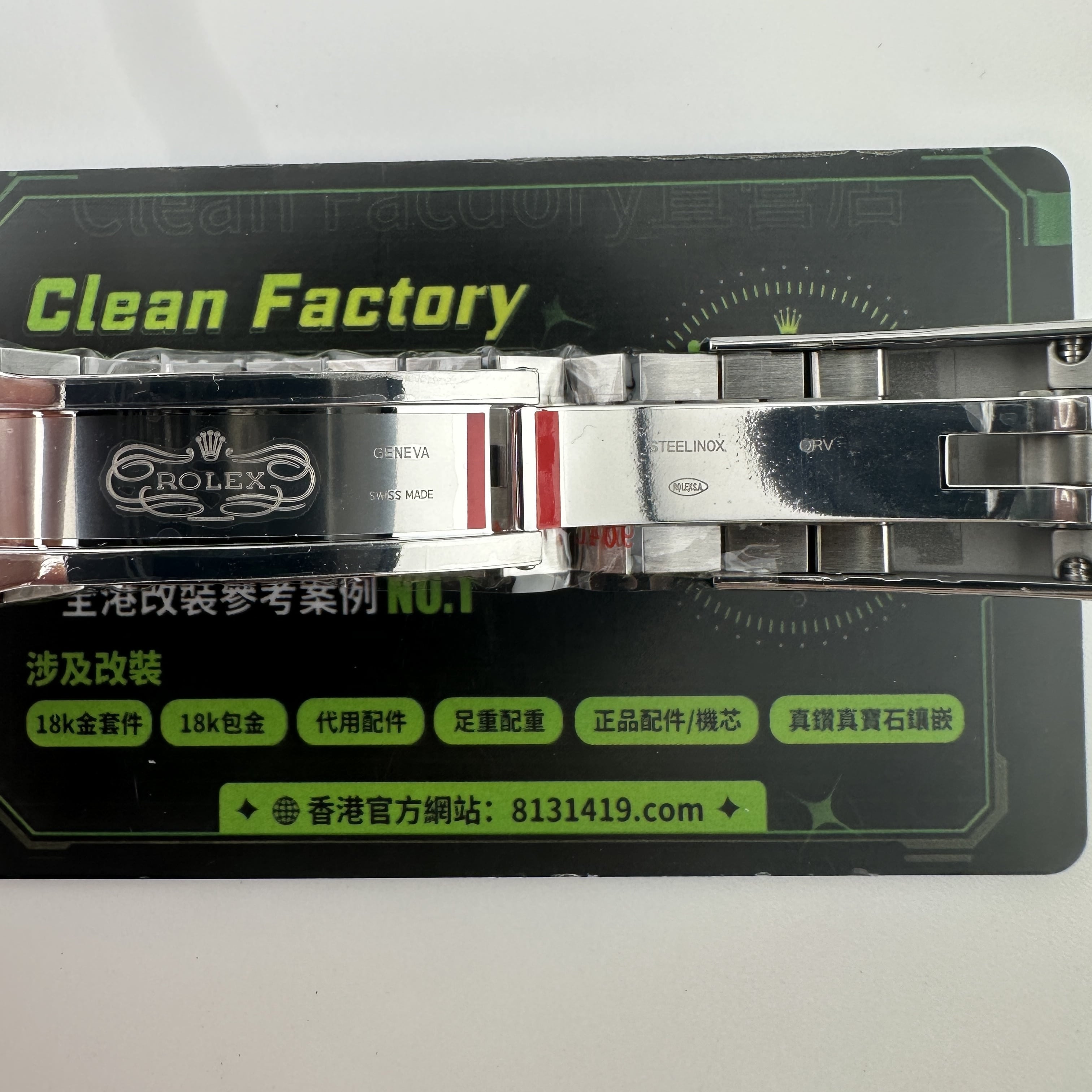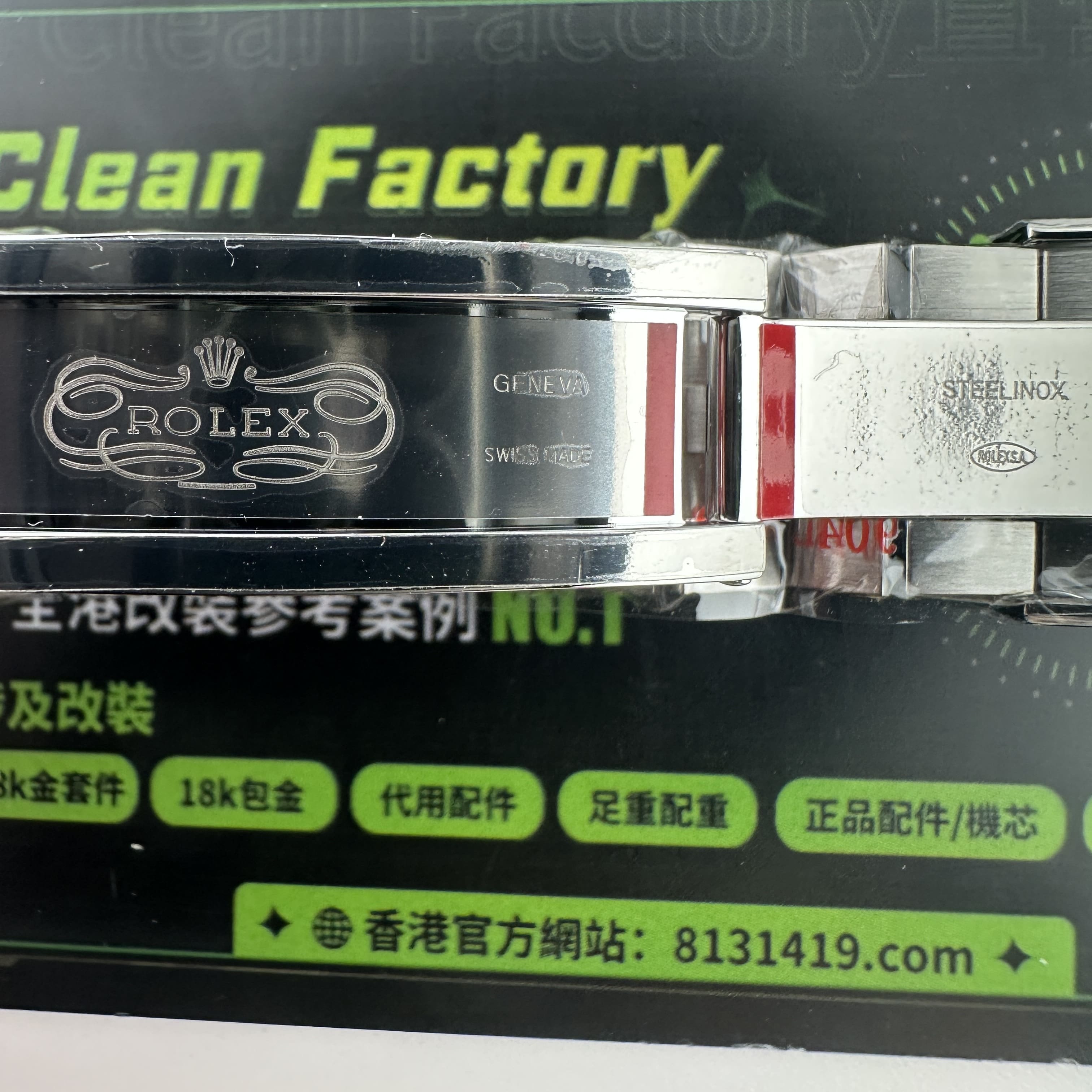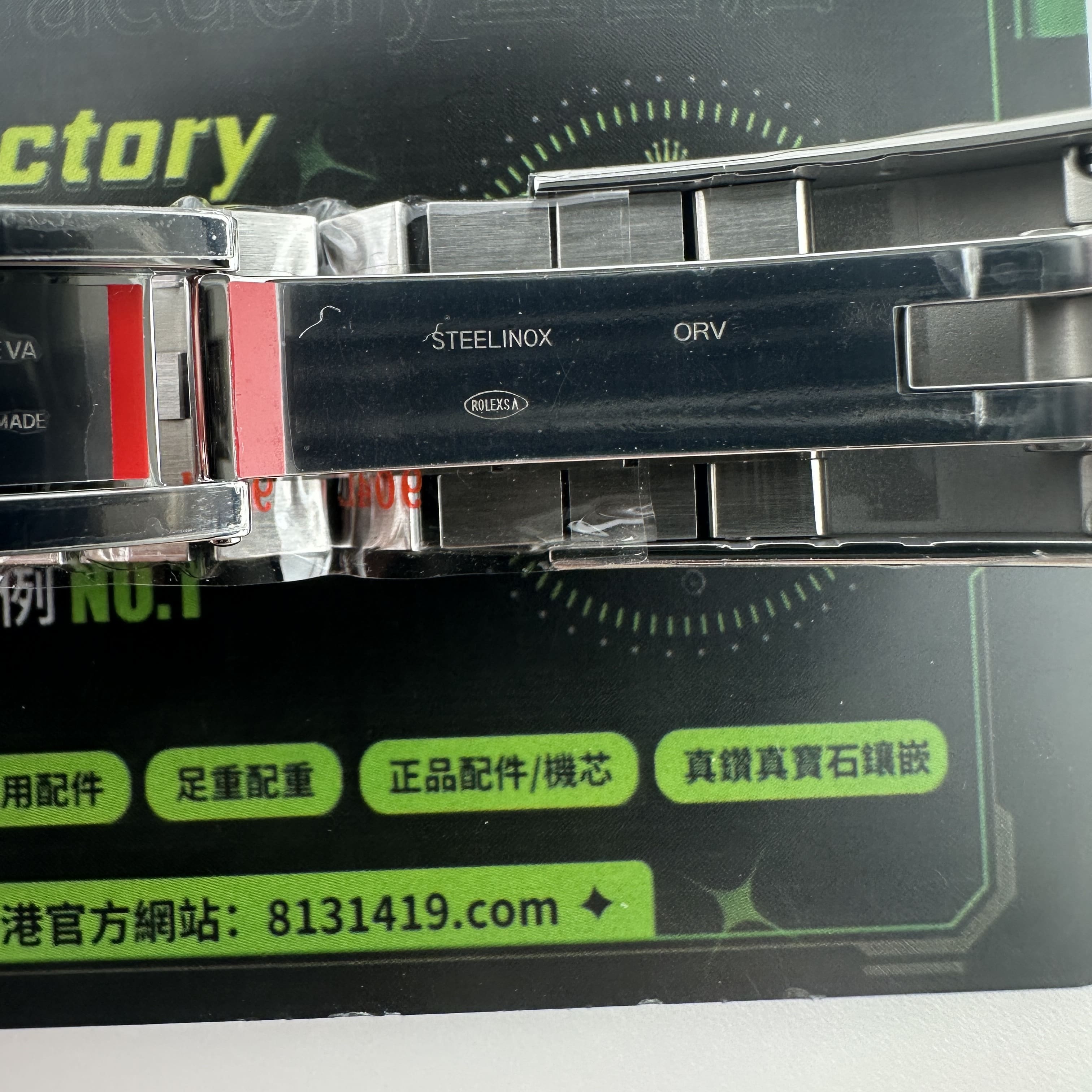 刻度條丁與指針部分的夜光採用瑞士進口熒光劑填充,所呈現的夜光效果是介質顆粒狀,並非普通的夜光色值.日曆部分對比過市面上其他廠家出品,唯一做到與正品對版的日曆阿拉伯數字面.經典五珠鏈錶帶C廠日誌選用了AR廠代用錶帶.錶殼與錶帶銜接使用三段式頭粒部分組成.C廠勞力士搭載了3235機芯,無卡度機芯裝置更為穩定,續航動力高達48到50小時.整錶的佩戴手感在五珠鏈的加持下,完全媲美原裝正品.