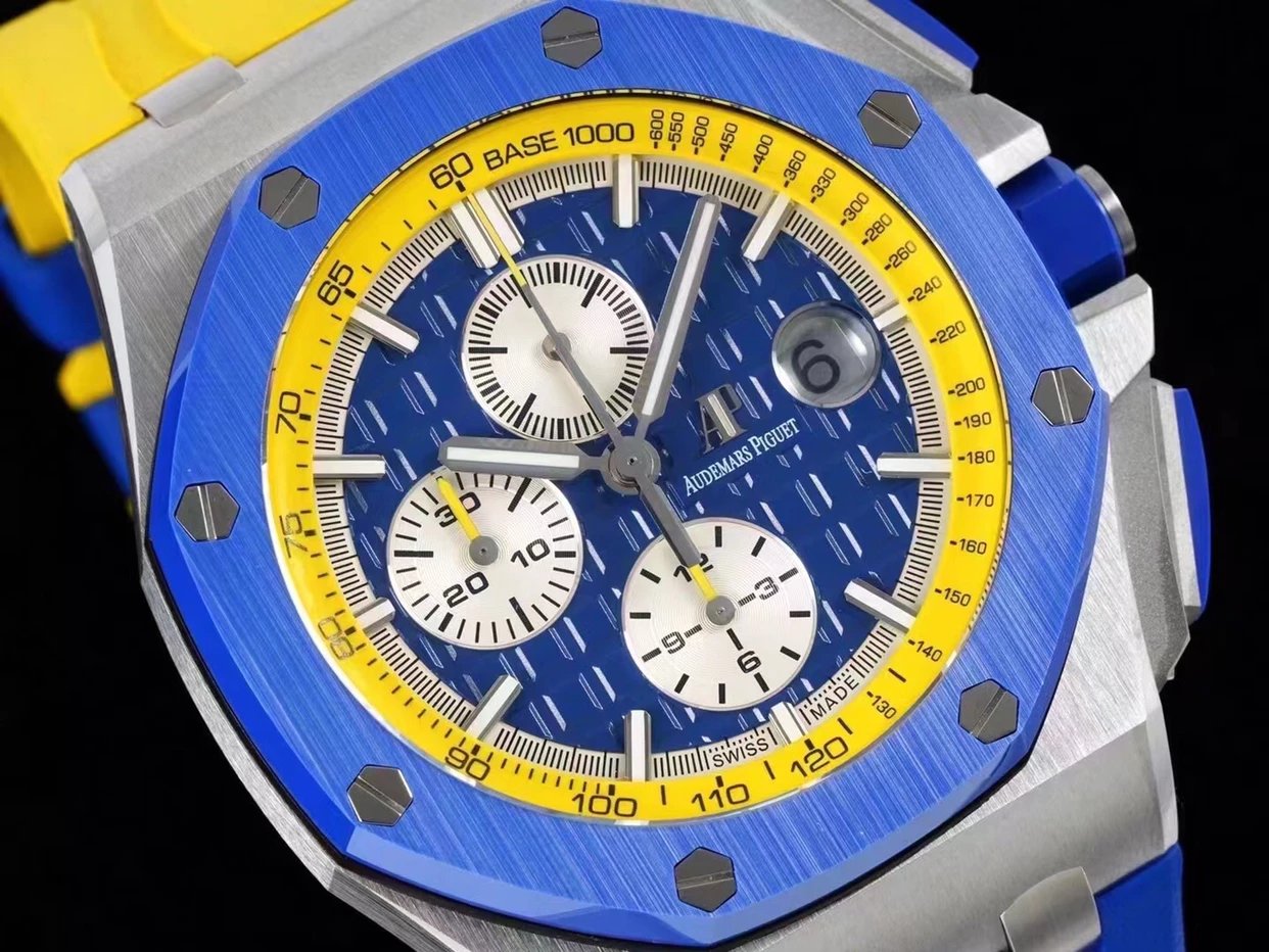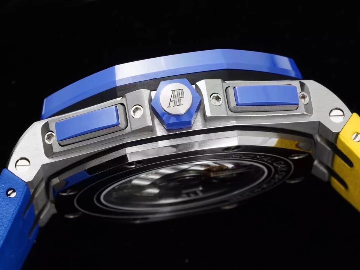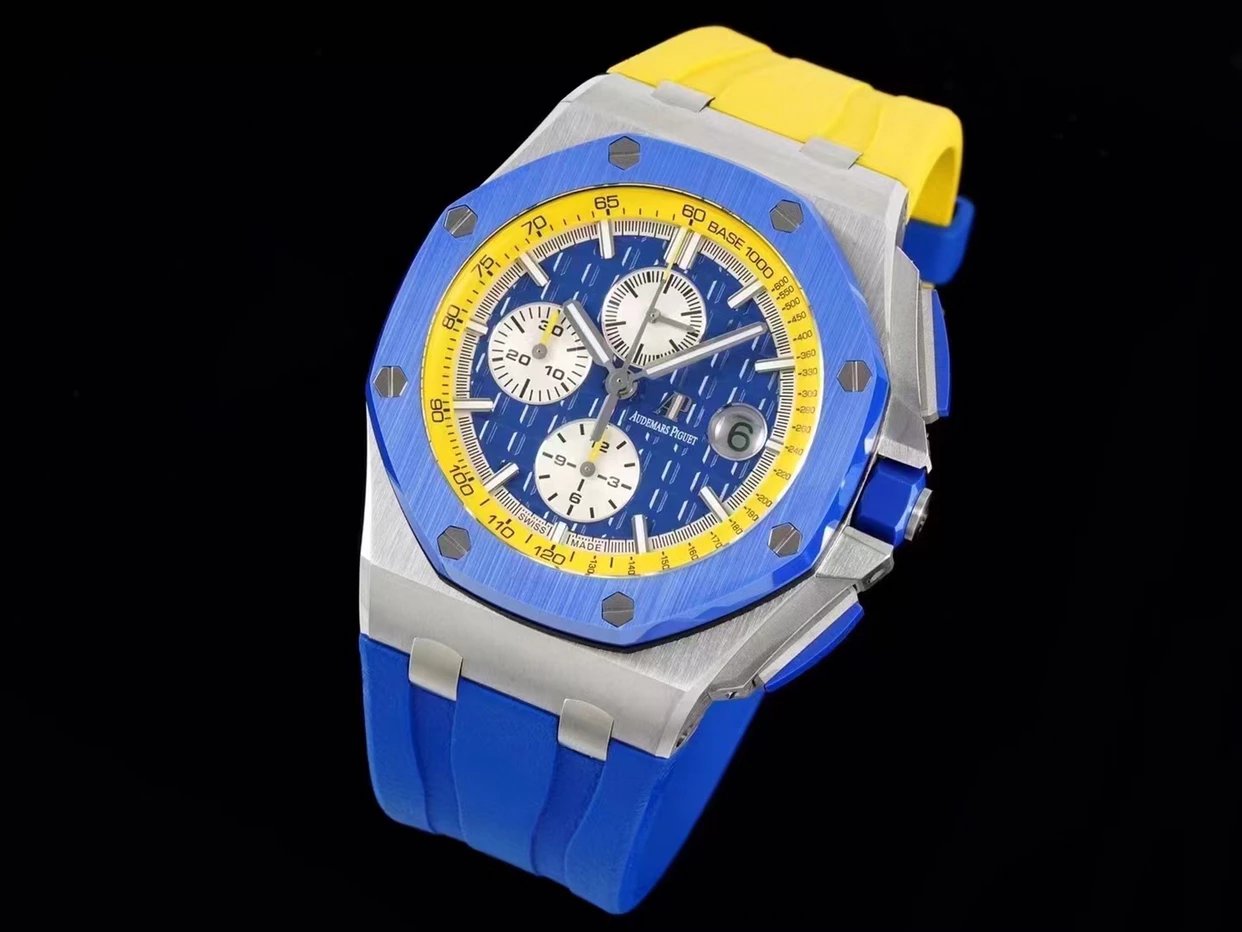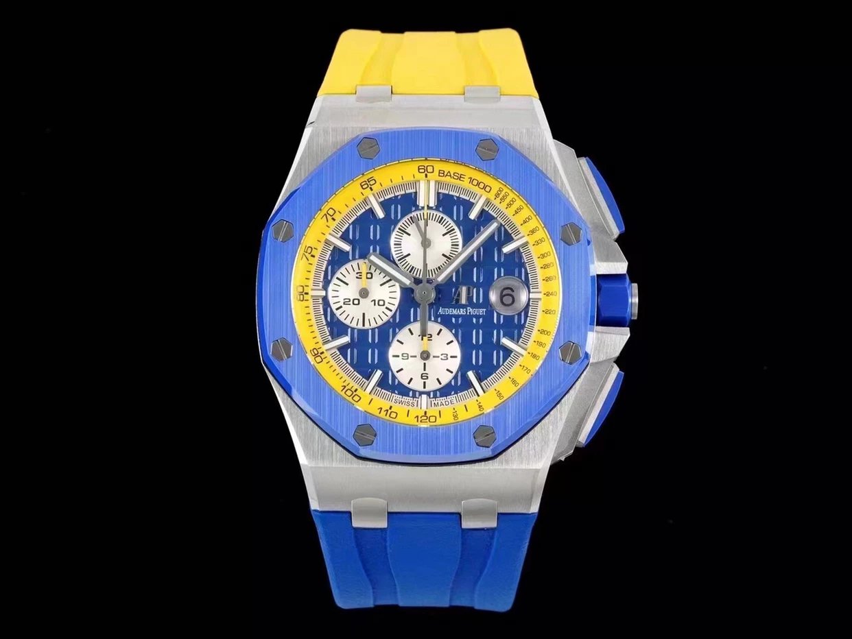 皇家橡樹離岸型系列黃藍彩26400,44x17mm,7750改3126計時機芯,彩色陶瓷表圈,鈦金屬陶瓷按鈕,瑞士進口夜光,藍寶石鏡面,環保橡膠錶帶,防水50米級