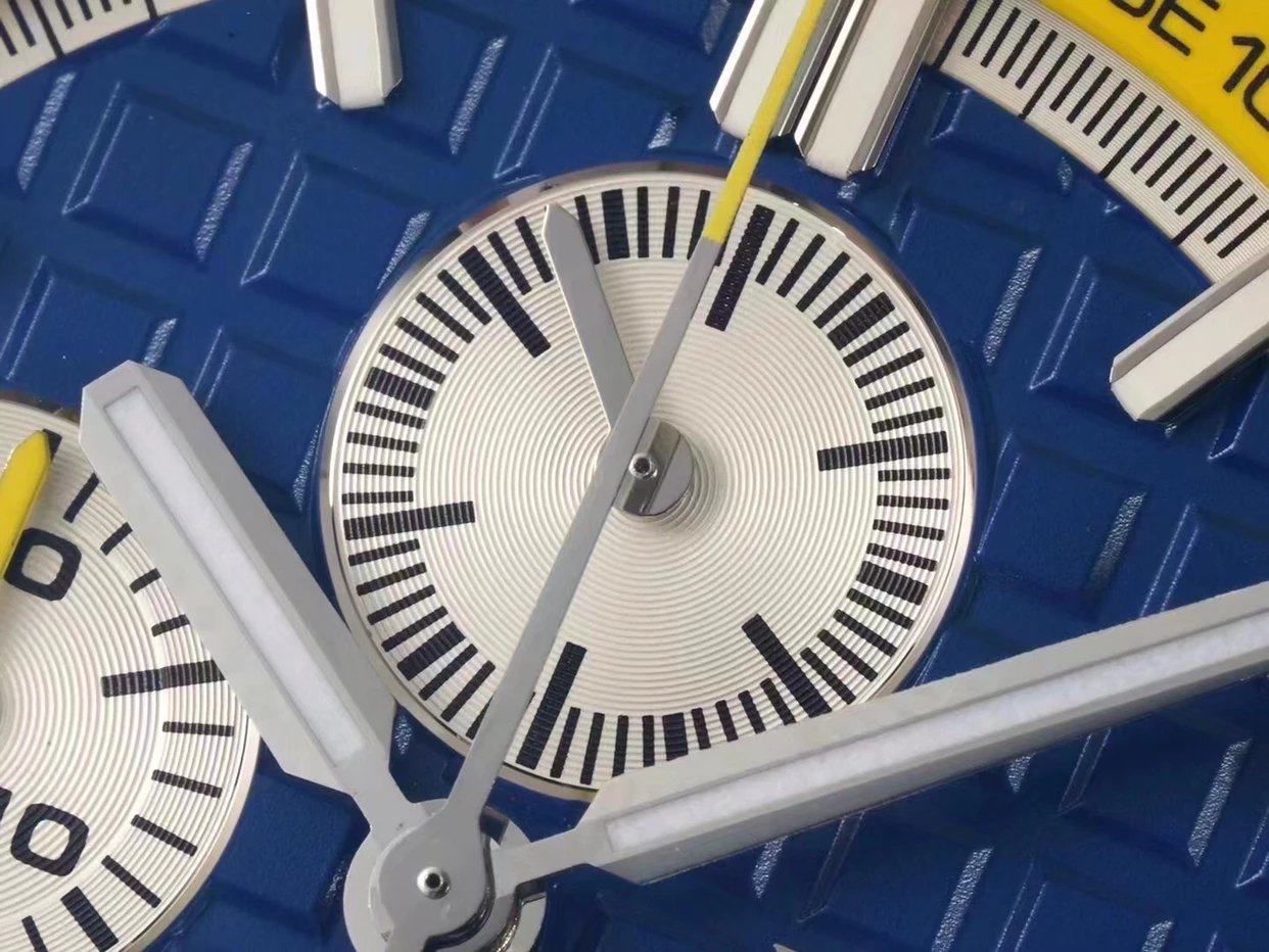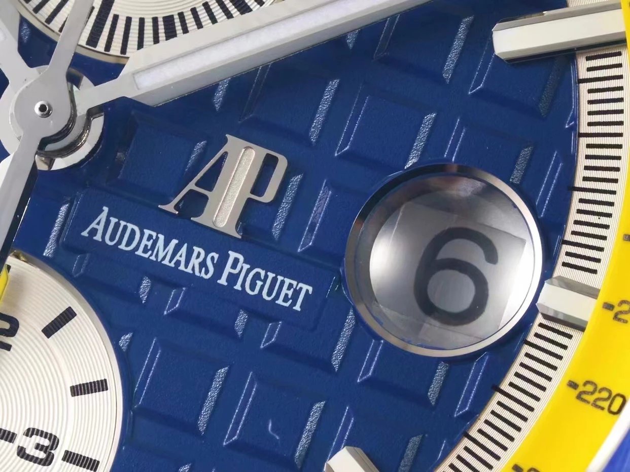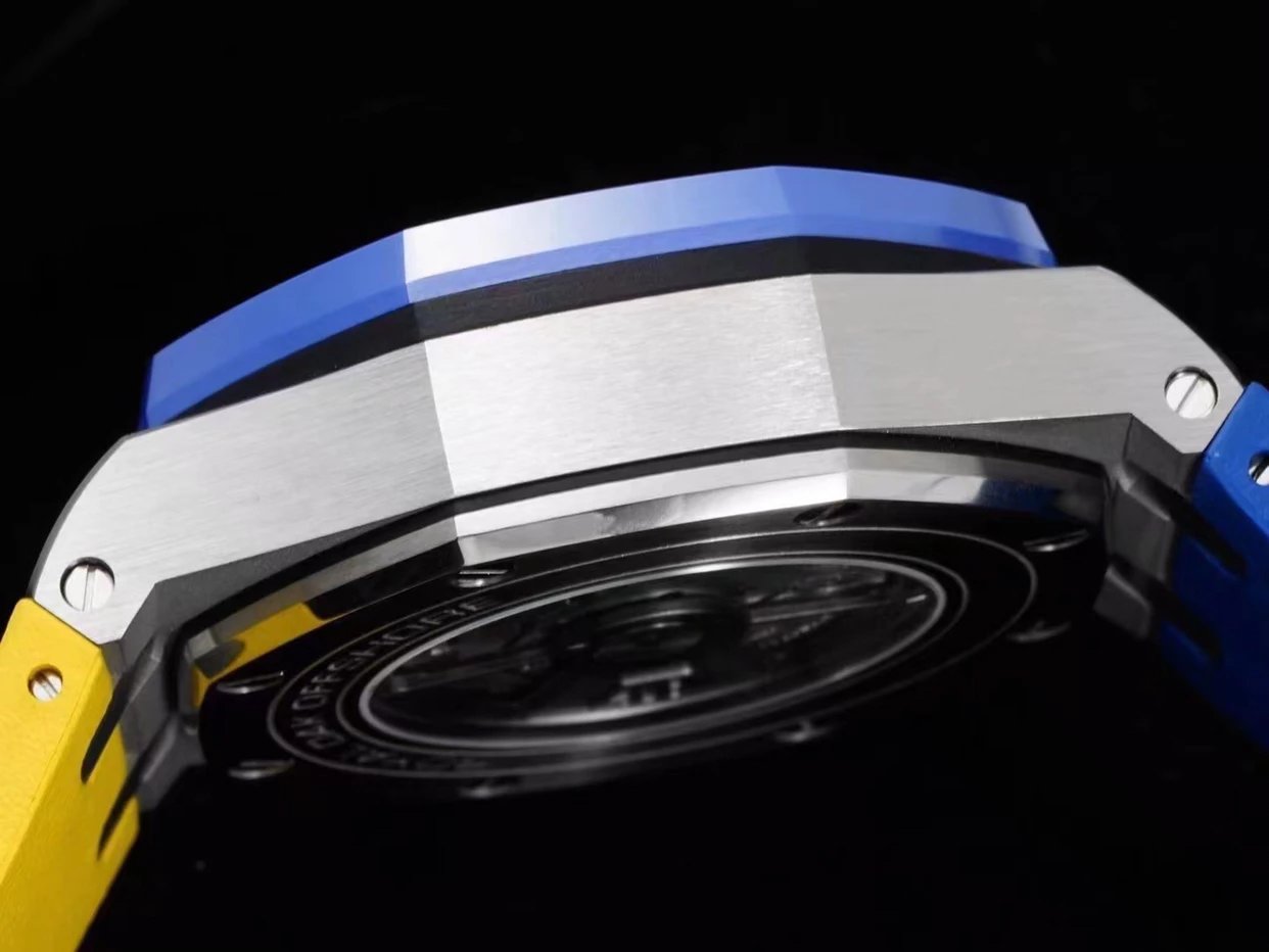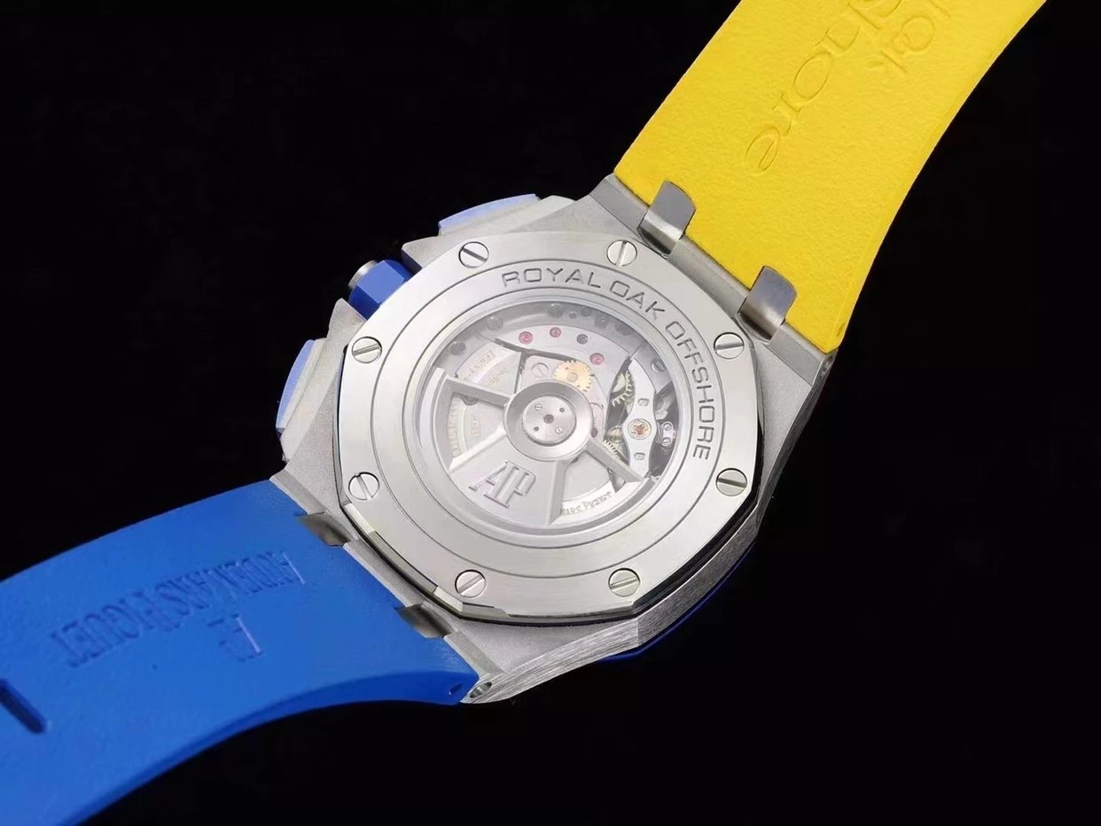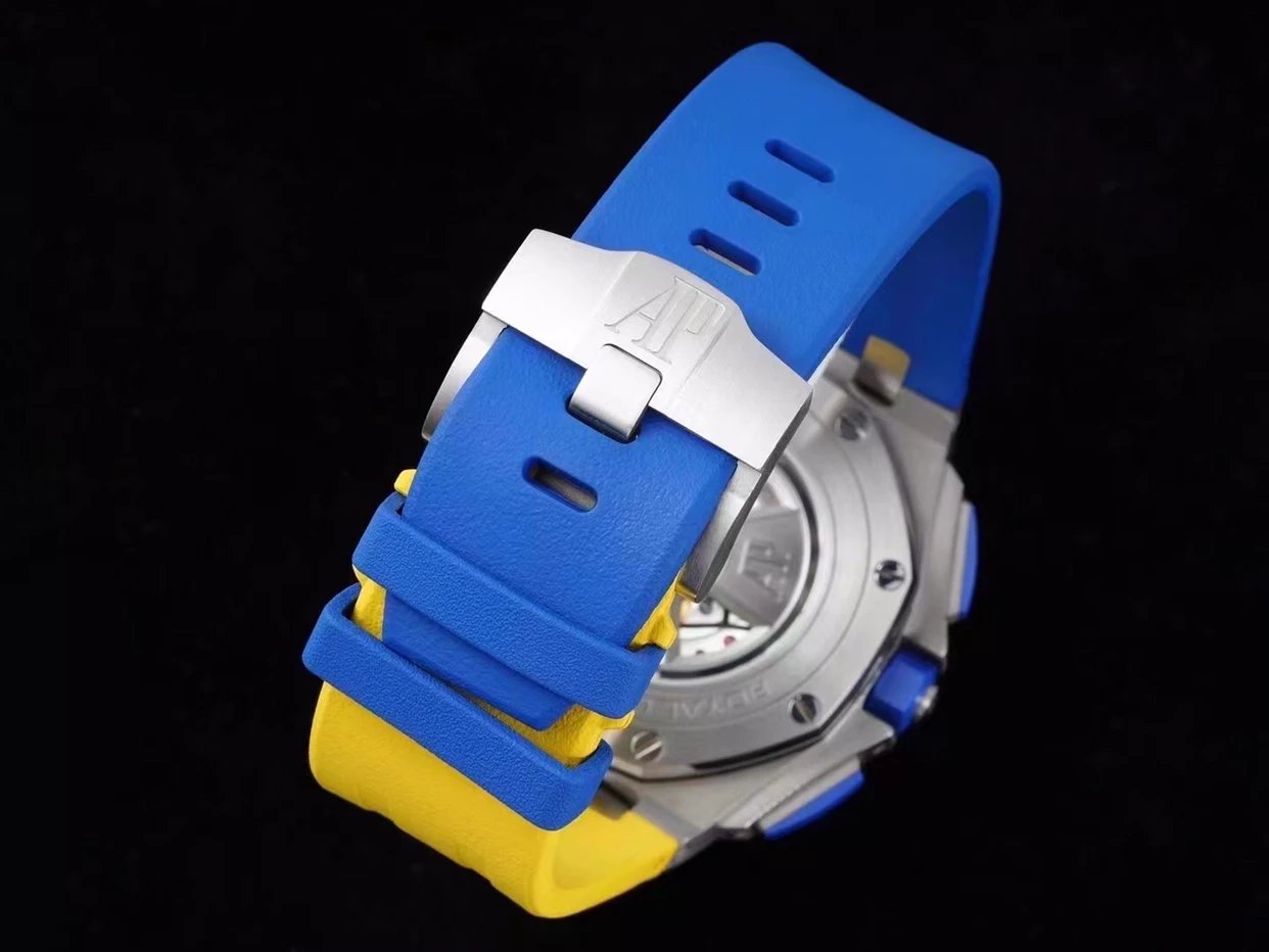 皇家橡樹離岸型系列黃藍彩26400,44x17mm,7750改3126計時機芯,彩色陶瓷表圈,鈦金屬陶瓷按鈕,瑞士進口夜光,藍寶石鏡面,環保橡膠錶帶,防水50米級