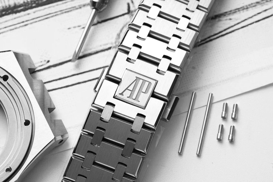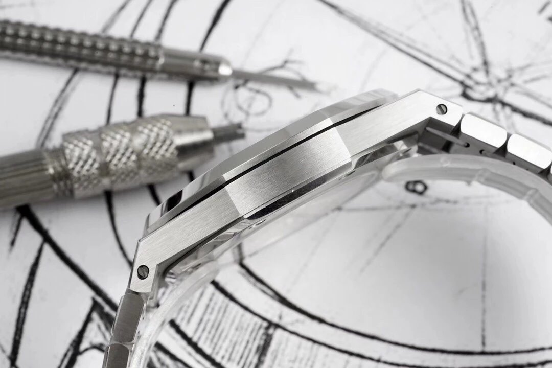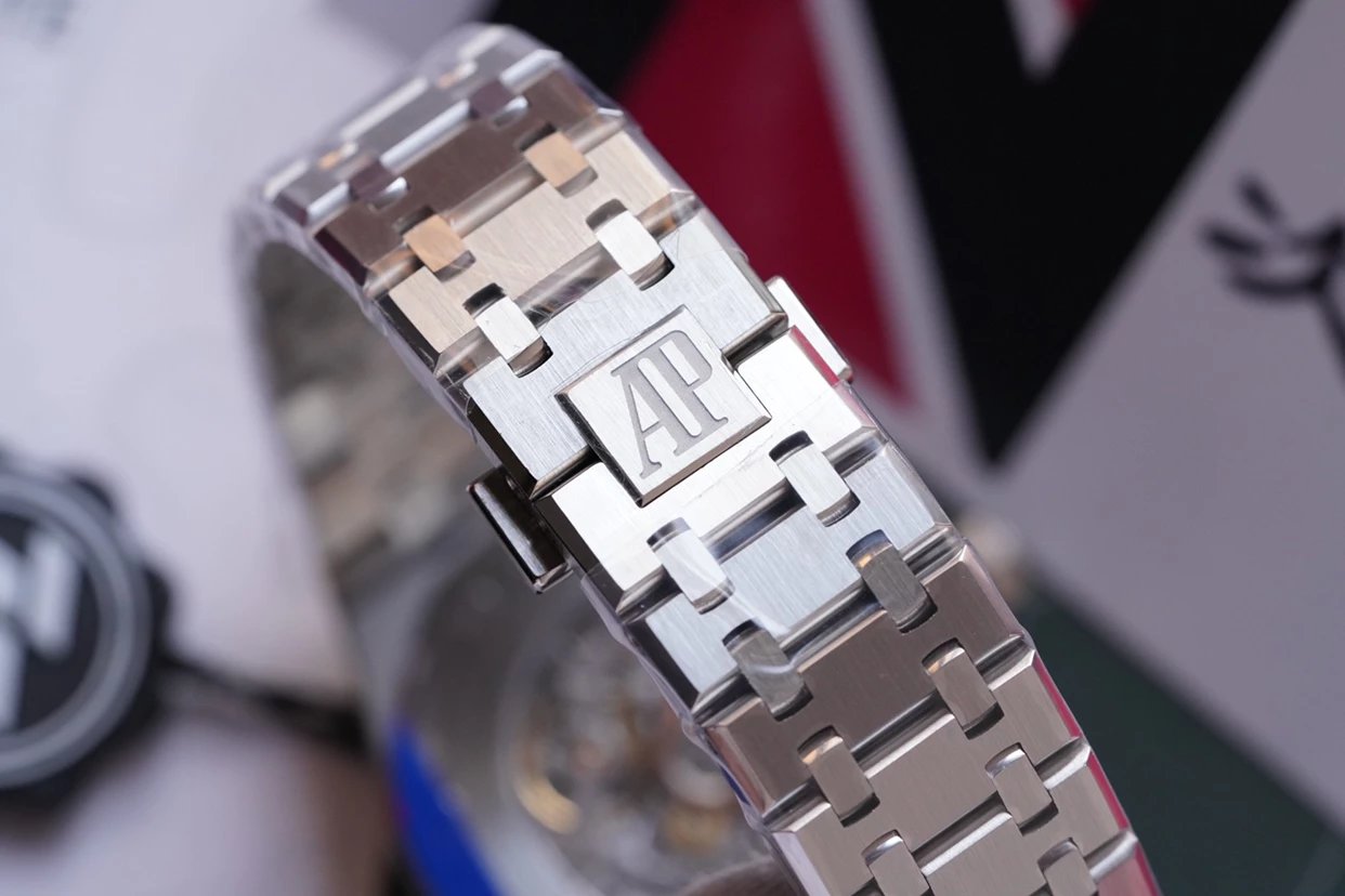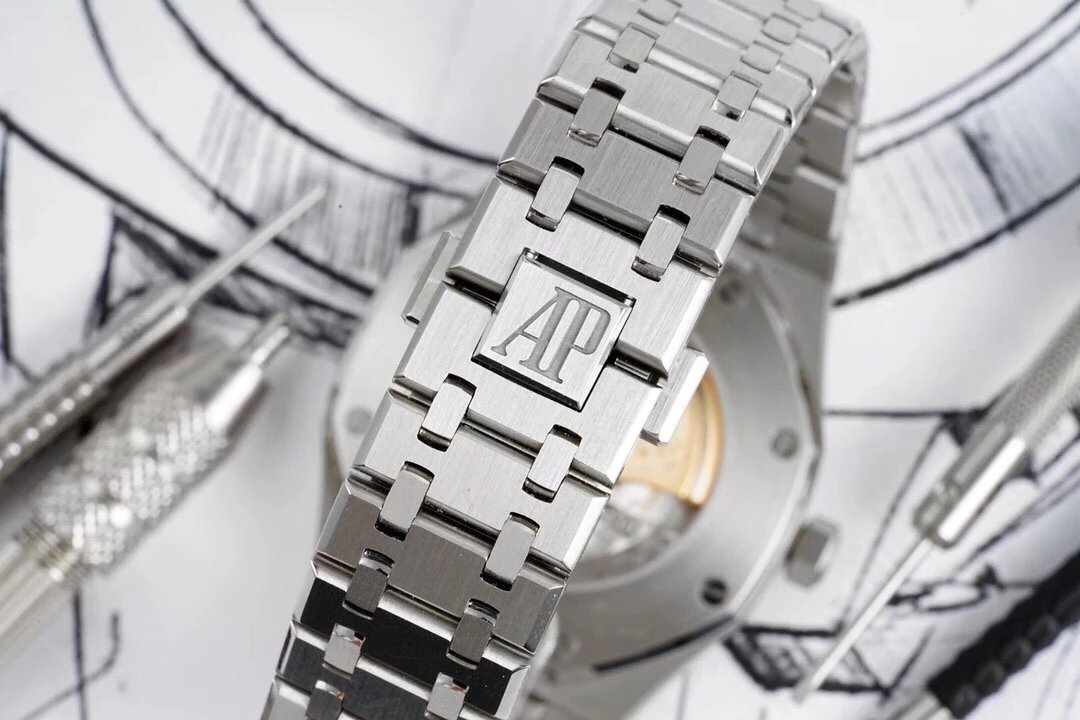 ZF廠愛彼15400系列複K表終極版表殼都是採用316L精鋼,鋼帶頭粒的“緩衝帶”致敬原裝,鬆緊的感覺原裝 一模一樣,兩邊採用螺絲固定,中間為小鐵杆鏈接在一起,目前是Z+F廠首創這種做法。佩戴舒適。