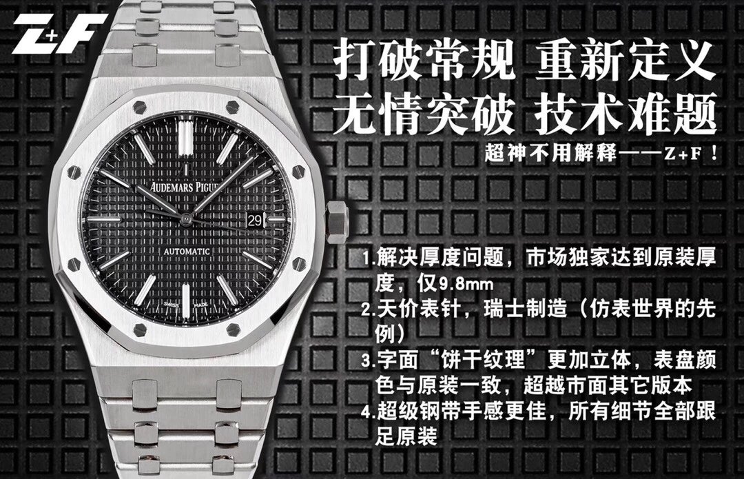 ZF廠15400系列複K表終極版「獨家上市」對比正品評測,我們都知道複K界有很多工廠在做這個款式,Z+Factory,這是一家新廠,但是僅僅是名字全新,現在很多大廠因為個人表款太多,所以有一些系列的產品都開始採用其他名稱,比如jf啟用ar,至於這個Z+F工廠,在首次大力宣傳之後,並沒有多少表商買賬,預定銷量慘澹,所以繼續沿用zf工廠這個品牌,今天筆者將全面為大家介紹此次ZF廠愛彼15400系列複K表終極版。